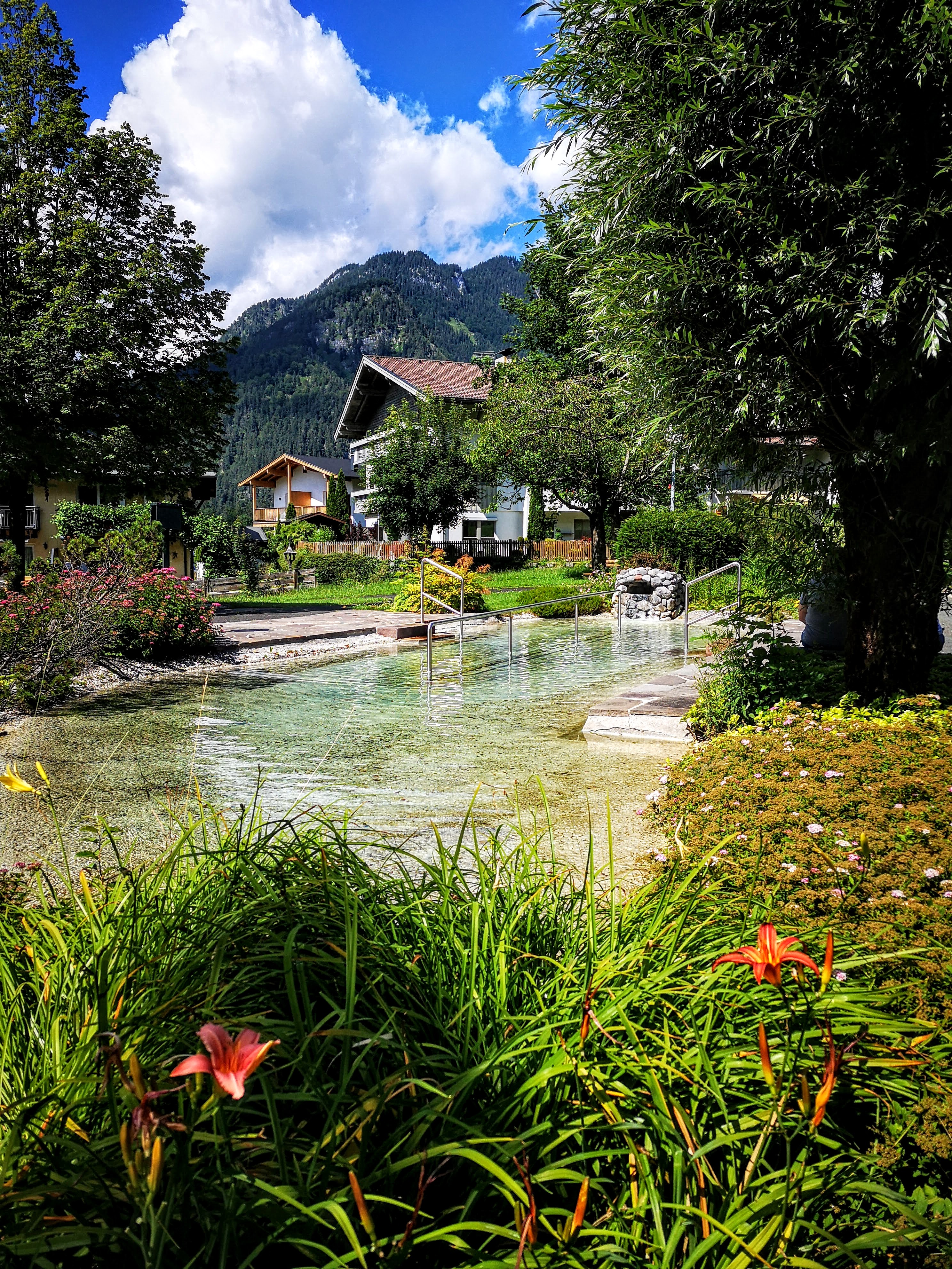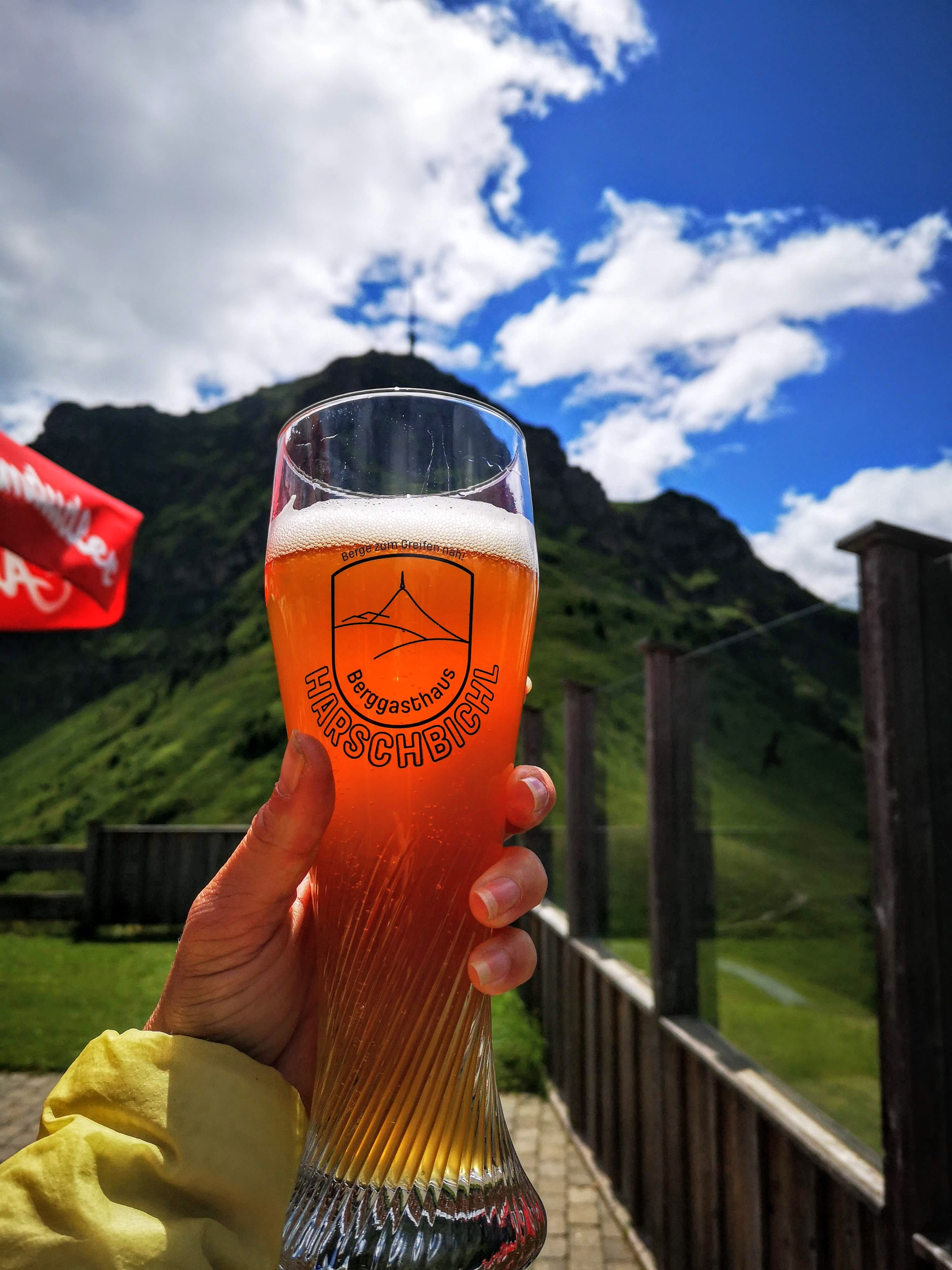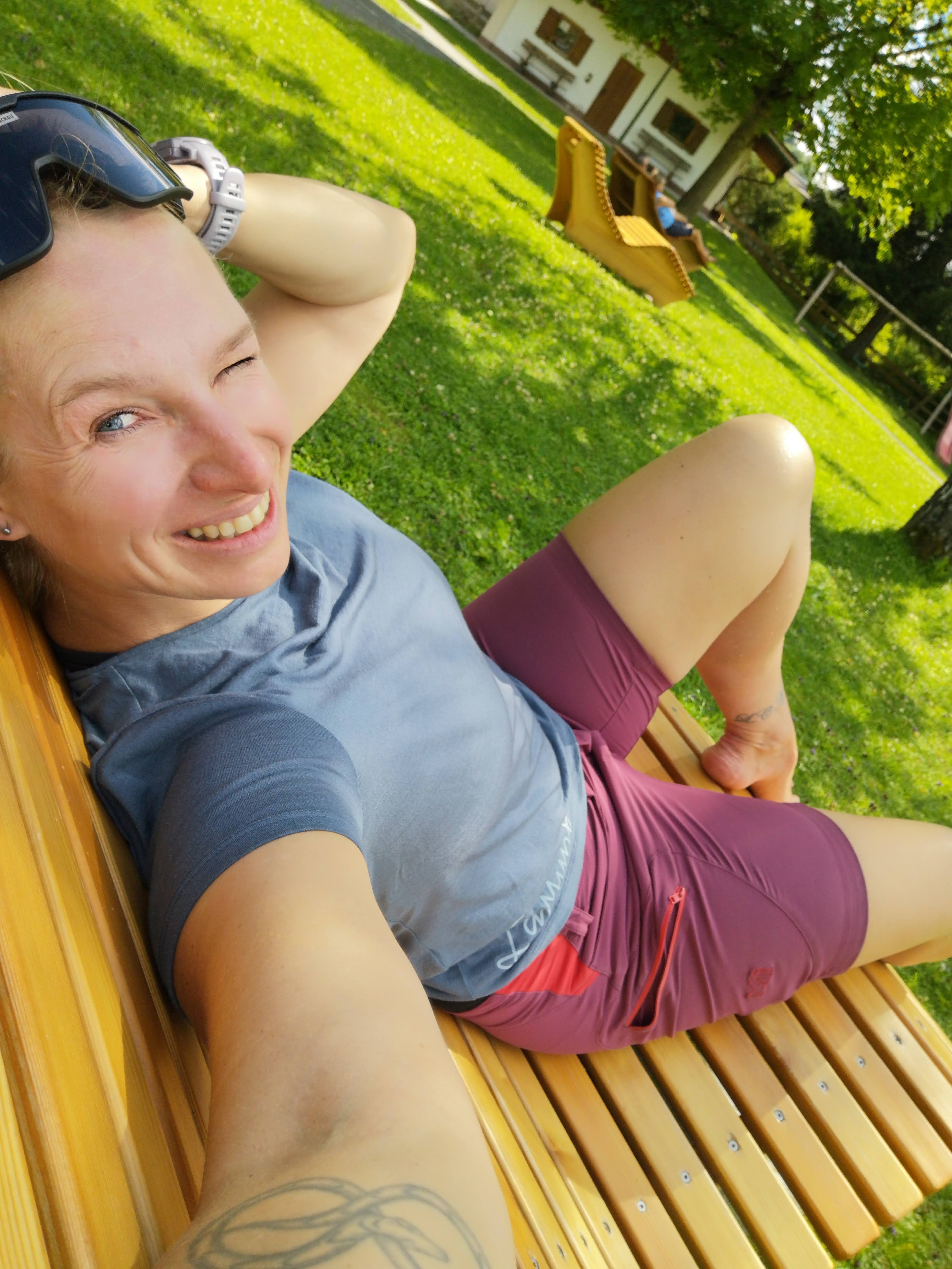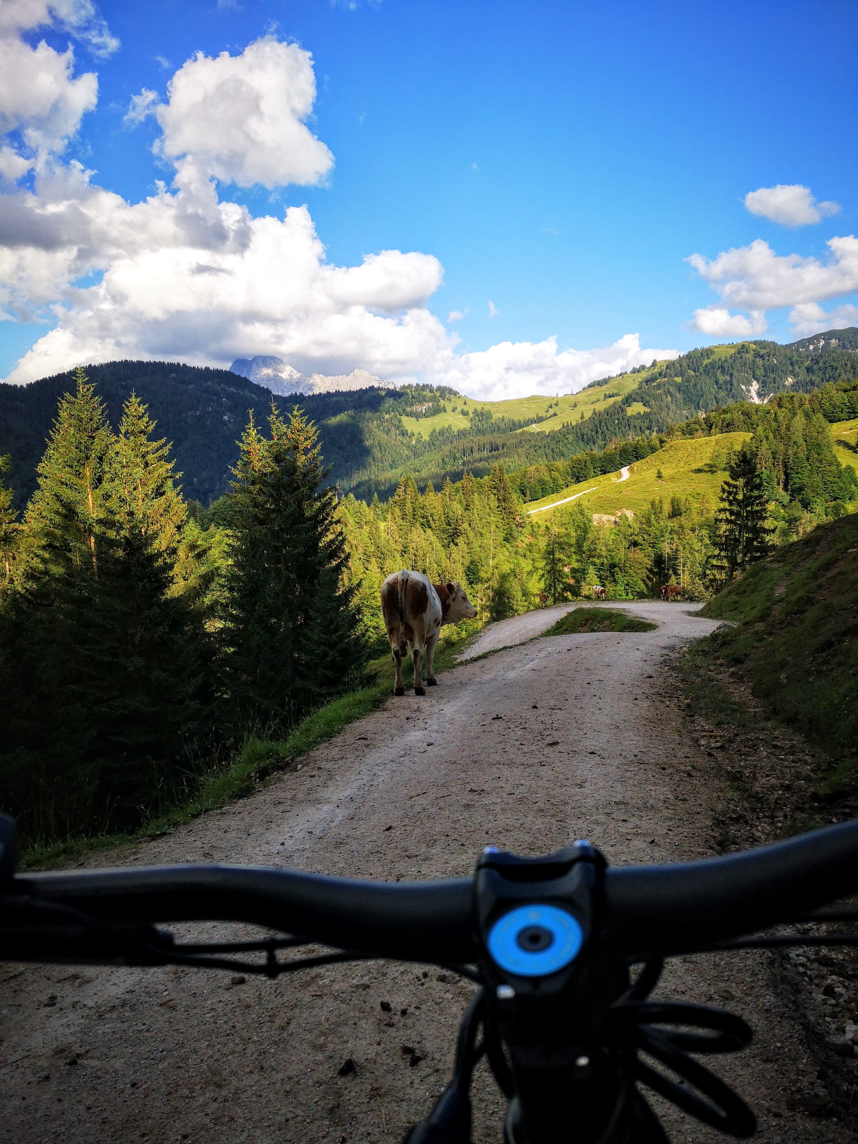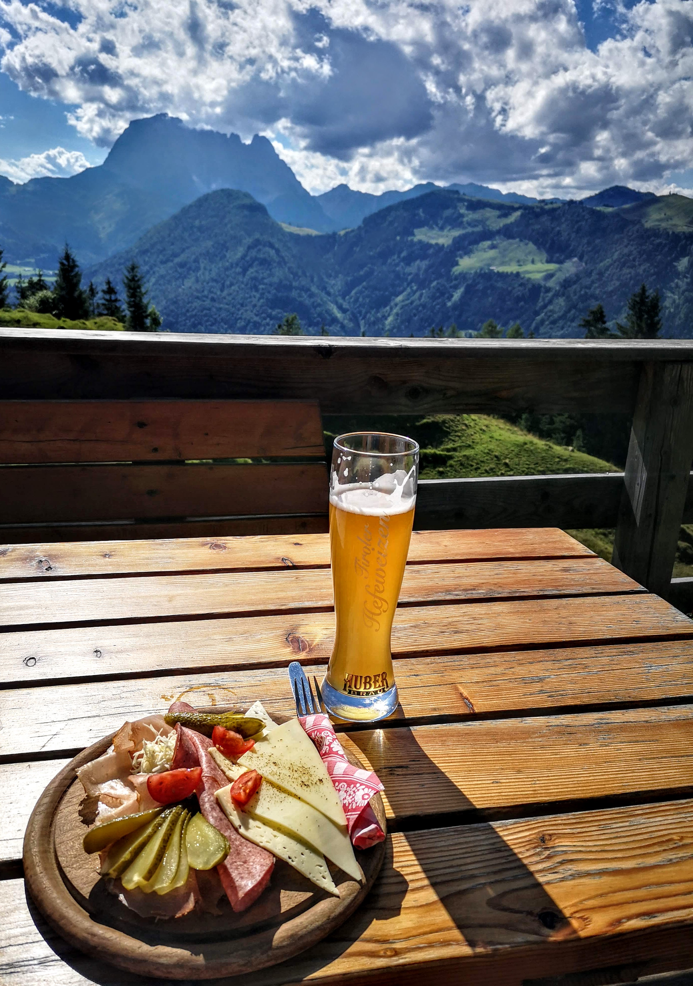 Wer am Nachmittag noch Luft und Kraft hat, sollte sich aufs Radl setzen und entlang der Ache Richtung Erpfendorf fahren. Meines ist aus dem Verleih von BikeNature, die auch geführte MTB-Touren & Workshops anbieten. Tipp: in Erpfendorf in der öffentl. Kneippanlage vorbeischauen und den Beinen eine Runde stampfen im kalten Wasser gönnen – tut sooo gut! Danach folgt die markierte Bikestrecke (Angerlalm) einer Forstrasse, die in unzähligen Kehren bis zur Huberalm auf 1080m führt. Zeit für a Almjausn und a isotonisches, lokales Weizen vom Huber Bräu aus St. Johann. Sonnenuntergang geniessen – empfohlen! Ich hab noch a kleinen Abstecher gemacht, hoch zur Huberhöhe 1146m – a Bank, a Kreuz und Panorama satt. Oafach schee!