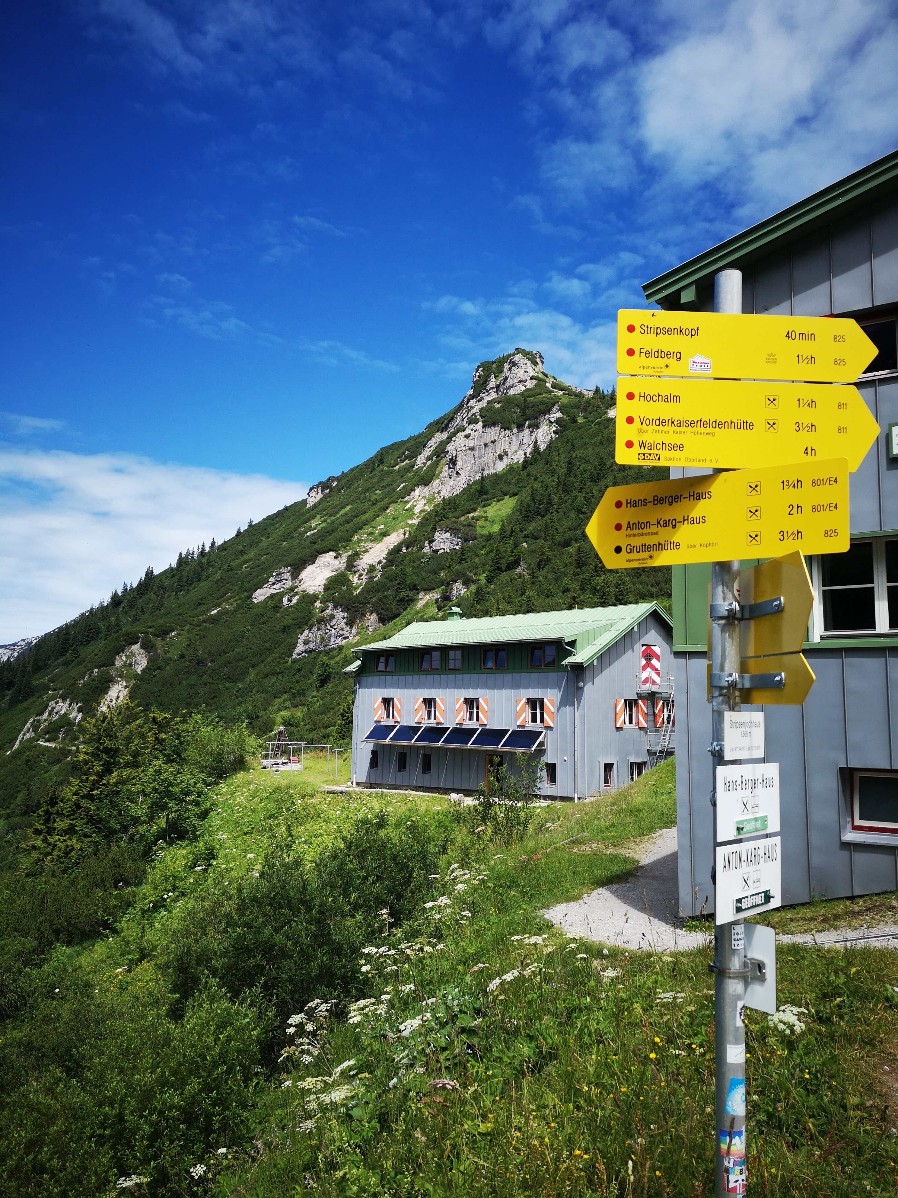 Eine gewaltige Tagestour – lang, zt steil, ausgesetzt & geröllig aber gewaltig lohnend und dank (e)Bike machbar. Natürlich kann man aber auch einfach bis zur Mautstelle fahren oder direkt ins Naturschutzgebiet bis zur Fischbach- od Griesner Alm (4 Euro/Pkw). Von St. Johann aus gehts am Radlweg via Kirchdorf (ab da Strasse) ins Kaiserbachtal, an der Griesner Alm 988m dann ohne Bike weiter. Hoch zum Stripsenjoch (großteils a breiter Forstweg, der eher an eine Strasse erinnert – kurzer knackige Anstiege im Wald), die letzten Höhenmeter in Kehren bis zum Stripsenjochhaus. Das kenn ich noch vom Koasamarsch – Servus die Wadln! 1x quer durch den Zahmen Kaiser. Kurzer Tankstopp, bevor ich mich weiter auf den Weg mache. Vorbei am wunderschönen Tavonarokreuz, benannt nach Hans Tavonaro, dem ersten Hüttenwirt am Stripsenjochhaus . Er war selber begeisterter Bergsteiger und hat anlässlich seiner 150. Tour zum Totenkirchl das Kreuz errichtet. Danach wirds alpiner, ri Hundskopf warten Versicherungen samt Bügel, a schmaler tlws steiler Steig führt auffi zum Stripsenkopf. Dort wartet kein Gipfelkreuz, dafür ein Wetterpavillion mit Blick auf die mächtign Koasa-Wände, dieser wurde bereits 1924 erstmals aufgestellt! Neben dem Steig führen auch 2 kurze (Übungs)-Klettersteige auf den Gipfel. Der direkte Abstieg ri Feldberg ist ein schwarz markierter Steig, steil & tlws extrem ausgewaschen mit viel losem Schotter… Danach ein ewiges Auf- und Ab, das optisch nicht ersichtlich war – der Feldberg winkt bei jeder Kurve, kommt aber nicht näher.