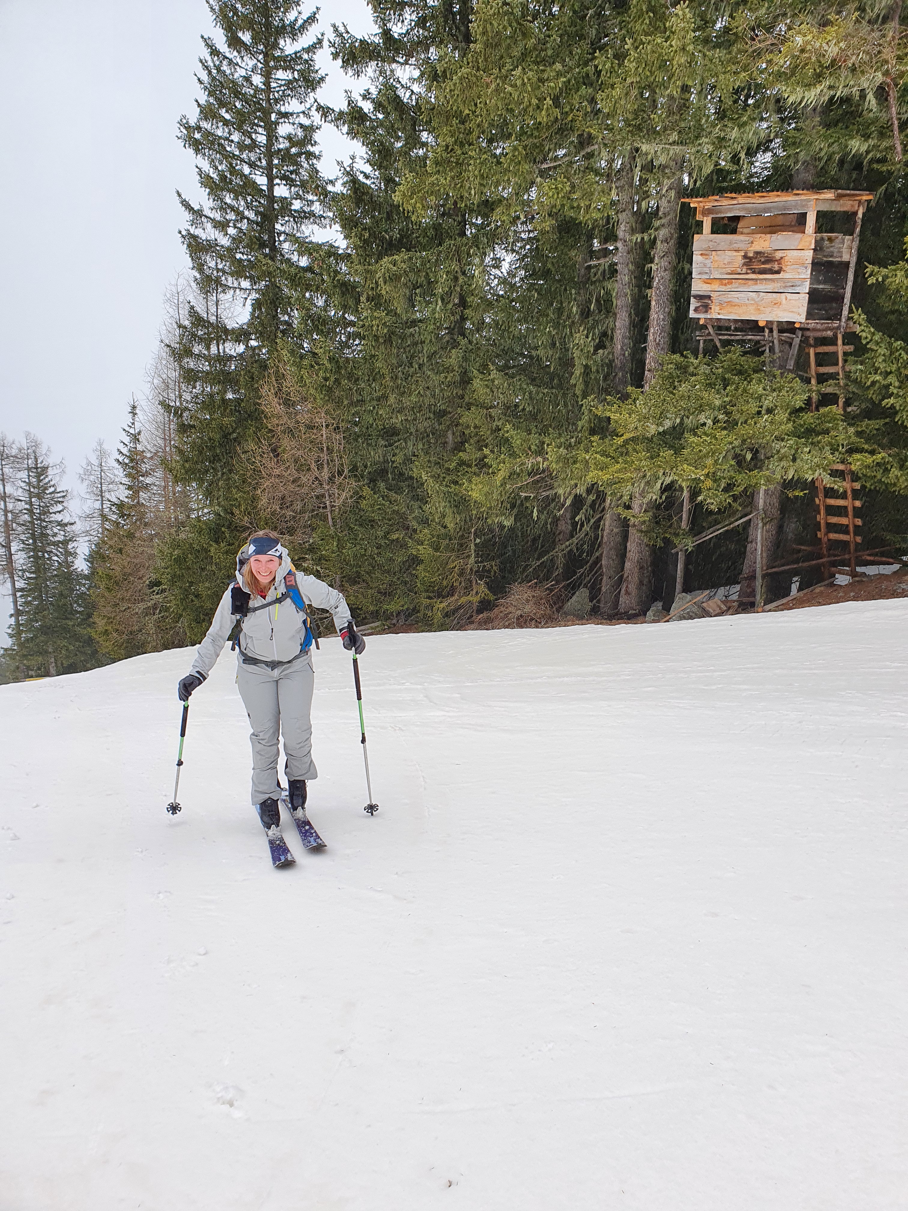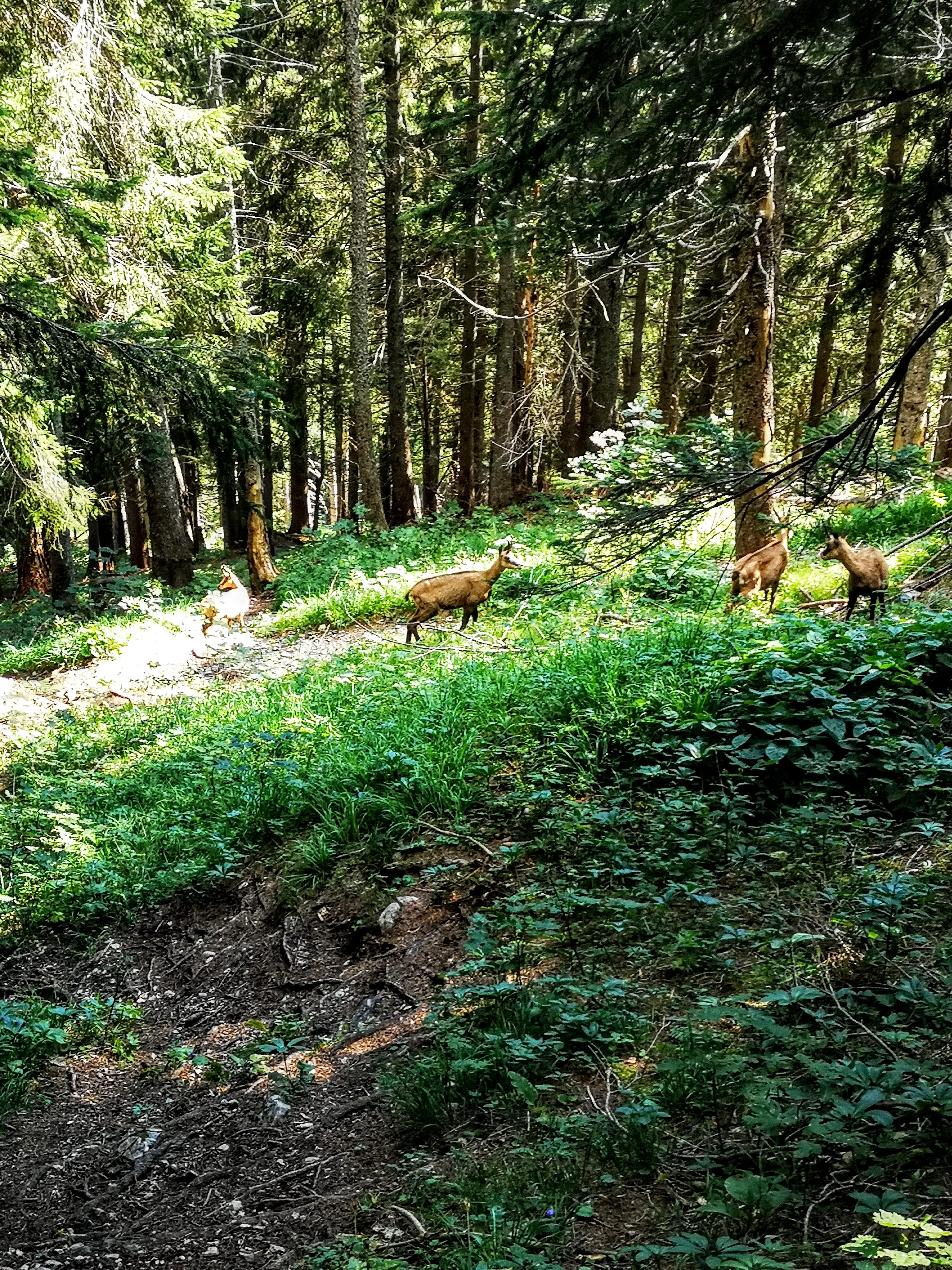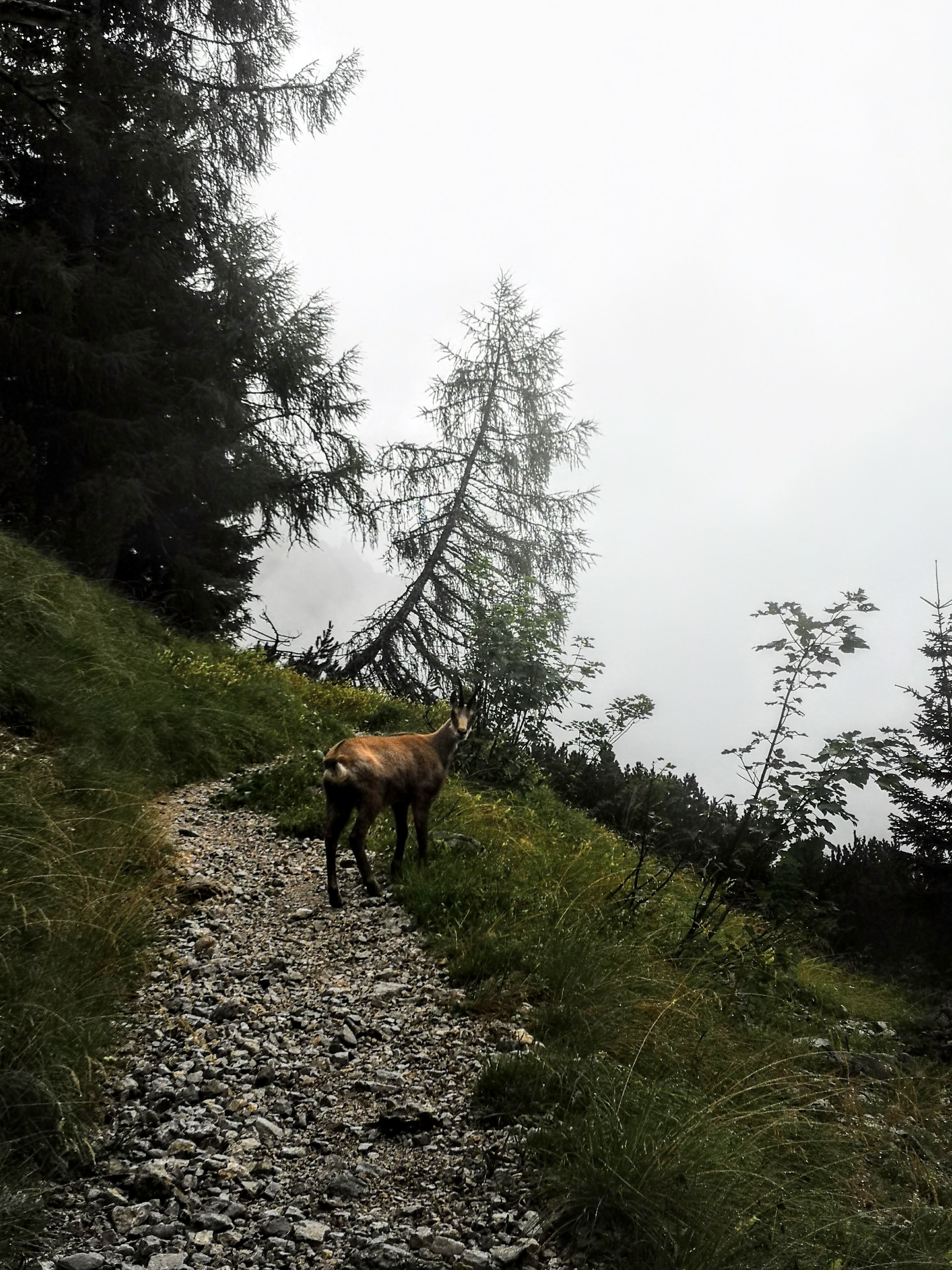 Bei einem Aussichtsbankerl wird man ausgespuckt, ggü führt der Normalweg weiter zum Buchsteinhaus. Immer wieder wird dabei die Forststrasse zur Materialseilbahn gequert. Und dann fängt der serpentinenartige, geschotterte Aufstieg an… die Kehren können diretissima via ausgetretener Waldwegerl abgekürzt werden. Allerdings würde ich das bei einigen nur im trockenen Zustand raten weil zt extrem steil und rutschig. Die einzigen, die auch unterwegs sind bei dem Wetter: Gams, überall. Samt Nachwuchs. Sooo liab! Bei 25 hab i dann zum zählen aufgehört…