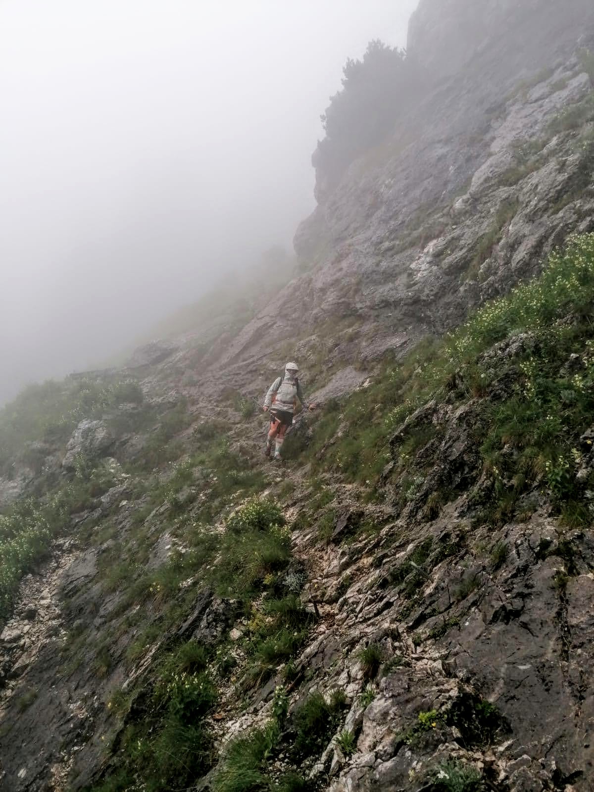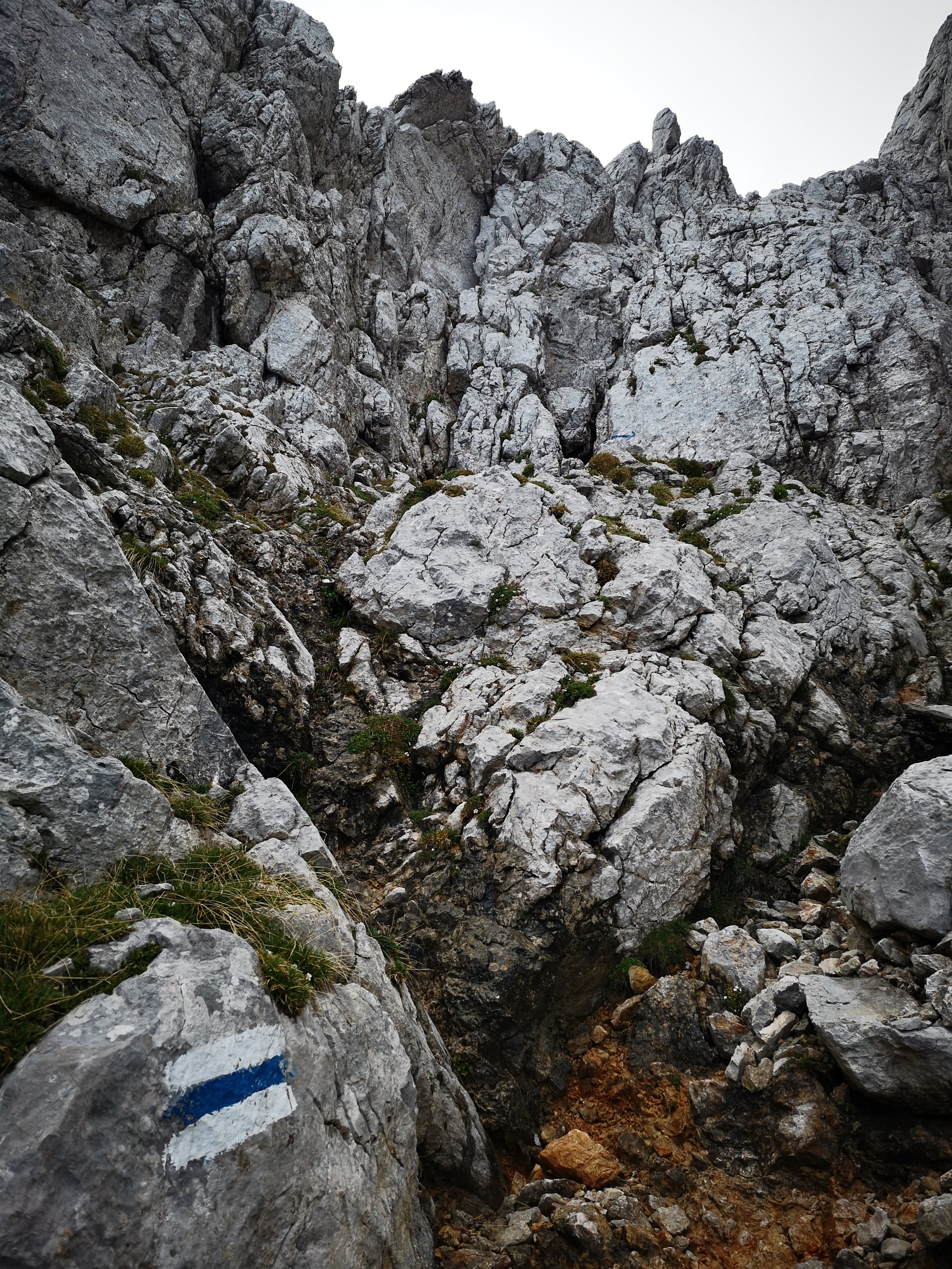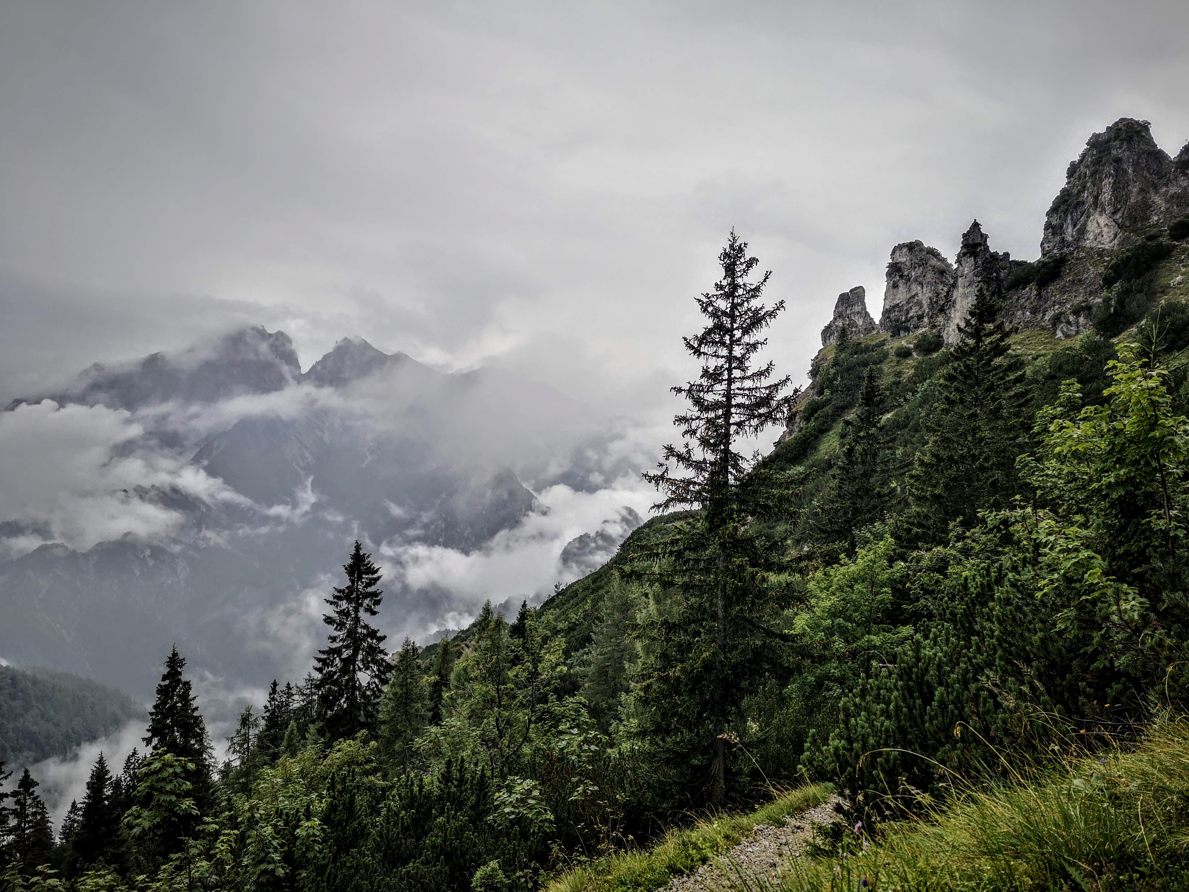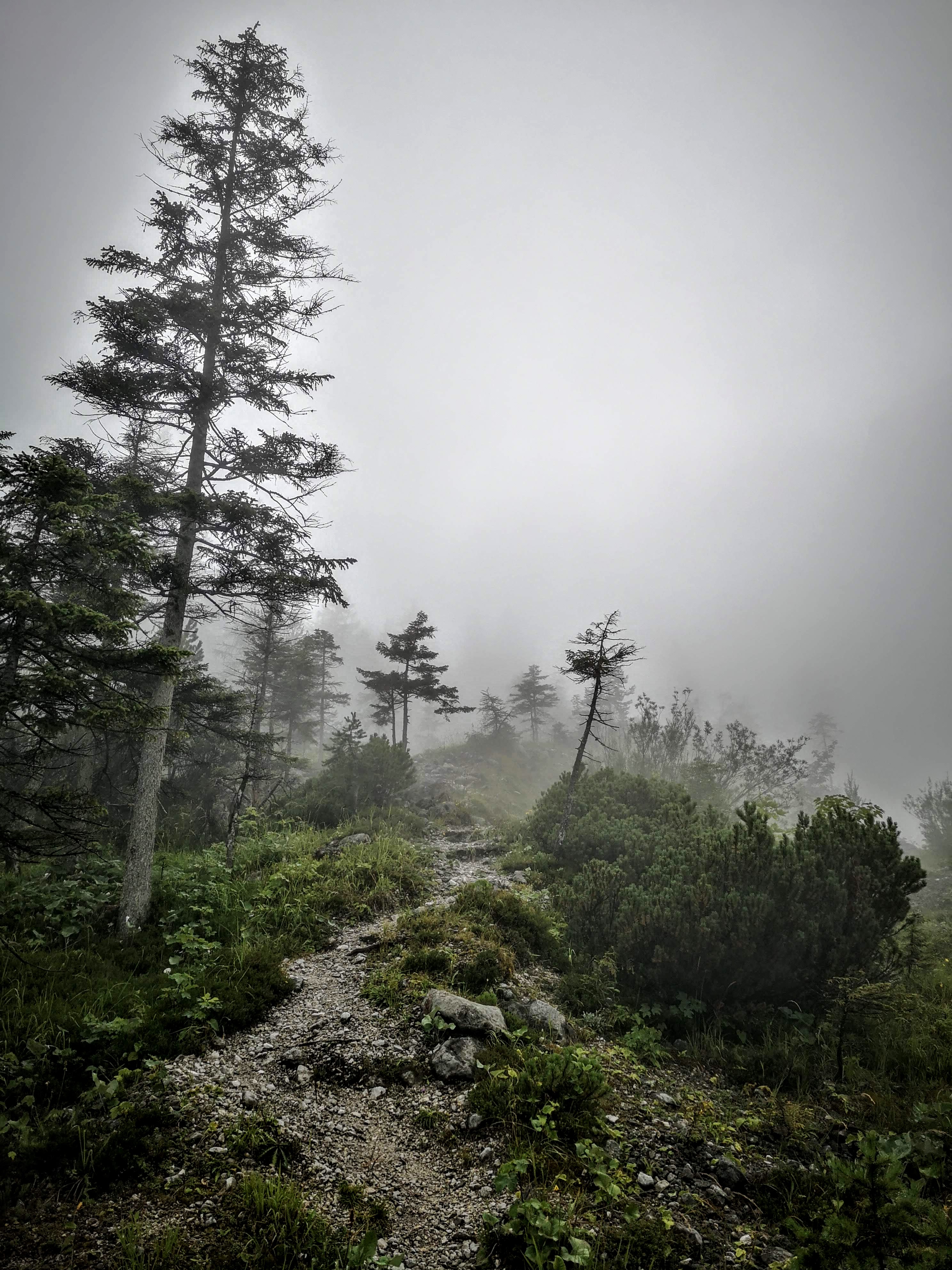Vom Weidendom / Rauchboden aus sind 5h Gehzeit zum Buchsteinhaus angeschrieben – entweder hat mich der Regen schnell gemacht oder einfach die etwas kühleren Temperaturen… gute 3,5h mit Fotopausen haben mir bis nach oben gereicht. Über den Johnsbachsteg, weiter am Rauchbodenweg – zum Teil auch schon nach alten Markierungen und schmalen Wegen, bei denen man zT ein Buschmesser gebraucht hätte weil extrem zugewachsen. Sie kürzen den Forstweg (Radlroute ri Gstatterboden) etwas ab. Und dann führt auch schon der alte Steig unscheinbar nach links oben – nur eine alte, kaum mehr erkennbare Farbmarkierung auf einem Baum weist den Weg. Stoamandln gibt es erst viel später… erst breiter, dann schmaler werdend windet sich der Steig nach oben. Teilweise auch hier extrem verwachsen. Im oberen Abschnitt ist er teils durch Schotter & Geröll verlegt, rechts nur der mächtig tiefe Kühgraben. Nebelmeer, Schnürlregen… nur des Geräusch von trommelnden Tropfen auf der Kapuze und den Herzschlag im Ohr. Des mog i gern, a wenn i so nix vo rundum gsegn hab. Und immer wieder nachrutschendes Geröll und rieselnder Schotter.