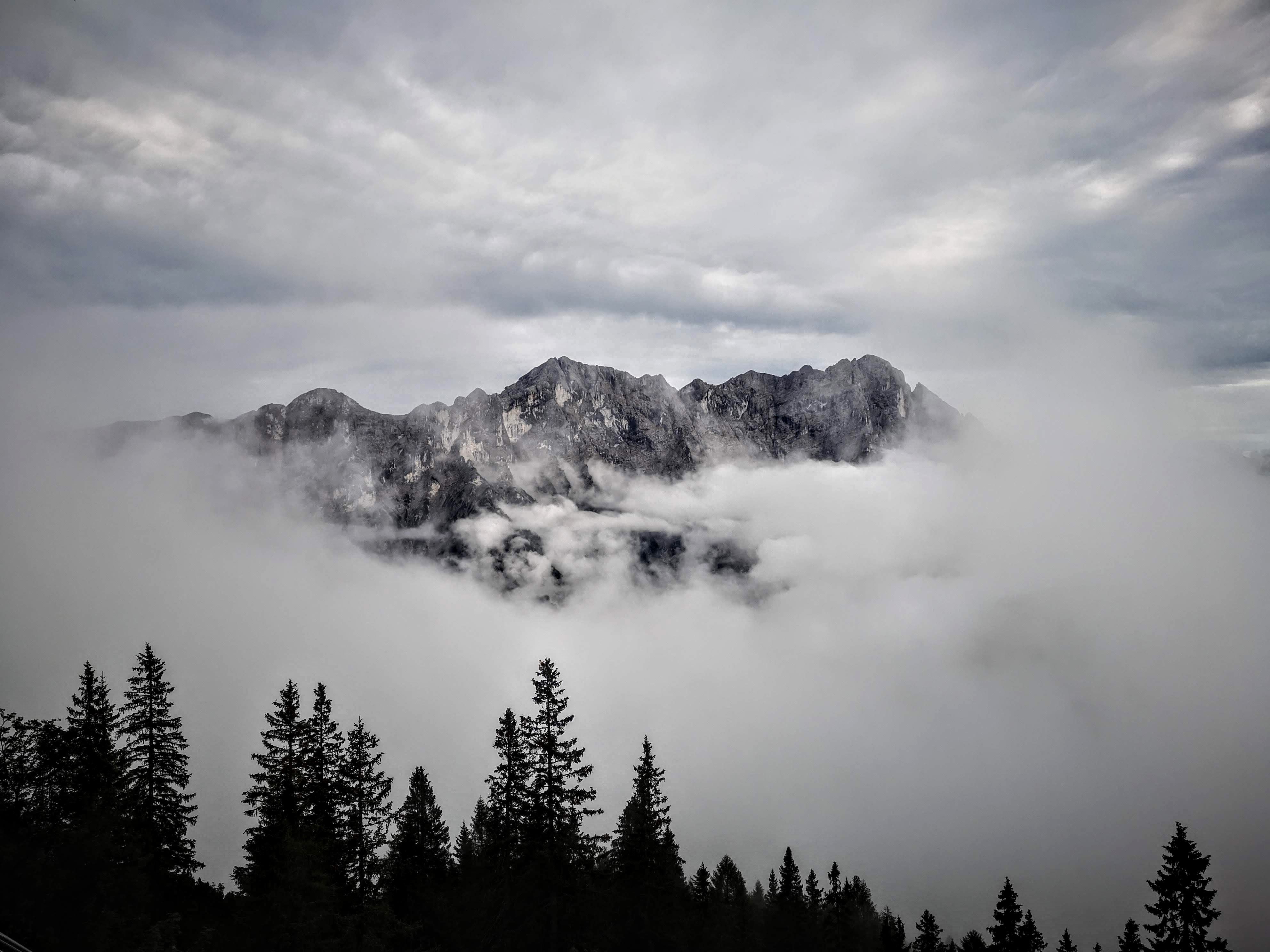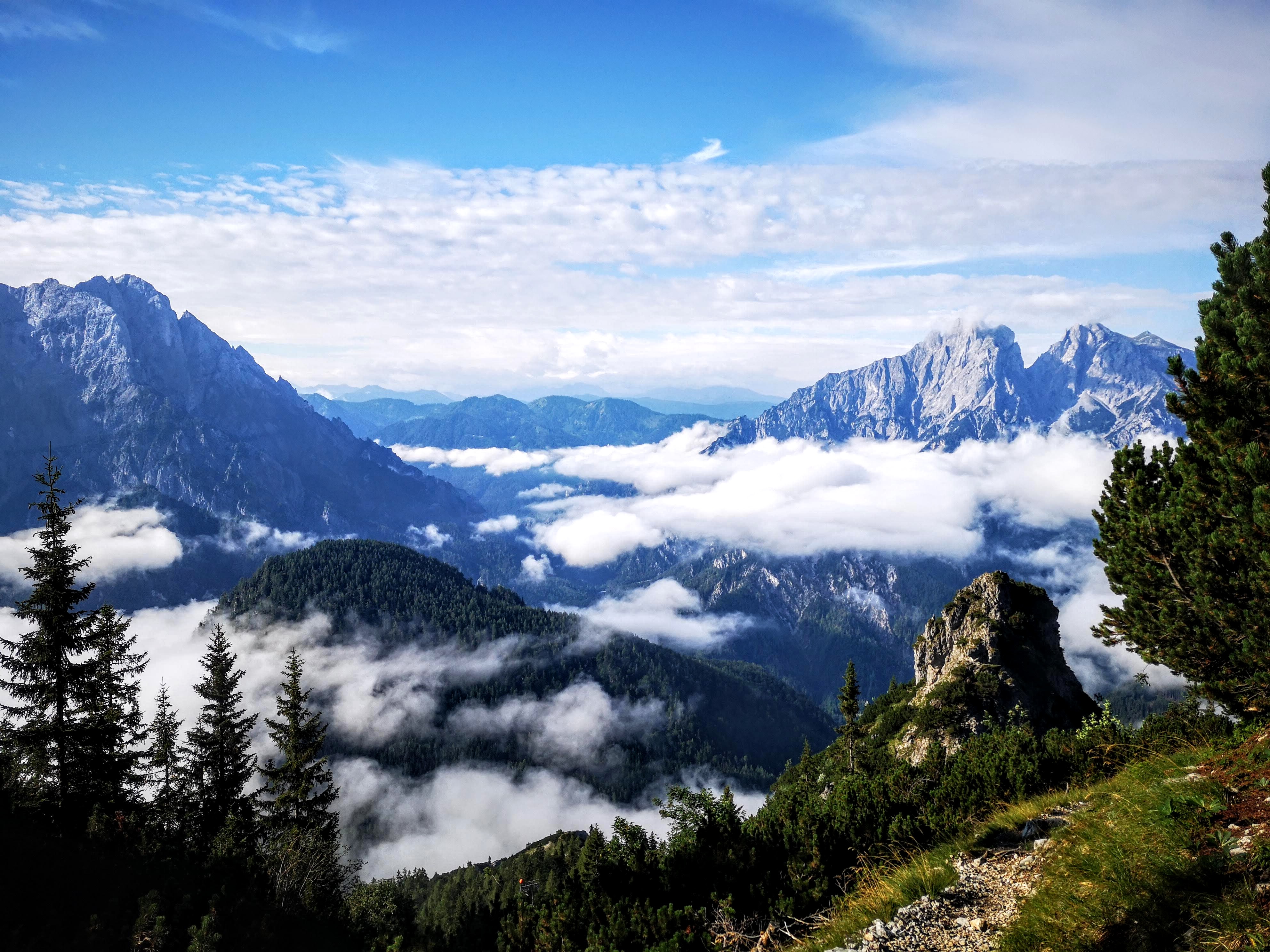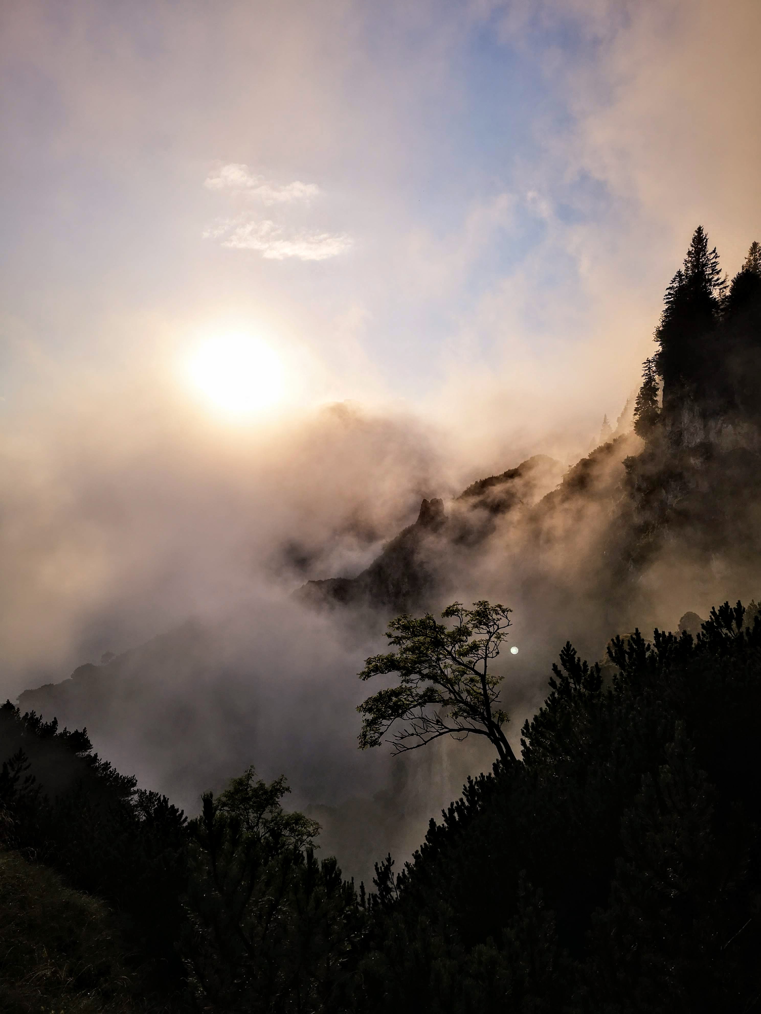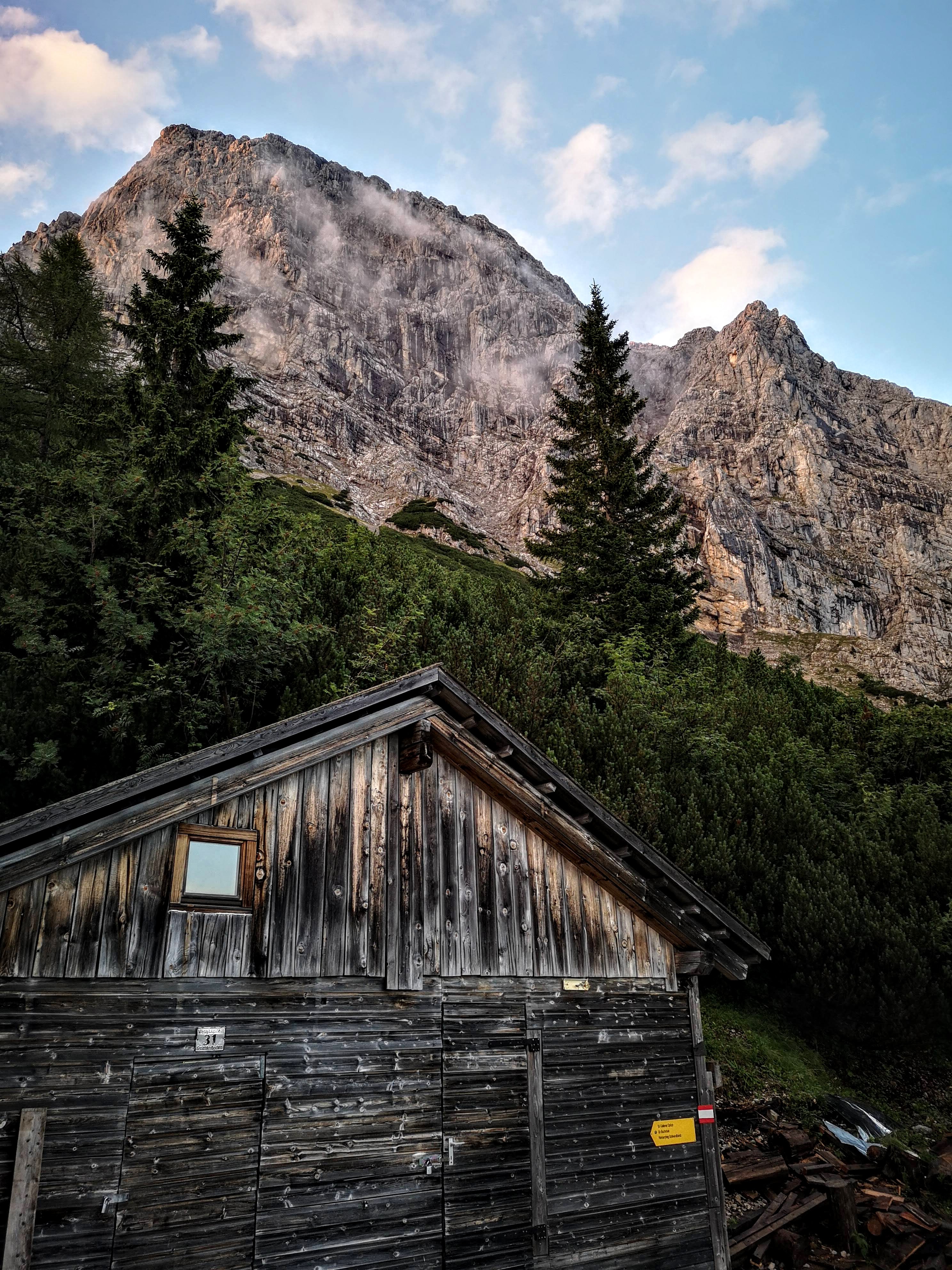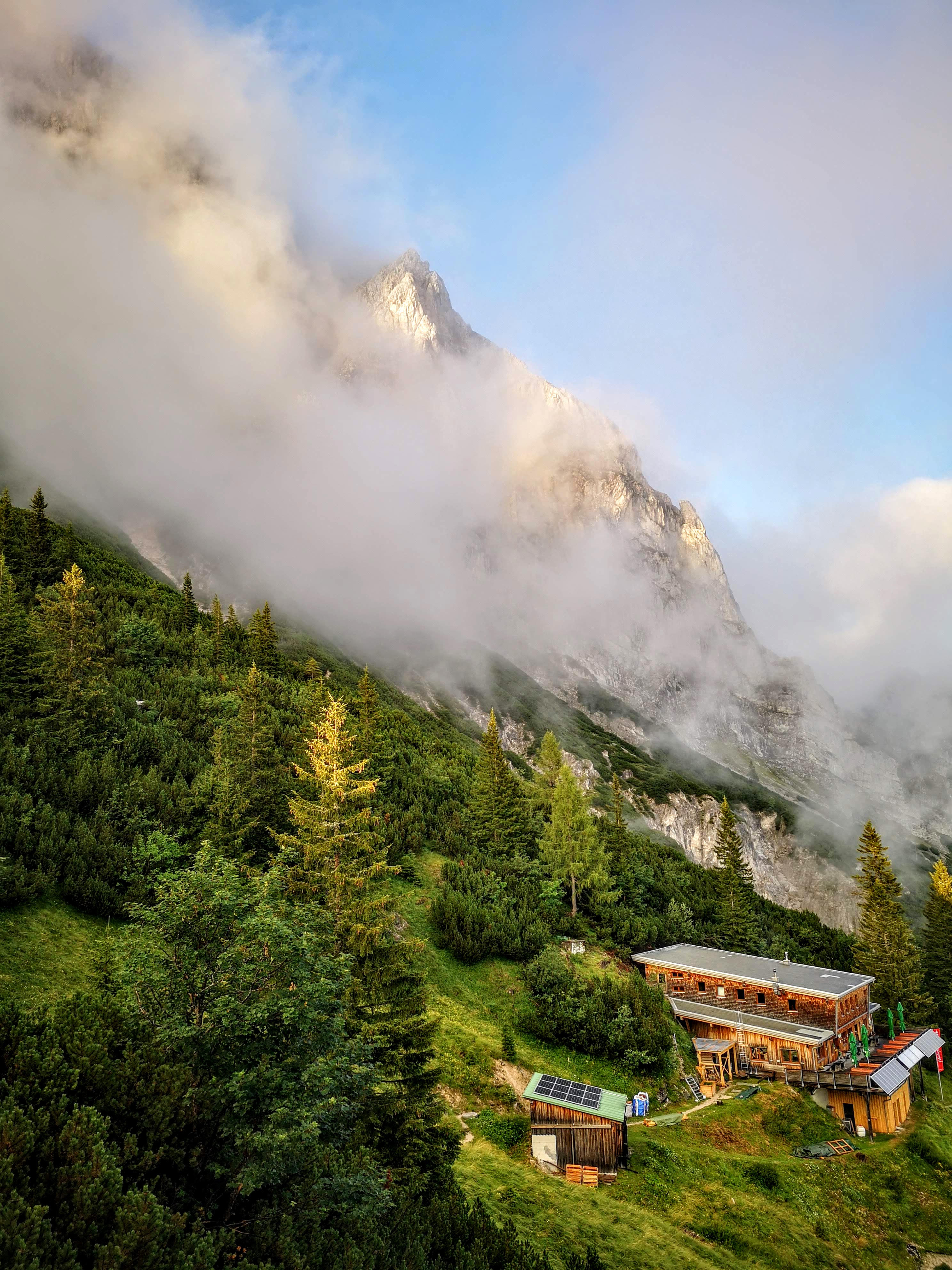 Damit habe ich ehrlich gesagt nicht gerechnet. Nach dem ankommen, trockenlegen & beziehen des Luxus-Lagers am Nachmittag (ein eigenes spendiert bekommen, weil koane 10 Leute da) den fetten Regentropfen und Nebelschwaden zugeschaut. Kein Netz – Ruhe. Abendessen. Und dann bleibt ma die Nachspeise fast im Hals stecken… es wird wieder heller draussen. Da wird doch nicht noch die Sonne vorbeischauen??? Doch – und wie… Das vielleicht schönste Ende eines Tages – der Nebel legt endlich die Gesäuse-Berge frei! Wenn die letzten Sonnenstrahlen die ersten des Tages sind. Liebe auf den ersten Blick – bei so einer Stimmung brauchts koane Worte. Hochtorgruppe, Admonter Reichenstein – ach, schauts selber!