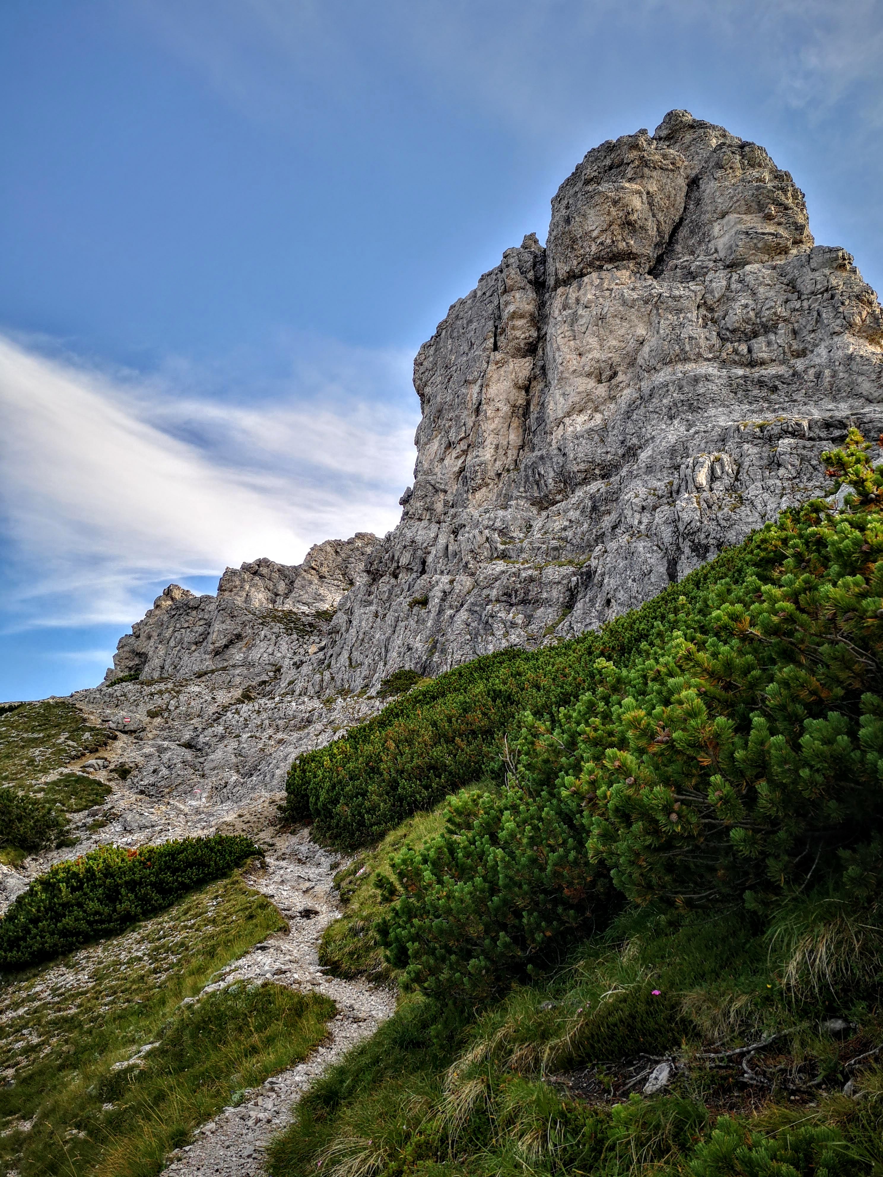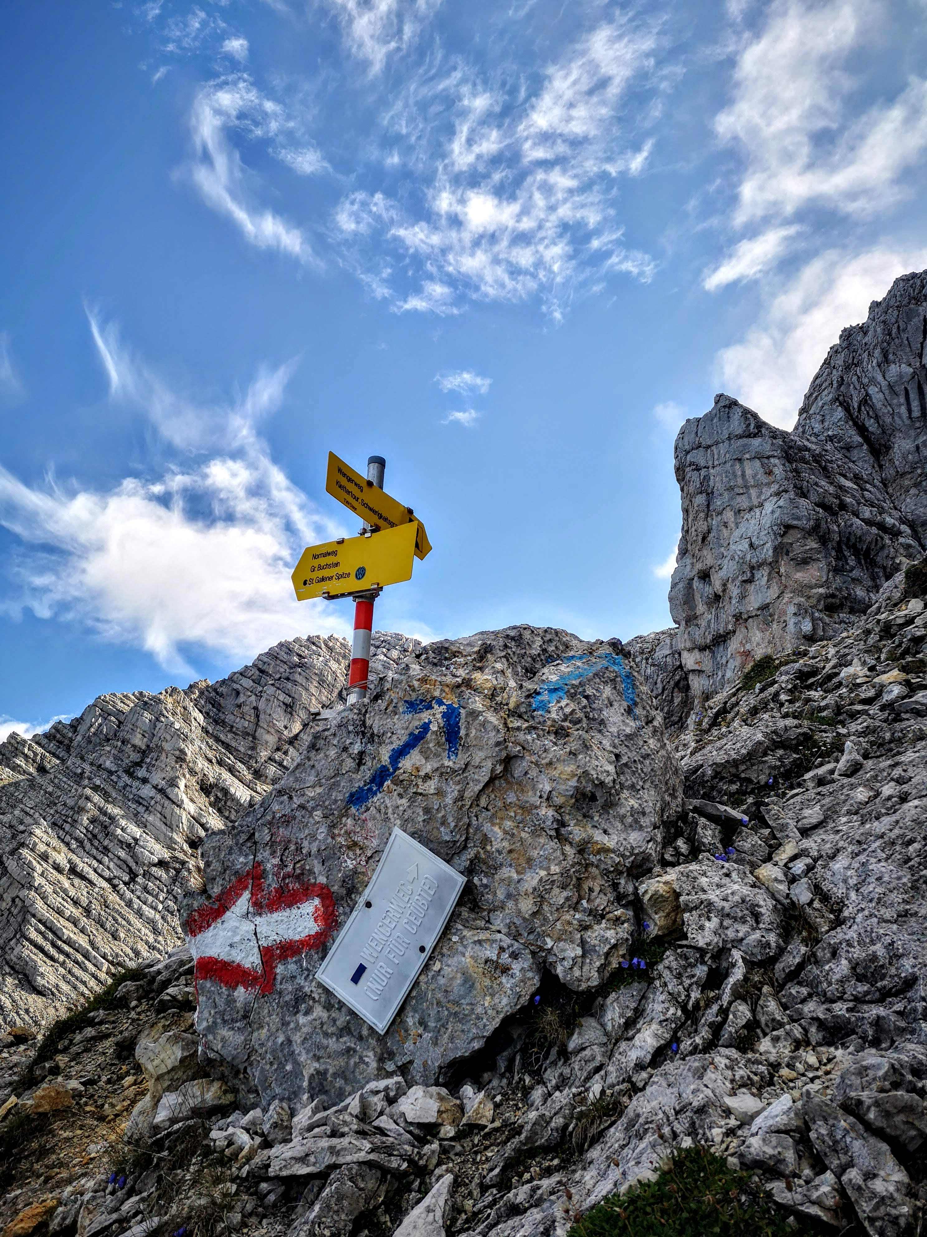 So guad gschlafen wie selten auf einer Schutzhütte. Frühstück reichlich. Wetter: perfekt! Prognose: am Nachmittag Gewitter möglich – also nix wie los und hoffen, dass die Morgensonne etwas vom Regen bzw der Nässe am Fels noch auftrocknet. Der Zustieg zum Wengerweg Einstieg verläuft über den Normalweg. Auch dieser ist steil, stellenweise etwas ausgesetzt, luftig und geröllig. Die schwarze Wegmarkierung trägt er nicht zu unrecht – nur bis zum Buchsteinhaus ist es ein Wanderweg. Danach eine alpine Tour! Erst noch ein feiner Steig, ein markanter Felsen ist der Eintritt in einer rauere Welt.