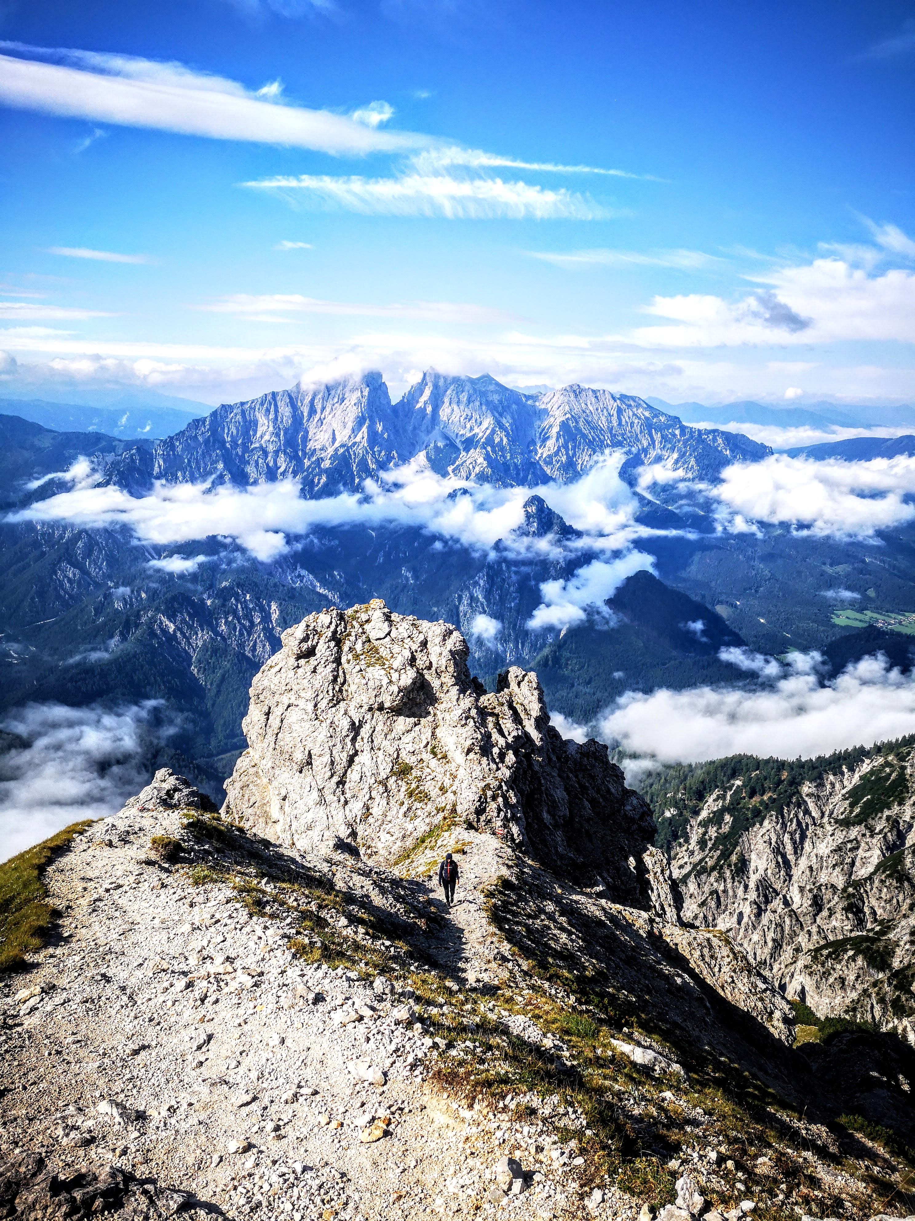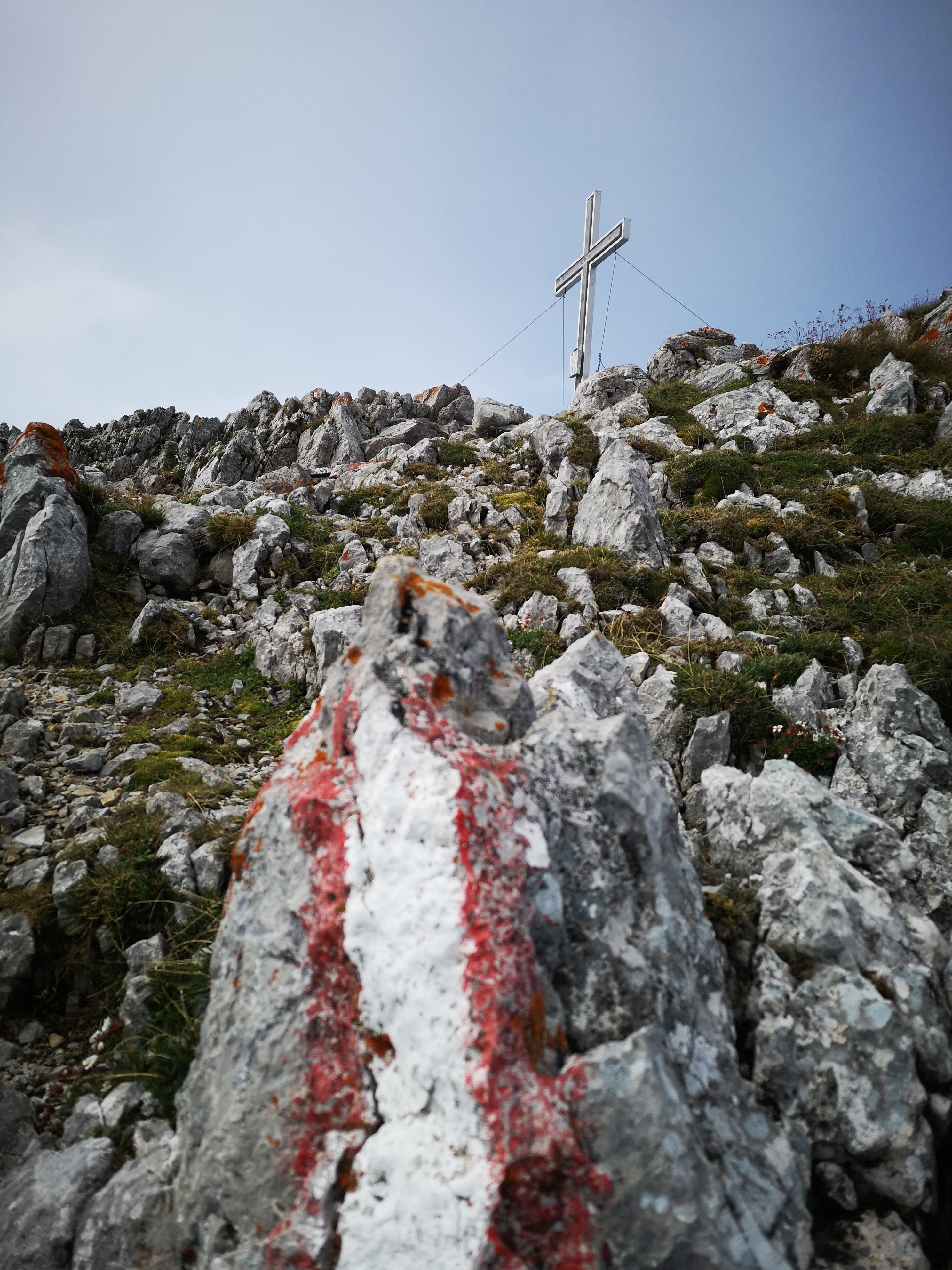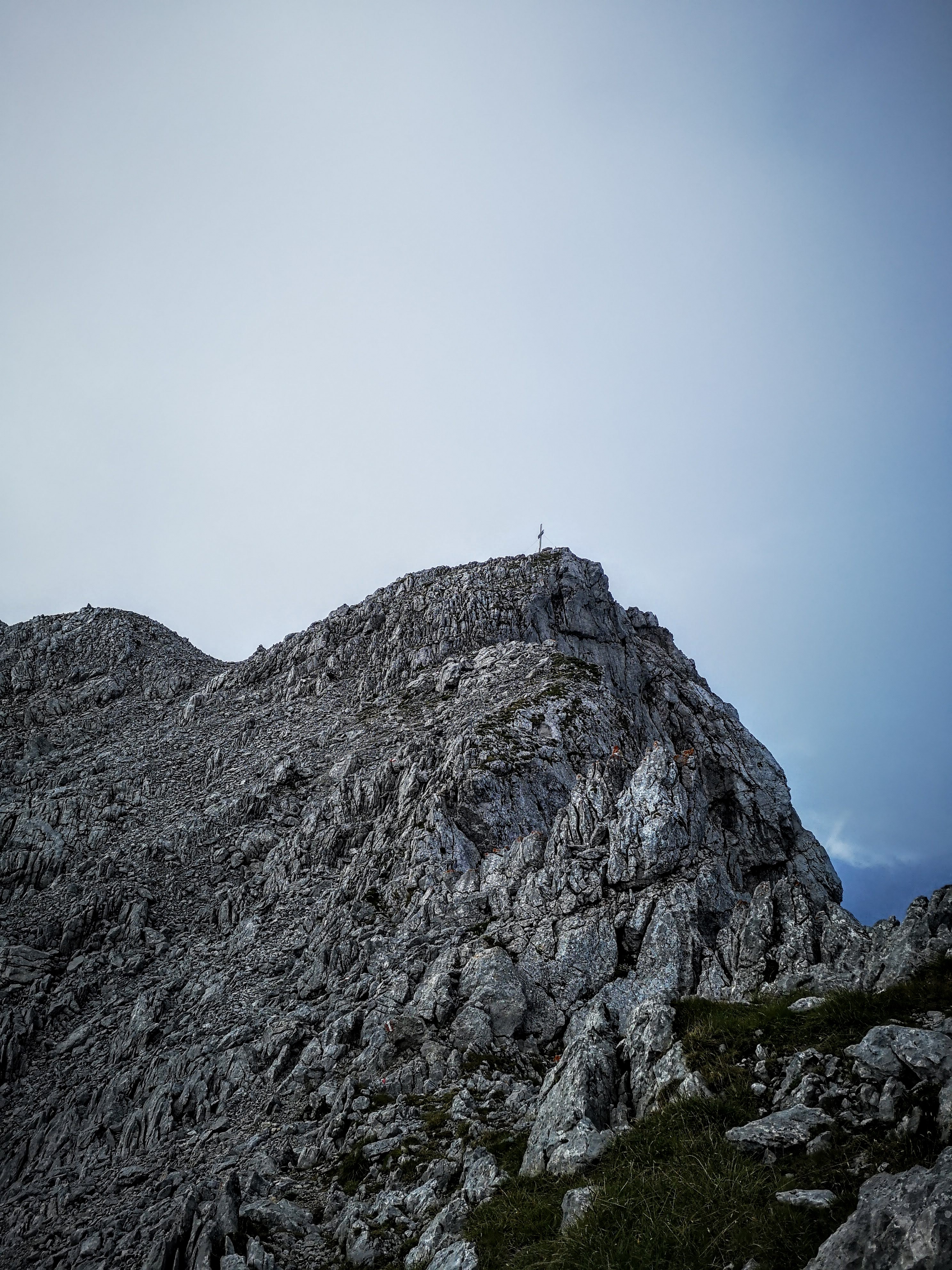 Beim A wie Ausstieg quetscht man sich noch durch einen markanten Felsschlurf, owe auf de Knia… a Gaudi! Bis zum Gipfel wartet noch einiges an Schrofen- & feinem Blockgelände. Zumindest sieht man das Kreuz schon, auf wenn Nebelschwaden über die Südwand herauf drücken… Dementsprechend gabs keinen Ausblick vom Kreuz (genausowenig wie ein Gipfelbuch). Dafür kalten Wind – viel davon. Leichtes Jackerl aussa, aber schnell. Ein Pauserl in Ehren muss sein. Besser wirds aber nicht mit dem Nebel, also weiter. Über den Grat weiter bis zu einer alten Gedenk-Tafel, nahe dem Einstieg ins Südwandband.
