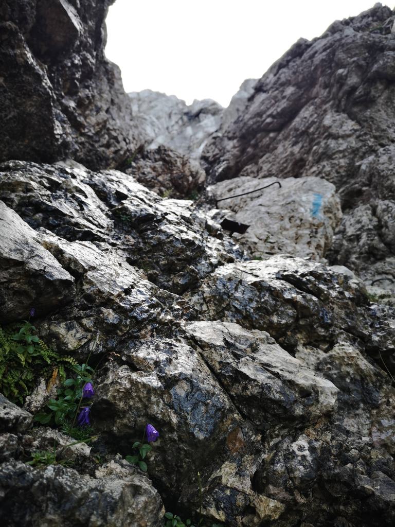 Viel hab ich nicht fotografiert im Wengerweg. An dieser Stelle stand ich etwas länger… meine Schlüsselstelle bei den Glockenblumen. Wie nass es dort im Kamin war, sieht man deutlich. Auch erkennt man einen alten Stahltritt und einen Bügel. Beides hat mir nicht wirklich geholfen, evtl war ich mit meinen 1,70 zu klein um mich über den Stein zu wuchten oder es fehlt schlicht die Technik. Im Endeffekt bissi nach rechts ausgewichen, a Mix aus verspreizen, Klimmzug & 1x fluchen – obn war i…