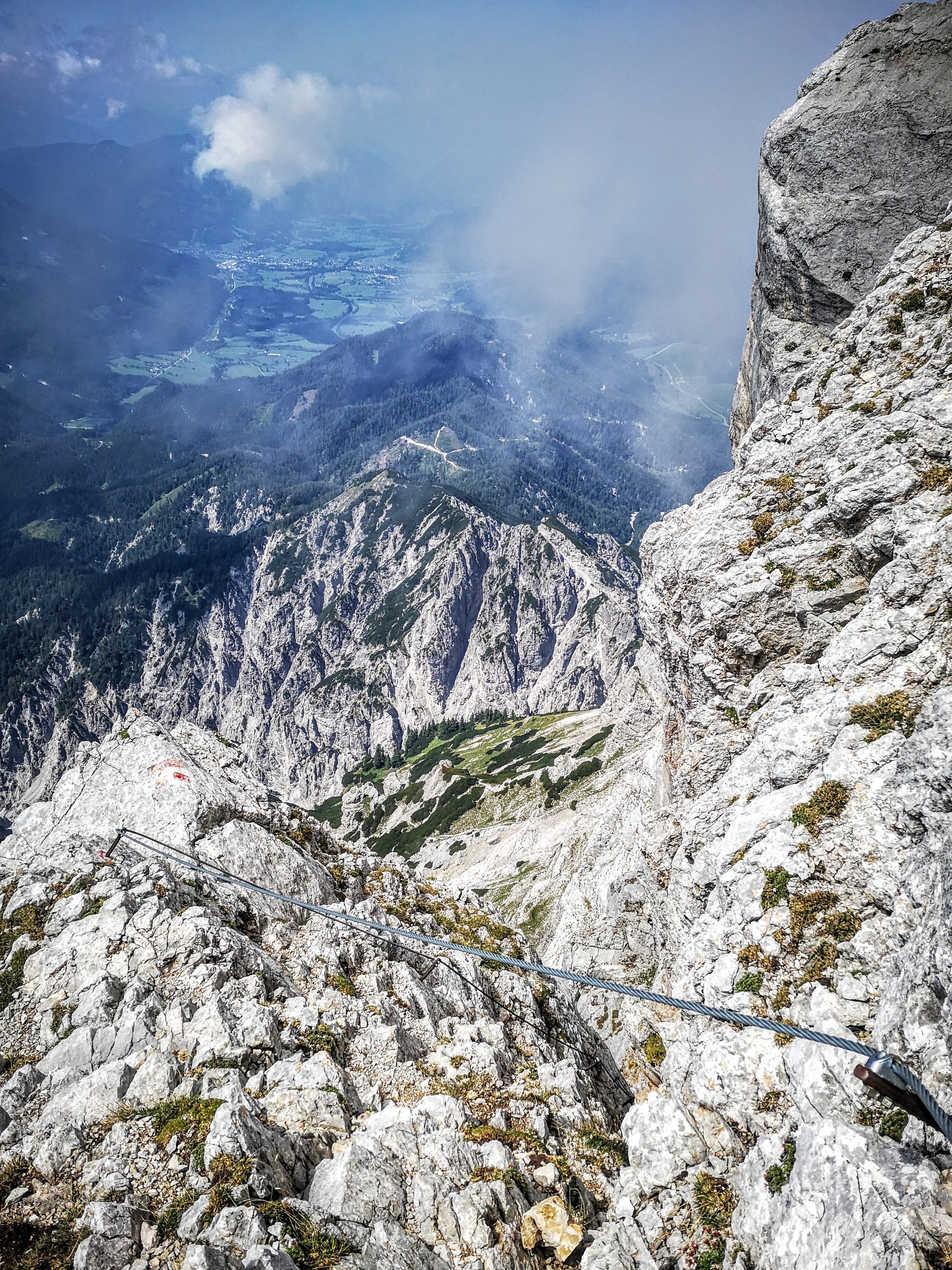 Der Einstieg zum Südwandband ist steil, ausgesetzt und nicht versichert (Absturzgelände). Nicht wirklich fein zum bergab gehen. Erst a ganzes Stück weiter unten erreicht man den Klettersteig bzw das Stahlseil. Ein tlws luftiger Abstieg, 450m lang und top gewartet! Als Abstiegsoption für mich eine gute Wahl, der mir und meinen Knie ans Herz gelegt wurde. Wir sagen Danke! PS: es gibt eine einzige Bergauf-Passage im Südwandbandklettersteig – zumindest, wenn man diesen als Abstieg geht…