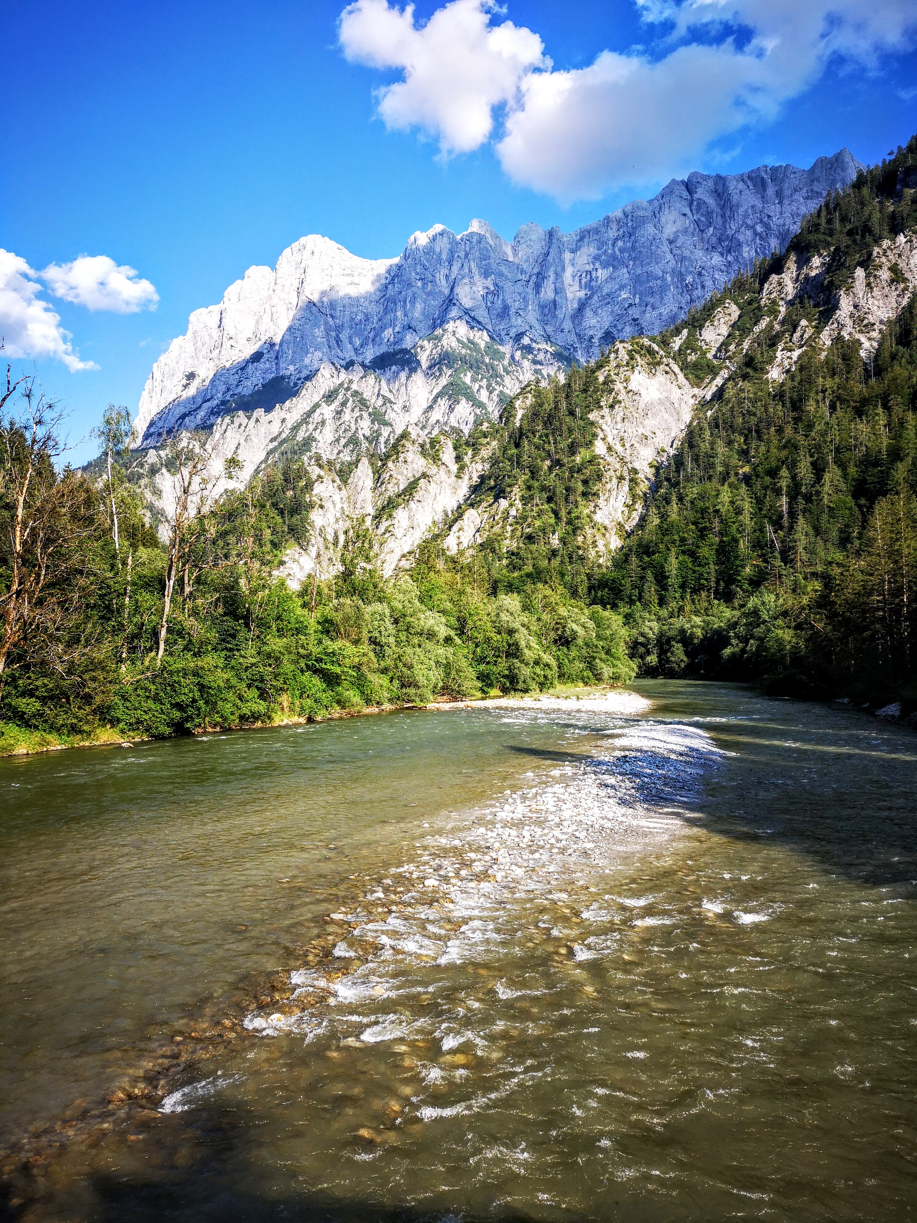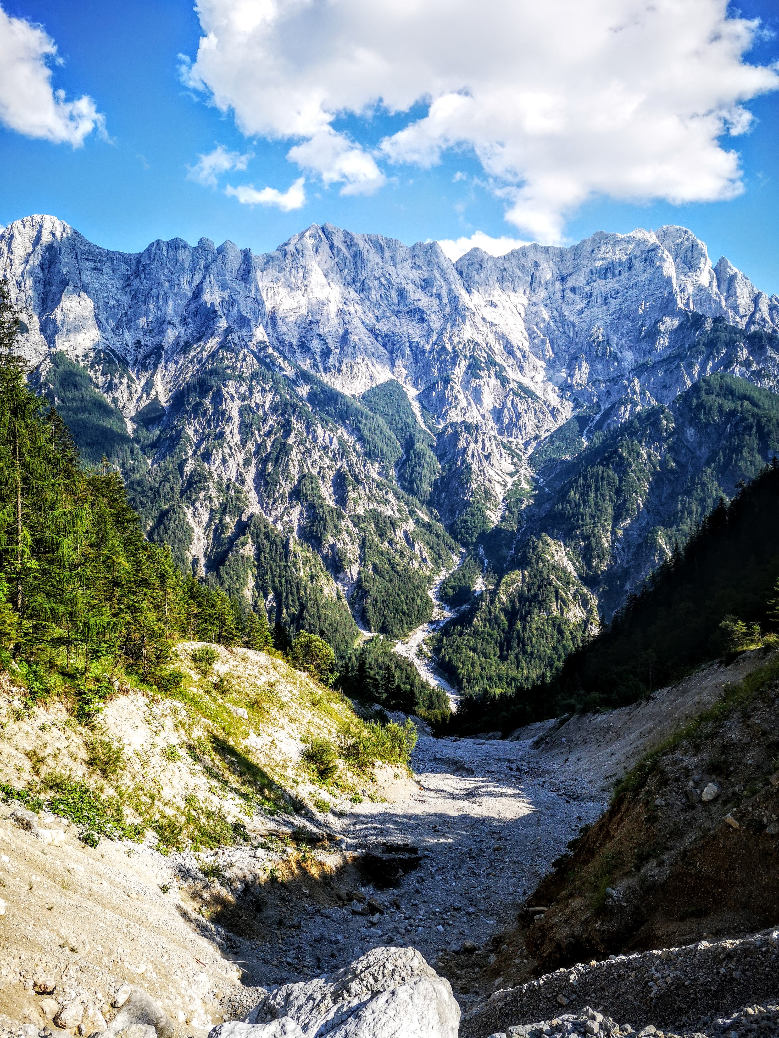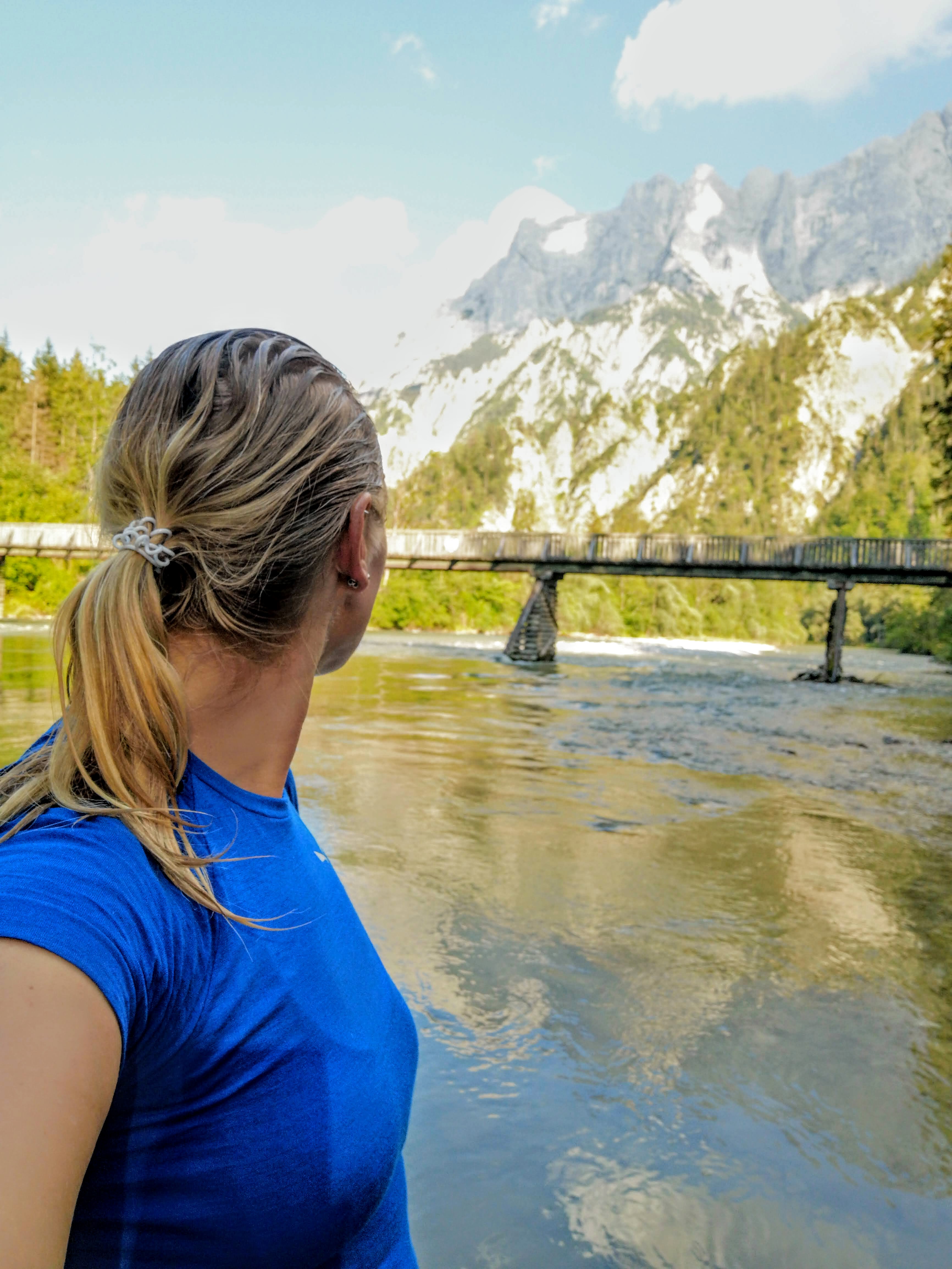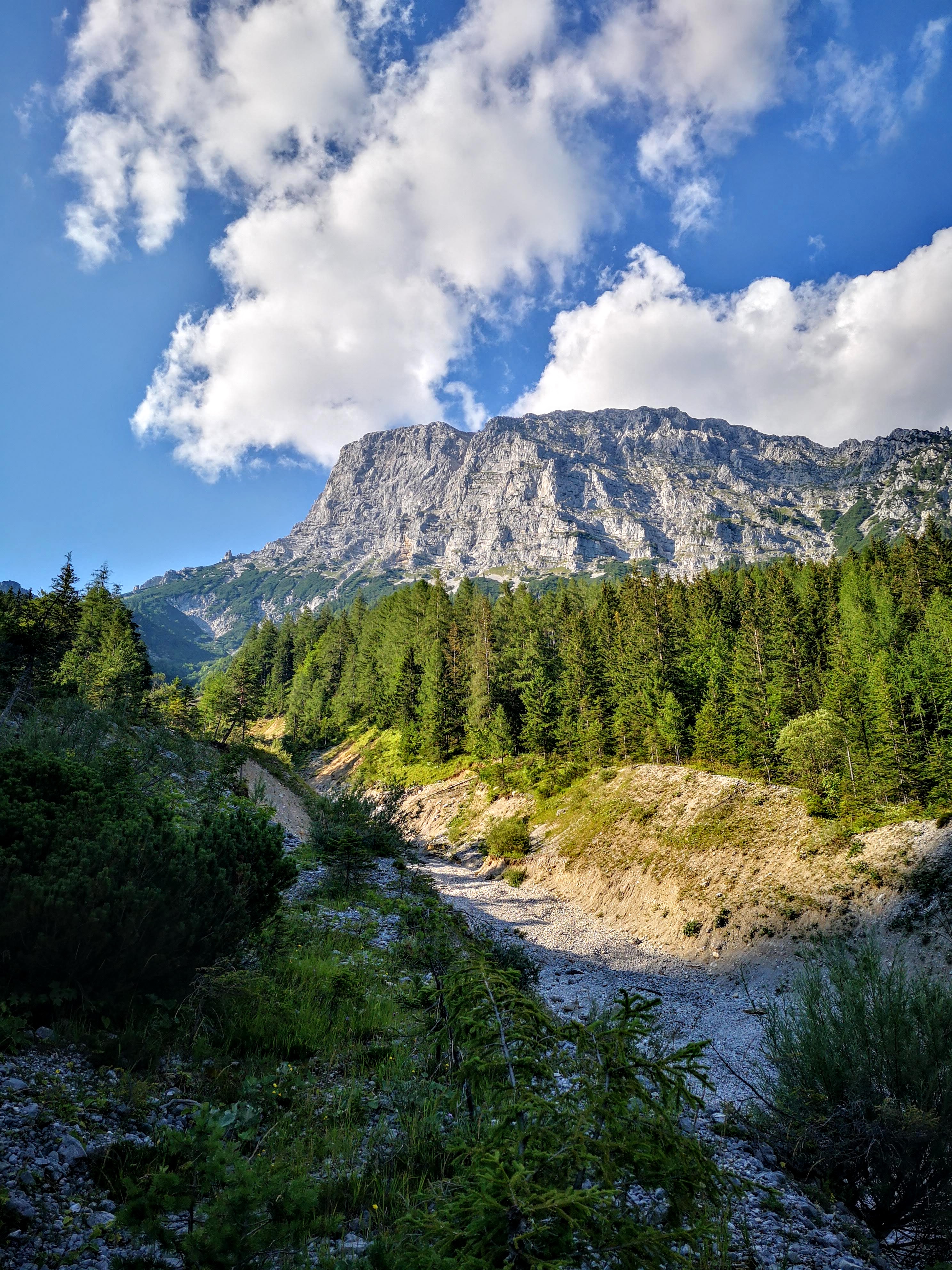 Zurück am Buchsteinhaus gibts a gscheide Stärkung in Form von einem Kaspressknedlsalat (2 Knedl, vadient) auf der Terrasse, die Sonne brennt. Von Gewitter weit und breit nix mehr in der Prognose. Zsammpacken, owi ins Tal. Vorfreude auf eine Abkühlung in der Enns – am Johnsbachsteg ist einer der wenigen erlaubten Badeplätze (zum Schutz des Mauerläufers). Weil: duschen war i nit am Buchsteinhaus, wenn das Wasser sowieso scho knapp ist. Allerdings interessiert dieser Fakt nicht jeden – da hab ich mich schon über die deutsche 3er Urlauber-Partie gewundert, die die Hütte scheinbar mit einem Hotel verwechselt hat. Aber zurück zu den Erinnerungen, die bleiben. Und wie der Aufstieg im Regen geendet hat, beginnt der Abstieg vom Buchsteinhaus – Gams überall… Was im Aufstieg verborgen blieb – der Blick zurück zum Gr. Buchstein, rechts der Kühgraben. Erinnert’s euch an das Nebelfoto – fast selbes Platzal.