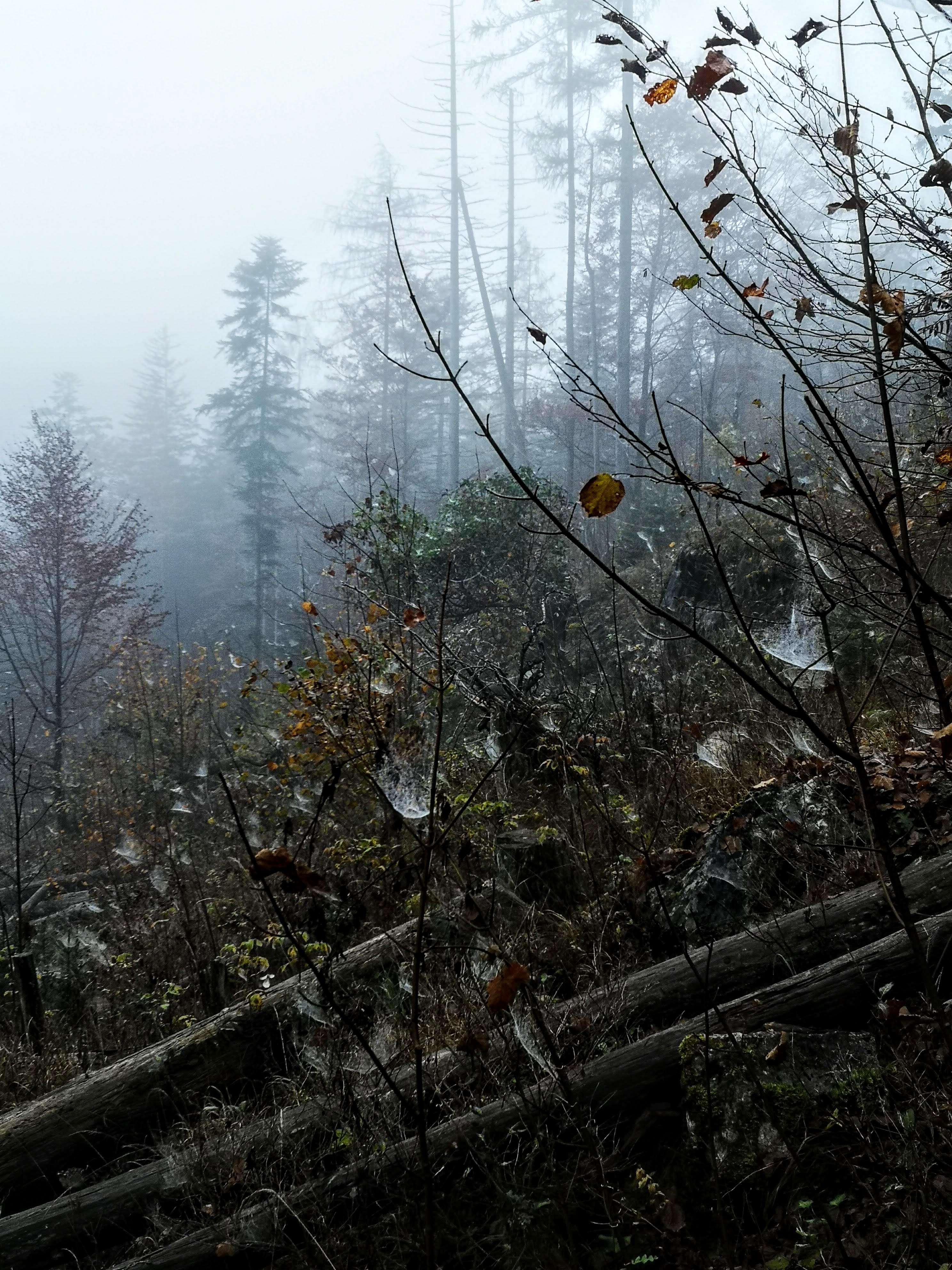 Gscheid zapfig (ugs kalt) in da Fruah, Frost auf meiner Haube – deswegen gibt es auch vom ersten Abschnitt der Tour keine Fotos. Auch nicht vom Windwurf Walzer tanzen am Beginn des Wasserfallsteigs – wo zT Bäume kreuz und quer liegen. Entweder unten drunter durch oder oben drüber… Gymnastik am Morgen ist ja eh was feines. Rutschige weil feuchte Wurzeln eher nicht. Hier trocknet im Herbst schon lange nichts mehr auf. Dicker Nebel – aber der Kummerwald wurde damit stimmungsvoll in Szene gesetzt. Dieser hat sich zumindest hat sich dann kurz vorm Wasserfall aufgelöst und endlich a bissl was von der Umgebung gezeigt. Nachdem man das rauschen lange vorher schon hört, ist der Moment umso eindrucksvoller, wenn man zum ersten Mal den Wasserfall sieht. Ich steh vor seiner gigantischen Wand und überlege, wo es jetzt da weiter gehen soll… Kein erkennbarer Weg auf den ersten Blick. Der Aufstieg führt fast bis zur Wand beim Wasserfall, dieser wird dann von li nach re gequert und danach gehts steil am Wandfuss in Serpentinen nach rechts oben in die sogenannte Kanzel.