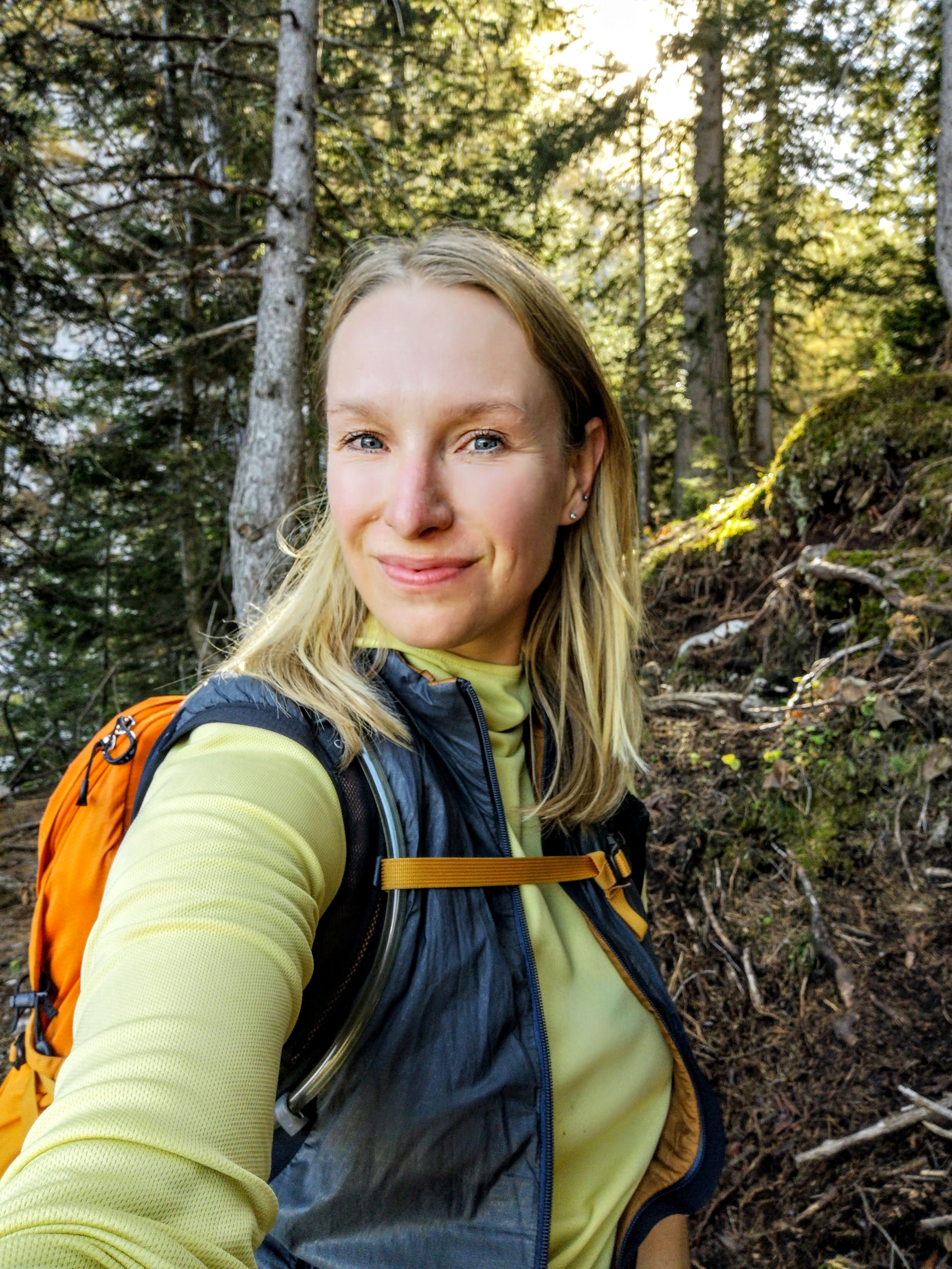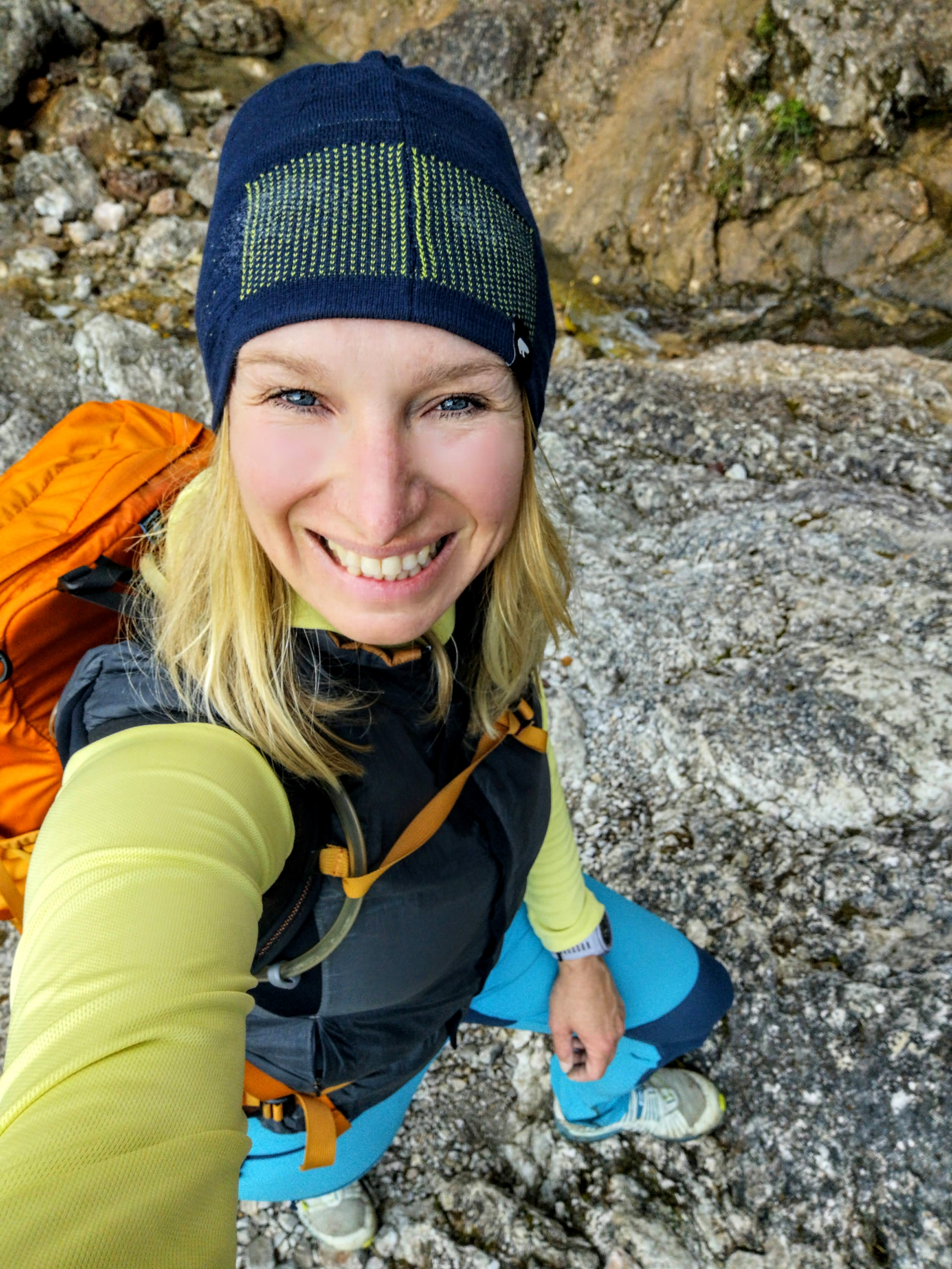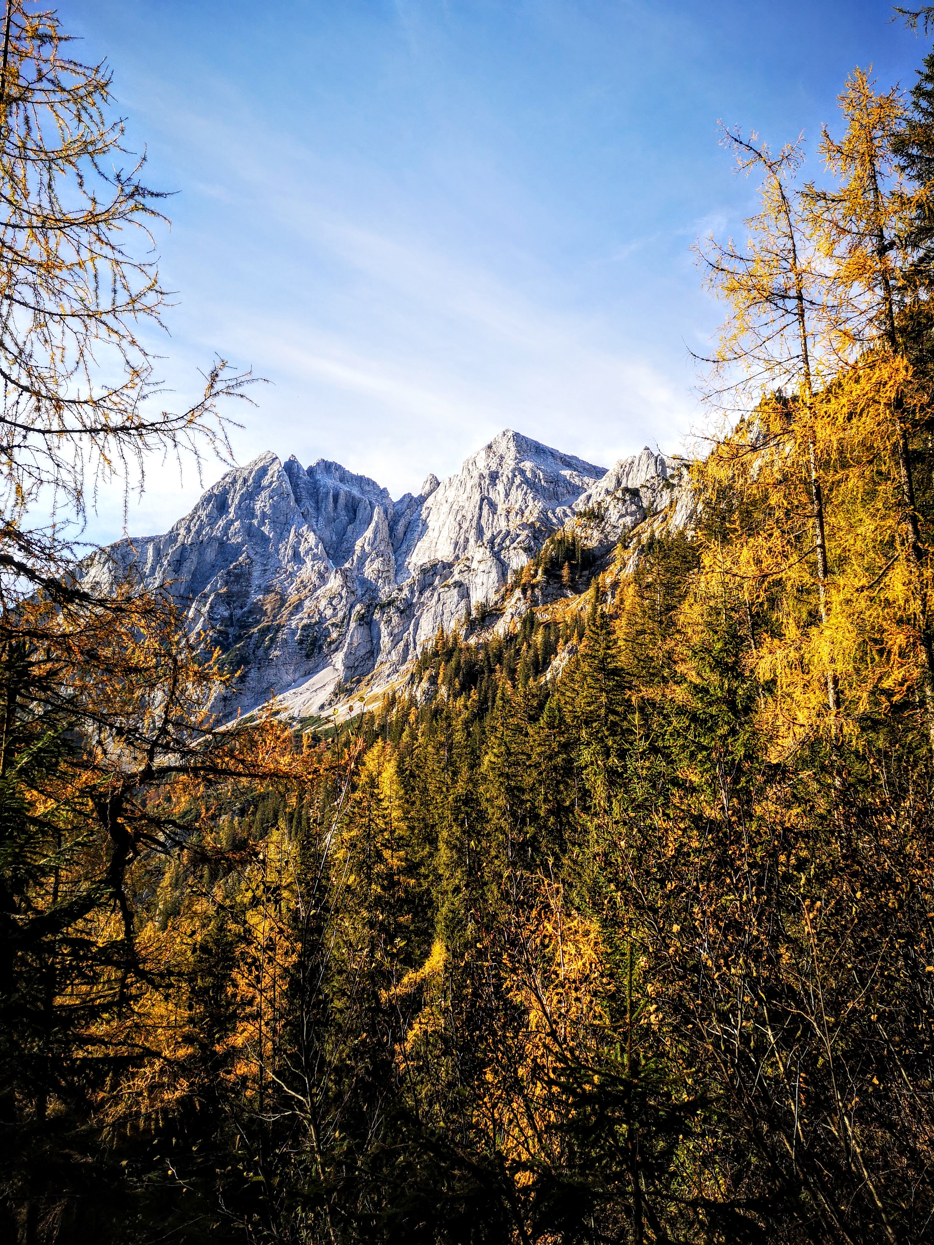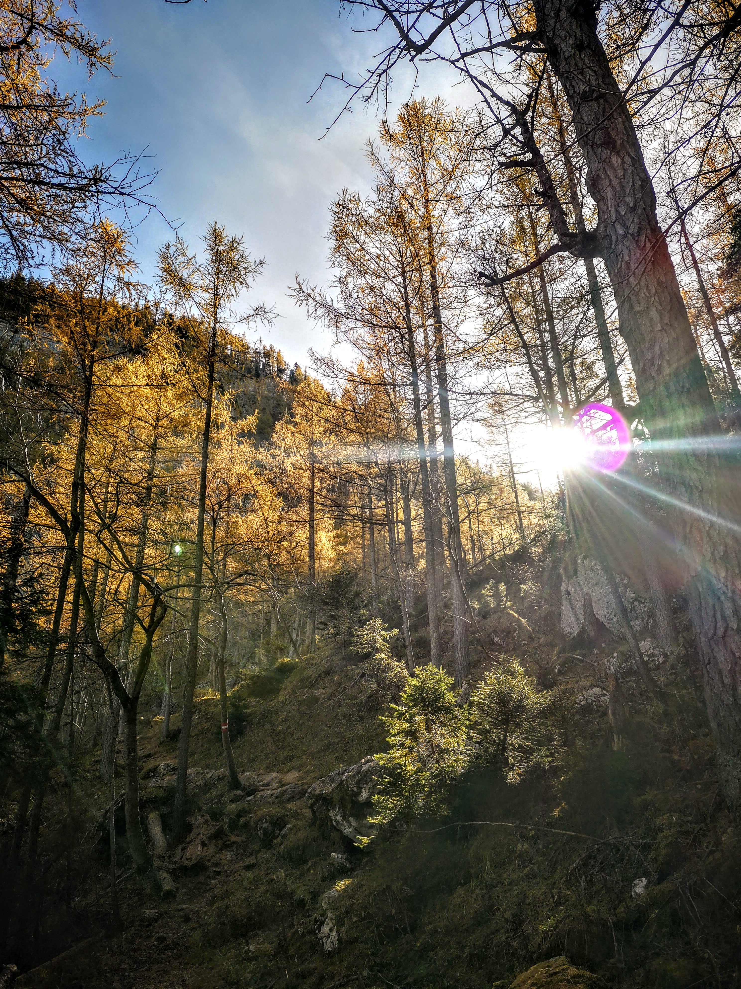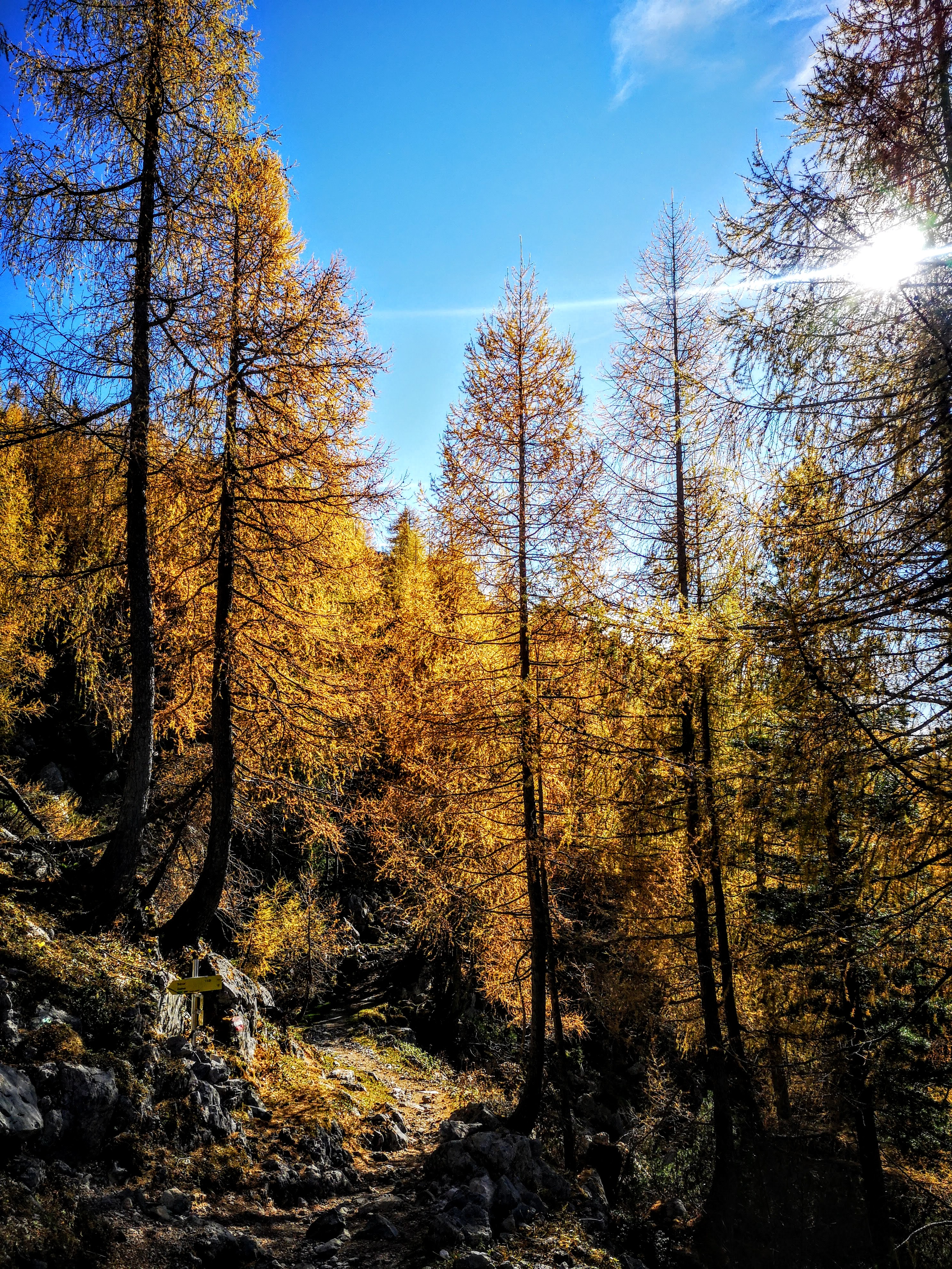 Und nach der ersten Leiter warten zum Teil steile Felsstufen, ausgesetzt aber zum Glück nicht feucht. Nach dem Wasserfall hat wer den Föhn eingeschalten… Und wenn man glaubt, es kann nach 7 Leitern und diversen Kraxlpassagen (versichert und unversichert) keine mehr durch des Wandl kommen, steht noch eine mit 72% bereit. Zum Glück aber nur mit 27 Stufen. Insgesamt 178 Stufen gibts zu überwinden – ja, alle gezählt… Und dann wärmen nach 3,5h Aufstieg die ersten Sonnenstrahlen des Tages mein verschwitztes Gesicht. Ein wunderschöner Waldweg bringt mich zum Butterbrünnl, wo es nur so gluckst und rinnt. Irgendwie unwirklich des Platzal – aus dem grauen Fels ins satte Grün und Gelb der leuchtenden Lärchen… so vü schee!
