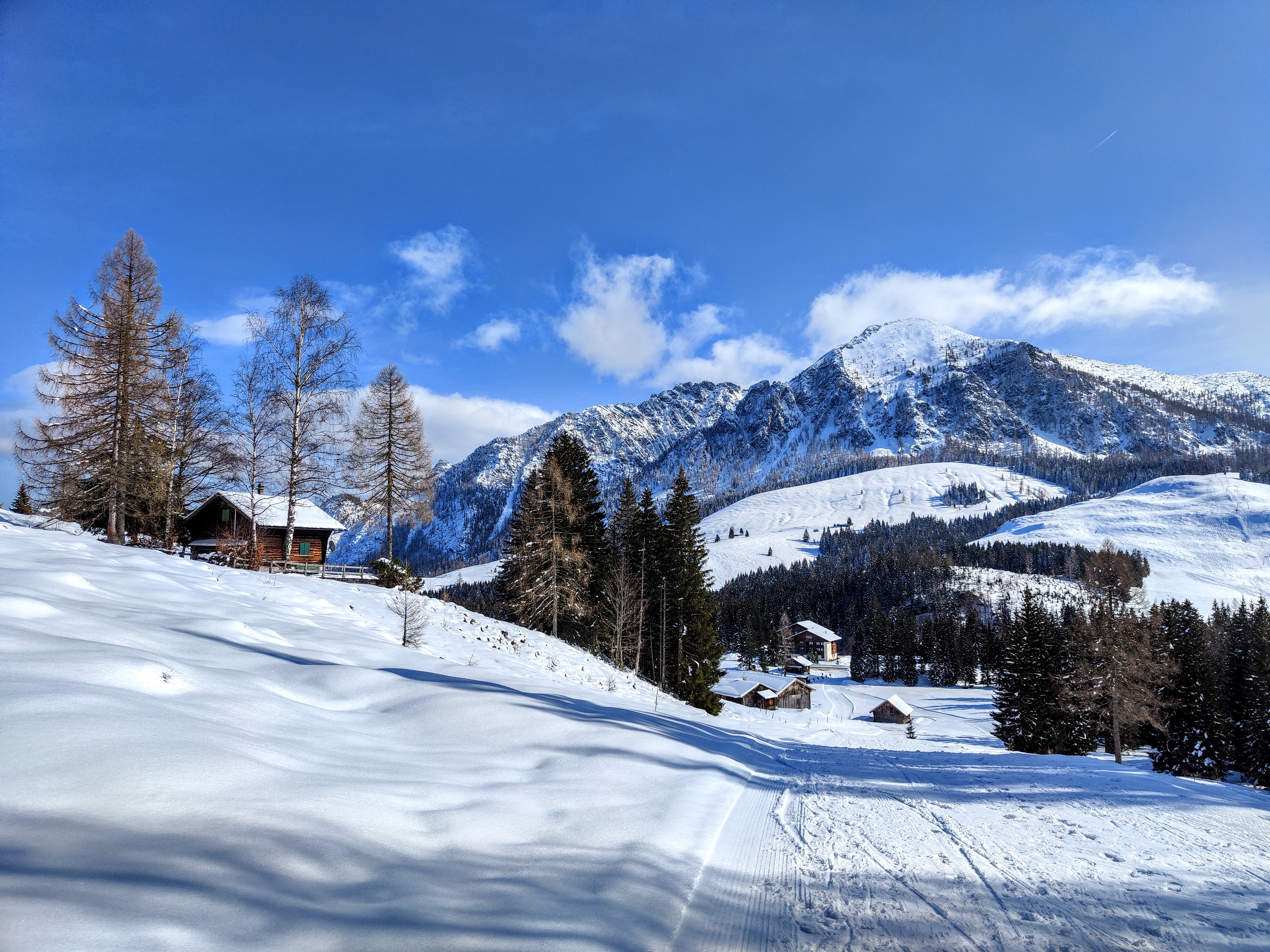 Sonnenspazierer am präparierten Winterwanderweg des Postalm Plateaus – scheener geht Bergreha fast nimmer! Große Runde ca. 8km & 250hm – kurze Variante mit 4,5km & 200hm. Würde man bei jeder Hütte entlang des Wegs einkehren, sollte man viel Zeit einplanen… Mit und ohne Schneeschuhe machbar!