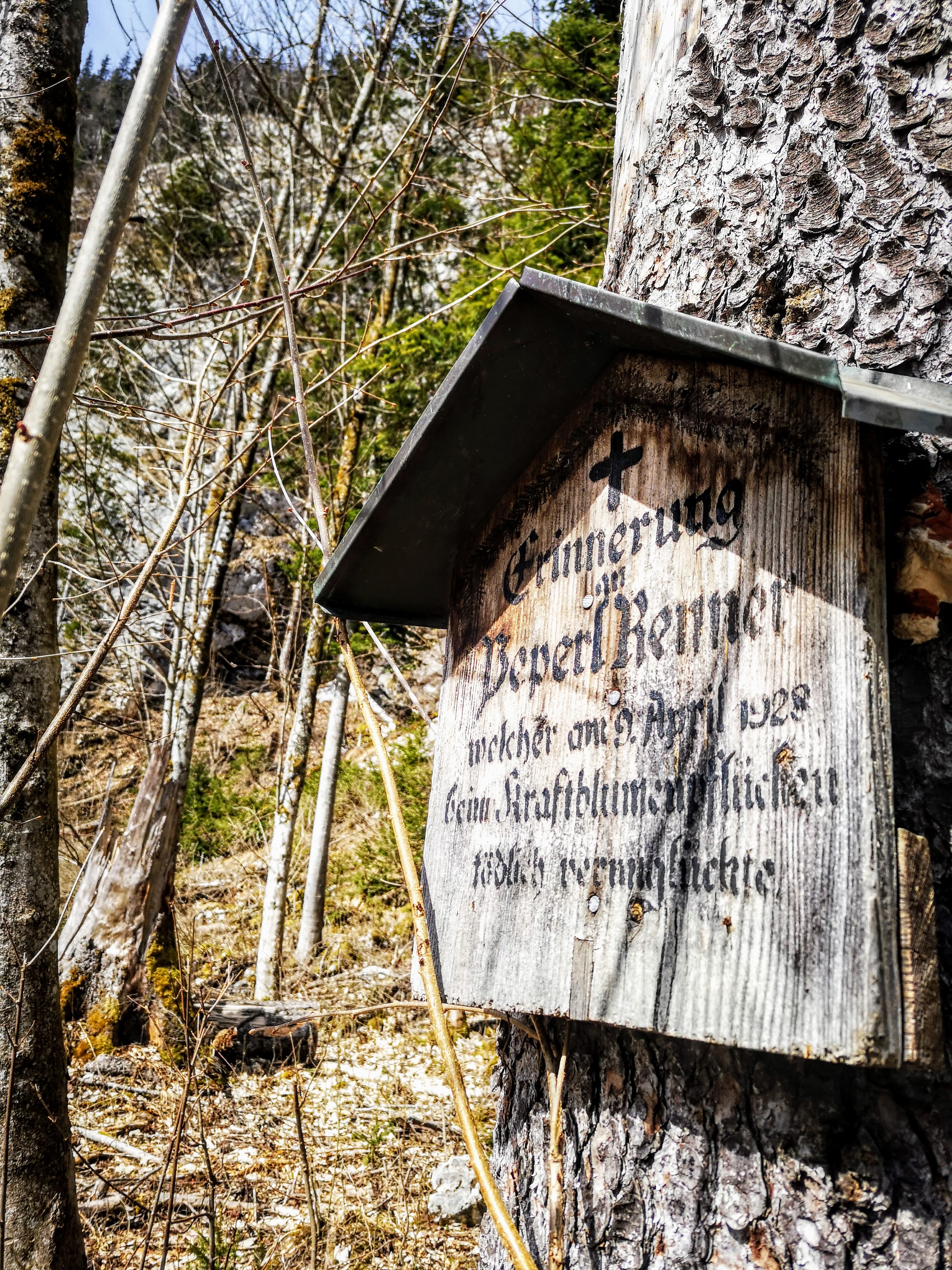 Alte Erinnerungen neben dem Steig, der schon damals mehr als eine Spur war. Manchmal besser, manchmal kaum mehr zu erkennen… Er führt parallel zur Weissen Wand, viel Totholz oder Baumbruch im ersten Teil – später ein schöner kleiner Waldweg! Dort liegt noch a bissl Schnee, man versinkt aber nur zw Knöchel- und Wadltief.