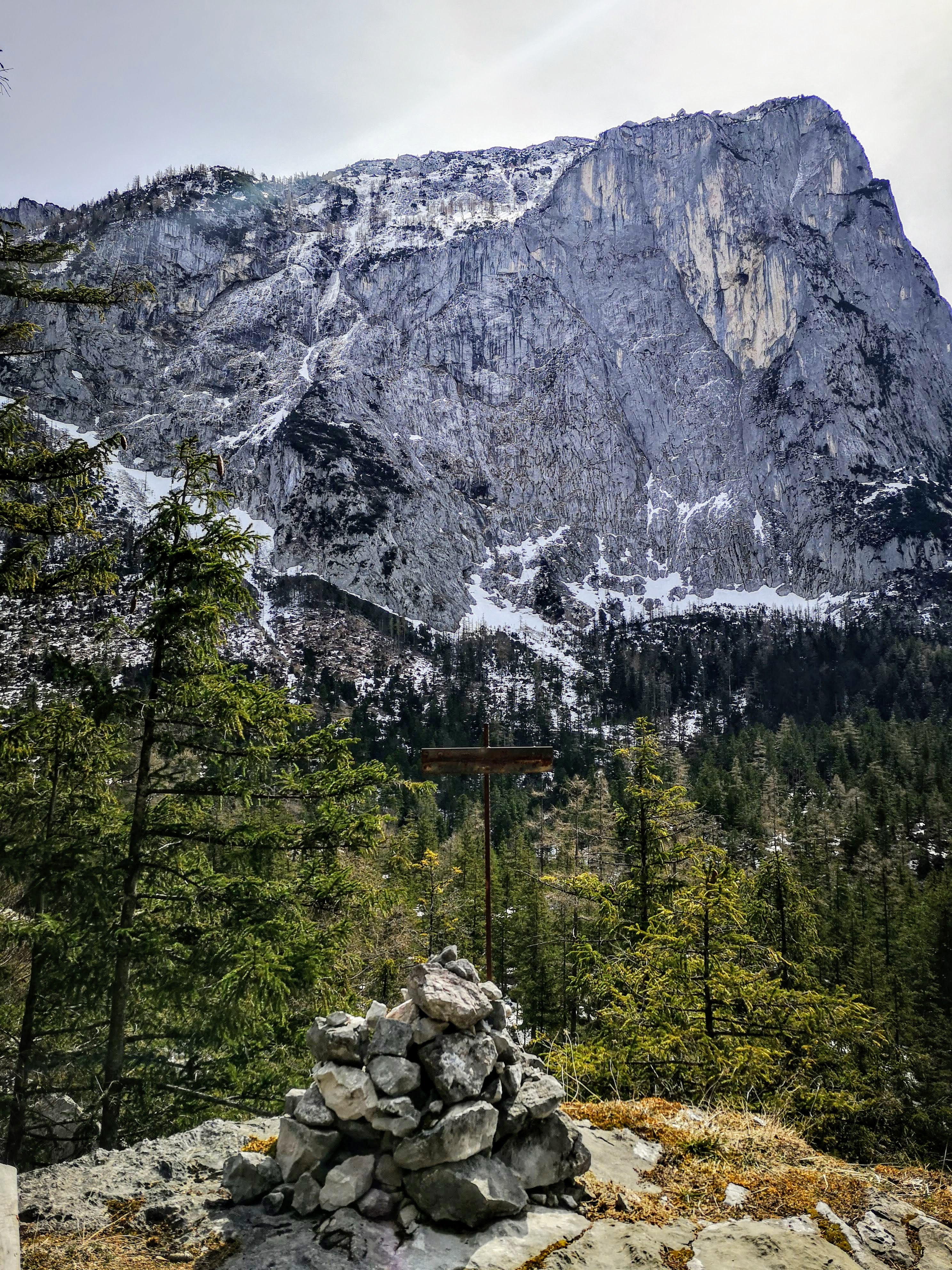 Nicht der Ostersee war mein eigentliches Ziel, es lag weiter hinten: am Ende der Seewiese startet im Wald ein großteils verfallener Steig zu einem anderen Kraftplatzerl – zwischen mächtigen Felswänden und großen Gesteinsbrocken. Man sagt, einer der mächtigsten im Ausseerland. Beschreiben kann man es nicht – nur fühlen… 200hm über Altaussee gelegen und doch so weit weg von allem. Nah an der Felswand „Weisse Wand“ führt der Weg nach rechts und nach einem kurzen Stück Forststrasse, beginnt links der Steig. Dort ist genau eine Markierung zu finden: zum Gaisknechtstein…