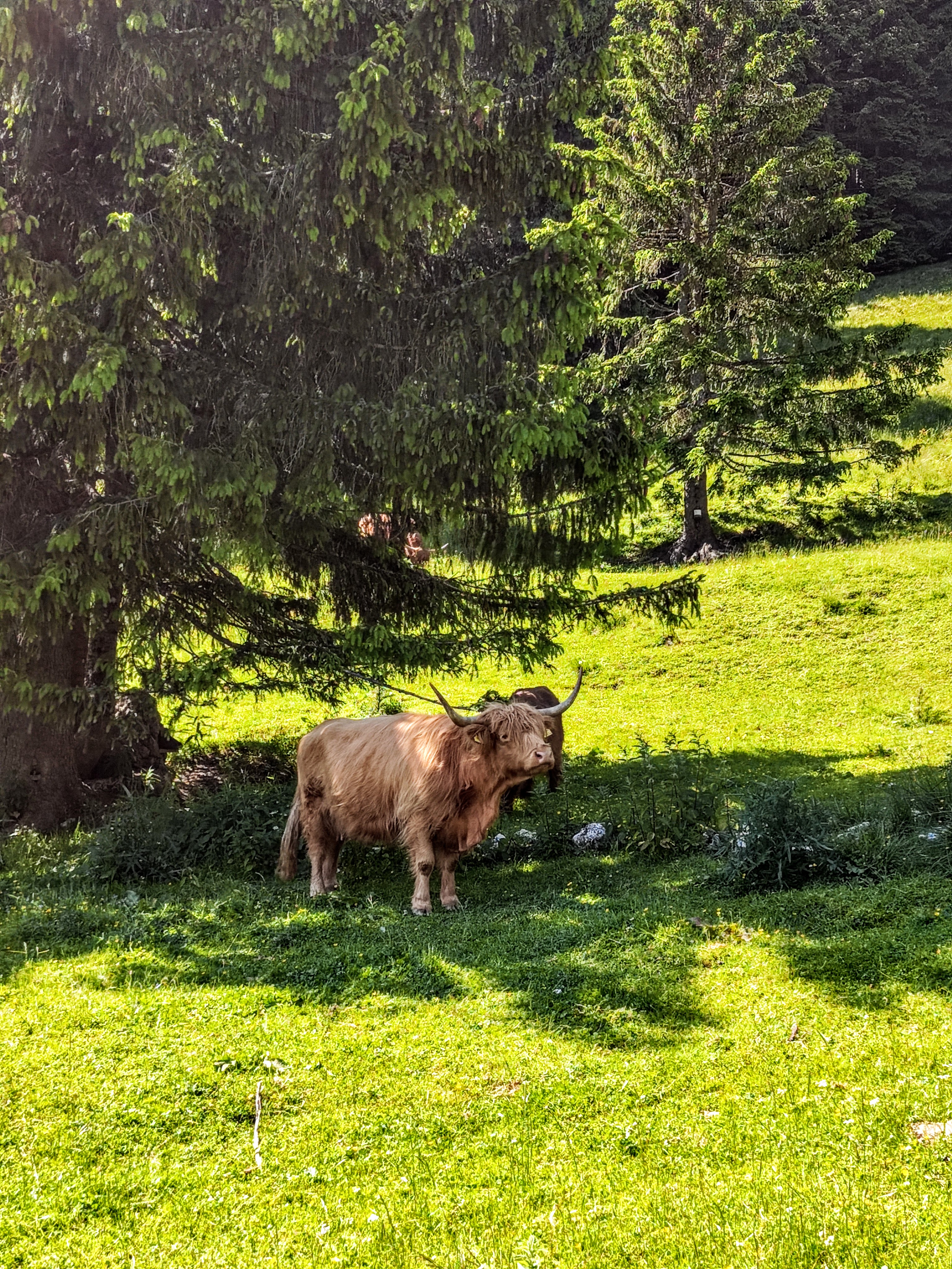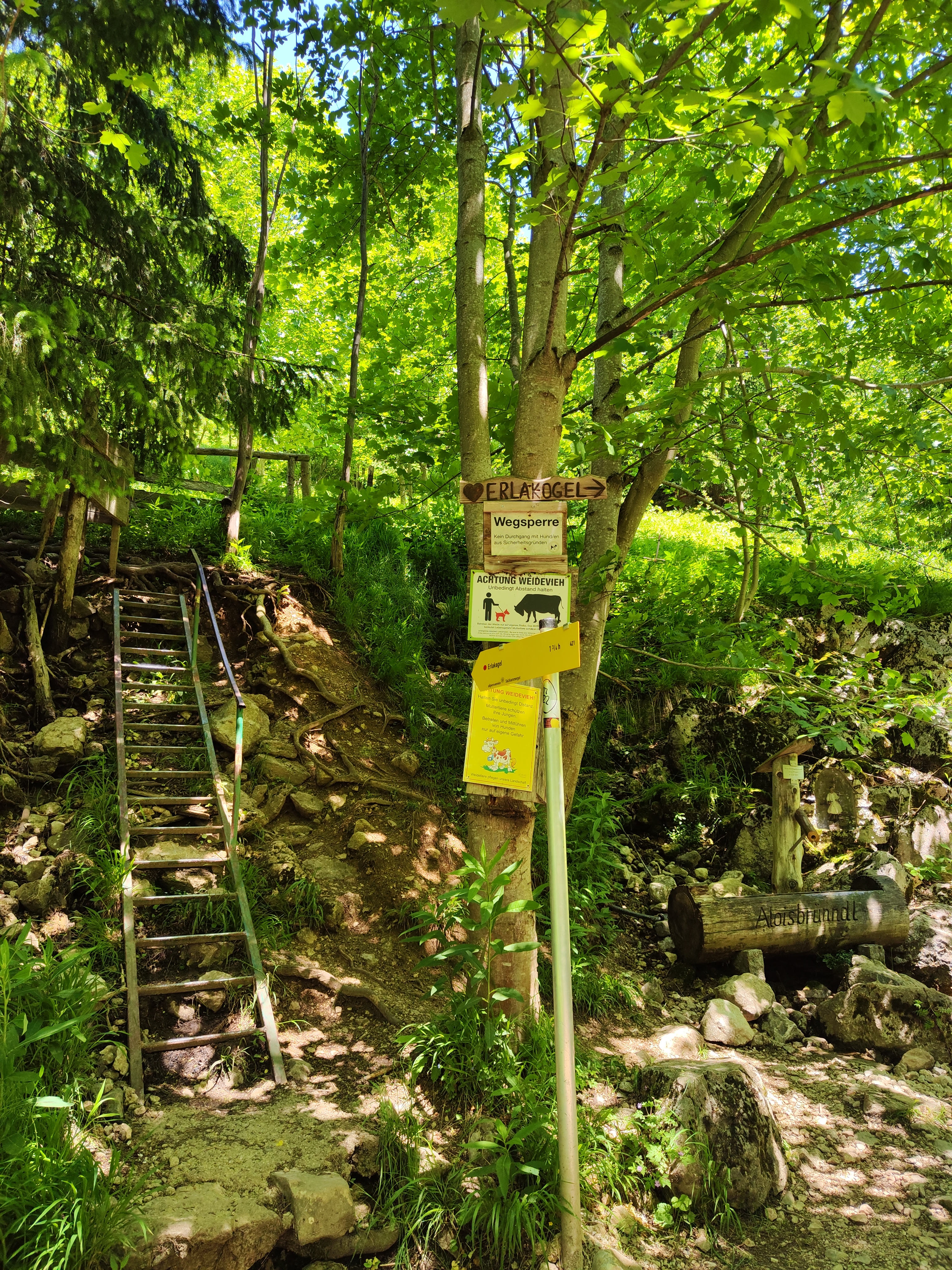 Gemeint ist der Aufstieg – viel mehr zu sagen gibts dabei auch nicht. Bzw ist alles im Einlauftext beschrieben. Ein paar Hinweise gibts aber durchaus noch, bevor ich wieder mal die Bilder sprechen lasse… Ab dem Aloisbrunnen gibts für alle, die mit Hund unterwegs sind, eine kleine Umleitung – bitte über die Forststrasse großräumig die Alm umgehen. Diese trifft dann weiter oben wieder auf den direkten Wanderweg. Grund: die schottischen Hochlandrinder samt Nachwuchs, die frei im Almgebiet unterwegs sind! Samt Hinweisschild mit Erklärung. PS: so liab’s & wahsinnig neugierig de kloan Kalbal a san, die Mamis schaun deswegen ganz genau, bitte einfach durchgehen – a Alm is koa Streichelzoo! Sie san übrigens überall verteilt und haben richtig viel Platz auf da Spitzlstoaalm oben.