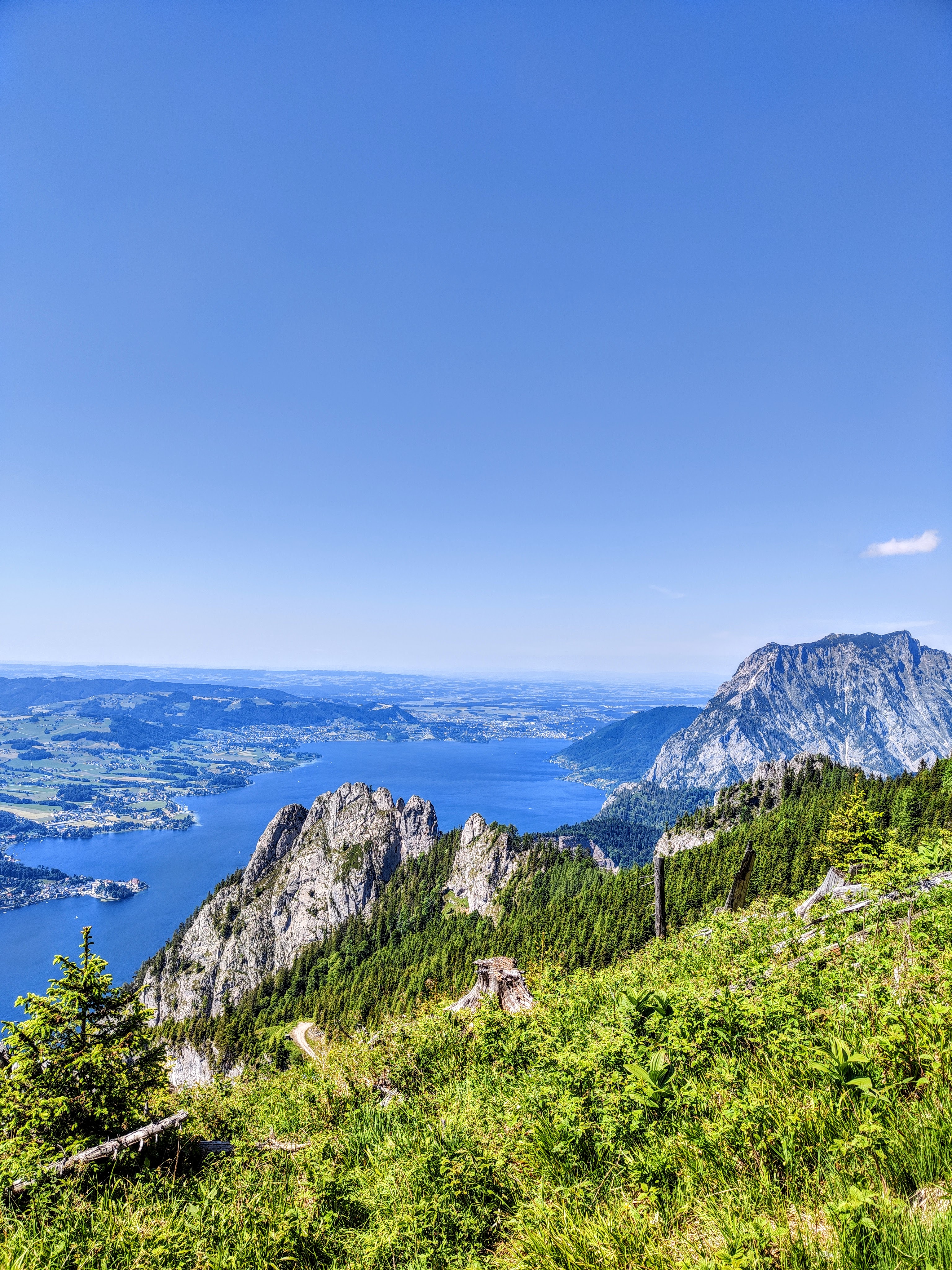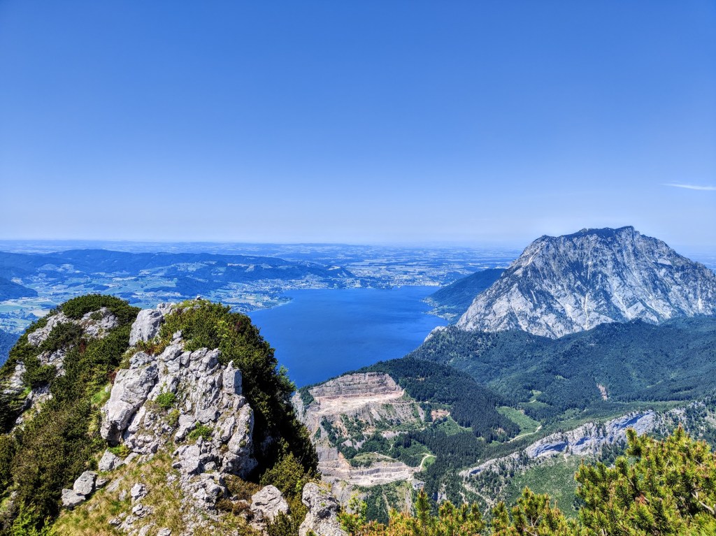 Einerseits der Blick auf Ebensee, den Feuerkogel samt Höllengebirge und links auf die Spitzelstoaalm & den Sattel. Das Tote Gebirge. Wer am Gipfel ganz genau schaut, erkennt neben dem Traunsee auch noch den Langbathsee. Und dann wäre da noch die Prominenz, der mächtige Traunstoa (Tour Traunstein 1691m via Naturfreundesteig ), der kl. & Grosser Sonnstein 1037m …