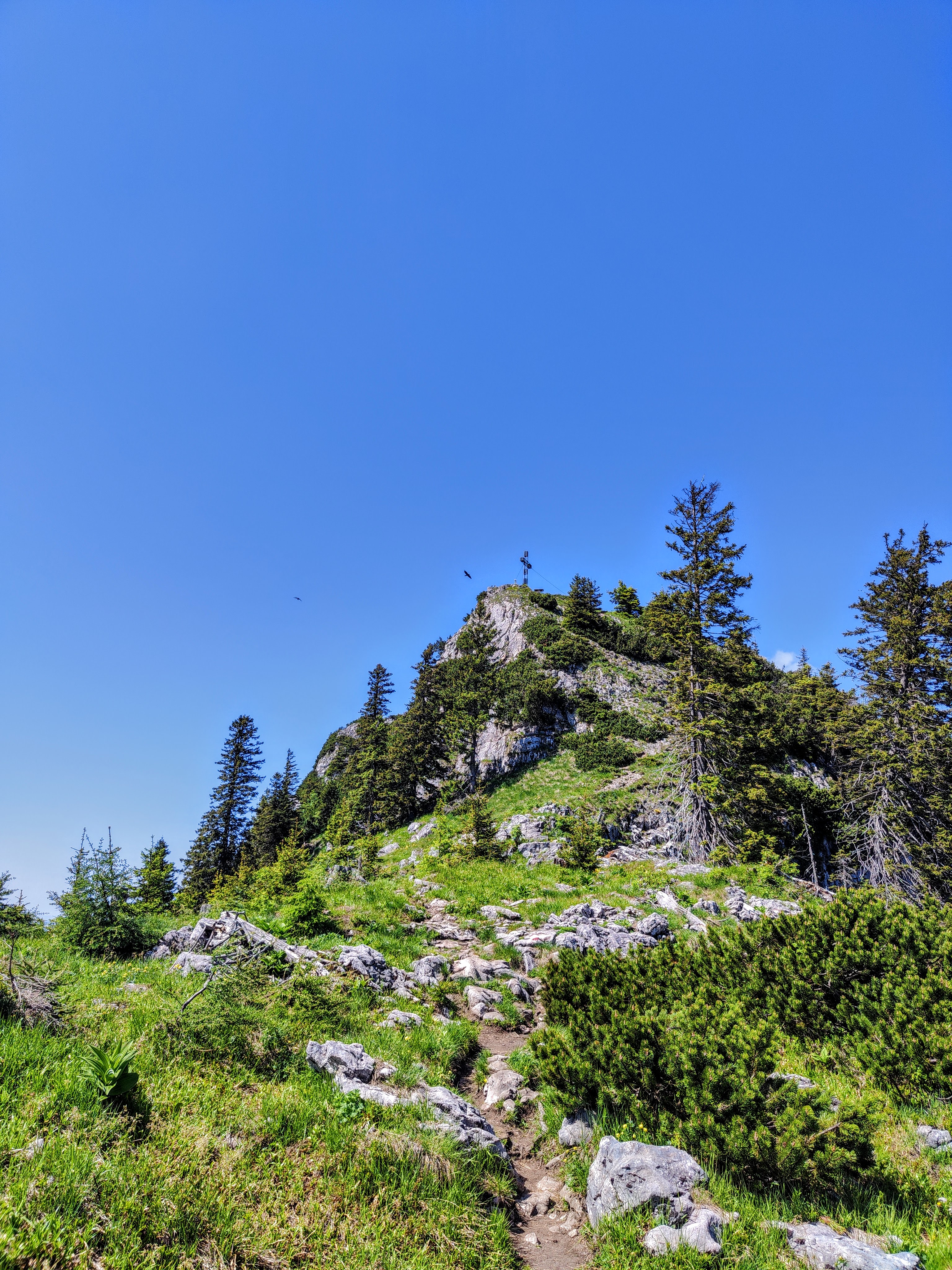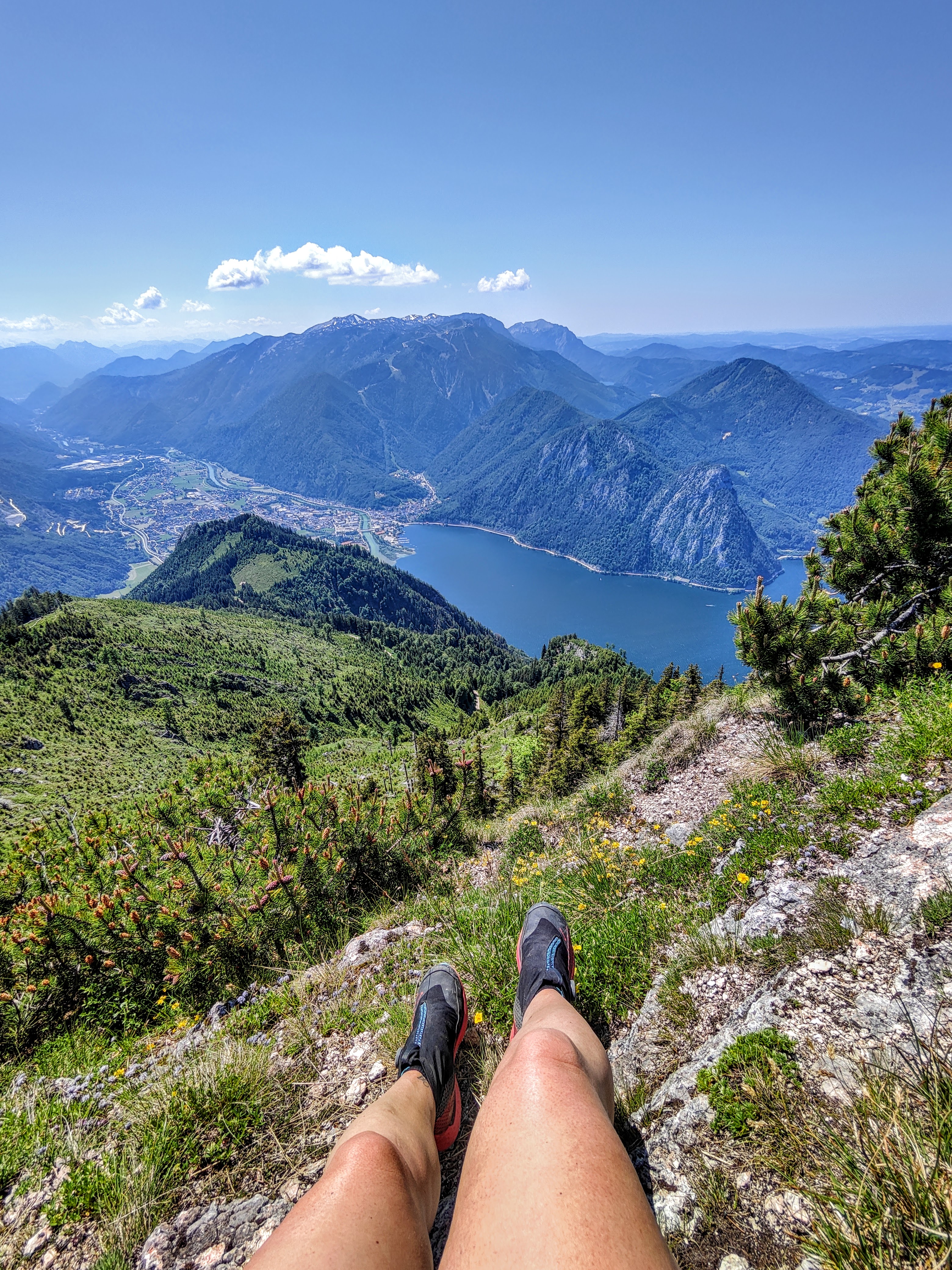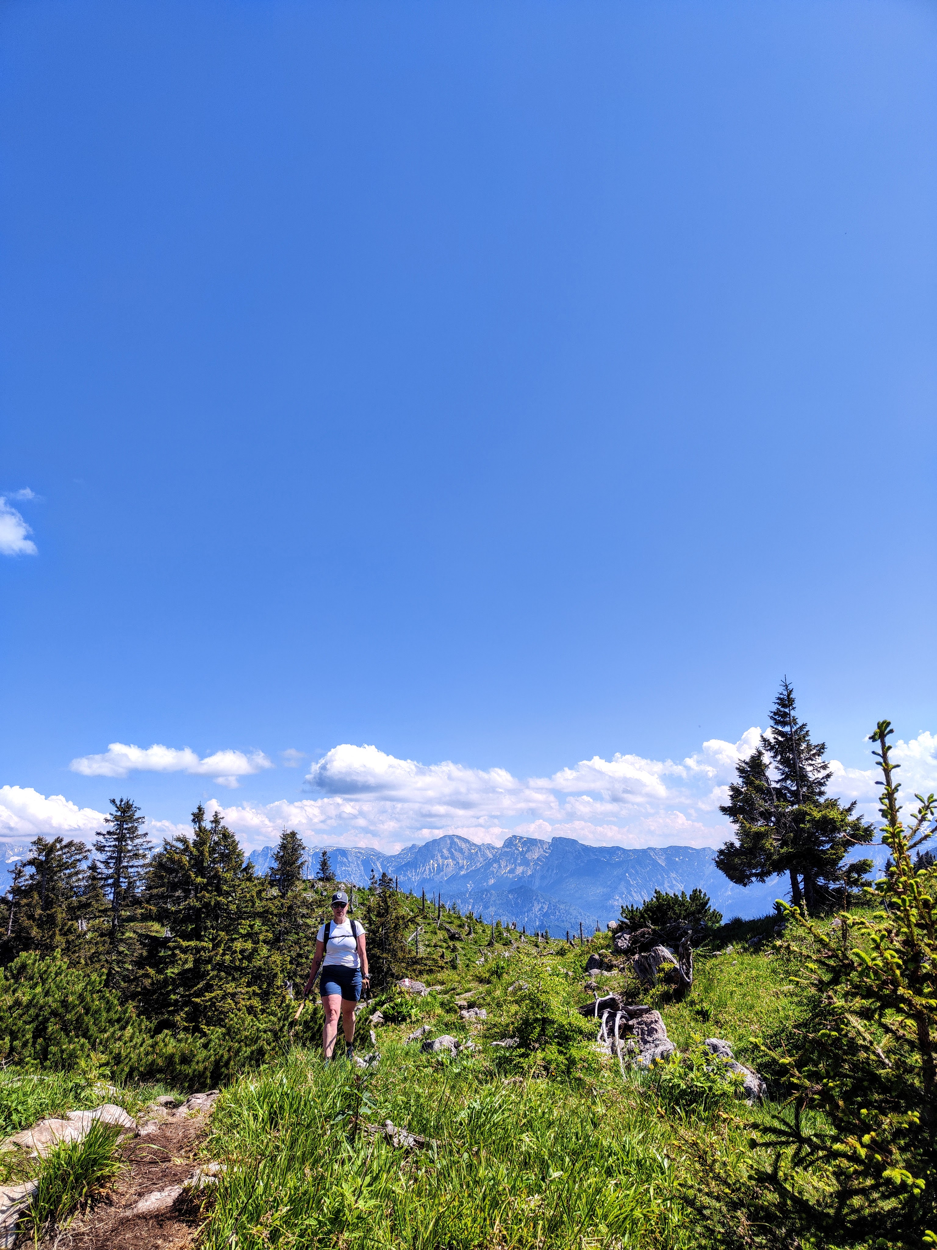Start: PP Ebensee, Rindbach (6€/Tag) – durch Rindbach über die Brücke bis zum Wandfuß – im Wald beim Sender steil bergauf (schattige 500hm auf 2,5km) – Aloisbrunnen – Spitzlsteinalm (nicht bewirtschaftet) – Sattel -Erlakogel Gipfel 1575