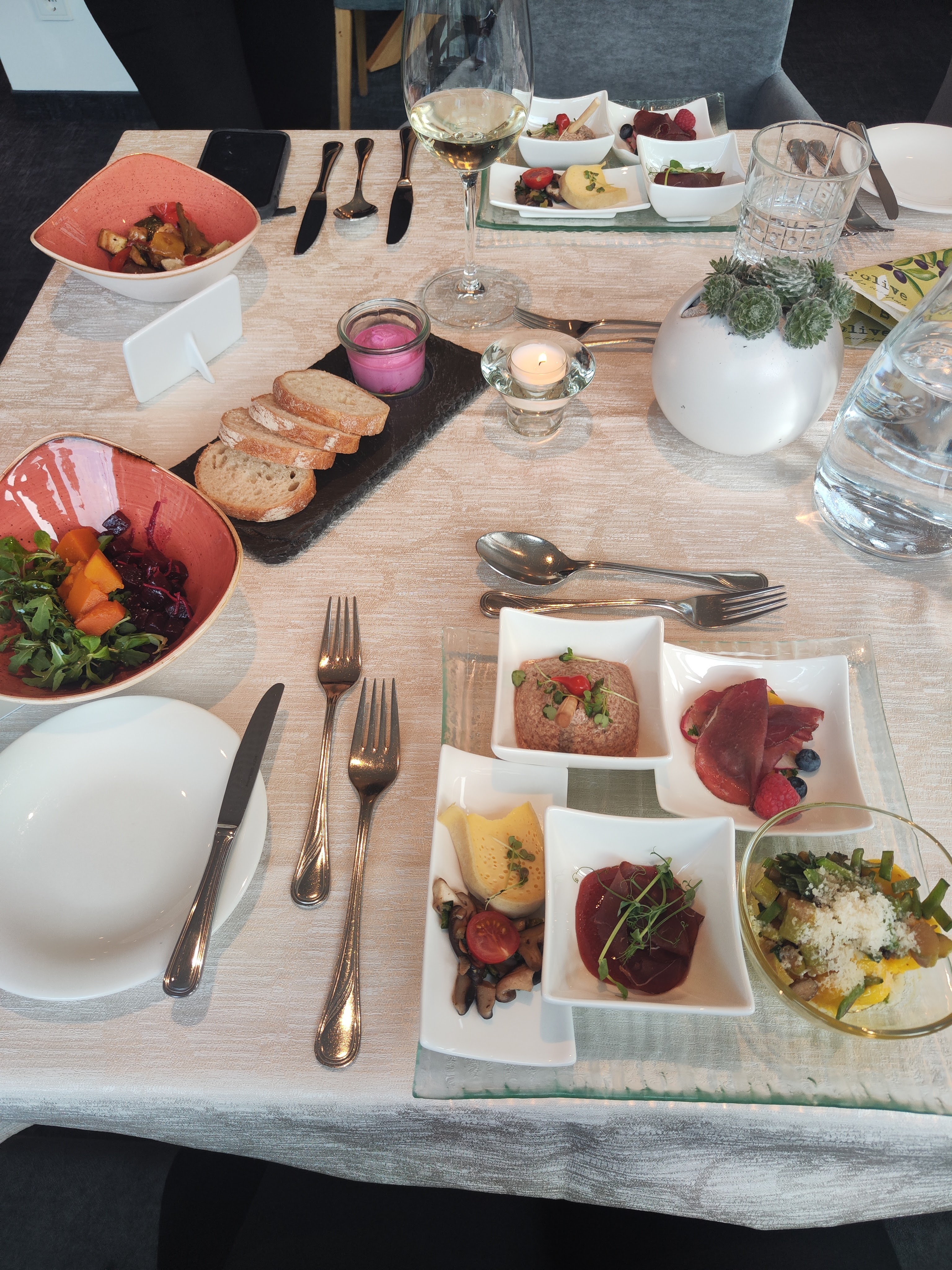 Grosse Zimmer mit Balkon, ein super freundliches Team und ein lässiger Wellnessbereich inklusive Pool, der Wander-Wadln fit macht und beanspruchte Muskeln wieder entspannt. Und dann wär da noch ein wichtiger Teil: denn wer am Berg unterwegs ist, isst auch gerne gut. Gilt für mich zumindest. Die Kulinarik im Zimba – ein Buffett mit kaum zählbaren regionalen, saisonalen und lokalen Schmankerln, die wirklich jeden Wunsch erfüllen. I mog des so gern, wenn Schilder die Herkunft ums Eck zeigen und man abends nur a halbe Portion bestellen kann (weil Vorspeisen & Salate eh schon satt machen). Welche Hundefreundlichen Kleinigkeiten mir übrigens auch besonders gut gefallen haben: beim Eingang gibts nicht nur spezielle Handtücher für den Lieblings-Vierbeiner und am Zimmern wartet ein spezielles Türschild, falls der Wauzi mal seine Ruhe geniesst. Hab mich sehr wohl gefühlt in dieser familiengeführten Unterkunft, die mit echter Leidenschaft punktet – Empfehlung meinerseits!
