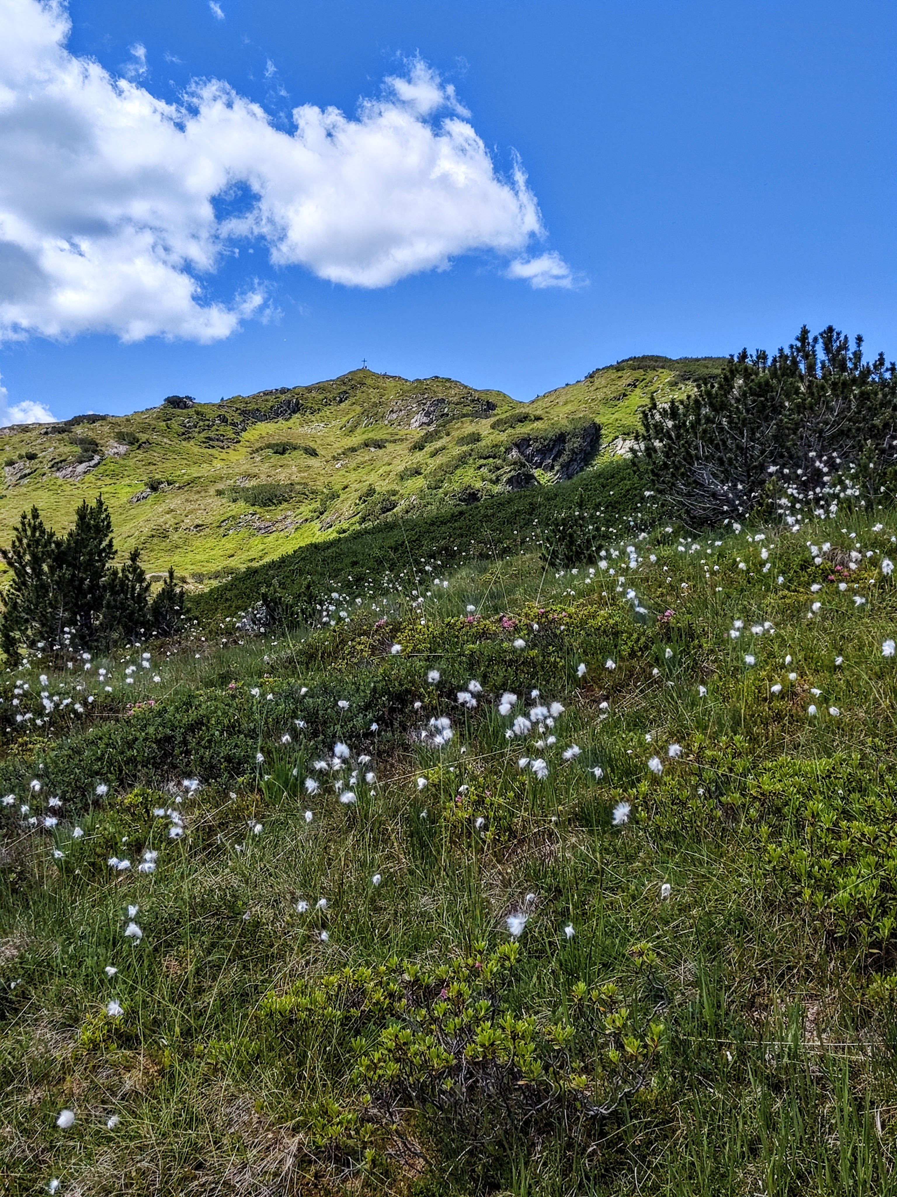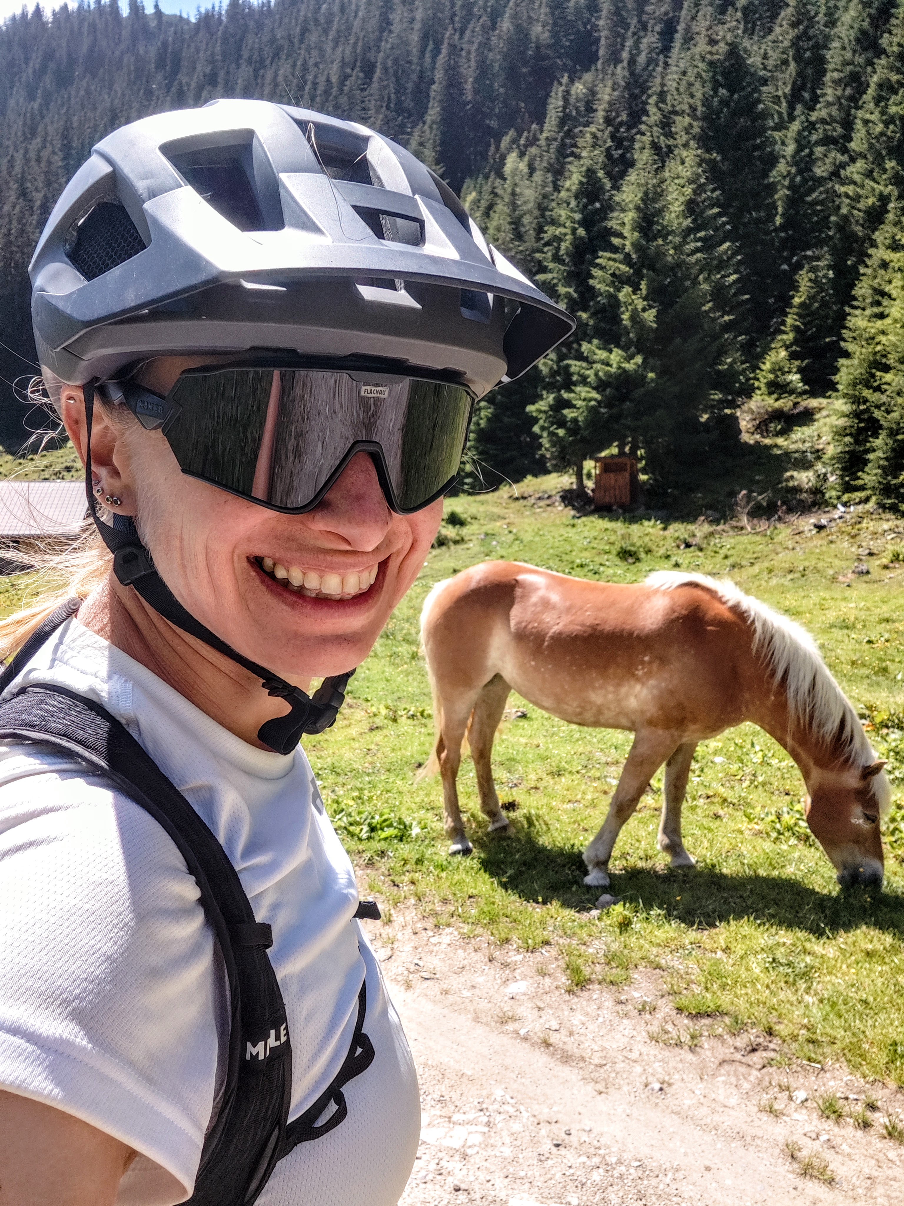 Tourdetails: von Schruns erst auf der Strasse, danach auf der Forststrasse tief ins Silbertal. Dort rauscht der Litzbach besonders laut – man fährt lange auf der linken Bachseite taleinwärts, bis man sich dann bei der letzten Brücke links hält… immer bergauf ins stille Wasserstubental. Dort warten besonders liabe Streckenposten auf der unteren Wasserstubenalpe – mit 4 PS… wollt fast umsteigen. Und ja, die Pferde sind genauso frei unterwegs wie die riesige Kuhherde auf der Alm. Nach dem abstellen der Bikes bei der Sonnkopf Bergstation (Gondel vom Klostertal hoch) gehts zu Fuß weiter. Gut 300hm sind es zum Gipfel. Quer durchs Natura 2000 Gebiet mit Deckenmooren, einem Wollgras-Paradies und das Kreuz zeigt sich auch bereits… Blicke ins Klostertal / die gewaltigen Klostertaler Alpen & den Arlberg, zurück ins Silbertal, rüber ins Rätikon (3 Türme) & aufs Hochjoch. Retour Abfahrt erst wieder bis zur unteren Wasserstubenalpe, dort zweigt kurz danach eine Schotterstrasse rechts ab und bringt uns via Wildried zum Kristberg, von wo es ins Tal geht.