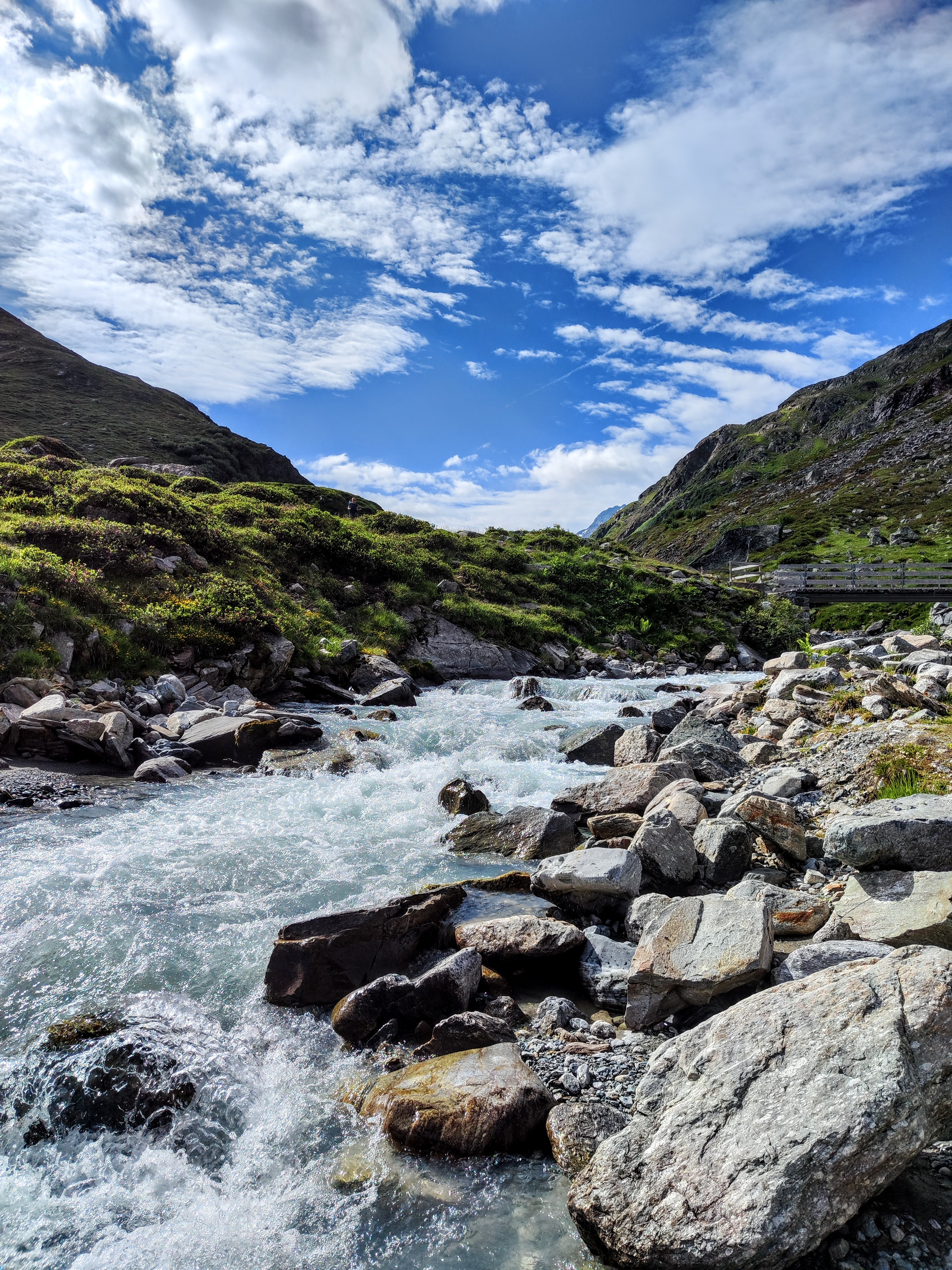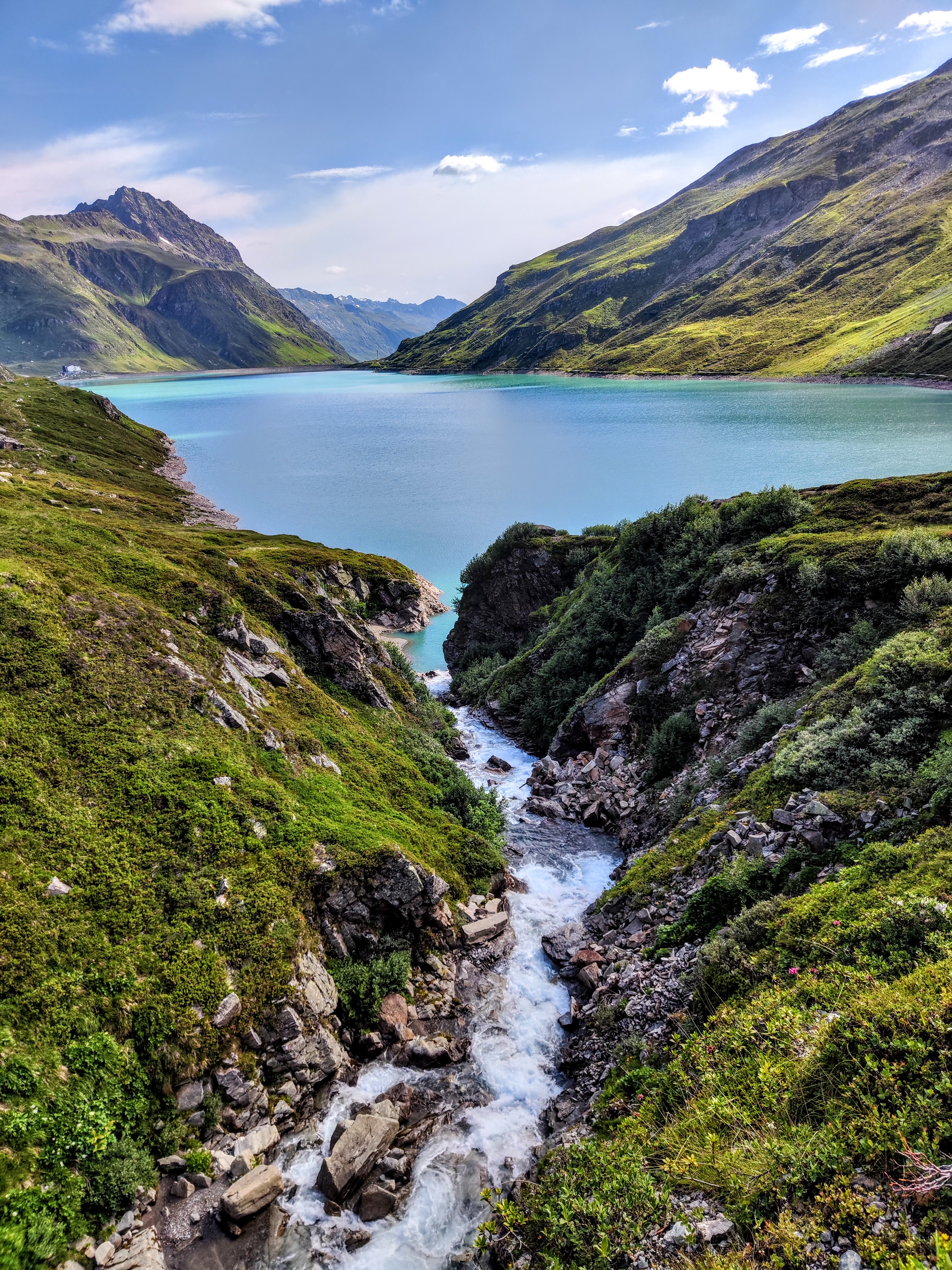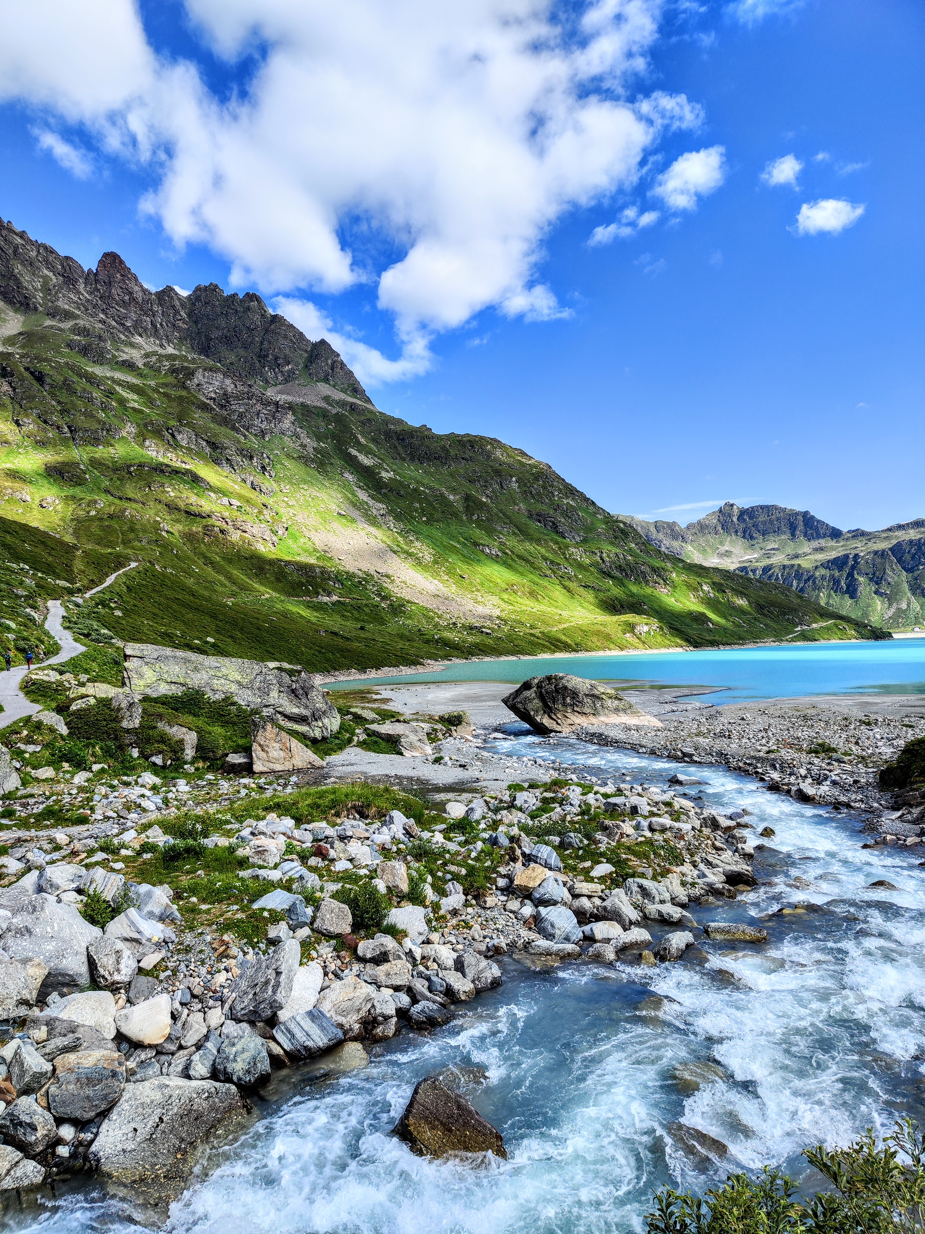 Hitzeflucht auf die Biehlerhöhe zum Stausee! Gletschermili (Milch) zur Abkühlung? Jo bittschee. Sedimentsandstrand & Wasserfalldusche inklusive. Auf 2030m wars angenehm kühl und morgens kann man die Runde um den türkisen Silvrettasee noch fast alleine geniessen… Schwimmen im Speicher ist aber verboten – im Gletscherbachal abkühlen nicht. Angeln darf man an bestimmten Stellen. Mal schmal, mal breit – der 6,4km Rundweg hat kaum Höhenmeter (ca. 80hm bei einer Runde gegen den Uhrzeigersinn). Besonders schön ist’s, wo das Gletscherwasser aus dem Ochsental in den Silvrettasee rinnt (erfrischende 10 Grad geschätzt) und auf der Brücke über den tosenden Klostertalerbach. Gletschermilch ist übrigens erkennbar an der trüb weiss/grauen Farbe. Die Trübung entsteht durch den Transport fein zerriebenen Gesteins im Wasser.