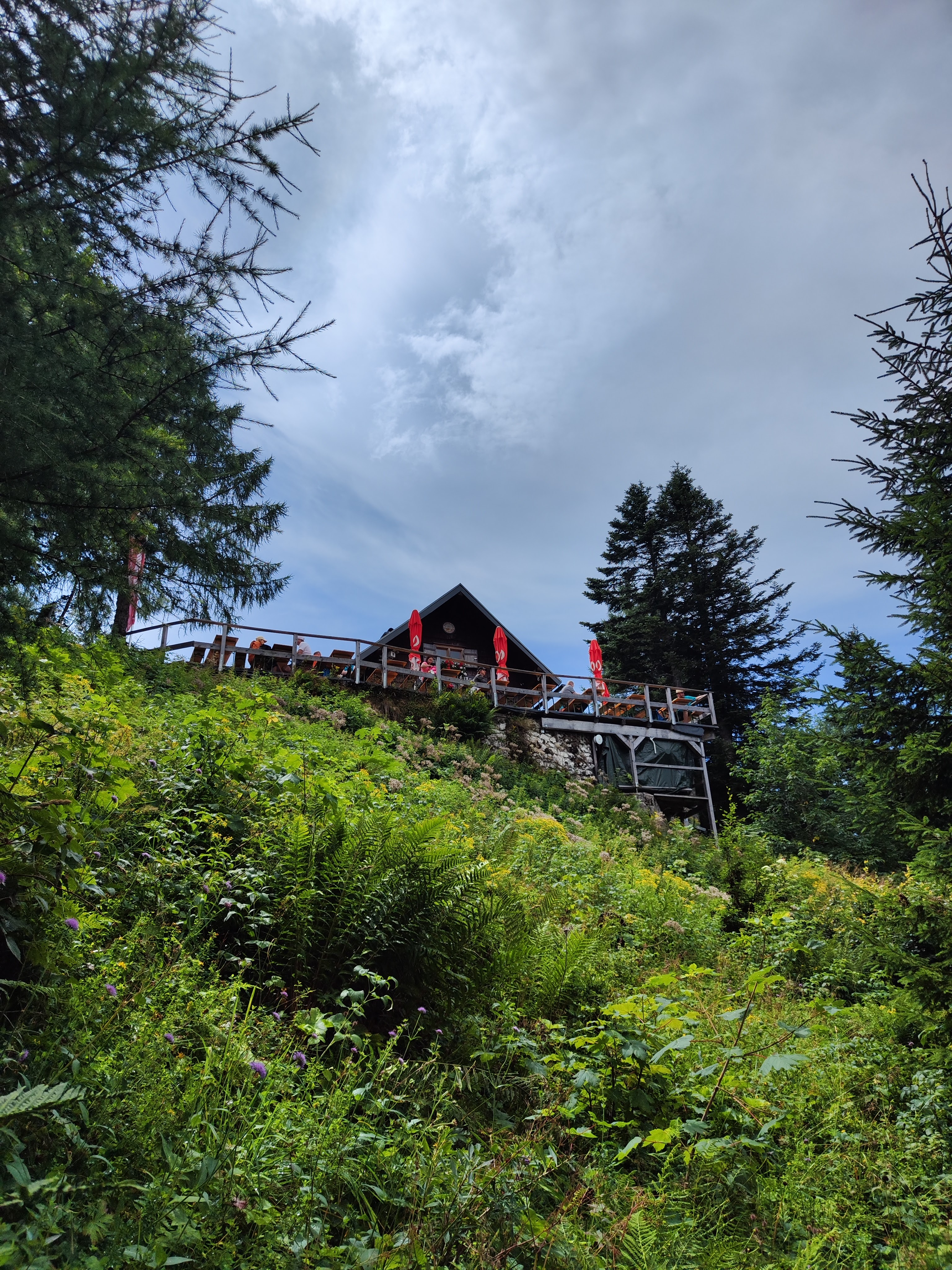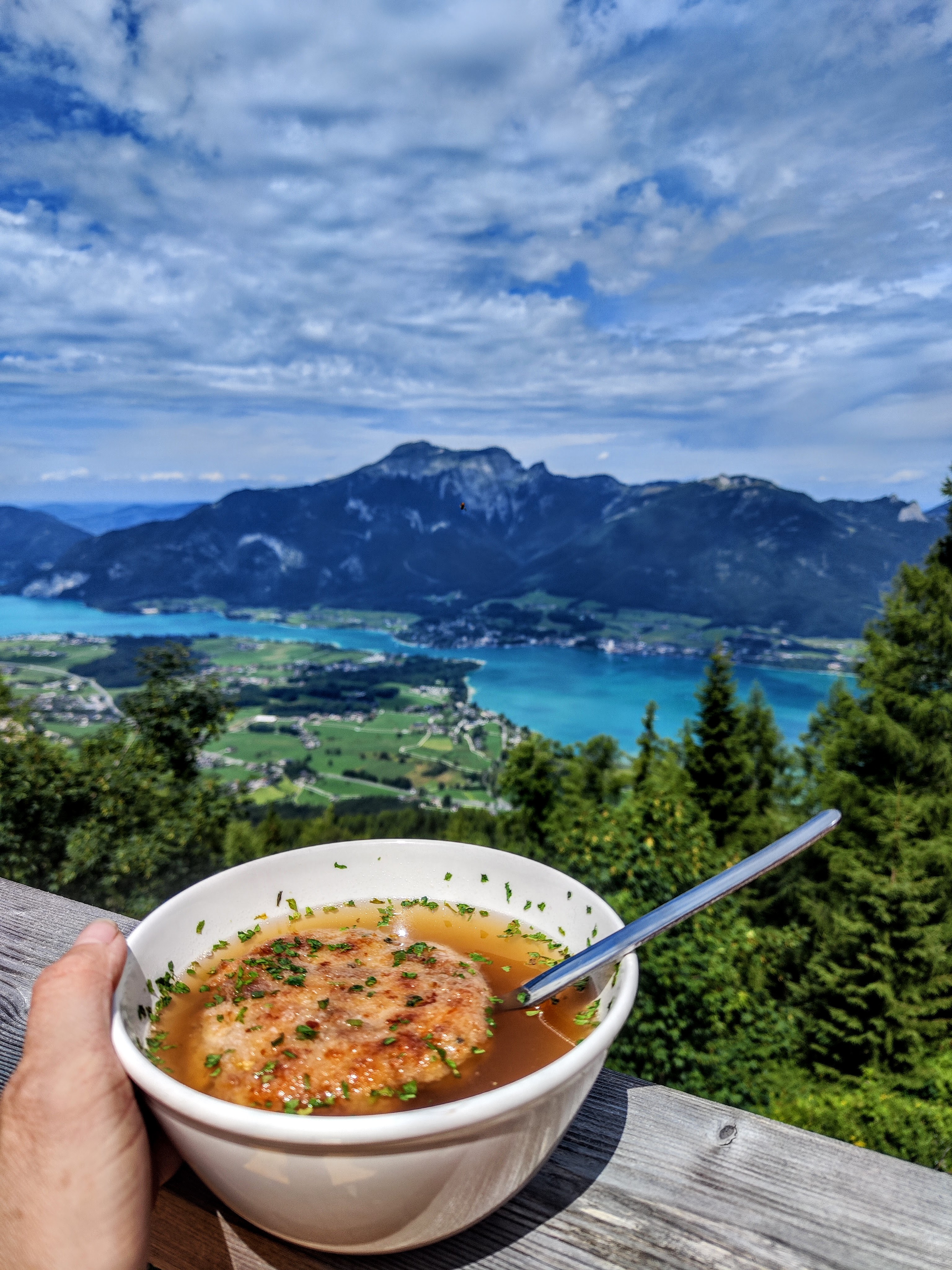 Direkt einkehren oder erst auf den Gipfel? Weil nur 4 Tische auf der Terrasse besetzt sind, nutze ich die Chance und erledige gleich, auf was ich mich schon beim weggehen gefreut habe: a KPKS – Kaspresssuppn bzw Kaspressknödlsuppn mit Aussicht! Anscheinend sind die Massen heute schon am vormittag auf der Bleckwandhütte eingefallen, den Geschirrtürmen nach – ein letzter Bauernkrapfn wird vor mir gekauft. Ein KPK samt Suppe ist noch da – Halleluja! Glück gehabt. Seelig mit meiner Suppn sitzn und zum See owi schaun – brauchts mehr? (*Bleckwandhütte bis Ende 2025 wg Umbau geschlossen!)