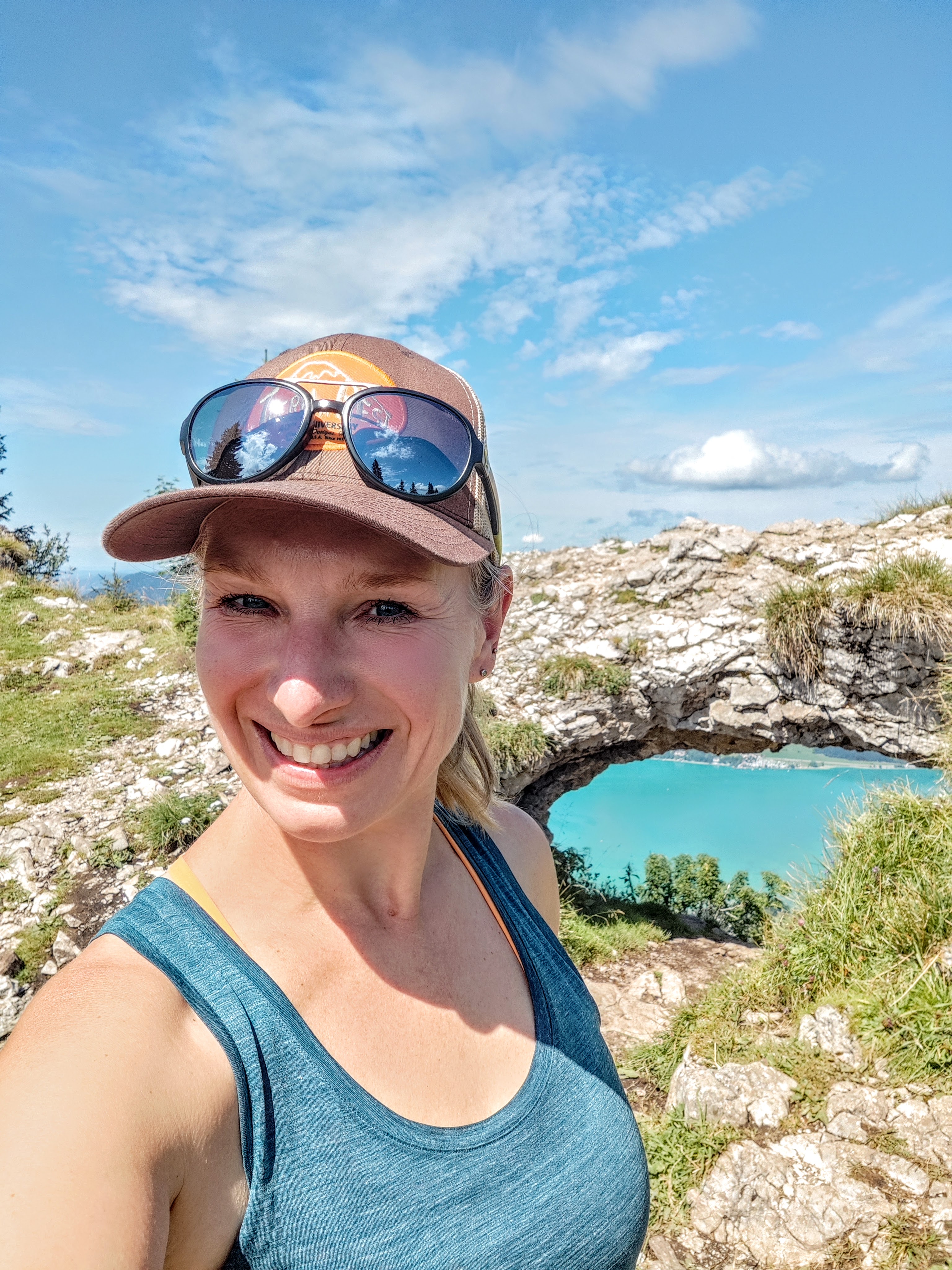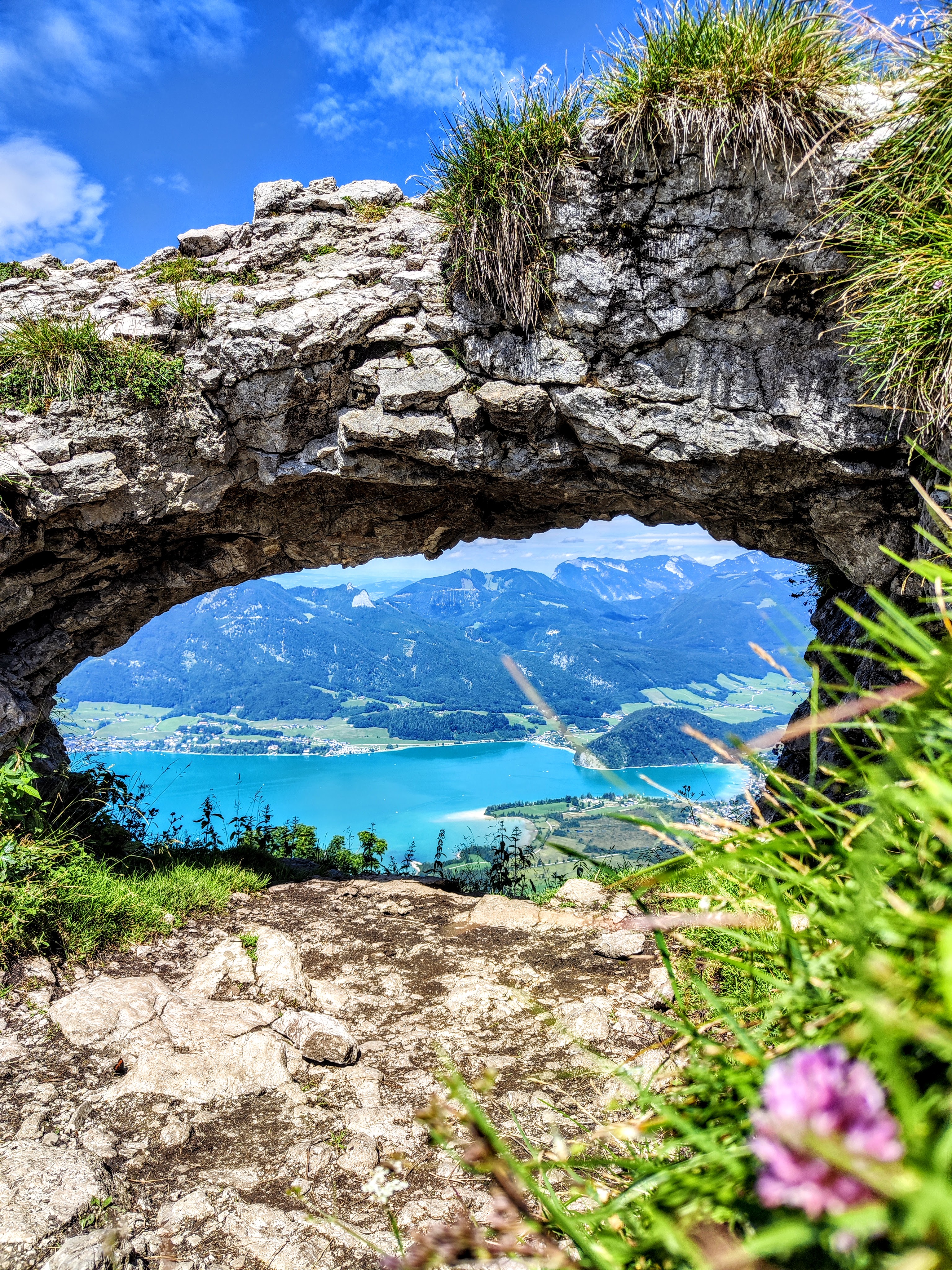 Von der Bleckwandhütte sind’s nur noch gute 200hm zum Bleckwand-Gipfel – auch hier geht es tlws steil und über kleinere Felsstufen im Wald nach oben, bis ein grasiges Plateau das Ziel signalisiert. Mittig das bekannte und beliebte Felsentor namens „Ofenloch“, stehen kann man drinnen nicht, weil’s so nieder ist. Tipp: nur im knien sieht man mehr als den See. Ein paar Schritte weiter rechts das Gipfelkreuz der Bleckwand auf 1514m. Der höchste Punkt liegt mit 1541m aber weiter vorne am Grat.