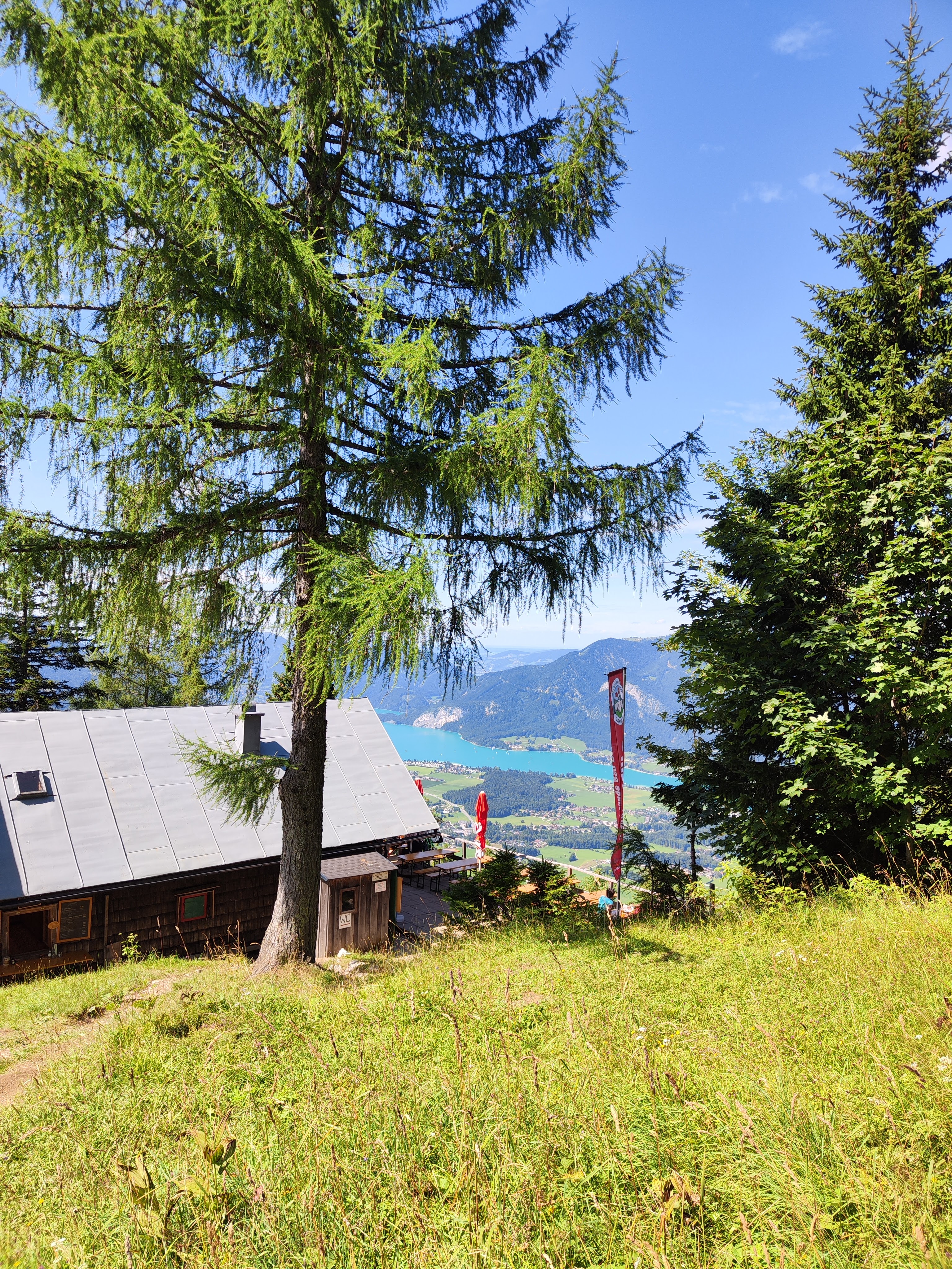 Ja, erst ist es a bissi fad. Vom PP an der Bundesstrasse gehts immer der Strasse nach bis zum Maut-Schranken. Aber dann – der Wanderweg führt in den Wald und über ein tlws steiles Steigl schön schattig bergauf. Nach den Regenfällen a Gatschpartie, rutschiges Wurzelwerk inklusive. Bei einer privaten Almhütte eröffnet sich kurz der Blick auf den Wolfgangsee und den ggü-liegenden Schafberg. Scho schee! Von dort ist’s dann a nimmer so weit bis zur Bleckwandhütte auf 1340m…