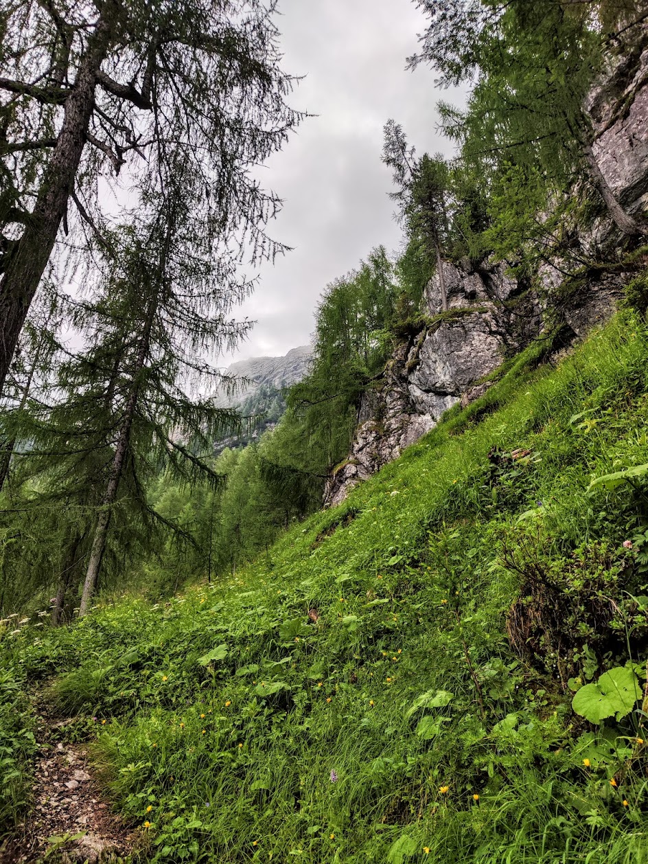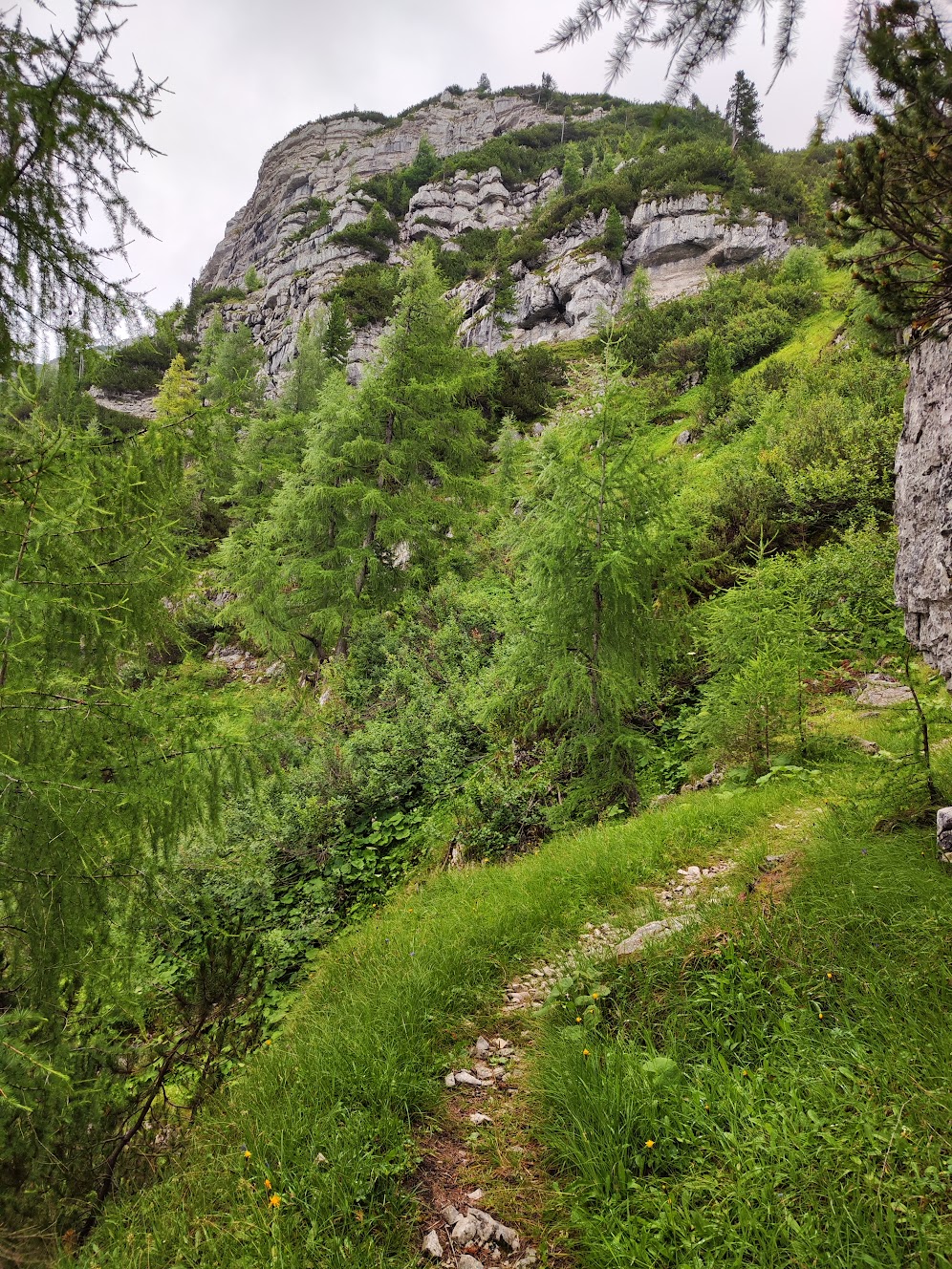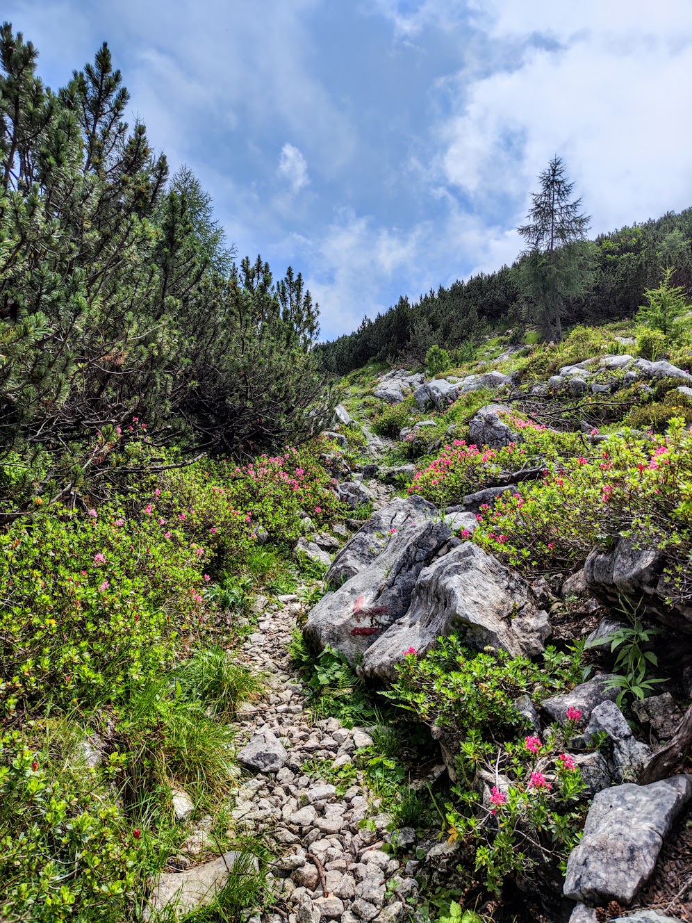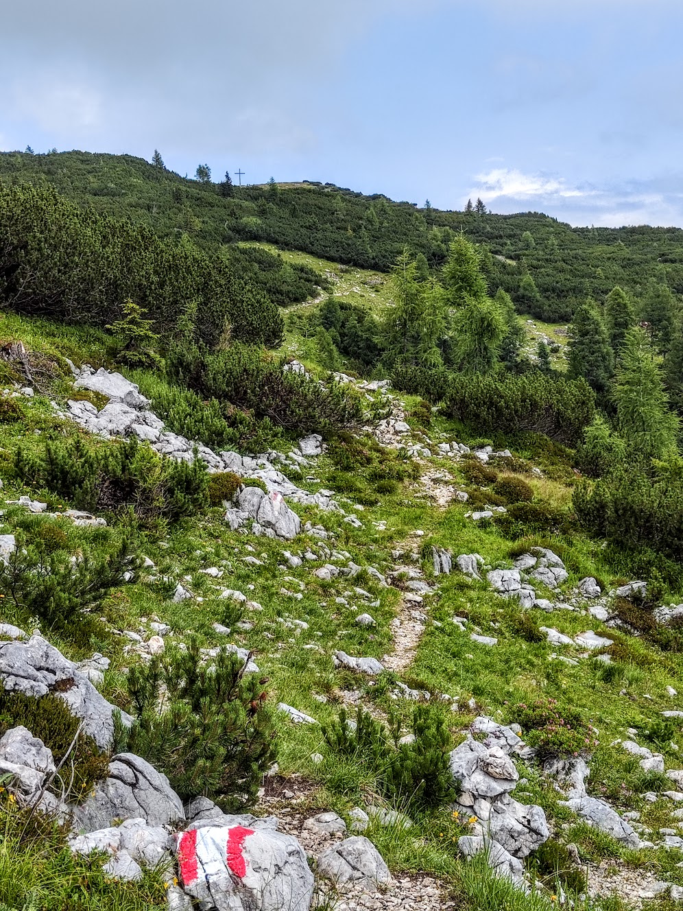 WICHTIG: hier hab i mi selber verhauen, weil mi des Bankerl anzogn hat. Der Abstieg befindet sich aber bei der letzten Steinmarkierung direkt scharf rechts bergab auf ein schmales, steiles & ausgesetztes Steigl in die Latschen (führt in den Graben)… die alte Steigspur nach dem Bankerl führt relativ schnell in sehr ausgesetztes Schrofengelände. Wer da nit rechtzeitig umdreht, sitzt evtl fest…