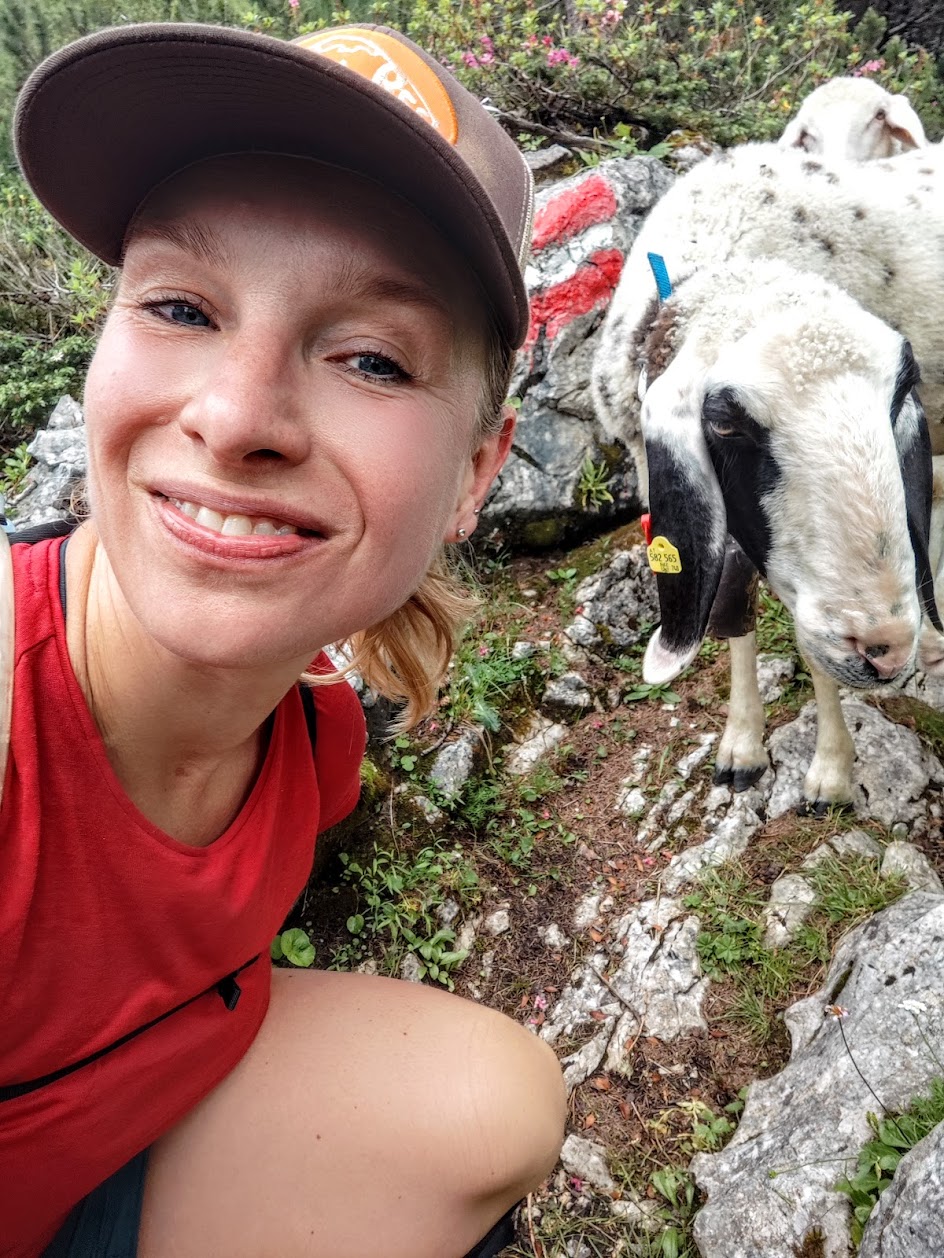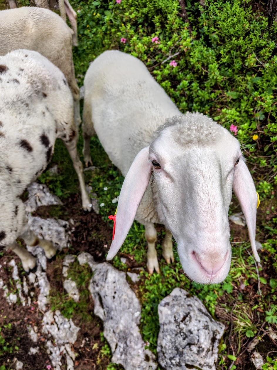 Es werde Licht am Plateau! Der Almrausch blüht noch, das Grün satt. Typischer Dachstein Kalk, Karst-Dolinen und Latschenfelder. Nach 3 Stunden wird a Runde gschmust mit den ersten, die ich an dem Tag treffe… Bissl a Gleck is immer im Rucksack dabei (=Salz). Zum Gipfel ist es nicht mehr weit – der Blick vom Kreuz geht dann aber umso weiter.
