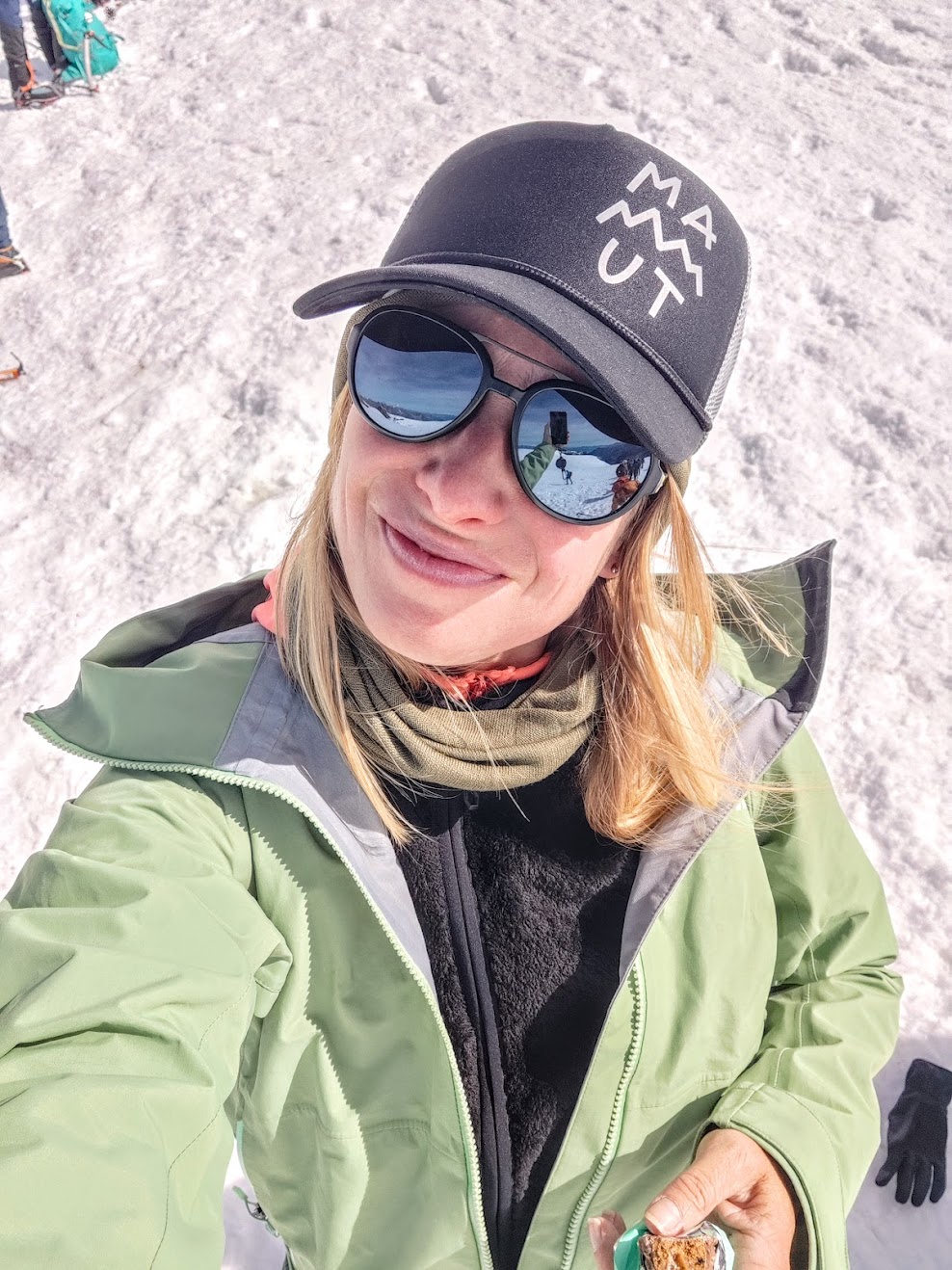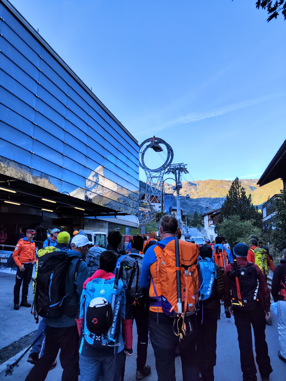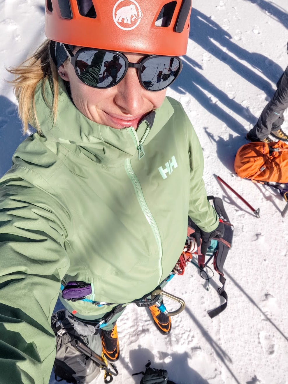 Akklimatisieren mal anders – an Tag 1 ging es direkt hoch auf 3889m, zum kl. Matterhorn. Bequem per Gondel in gut 45min (erste um 8.30 Uhr) – mir anscheinend etwas zu schnell. Der Kopf dröhnt – da hilft nur viel trinken. Kleine Gruppe, viel Input – 1 Bergführer von Zermatters plus Assistenz-Begleitung auf 2 3er Seilschaften. Perfekt zum üben aller nötigen Knoten, Techniken wie des Schweizer Flaschenzugs und der Selbstrettung. Neben uns steigen viele Seilschaften zum Breithorn auf – ein begehrtes Ziel durch die einfache Erreichbarkeit. Morgen wartet es auf mich. Mit jeder Stunde am Gletscher oben wird das Kopfweh a bissl besser… zum Glück. Da spring ich dann gerne zur Übung in eine Spalte! Lieber, als einen Sturz zu halten – das ist wirklich Schwerstarbeit. Ein großes Plus: über kalte Füsse jammern trotz stundenlangem stehen muss ich nicht – dank Polartec Windbloc im neuen Scarpa Ribelle Tech 3HD Schuh. 6h Test mit Bravour bestanden. PS: wie schnell es gehen kann, merke ich nach 2m im freien Gelände – direkt neben der Piste. Am Weg zu unserer Übungsspalte als Vierte am Seil und zwei Minuten nach dem anseilen, verbreche ich hüfttief mit einem Bein… nix passiert. Die Sinne aber geschärft!