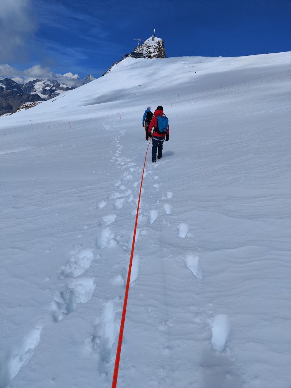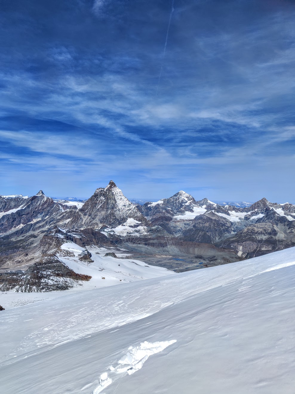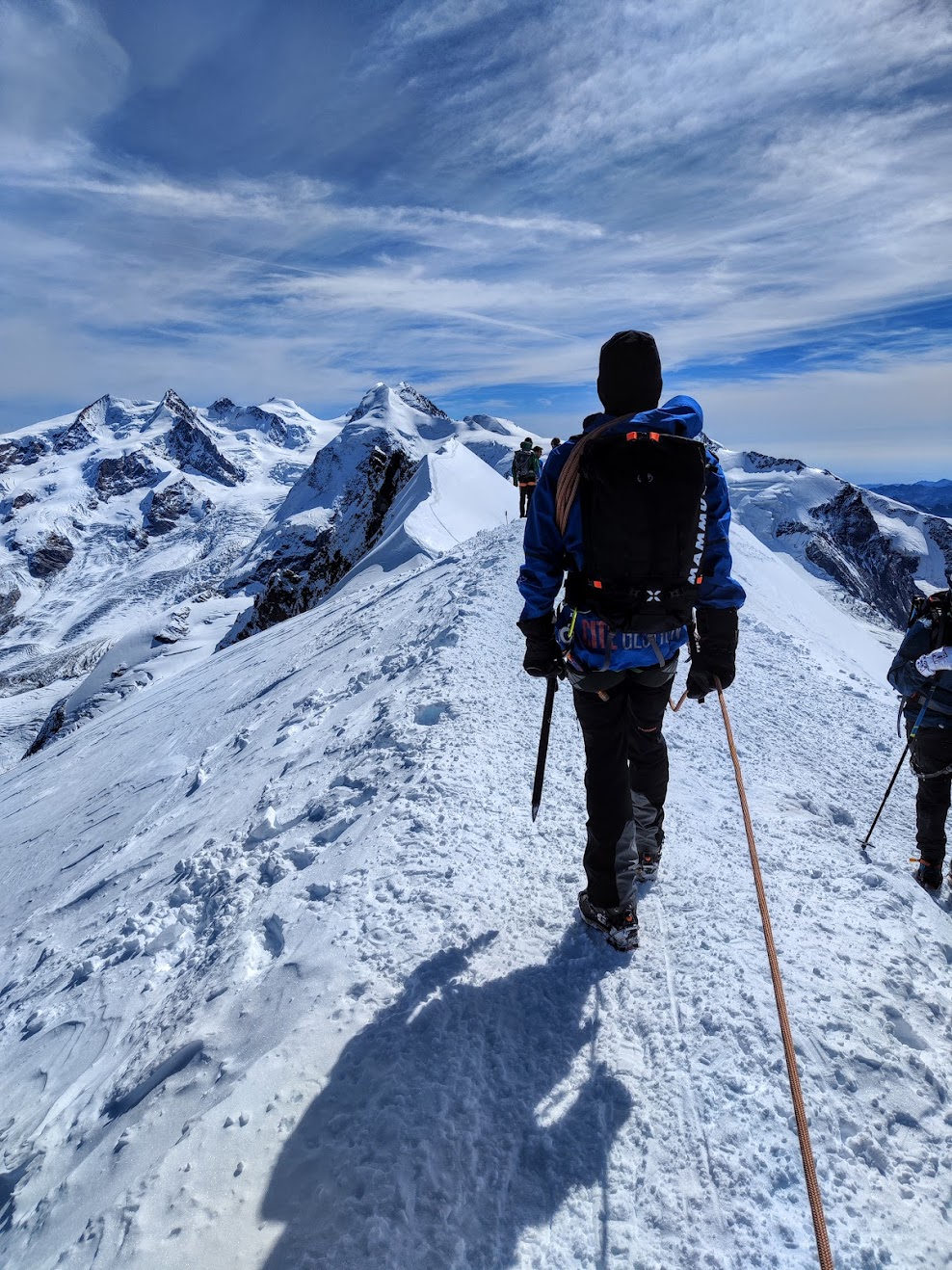 Zu fünft, erneut mit einem Bergführer von Zermatters, gehts wieder mit der Gondel nach oben und weiter bergab zum Anseilplatz. André ist seit über 50 Jahren im Gebiet unterwegs und beantworte jede Frage mit Engelsgeduld. Erst wird das weite Breithorn-Plateau überquert – die Spalten nur leicht zugedeckt und direkt neben der ausgetretenen Spur. Tiefe Löcher, eine nicht wirklich vertrauenswürdige, kleine Schneebrücke. Dann der erste Anstieg, mit jedem Schritt bergauf merke ich die Höhe. Viel langsamer als sonst ist das Tempo, der Schnee noch griffig. Auf gut der Hälfte und bevor es richtig steil wird: Steigeisen anlegen, Seilabstand verkürzen – trinken & kurz einen Bissen vom Riegel. Weiter geht’s. Kurz vorm Gipfel Aussicht geniessen, durchschnaufen. Und dann auffi auf den Grat zur höchsten Stelle. Steil abfallend auf der einen, das weite Plateau vom Zustieg auf der anderen Seite. Die letzten Schritte – Fotobeweis und statt Gipfelpause wieder retour. Der erste 4000er, ein kurzes Vergnügen. Die Erweiterung der Traverse zum Mittelgipfel war keine Option, da unsere Seilschaft leider Erfahrungstechnisch nicht gleichauf war. Dann eben beim nächsten Mal, gibt ja einige fesche Gipfel & Tourenoptionen dort. Trotzdem ein feines Erlebnis, wenn auch für meinen Geschmack bzw Gefühl mit knapp 300 zu wenig ehrliche Höhenmeter dabei waren… Unten anbei auch der Insta-Post inkl Video vom Grat, Prädikat sehenswert!