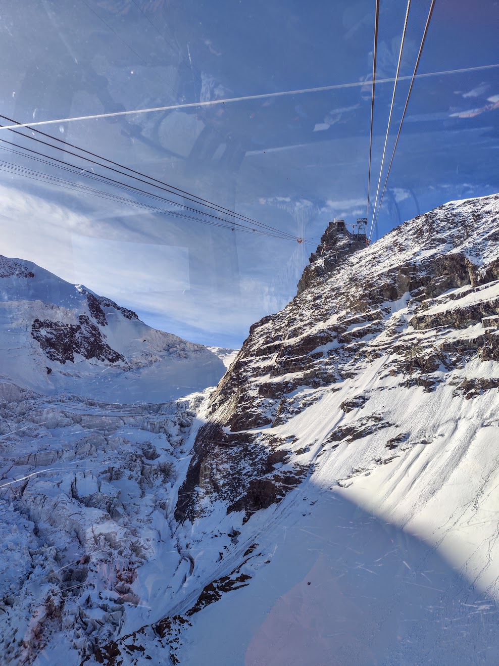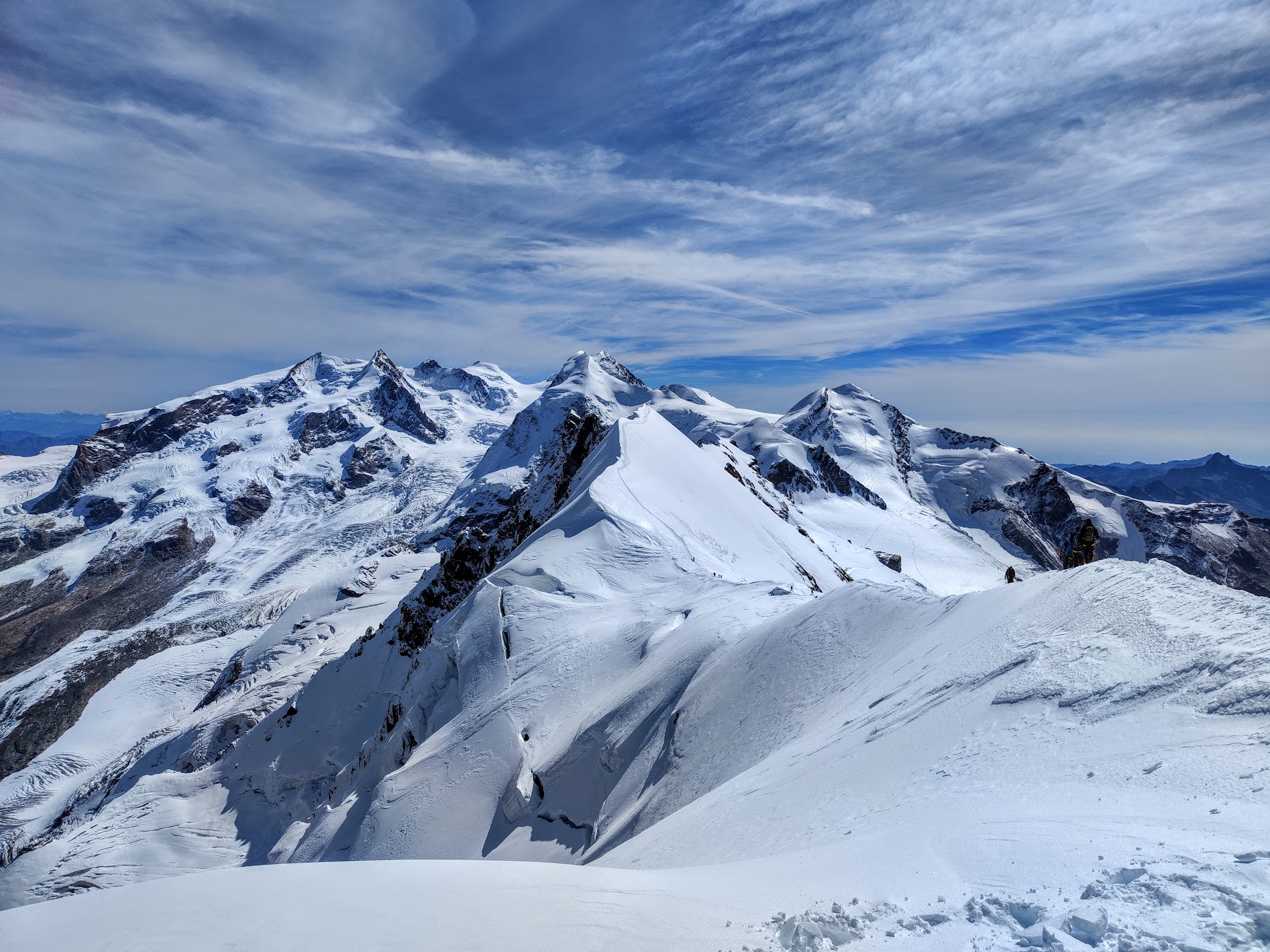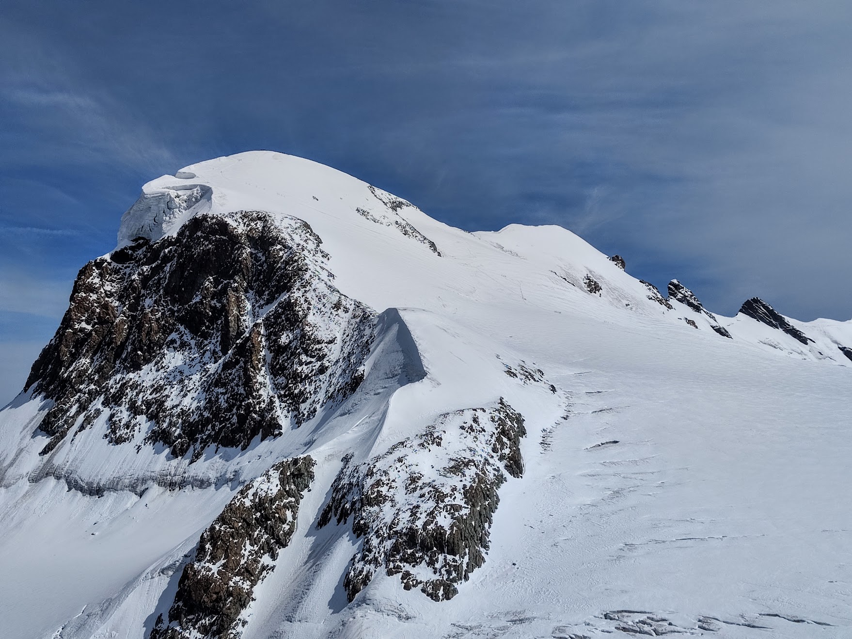 Zu fünft, erneut mit einem Bergführer von Zermatters, gehts wieder mit der Gondel nach oben und weiter bergab zum Anseilplatz. André ist seit über 50 Jahren im Gebiet unterwegs und beantworte jede Frage mit Engelsgeduld. Erst wird das weite Breithorn-Plateau überquert – die Spalten nur leicht zugedeckt und direkt neben der ausgetretenen Spur. Tiefe Löcher, eine nicht wirklich vertrauenswürdige, kleine Schneebrücke. Dann der erste Anstieg, mit jedem Schritt bergauf merke ich die Höhe. Viel langsamer als sonst ist das Tempo, der Schnee noch griffig. Auf gut der Hälfte und bevor es richtig steil wird: Steigeisen anlegen, Seilabstand verkürzen – trinken & kurz einen Bissen vom Riegel. Weiter geht’s. Kurz vorm Gipfel Aussicht geniessen, durchschnaufen. Und dann auffi auf den Grat zur höchsten Stelle. Steil abfallend auf der einen, das weite Plateau vom Zustieg auf der anderen Seite. Die letzten Schritte – Fotobeweis und statt Gipfelpause wieder retour. Der erste 4000er, ein kurzes Vergnügen. Die Erweiterung der Traverse zum Mittelgipfel war keine Option, da unsere Seilschaft leider Erfahrungstechnisch nicht gleichauf war. Dann eben beim nächsten Mal, gibt ja einige fesche Gipfel & Tourenoptionen dort. Trotzdem ein feines Erlebnis, wenn auch für meinen Geschmack bzw Gefühl mit knapp 300 zu wenig ehrliche Höhenmeter dabei waren… Unten anbei auch der Insta-Post inkl Video vom Grat, Prädikat sehenswert!