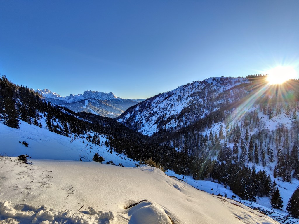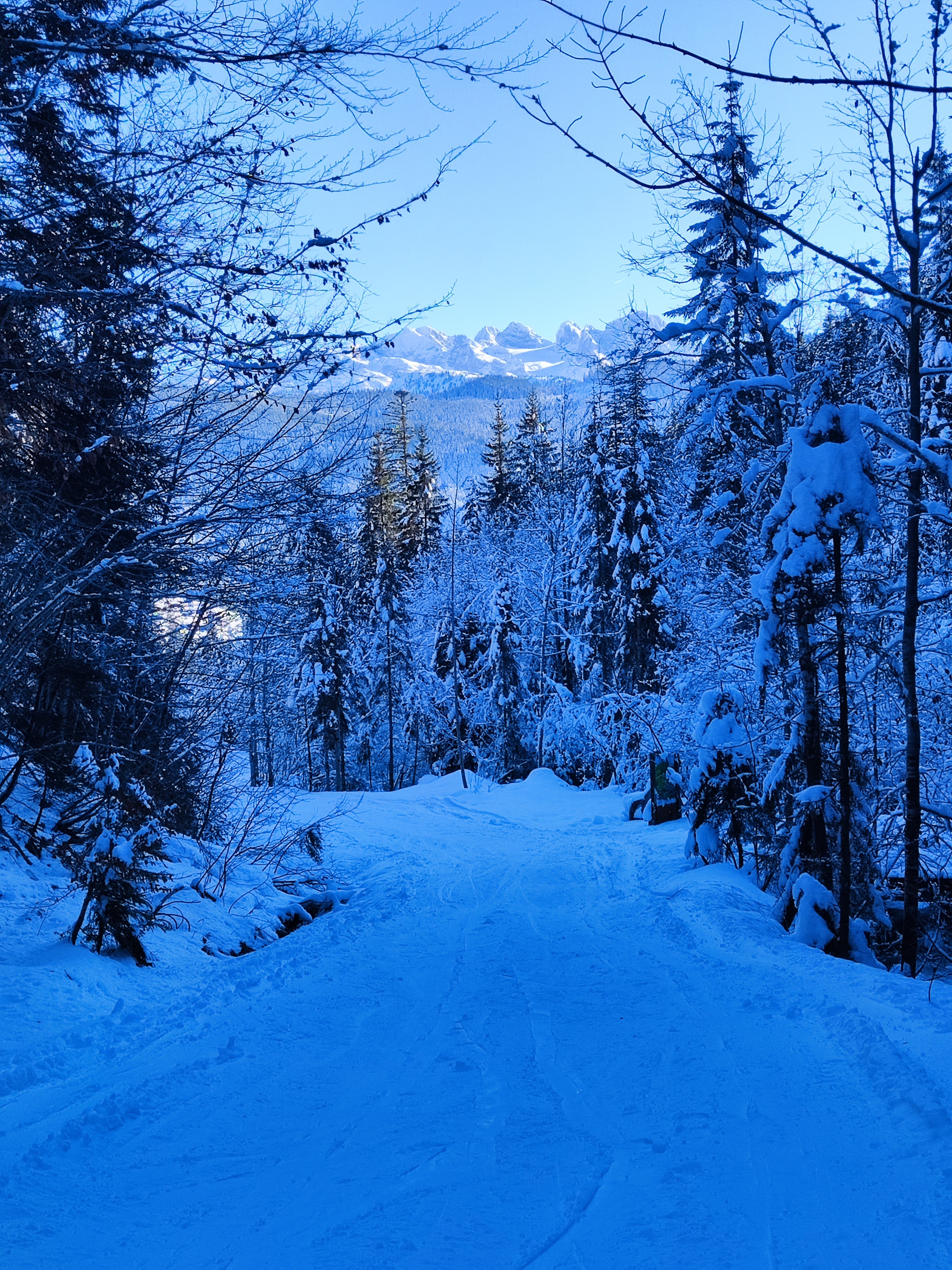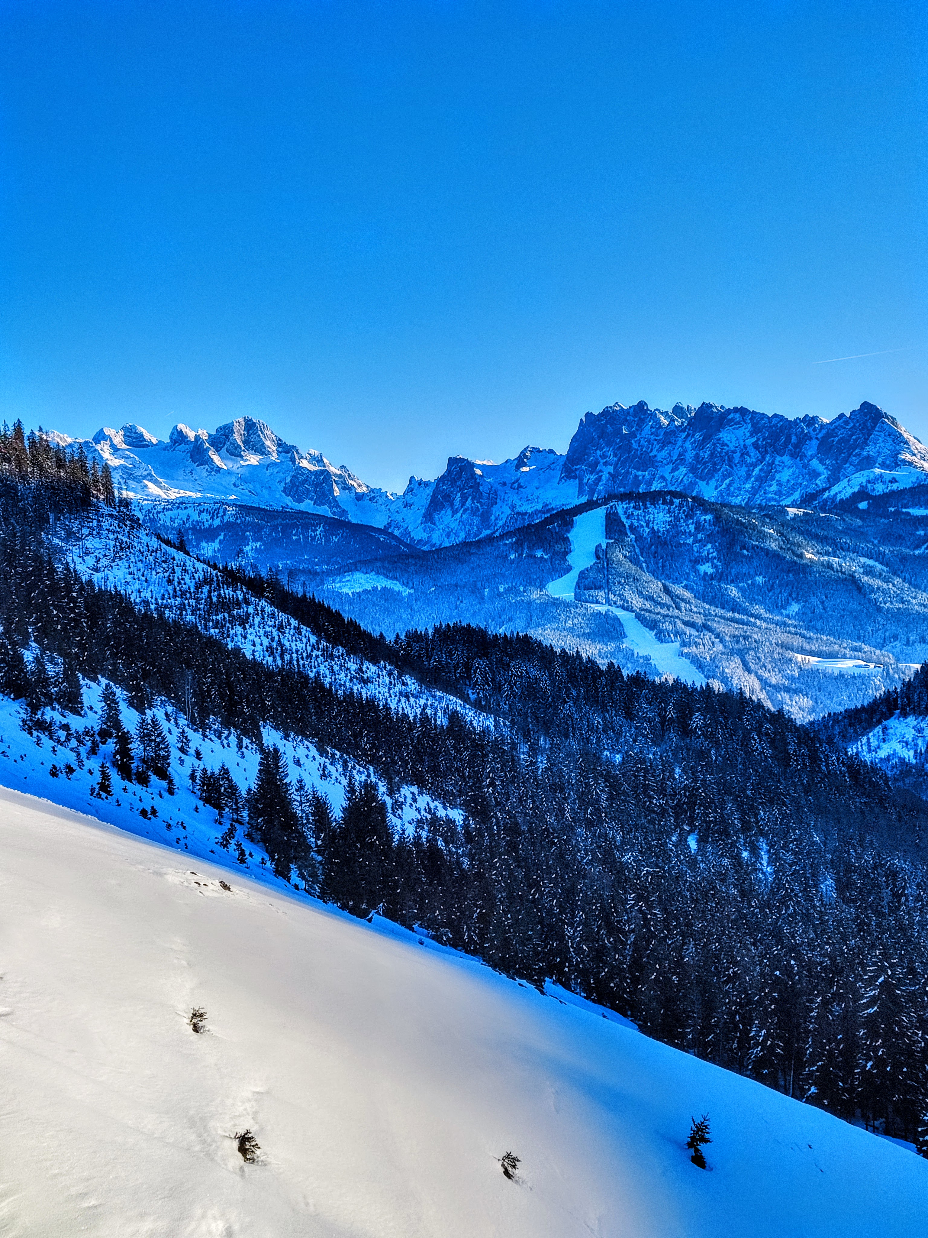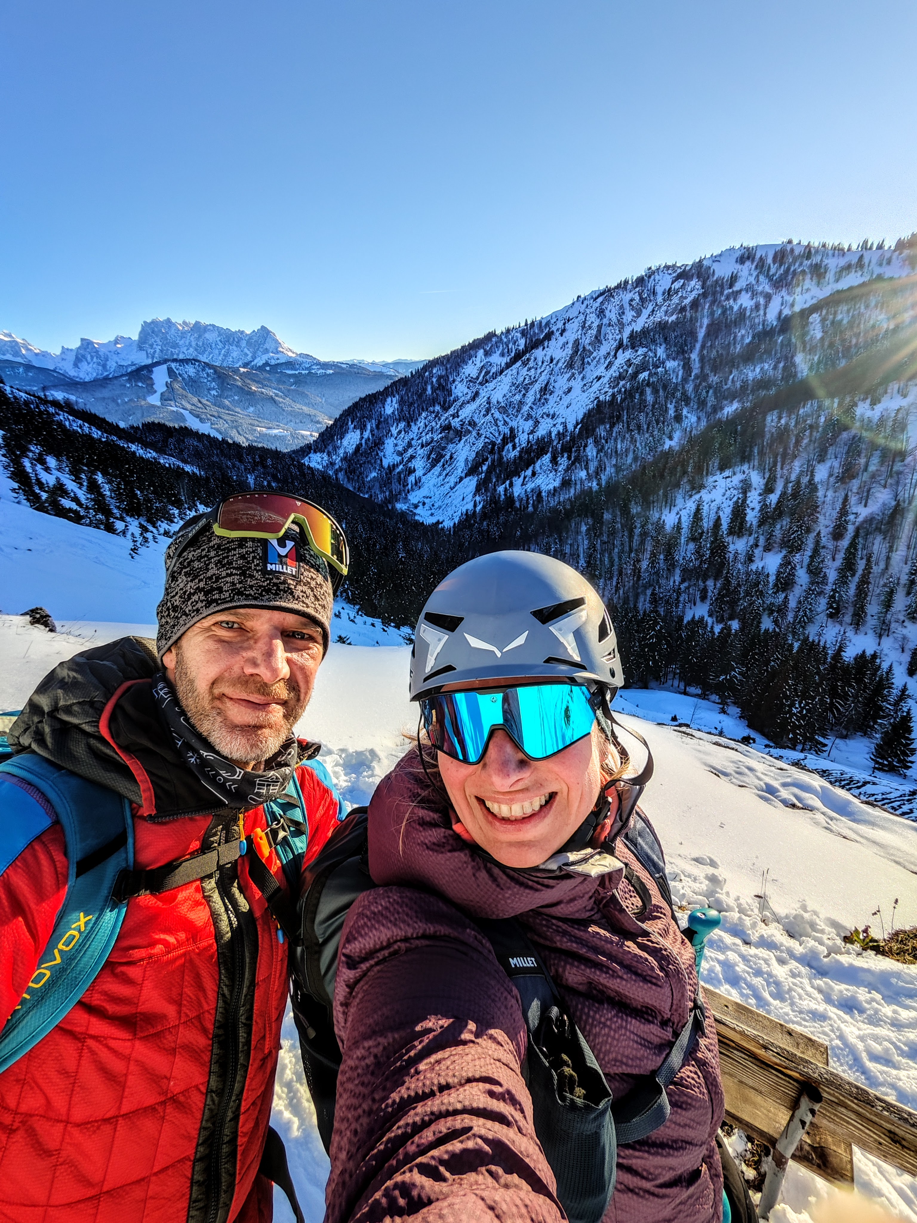 Retour gehts gemütlich über den Forstweg – auch weil vor der Rinnbergalm ein ganz besonderes Panoramaplatzal wartet: so hab ich den Gosaukamm mit Dachstein auch noch nicht gesehen! Die Talabfahrt nach Russbach im Skigebiet Dachstein West ist auch markant zu erkennen. Nur ein paar wenige Stellen sind heikel für die Ski, den Steinen ausweichen funktioniert noch gut und Neuschnee liegt ja jetzt auch wieder drauf… Bin sicher nicht zum letzten Mal hier unterwegs gewesen – gibt noch einige Skitour-Optionen!