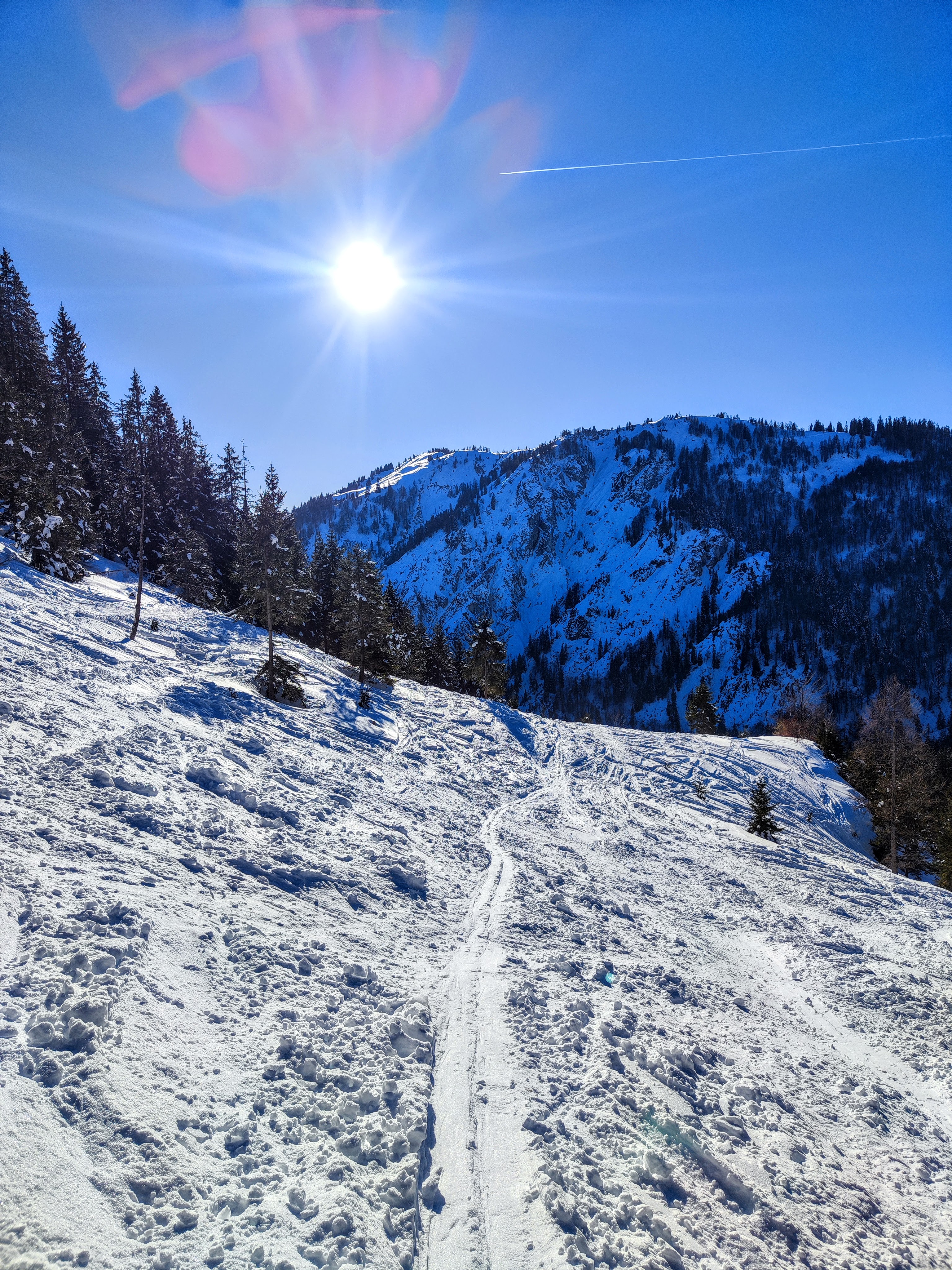 Direkt am PP wird aufgefellt und dann gehts bequem stetig auf dem Forstweg in weiten Schleifen bergauf. Wer dabei bleibt, kommt erst zur Rinnbergalm (war nicht bewirtschaftet an dem Wochenende) und von dort dann weiter bis zur Angerkaralm. Meine Variante zweigt zwischendurch nach rechts ab und führt über den MItterweg (Sommerweg) erst noch ein Stück weiter gemächlich nach oben. Nachdem man an einer Wildfütterung vorbei kommt wird es steiler. Der Forstweg endet in einer zt steilen Mulde, die nahe der Traunwand nach oben führt. Ein paar Spitzkehren erleichtern die steilen Stellen, man gewinnt dafür schnell an Höhenmetern. Die Angerkarhütte (am WE bewirtschaftet) schiebt sich ins Sichtfeld, man trifft wieder auf den Forstweg ri Rinnbachalm. Die letzten Meter bis zur Sonnenterrasse können direkt und steil im Gelände oder in einer Schleife über den Forstweg erledigt werden. Kaffeetschi, Skiwossa und Bananenschnitte verdient!