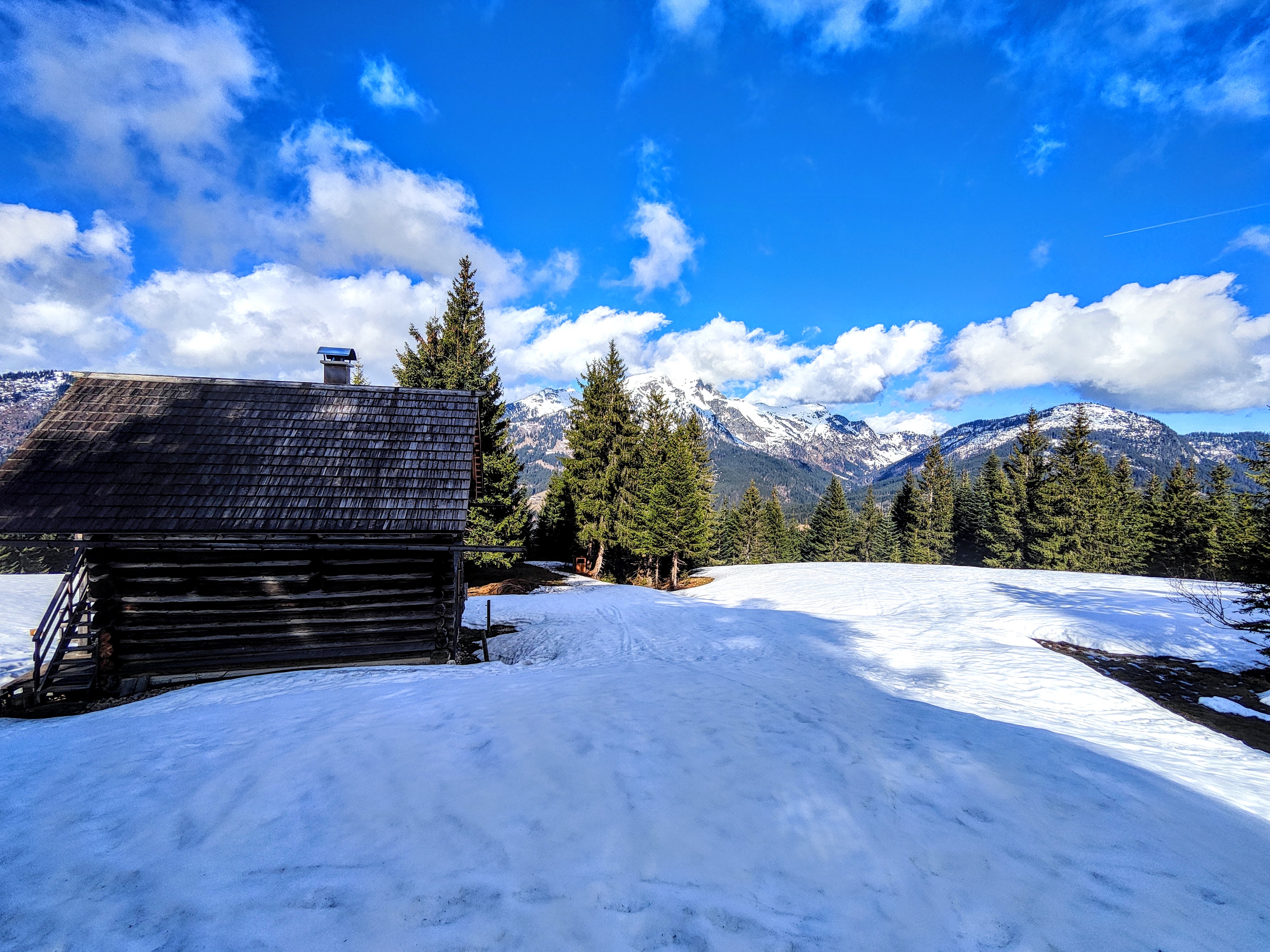 Wenn im Tal der Schnee temperaturbedingt schmilzt und im Gelände mehr getragen als gegangen wird, dann ist die richtige Zeit, mal wieder in Rußbach vorbeizuschauen. Besonders, weil ich mir die Genuss-Tour (Umgehung des steilsten Abschnitts im freien Gelände) noch immer nicht angeschaut habe – wurde somit am 18. Februar geändert. Schneekonditionen sind wie im späten Frühjahr… morgens auf einigen Steilstücken im Schatten brettlhart & tlws gscheid eisig – ansonsten wirklich noch Top. Der ursprügliche Start beim Drehkeuz über die Wiese ist aper, haben deswegen den äußersten Pistenrand links benutzt. Das Weggehen erst gegen Mittags erspart mir heute die Harscheisen, auf der Genussvariante im freien Gelände wird es ab 1300m im Wald leider auch schon tlws fast aper… Lohnt sich aber trotzdem, auch wenn das „Genuss“-Stück durch den Wald – vorbei an privaten Almhütten – nicht besonders lange ist. Ruhig ist es und die meisten wählen heute die knackig steile, direkte „Sport“-Variante. Man trifft dann oberhalb der Petrocelli Hütte dann auf die Kornbrand & Almweg Aufstiegsrouten, die von Gosau heraufkommen (aktuell leider nicht mehr gangbar weil großteils aper). Der Rest der Aufstiegsstrecke zum Hornspitz ist gleich… man erreicht unterhalb der Bergstation des Hornspitz Sessellifts die Piste, quert und steigt dahinter zum Gipfel auf. Panorama satt. Durchatmen. Und danach die Qual der Wahl – Abfahrt oder Einkehrschwung…