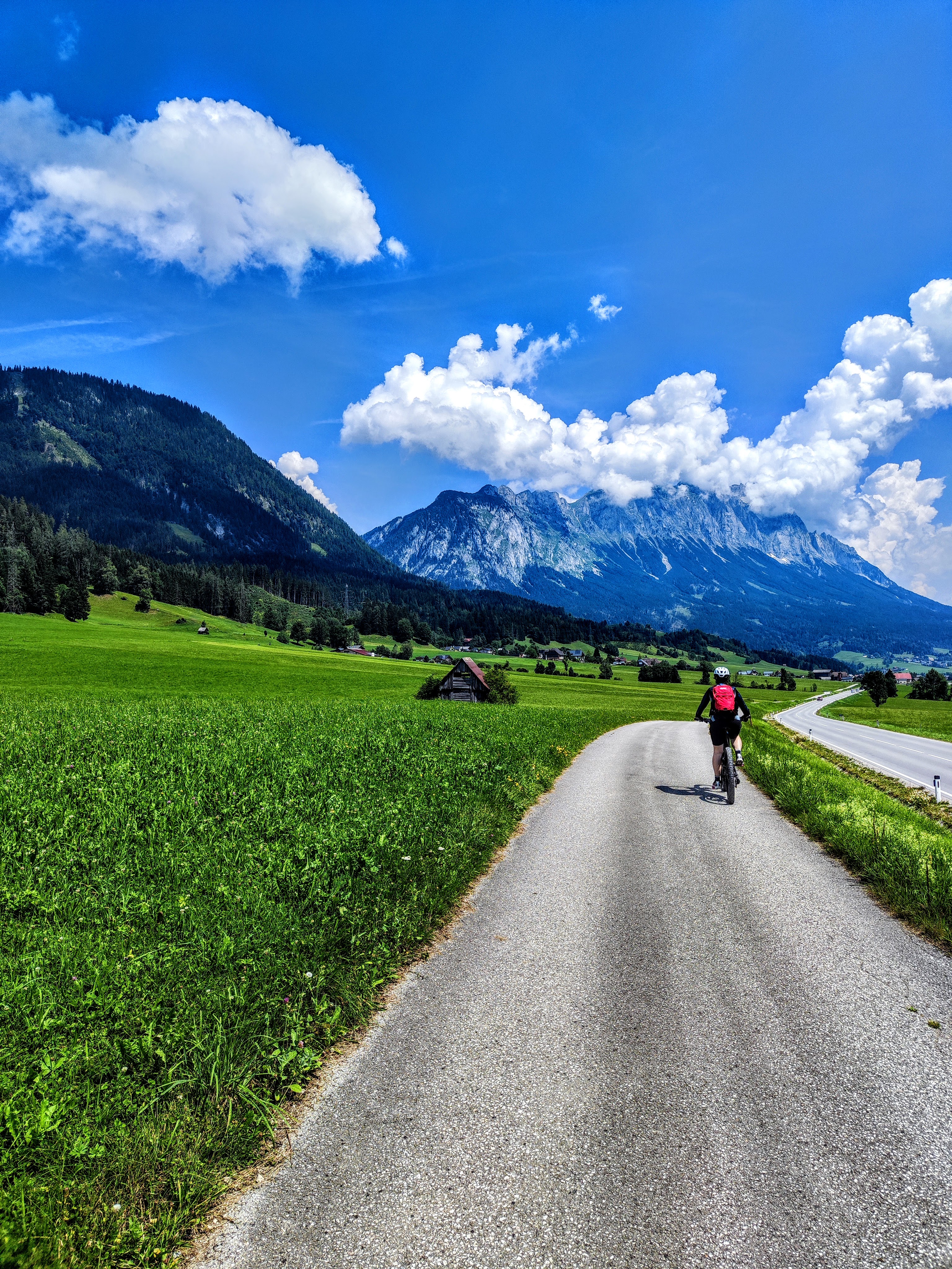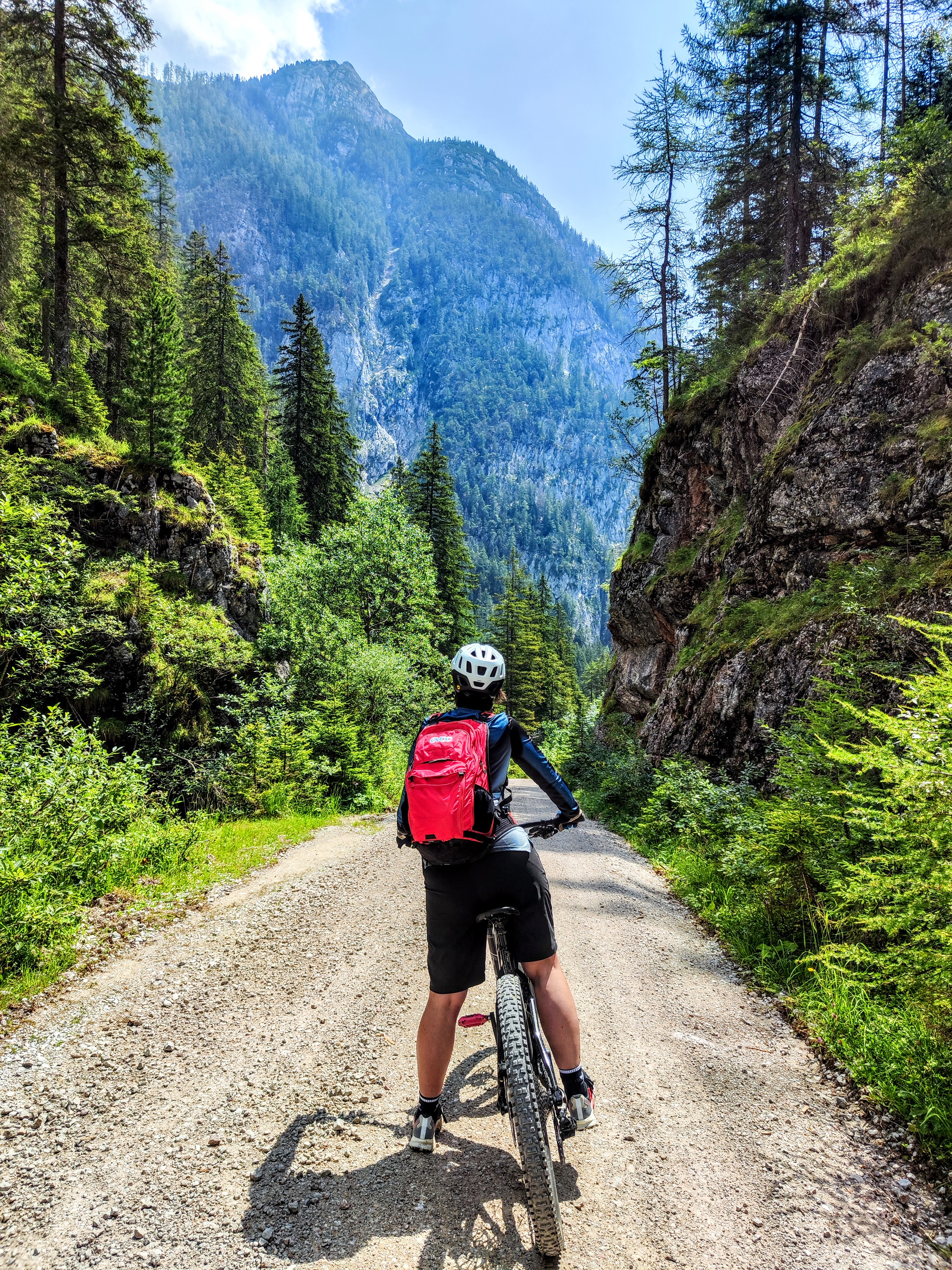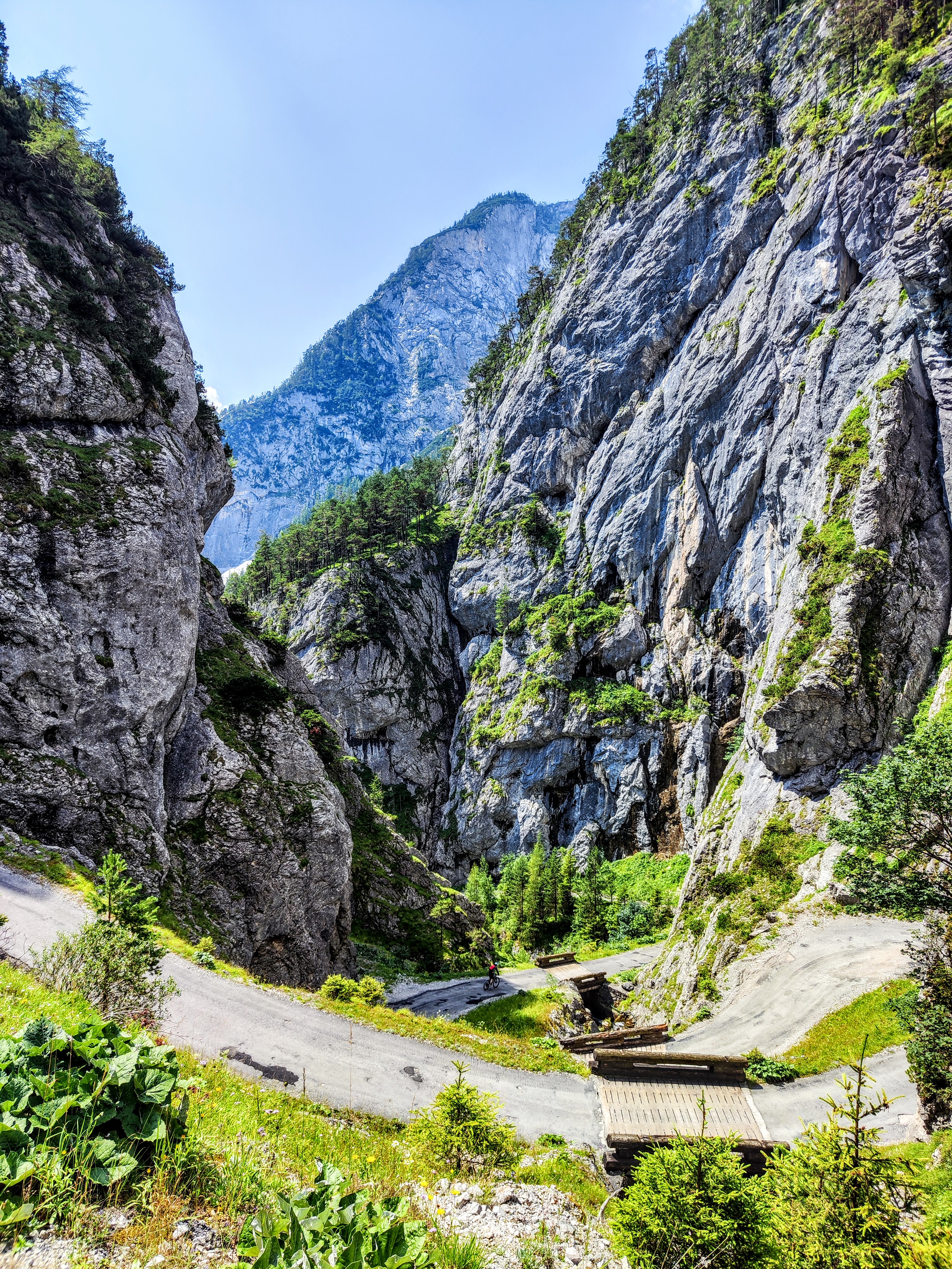 Ein kurzer Blick zurück – der Dachstein wolkenverhangen. Die lange Abfahrt wartet – erst auf Schotter zum Seeboden – dort beginnt da spannende Teil der Tour. Die steile Passage durch die Öfen ist asphaltiert, aber zT stark durch Steinschlag beschädigt. Sehr eindrucksvoll! In Gröbming im Ennstal angekommen einfach dem Radweg folgen und mit Grimmingblick geht’s dann retour ins Ausseerland nach Bad Mitterndorf…