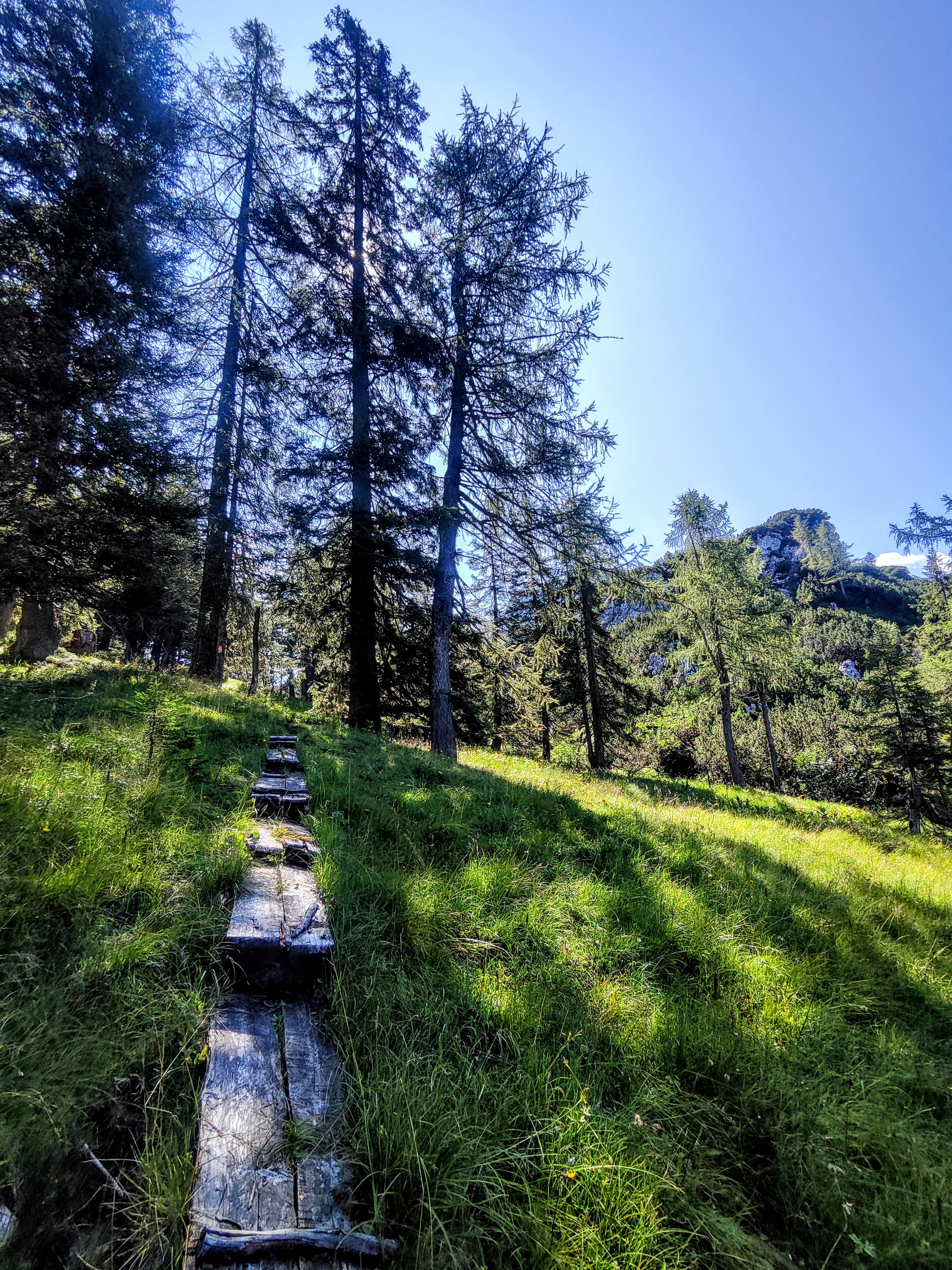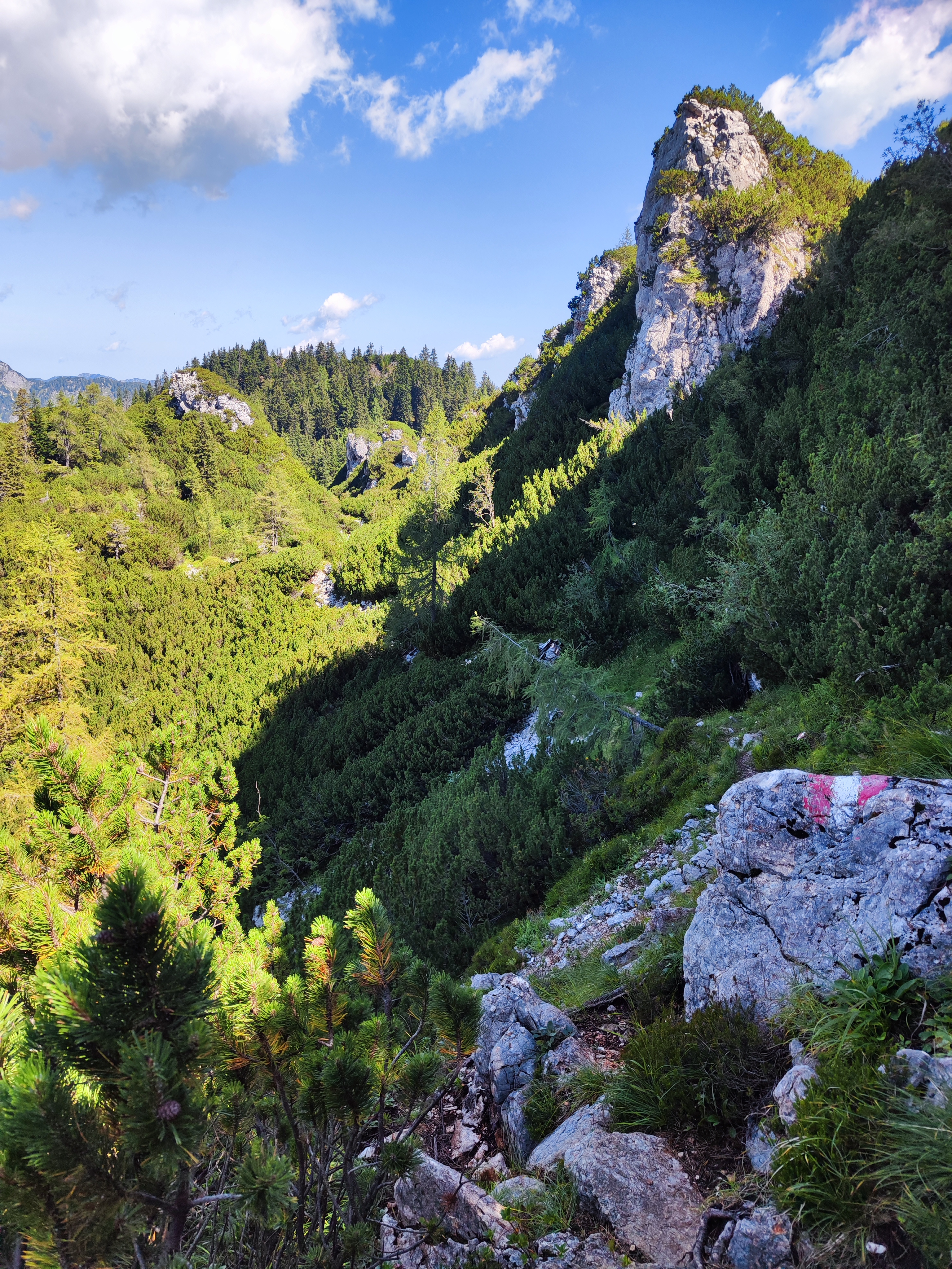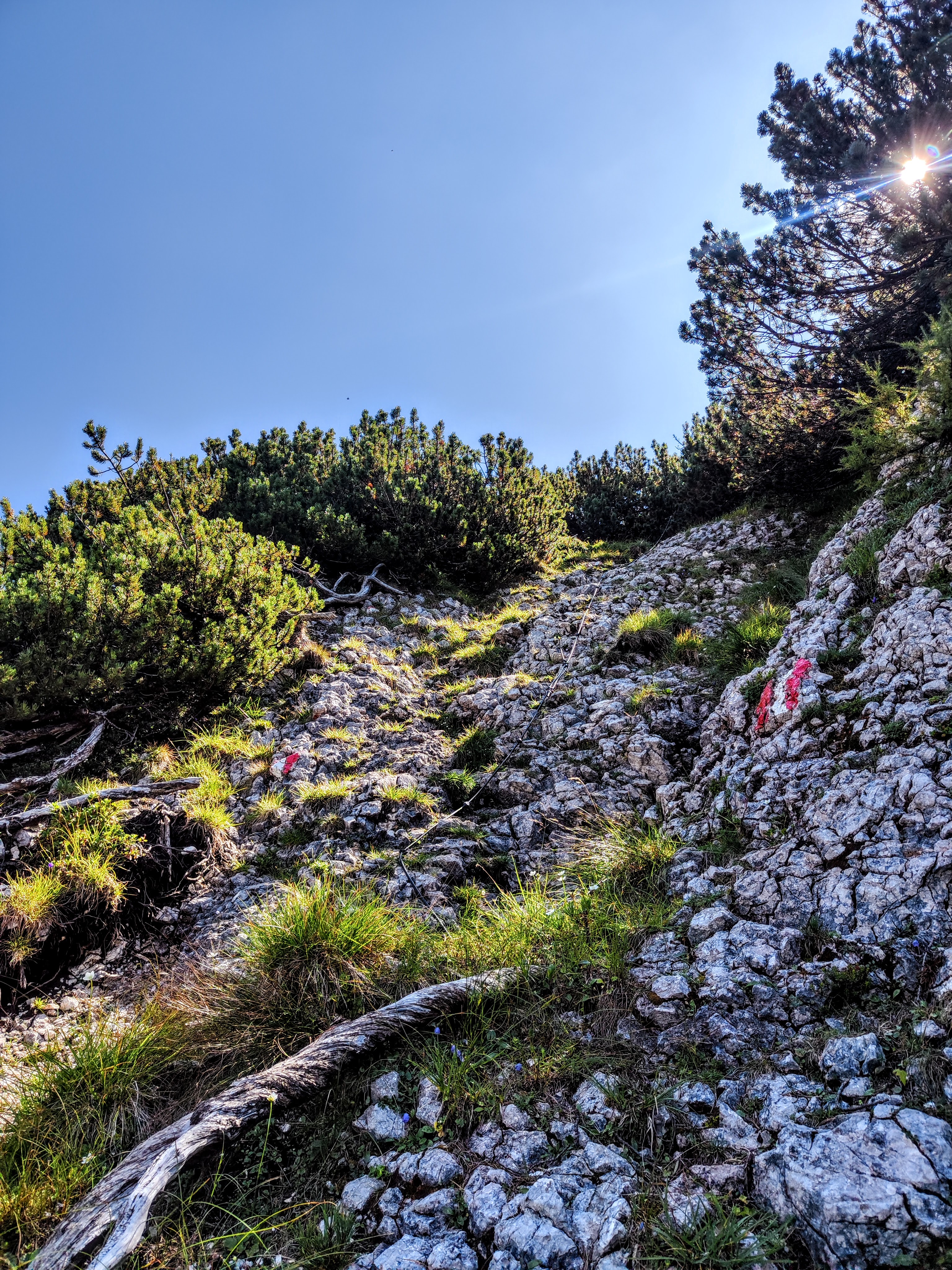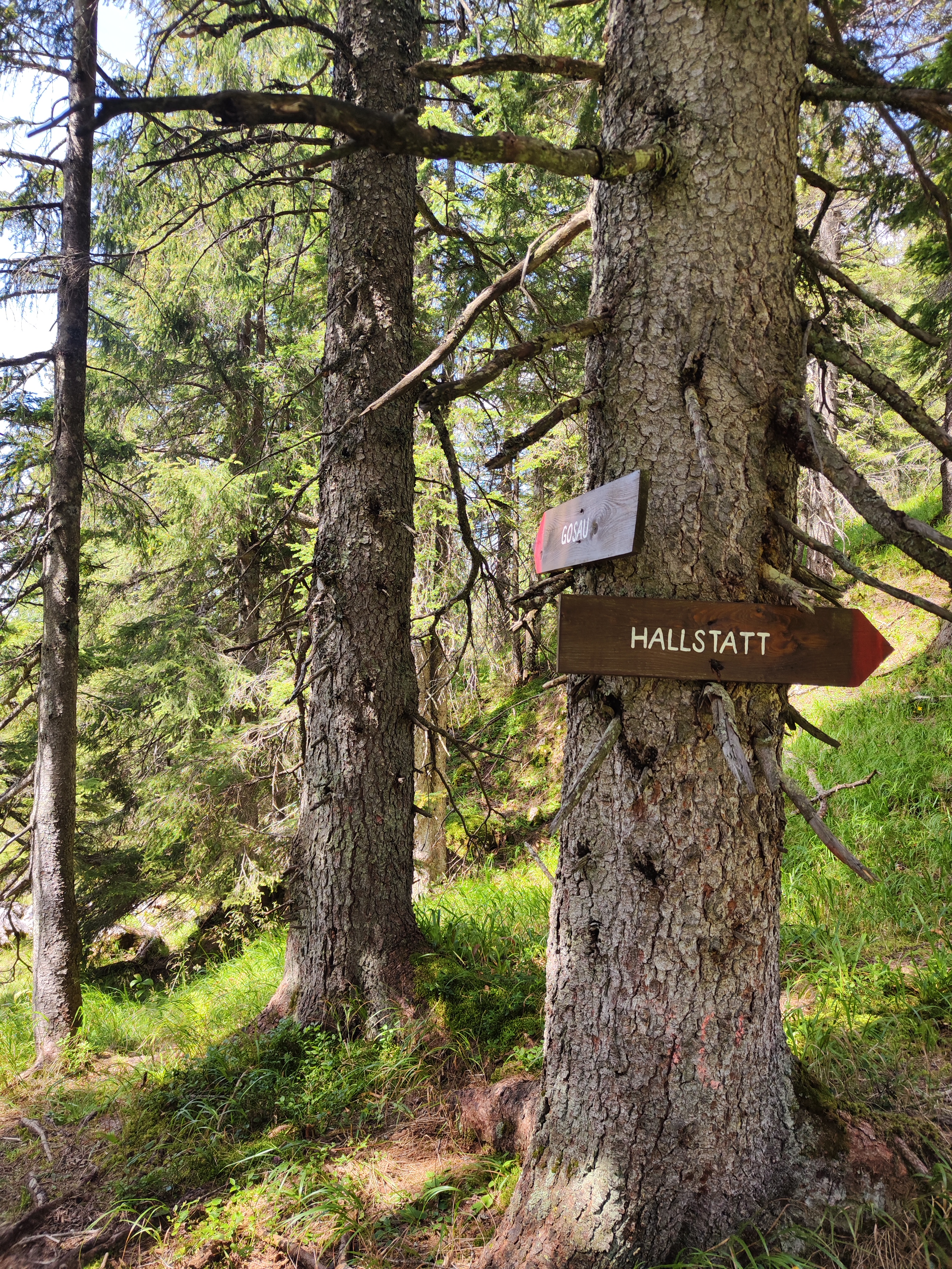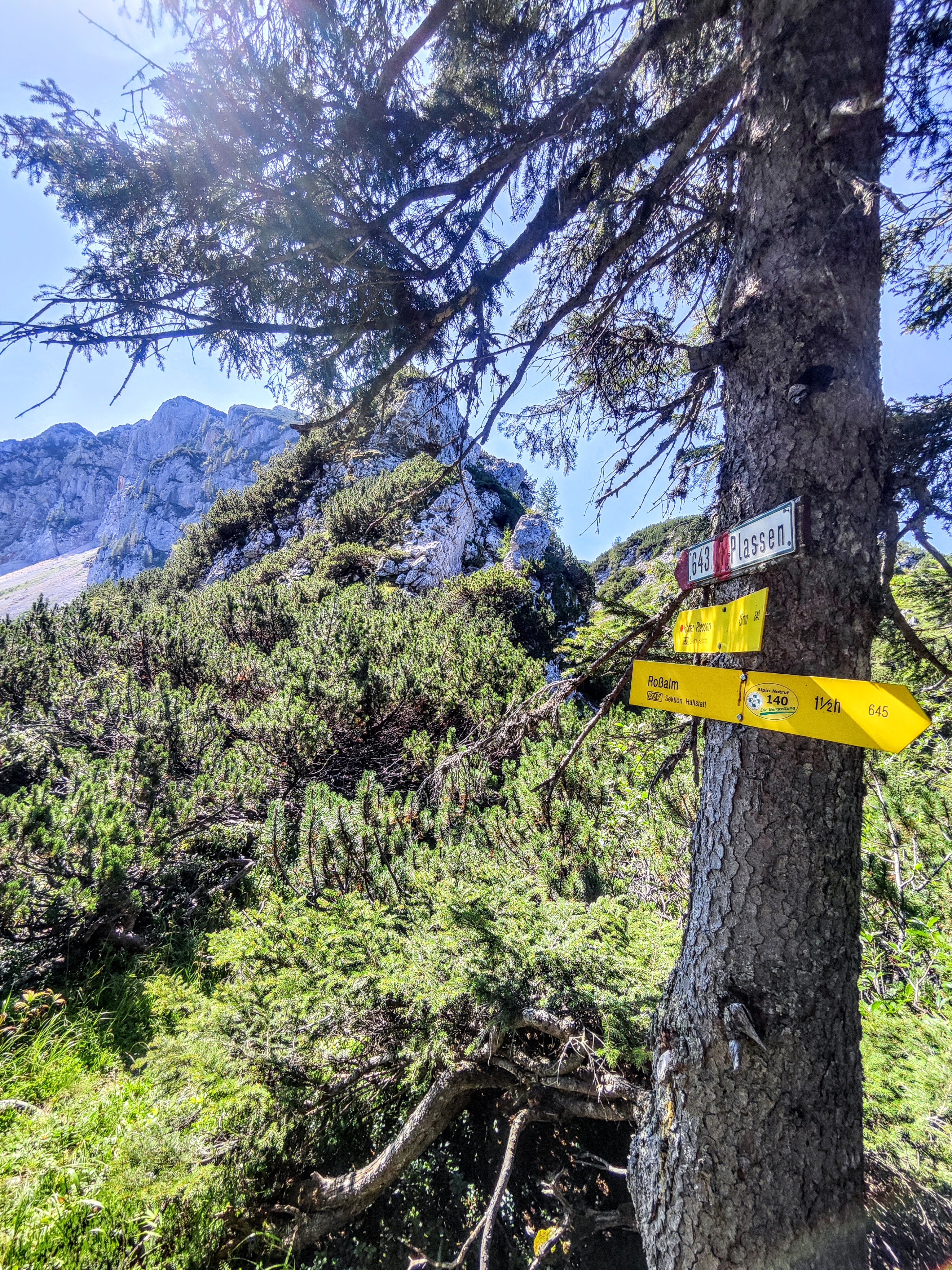 Auf der Alm gibt’s ein Begrüssungs-Kalbal-Kuhmitee, dann gehts immer bergauf. Durchs Feuchtwiesen Gebiet führen a Stück weiter oben alte Holzstege (die restlichen Kühe ham im Woid a Vormittagsrastal gmacht). Am Schiechlingsattel kommt Weg 645 aus Hallstatt dazu... eini in Latschentango und dann ins Geröll. Auf 1670m wirds gleich alpiner… von der Alm in den Karst. Schatten und a frisches Windl geniessen – das geht auf der Rückseite des Plassens. Koa Mensch unterwegs. Dann wirds steil… durch die grasige Gasse (Achtung, auch am spätn VM nu leicht feucht & rutschig – trocknet nimmer auf) in Serpentinen auffi. Ein Fixseil wartet in der nächsten Steilstufe. Und dann in sanftem Auf & Ab weiter, der Gipfel zum greifen nah.