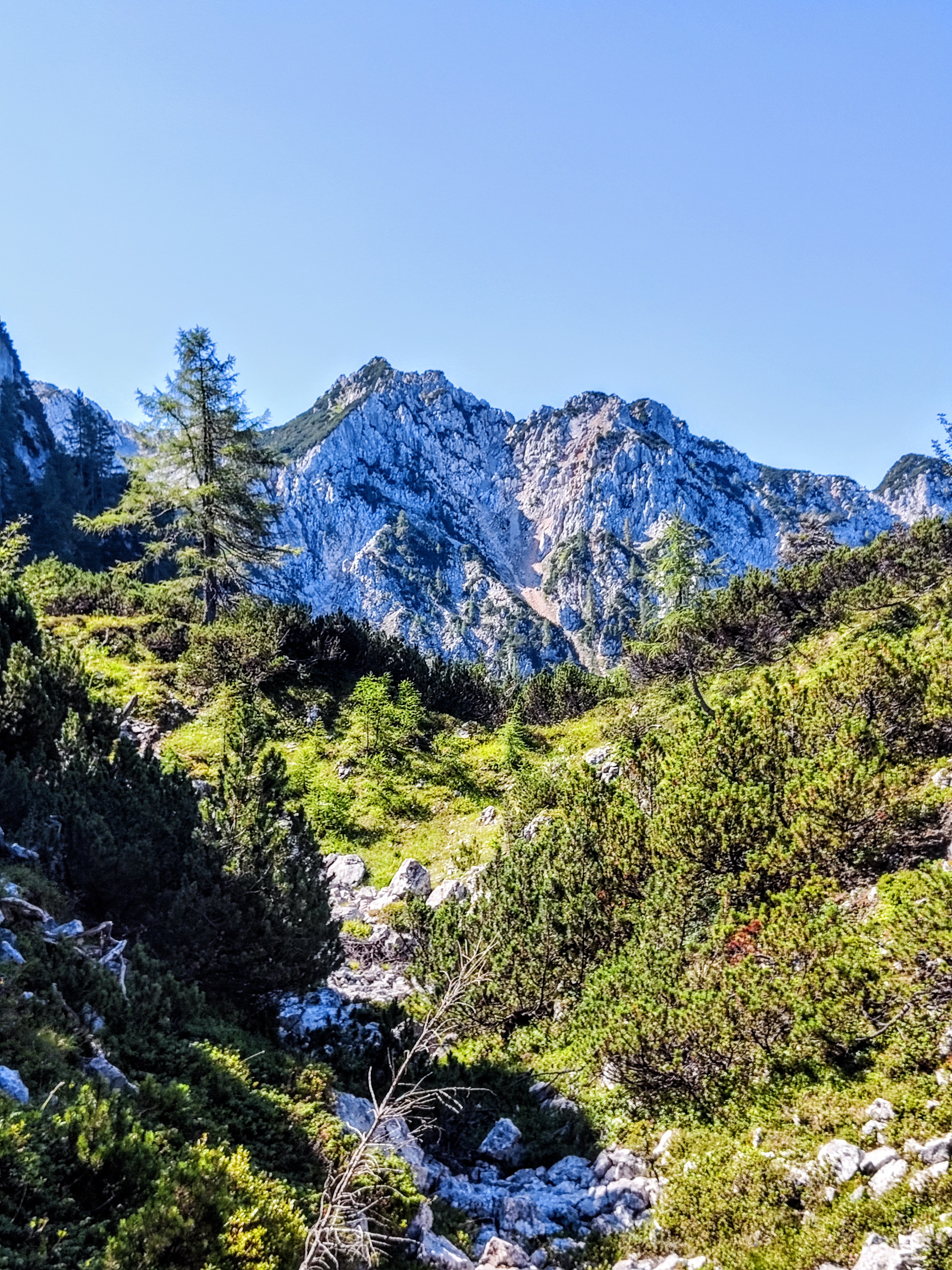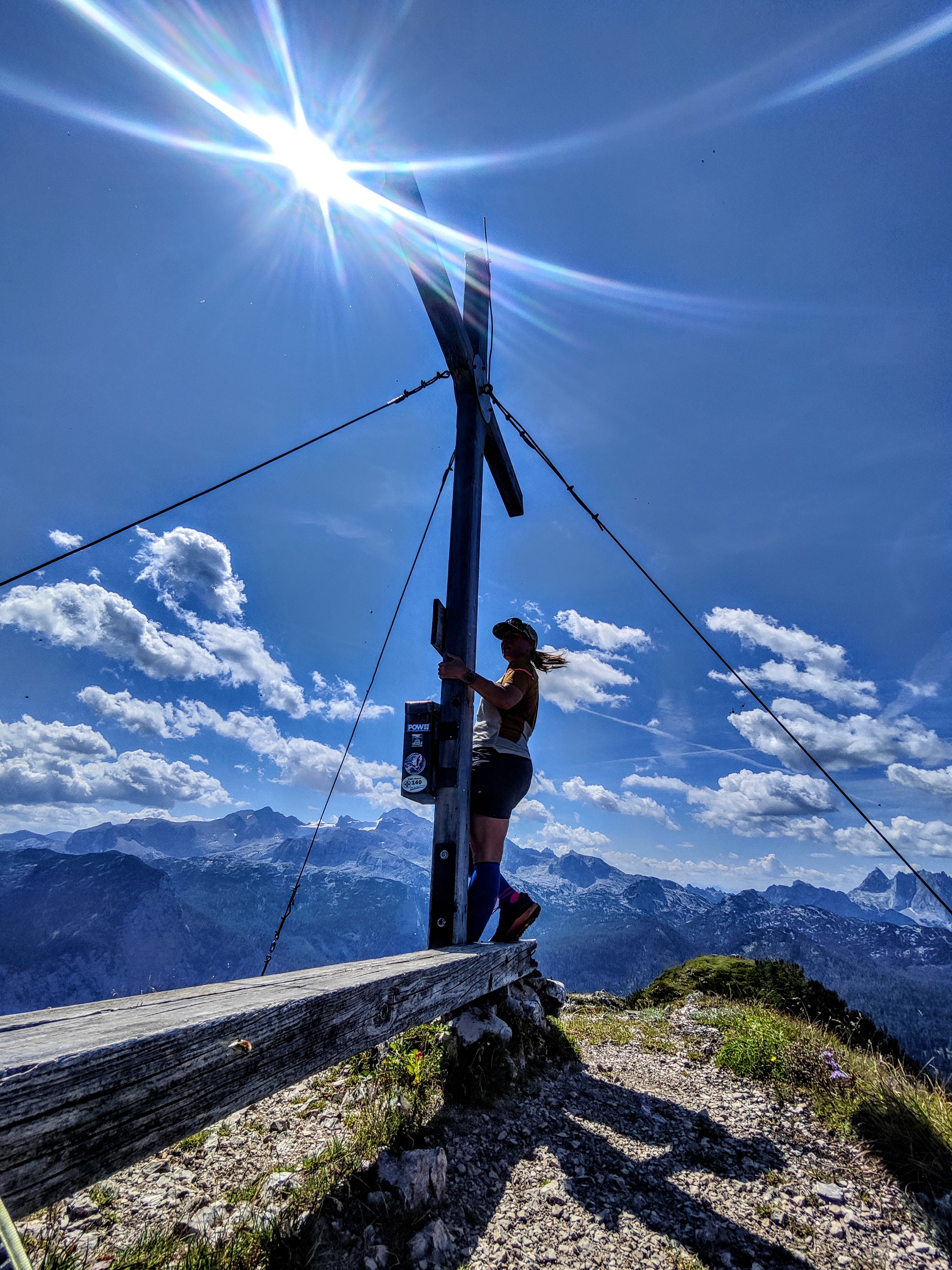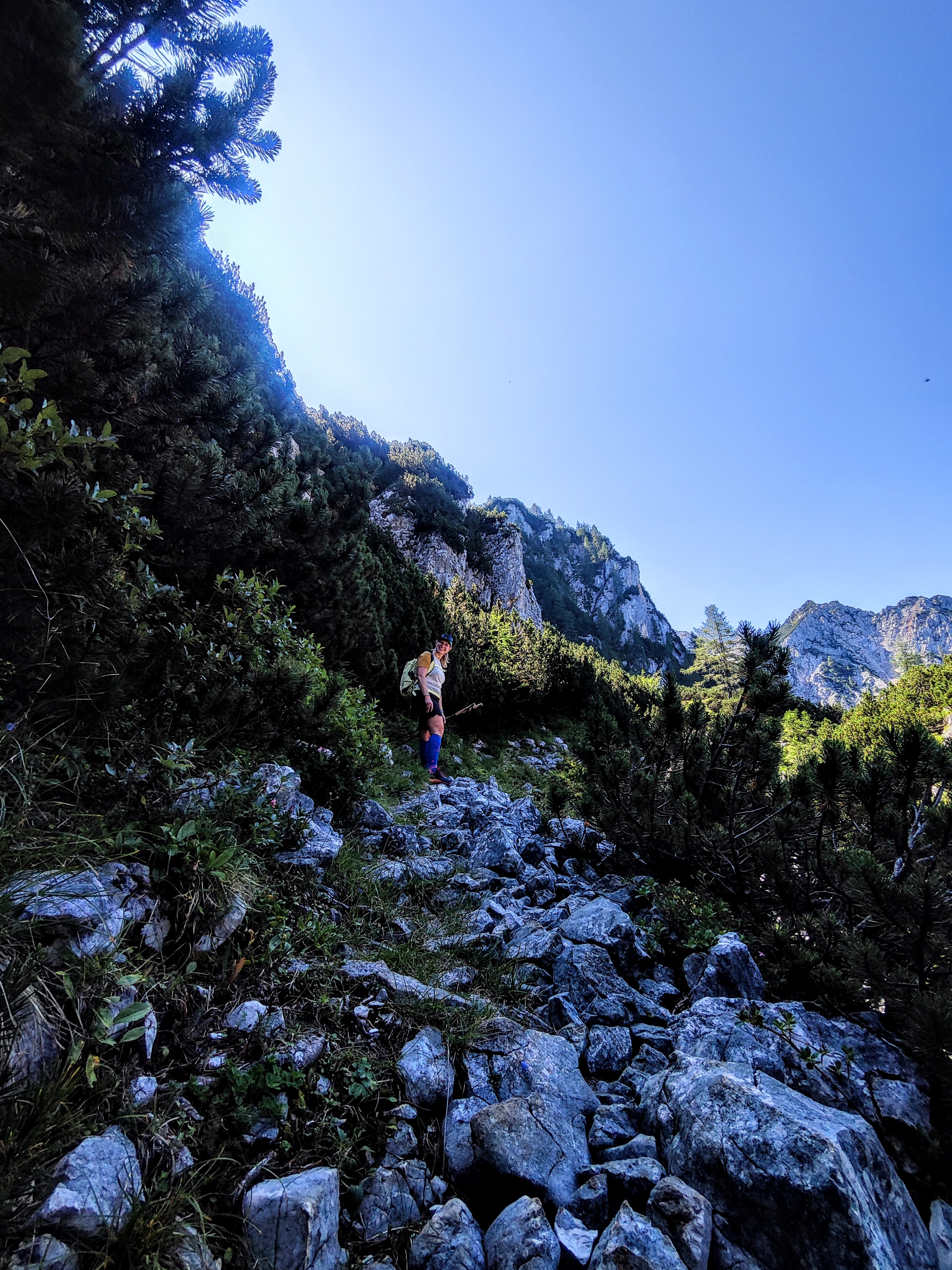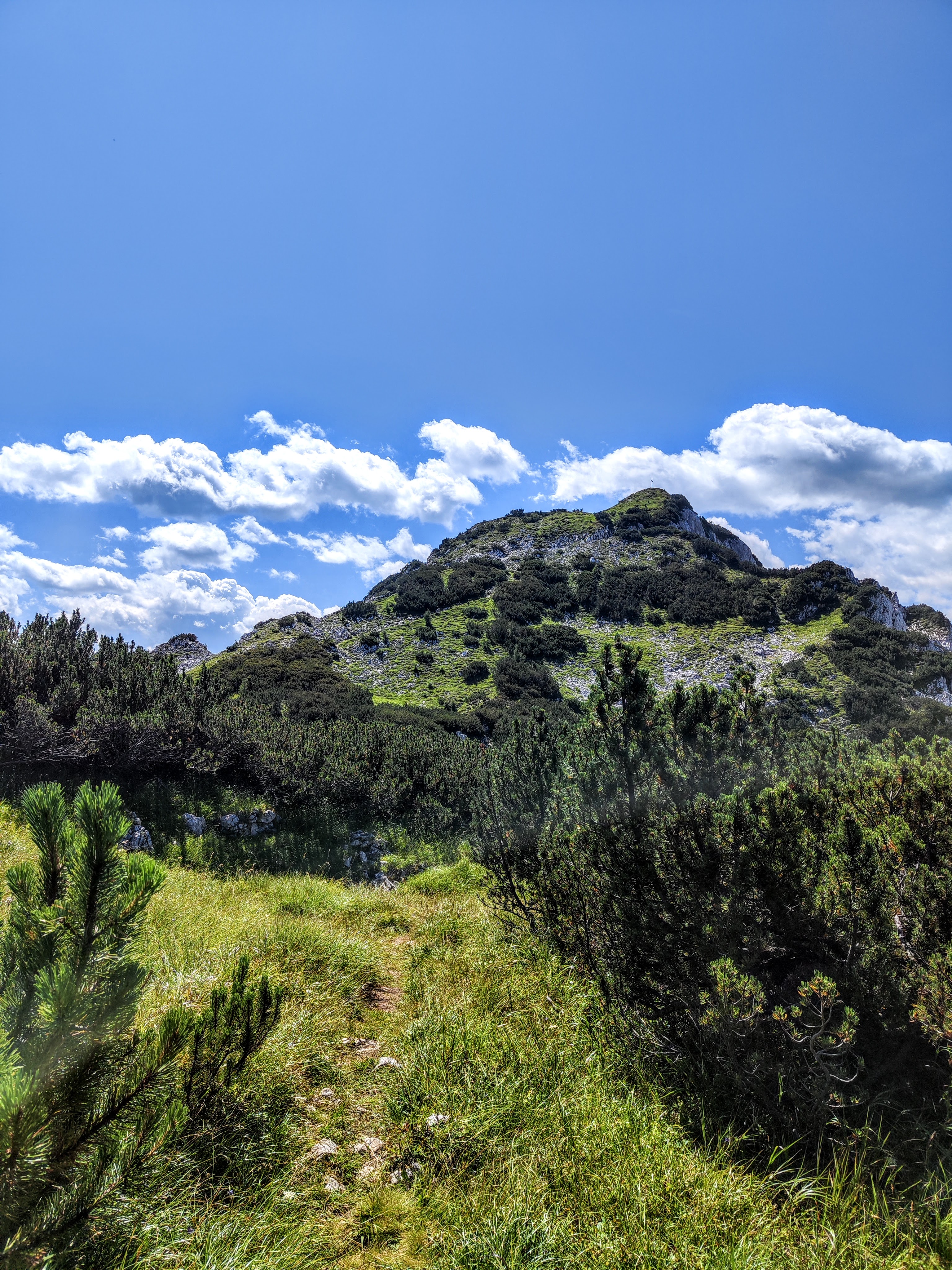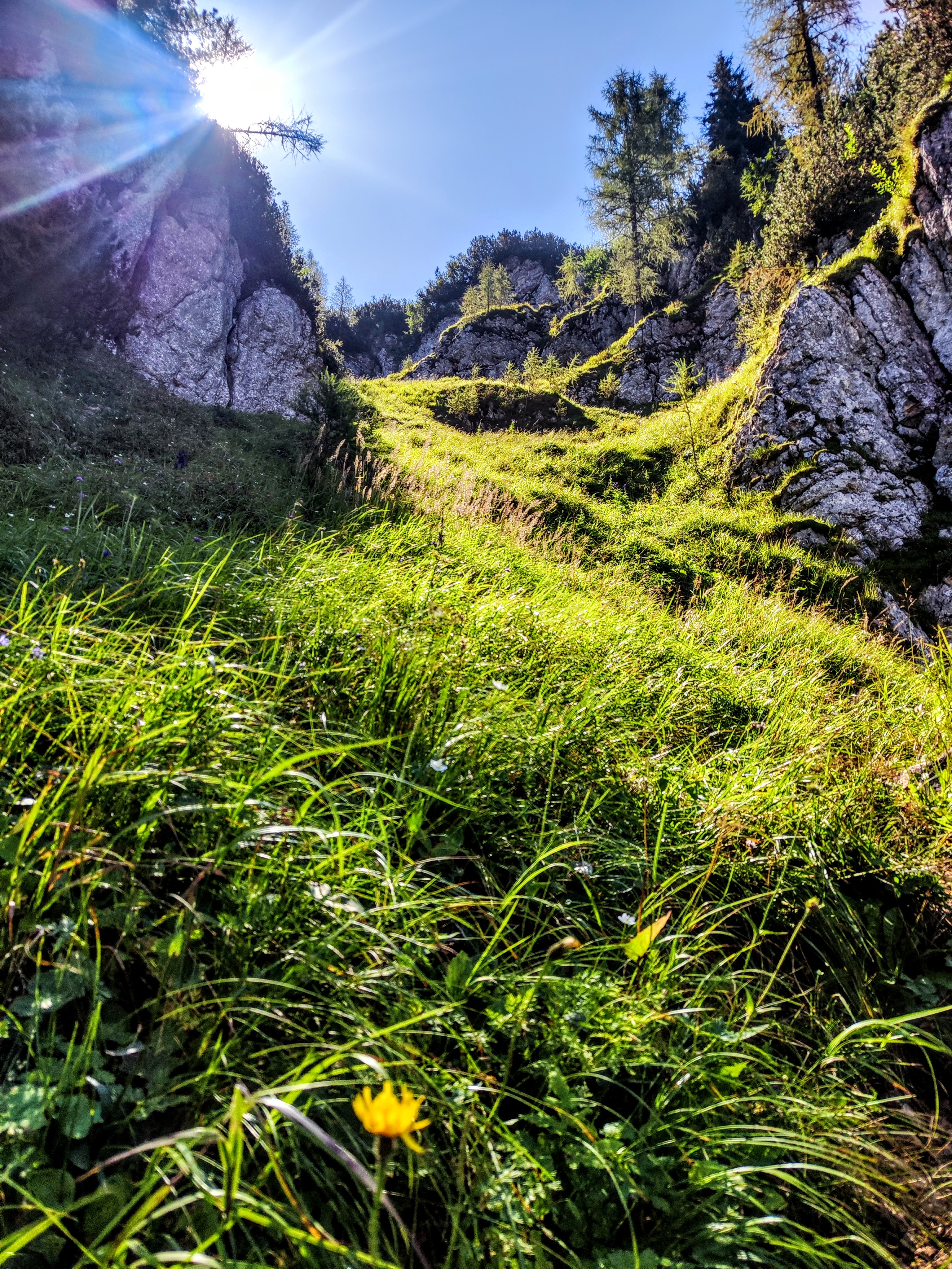 Auf der Alm gibt’s ein Begrüssungs-Kalbal-Kuhmitee, dann gehts immer bergauf. Durchs Feuchtwiesen Gebiet führen a Stück weiter oben alte Holzstege (die restlichen Kühe ham im Woid a Vormittagsrastal gmacht). Am Schiechlingsattel kommt Weg 645 aus Hallstatt dazu... eini in Latschentango und dann ins Geröll. Auf 1670m wirds gleich alpiner… von der Alm in den Karst. Schatten und a frisches Windl geniessen – das geht auf der Rückseite des Plassens. Koa Mensch unterwegs. Dann wirds steil… durch die grasige Gasse (Achtung, auch am spätn VM nu leicht feucht & rutschig – trocknet nimmer auf) in Serpentinen auffi. Ein Fixseil wartet in der nächsten Steilstufe. Und dann in sanftem Auf & Ab weiter, der Gipfel zum greifen nah.