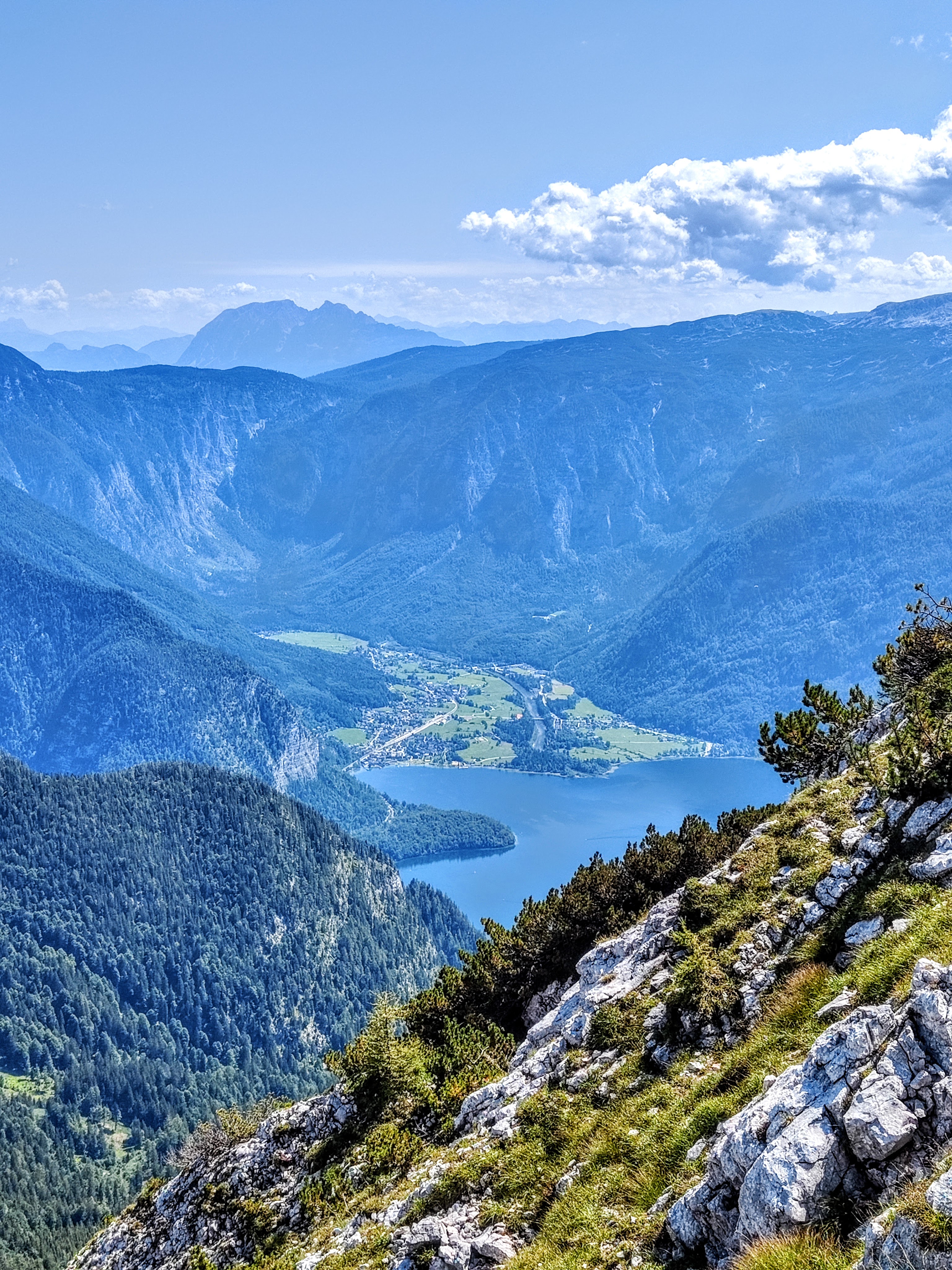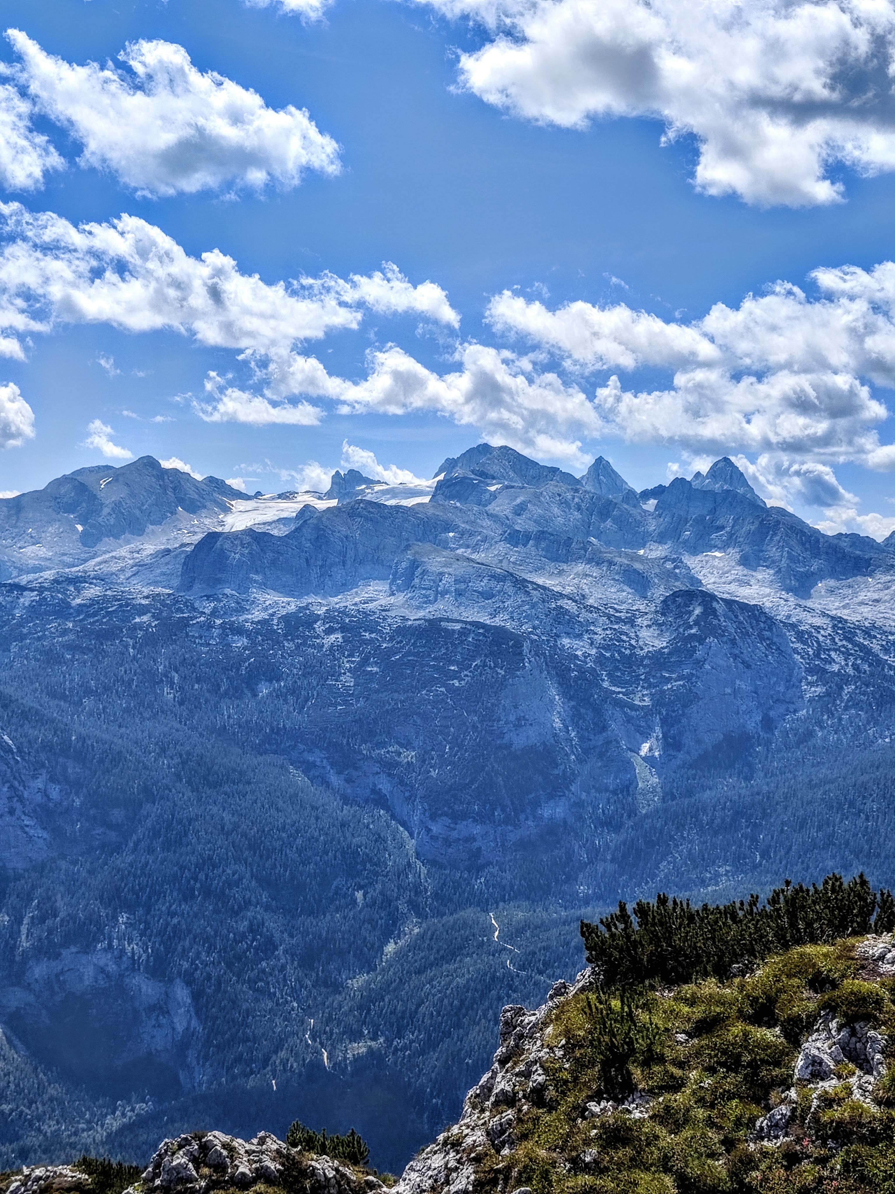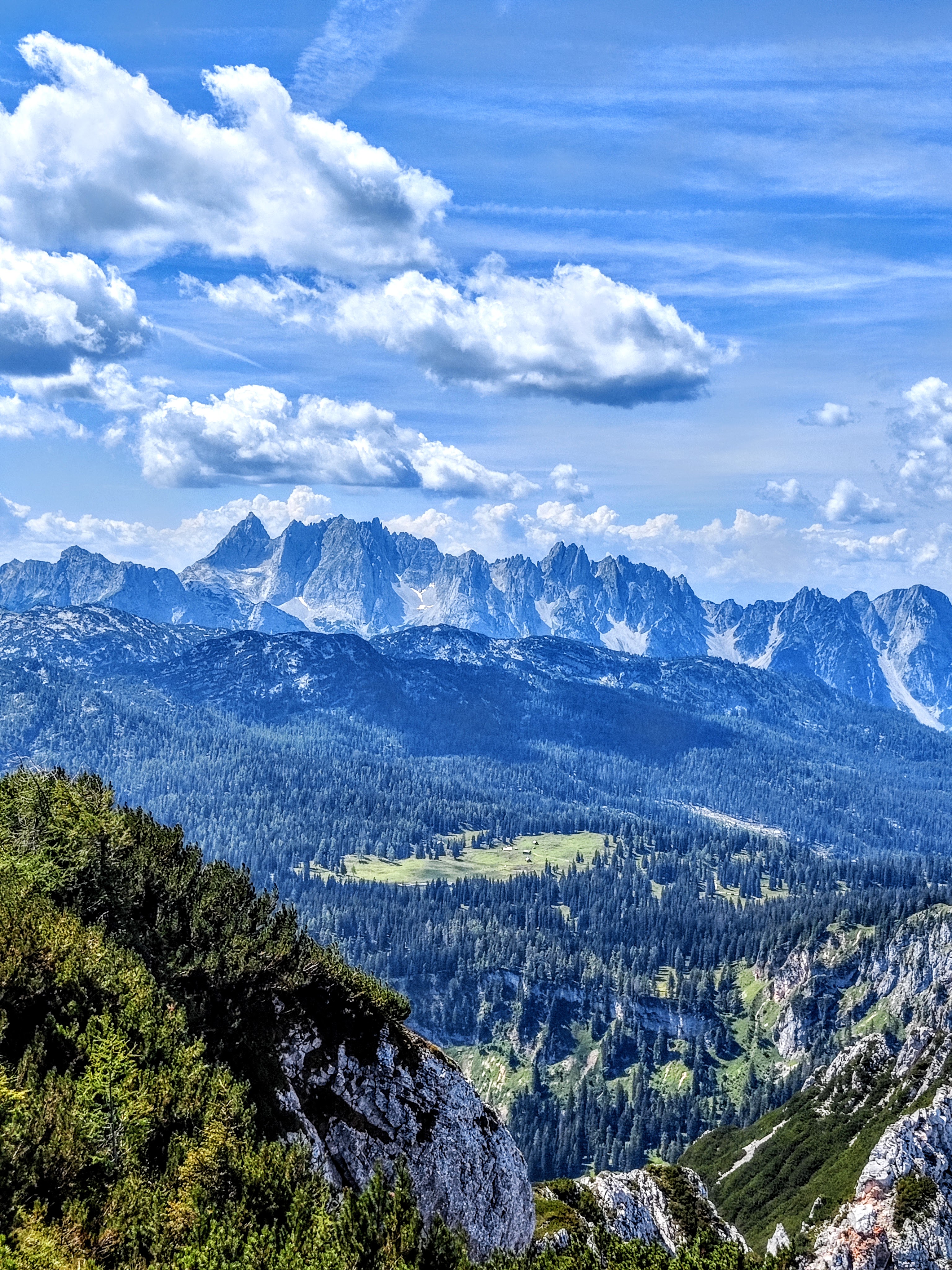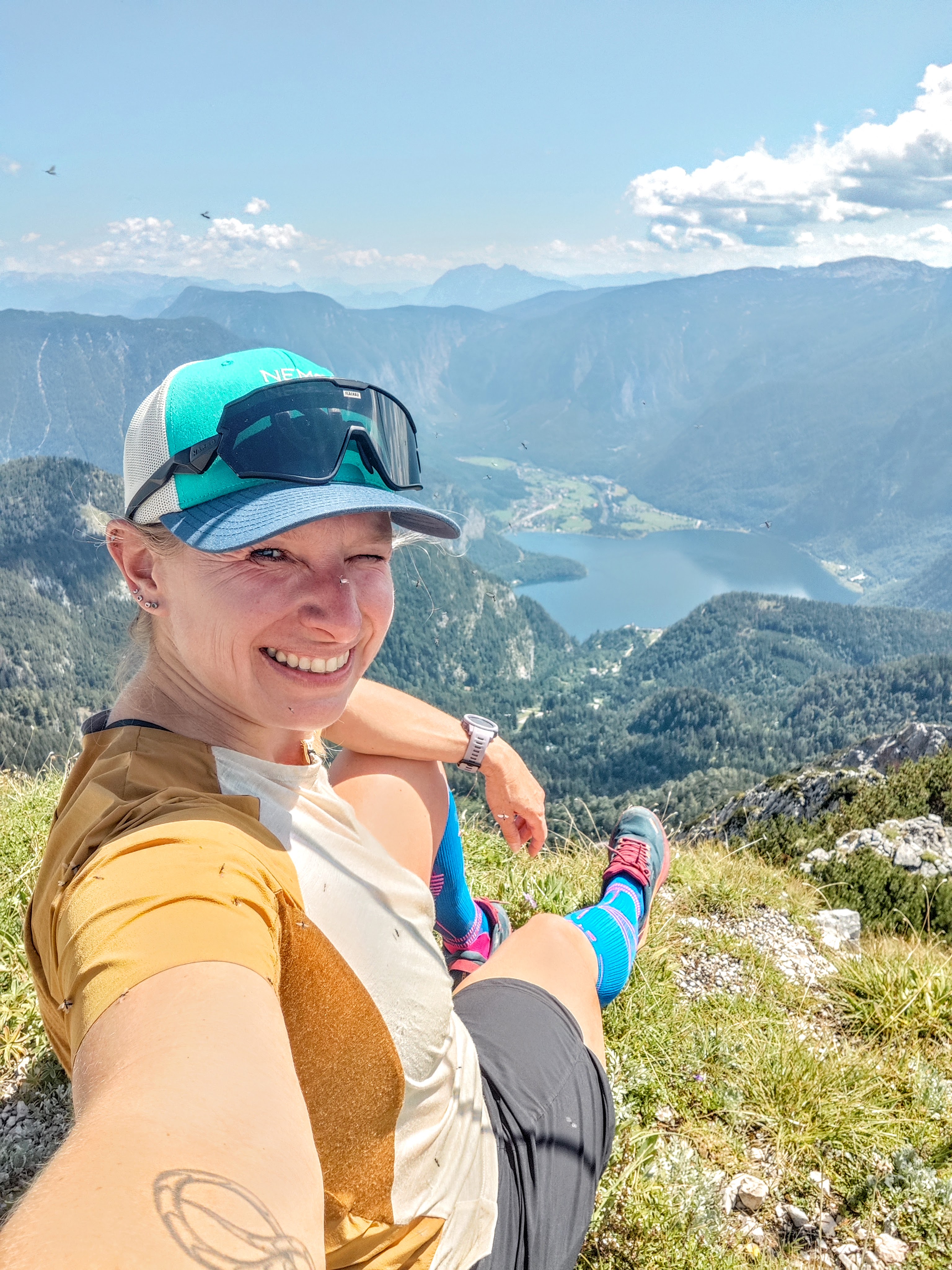 Gipfelglück am Plassen 1953m – Wahrheit ist, schnell Büdl gmocht, ins Gipfelbuch (vo 2016) eini gschriebn, was trunken & dann die Flucht vor ana Armada fliegender Ameisn ergriffen. Jo mei… Aber der Blick zum Gosaukamm über das weitläufige Gosauer Almgebiet – scho schee! Tiefblick zum Hallstättersee nach Obertraun – im Hintergrund der markante Grimming. Zum Dachstoa ummi – vü grau & vü blank statt weiß. Mocht mi scho a weng traurig, beim abschmelzen zuschaun zmiassn. Auf Hallstatt selbst sieht man nicht. Das Jausn-Pauserl a Stückerl nach unten verlegt – Ruhe geniessen. Die längere Variante der Runde geht sich heute nicht aus. Dann retour zu den beiden Felstürmen, hinter denen sich bereits erste Gewitterwolken auftürmen… der Steig führt rechts unterhalb bis zum bewaldeten Schiechlingkogel (mittig). Zurück zur Schreieralm, auffi aufs Radl, zruckschau zum Plassen und voigas zur Rossalm. Hunger & Gewitterprognose im Nacken… Retour gibts dann noch 2, 3 Gegenanstiege beim radln.