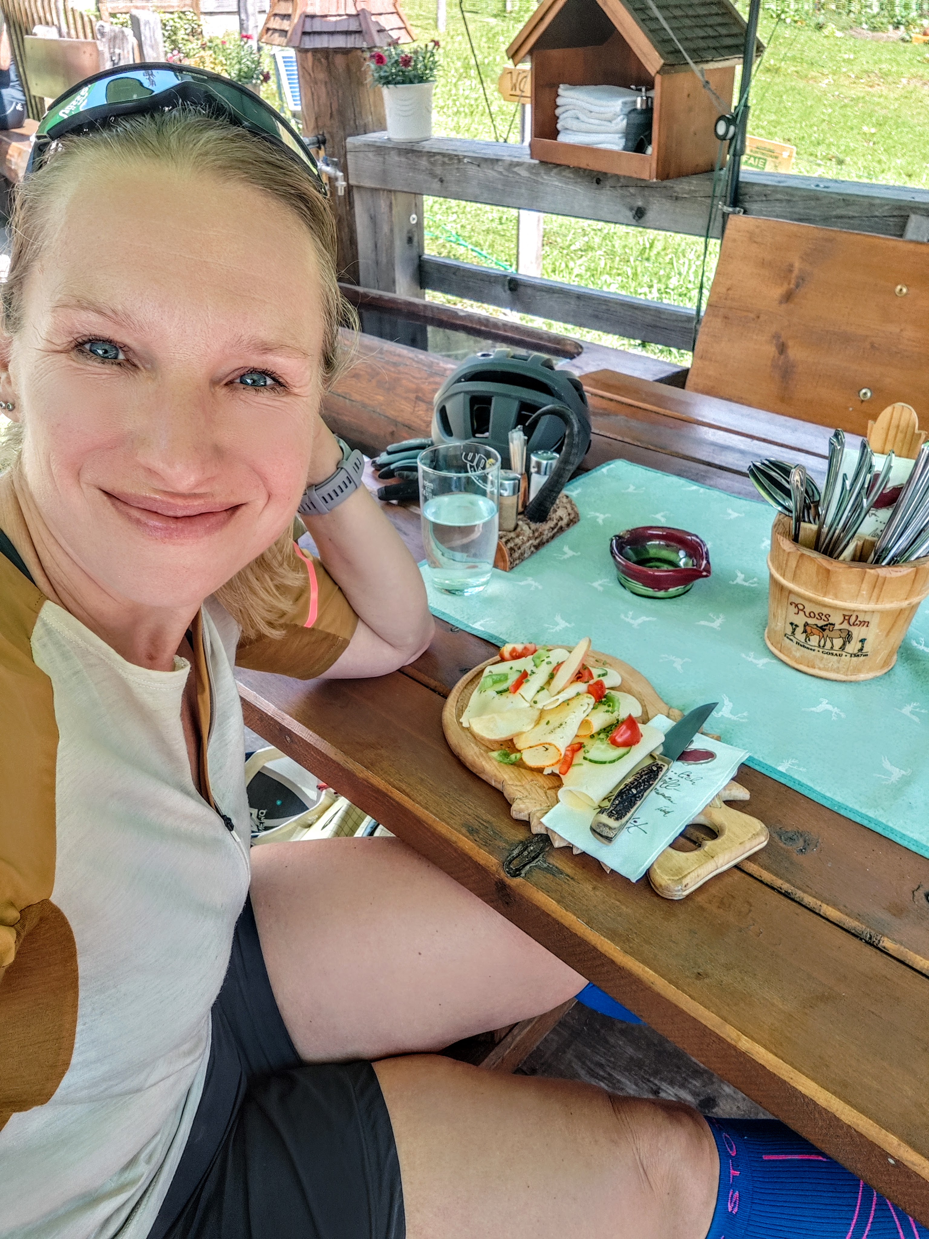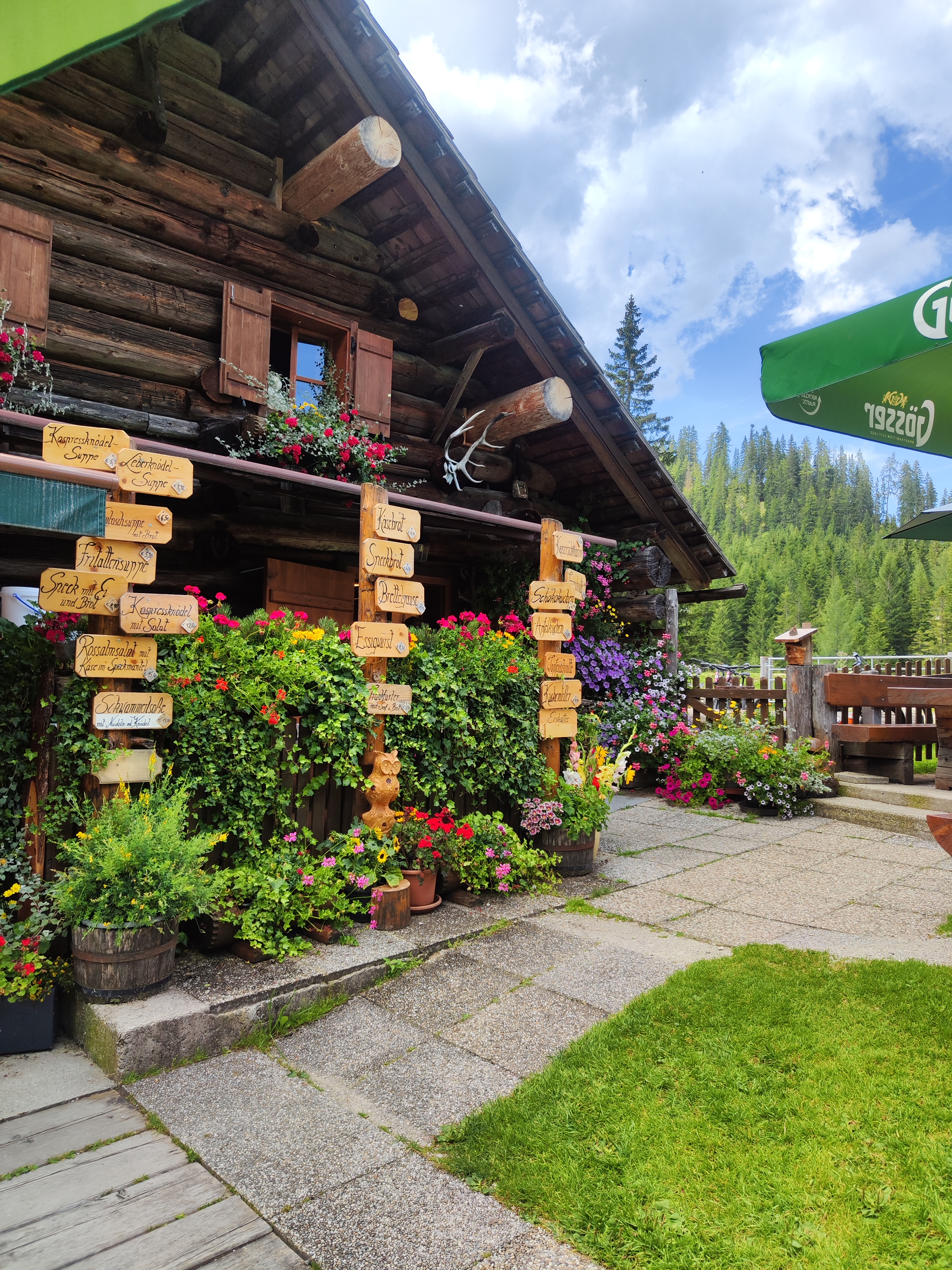 So a scheens Blumenparadies begrüsst auf der Ross Alm… Einkehrstop – koa Frage! Pferdln, Kühe & Hochlandrinder daneben. Sitzn könnt ma hier scho gut und lange, aber die Gewitterwolken – eh scho wissen. Deswegen: Kasbrot, Hollawossa – mehr brauch i nit. Obwoi, a Kaffeetschi mit Bunkl oder so a Ross Alm Salat … beim nächsten moi!