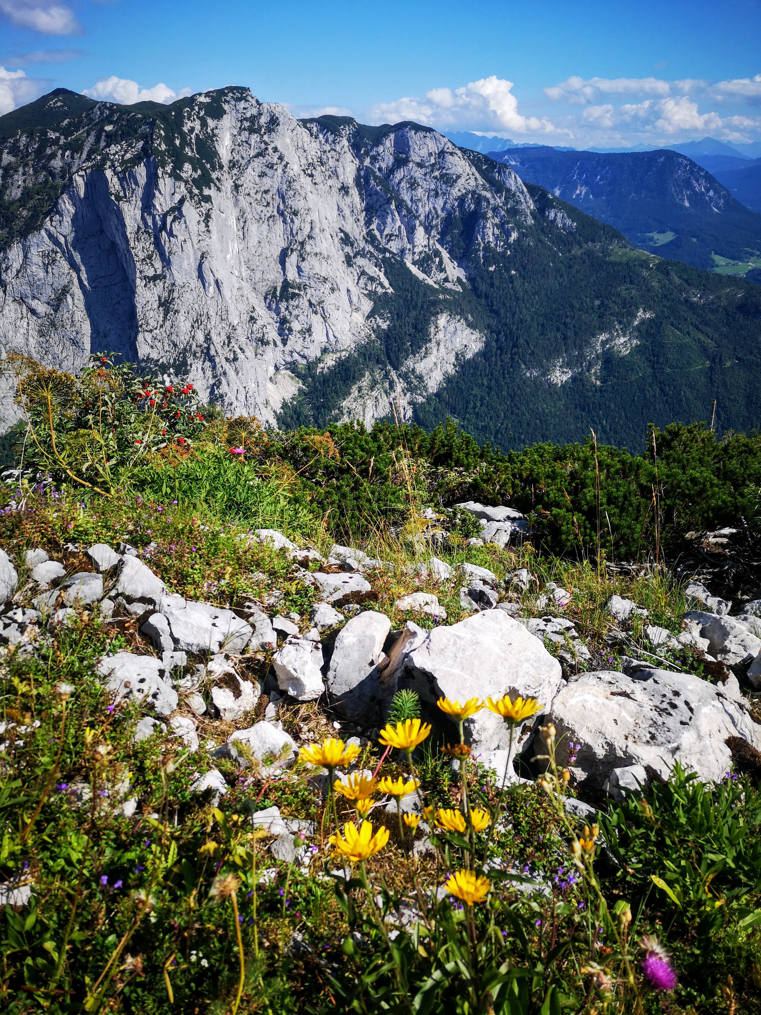 Am Karl Stöger Steig traversiert man wieder retour Richtung Loser. Immer wieder gibt es kurze Blicke auf den See, die markante Trisselwand zur Linken mit Tressensattel & -stein. Viel Fels, viel Grün – auch das gibts im Toten Gebirge. Kurze, bissi ausgesetzte aber seilversicherte Passage inklusive. Auf dem Weg kommt man an einem speziellen Loch neben dem Steig vorbei, aus dem einem ein kalter Windhauch entgegen weht. Gut, das ist untertrieben – eher a ganze natürliche Klimaanlage! PS: kurz danach rechts das selbe Spiel, diesmal eine Höhle, die von aussen nur als Felsnische sichtbar ist. Aus ihr bläst es genauso kalt heraus. Und dann habe ich ein ganz besonderes Vergnügen: er ist handtellergross, streng geschützt und extrem selten. Auf dem Weg stolpere ich über diesen wunderschönen, riesengrossen Falter – ein Apollo! Seine Flügelspannweite: 6-9cm, er kommt nur über 1000m vor! Ja, über sowas kann ich mich extrem freuen, auch wenn ich erst im nachhinein googlen konnte, welches Glück wir hatten. Wieder ein Beweis, was für ein einzigartiger, schützenswerter Naturraum das Tote Gebirge ist. Mei Herz hupft, was für a gewaltig schönes Steigerl – immer wieder a Blütenmeer im grauen Fels.