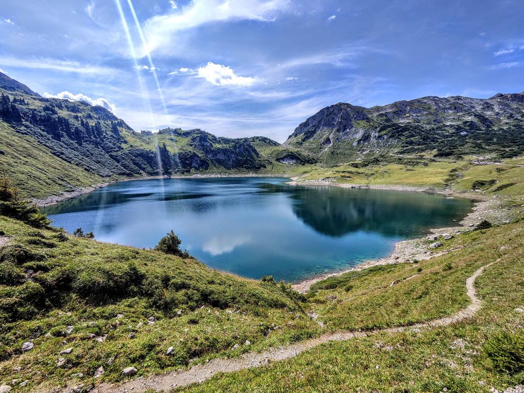 Auf 1793m mit der gewaltigen Roten Wand im Hintergrund liegt dieser Hochgebirgssee im Lechquellengebirge. Der Formarinsee bildet sich jedes Jahr von Neuem aus Schmelzwasser – hinten links auf einem Logenplatzal ist übrigens die Freiburger Hütte zu sehen. Noch ein paar Fakten: der See hat 15,9 Hektar und ist bis zu 17m tief. Der Abfluss ist (wie bei vielen Bergseen) nicht oberflächlich, sondern entwässert unterirdisch über ein Höhlensystem. Erfrischende 15 Grad… geschätzt. Der Weg von der Bushaltestelle zum See führt über eine breiter Schotterstrasse – folgt man ihr, kommt man in 1h direkt zur Hütte. Meine Variante wäre aber ganz klar der Zustieg über den Felsensteig… (ca. 30Min). Beides ist aber heute zeitlich leider nicht mehr drin – der Bus wartet.