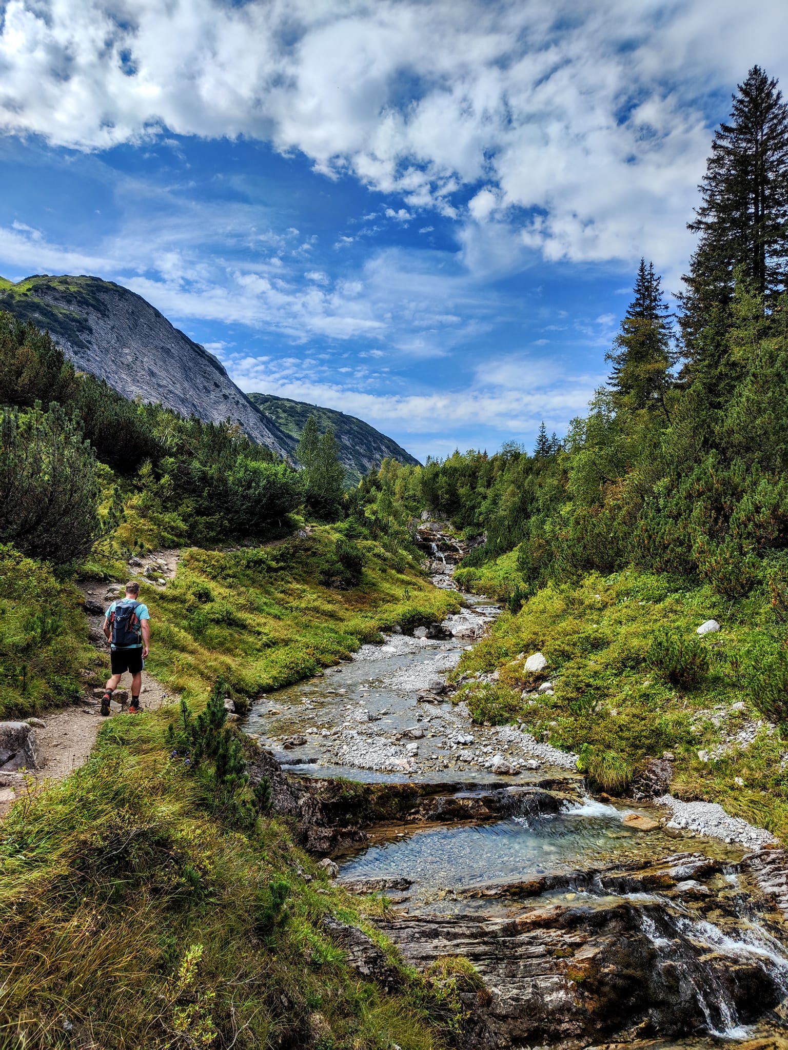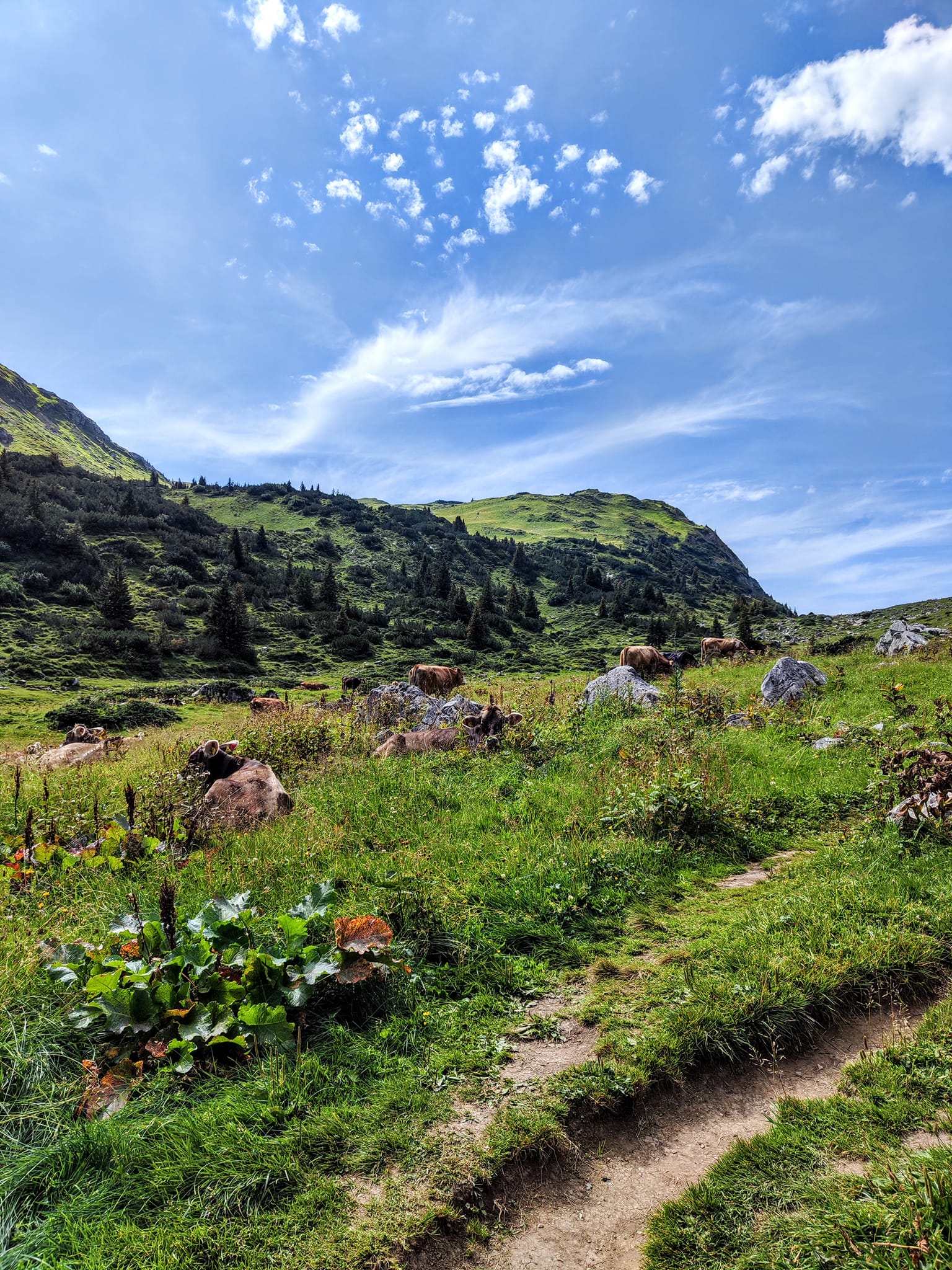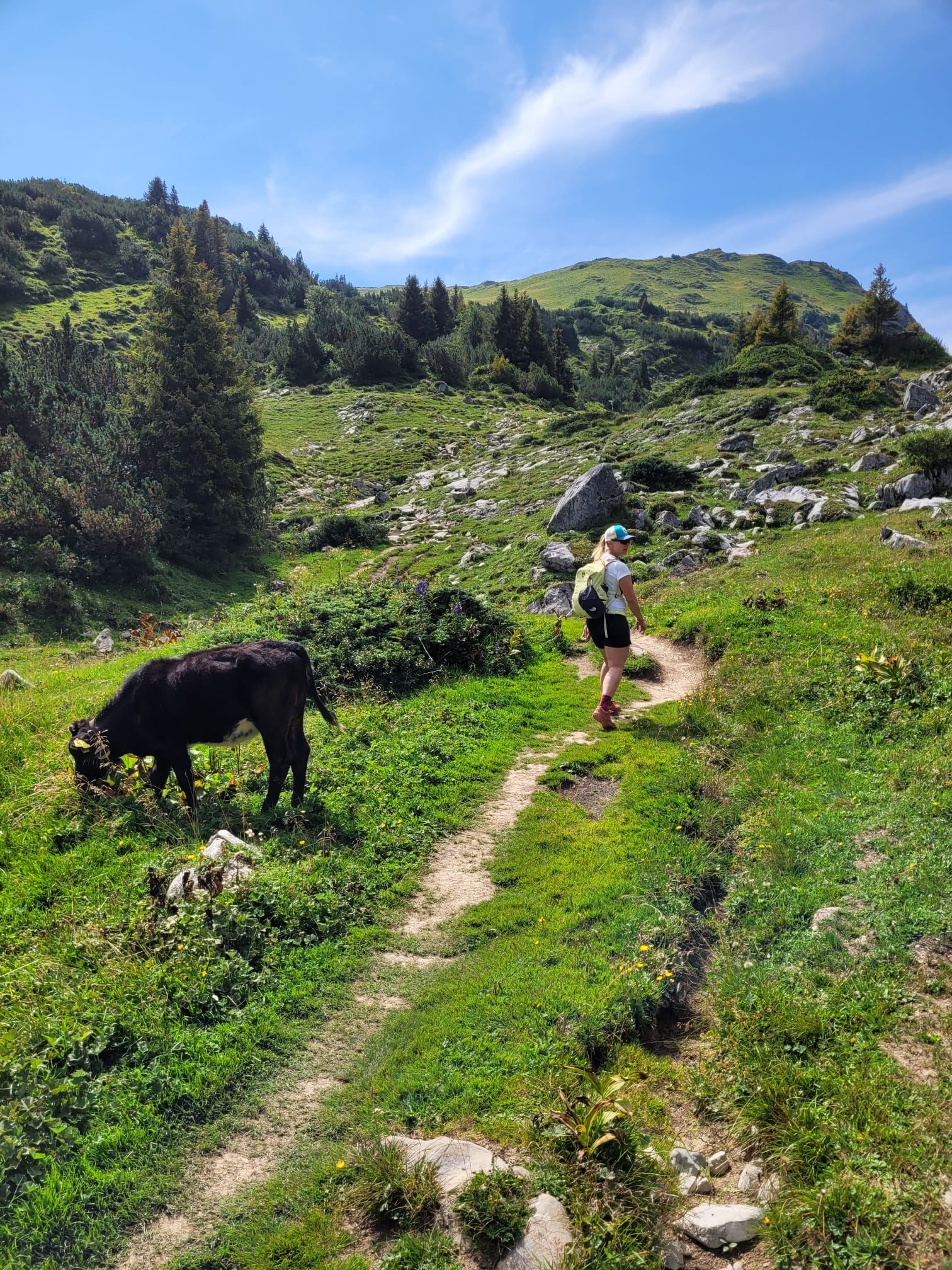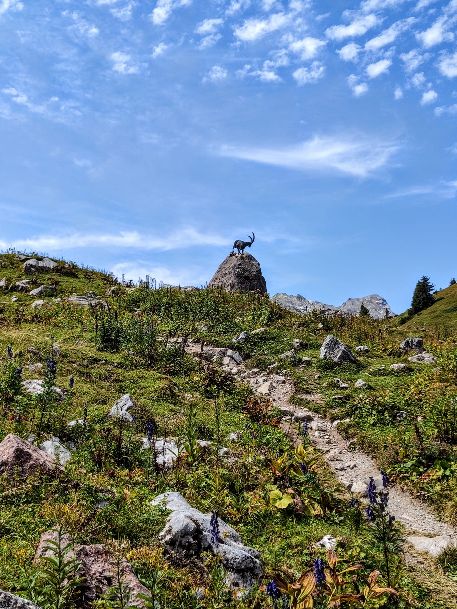 Mal mehr, mal weniger (eiskoids) Wasser neben dem Weg – bis kurz vor dem Formarinsee gar nichts mehr rinnt… bei den hochsommerlichen Temperaturen aber nicht verwunderlich. Für mich der schönste Abschnitt? Ganz klar: zw Älpele & Johannesbachweg (Busstation). Dann geht’s erst über breite Almwiesen auf schmale Steige mit kleineren Felsstufen vorbei an Naturpools bevor wieder Kühe auf der Alm am Wegesrand saftiges Grün schmausen. Hier fliesst nix mehr – nur Schweißtropfen. Das Steinbock Denkmal erinnert an die Wiederansiedelung des Steinwilds 1958 – echtn ho i leida koan gsegn. Die größte Steinbock-Kolonie Europas lebt in dem Gebiet – da lohnt es sich einsamere Gipfelziele oder schwierigere Wanderwege rauszusuchen. PS: wo der Formarin- und der Spullerbach zusammenfließen und den jungen Lech als Bach entstehen lassen, befindet sich die für mich zweitschönste Stelle…