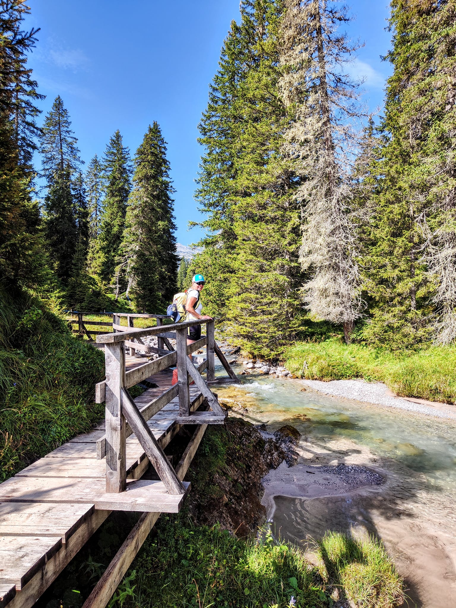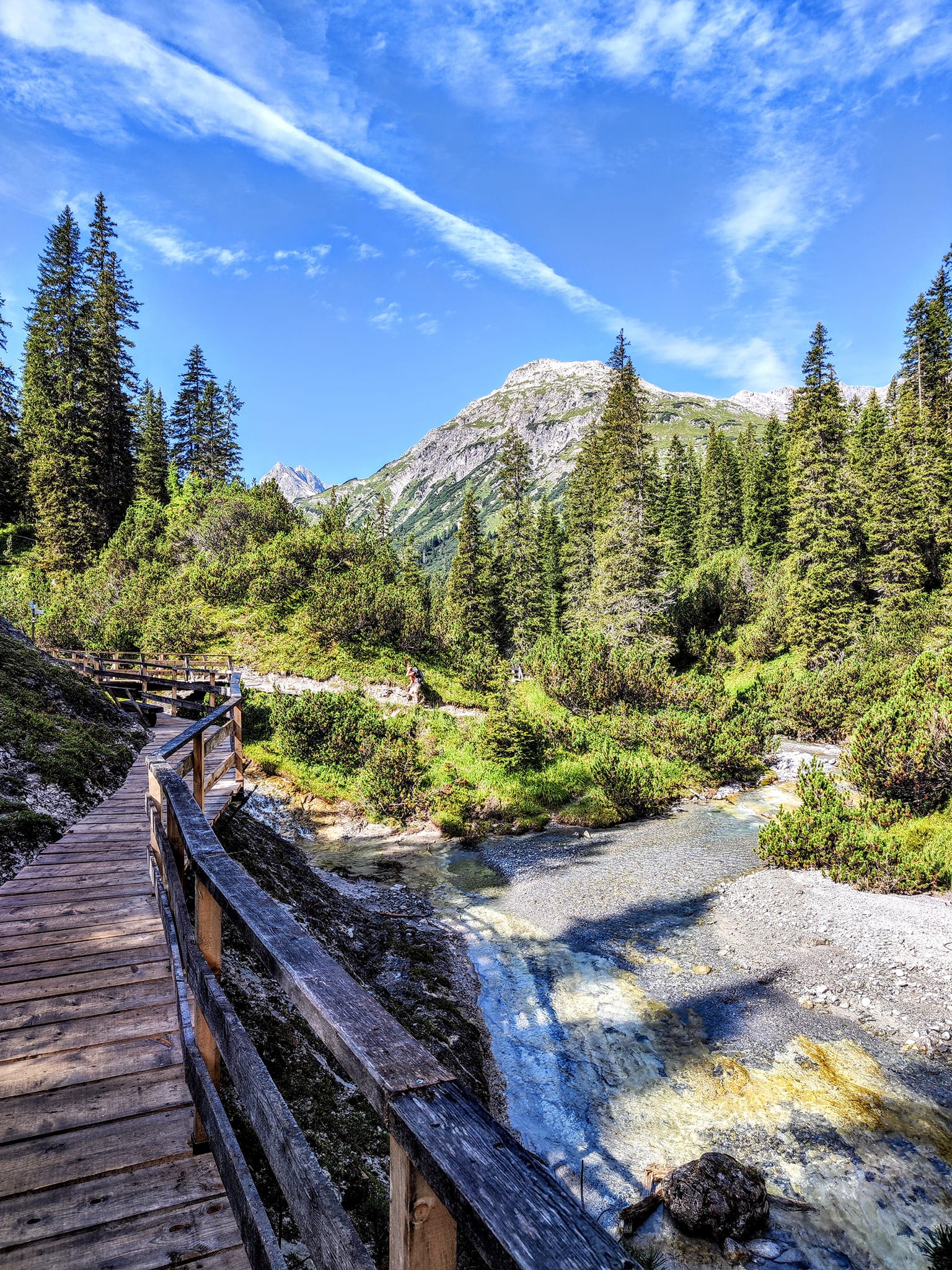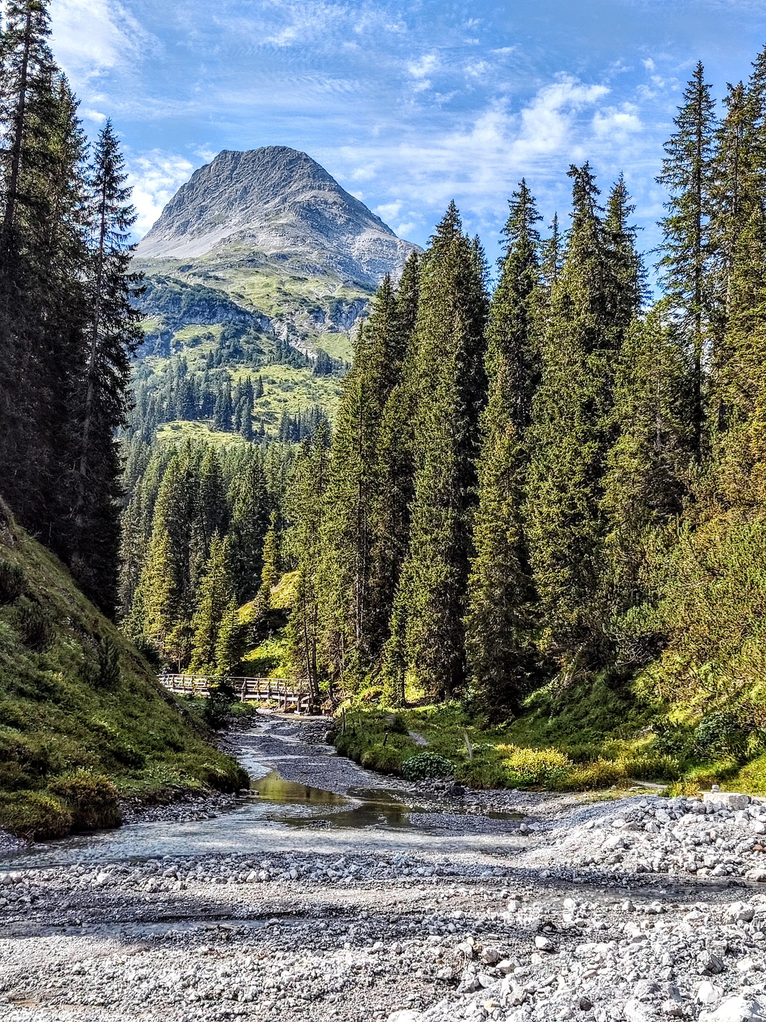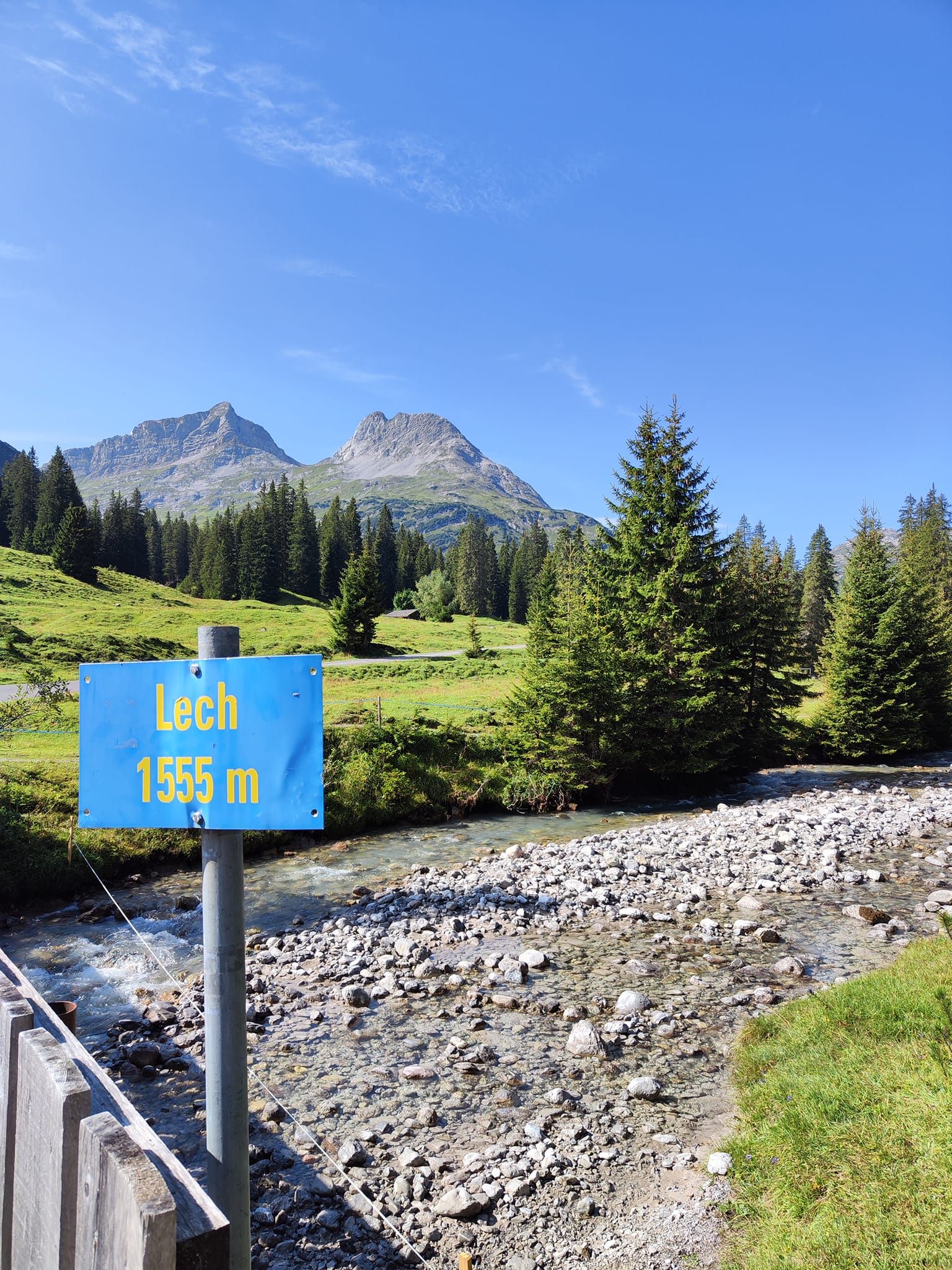 In Lech an der Lech gibt es drei Optionen zu starten. Entweder an der Bus Haltestelle Dorfhuus od Rüffiplatz (haben im Parkhaus ggü Dorfhuus geparkt) oder direkt zur Fuß über die Kneippanlage & Fischteich zum Gh Älpele (wo wir zeitbedingt weggehen). Der Lechweg ist gut markiert und diese erste Etappe ein wirklich wunderschöner Wanderweg durch das Zugertal, fast immer an der Lech bzw weiter oben dem Formarinbach entlang. Anfangs über viele Holzbrücken wird der Weg dann allmählich felsiger. Das Zugertal gehört übrigens zur Gemeinde Dalaas. Der große Vorteil meiner gewählten Gehrichtung? Nur des Rauschen vom Bach & a paar Kuhgocken… weil die meisten den Lechweg vom Formarinsee nach Lech gehen (offizielle Etappe 1), ist um diese Zeit unsere Gegen- & Gehrichtung herrlich einsam. Wir waren im zweiten Bus (10.30 Uhr, knackevoll) und sind trotz Schönwetter-Sonntag lange alleine unterwegs, bevor uns die ersten Wanderer entgegenkommen…