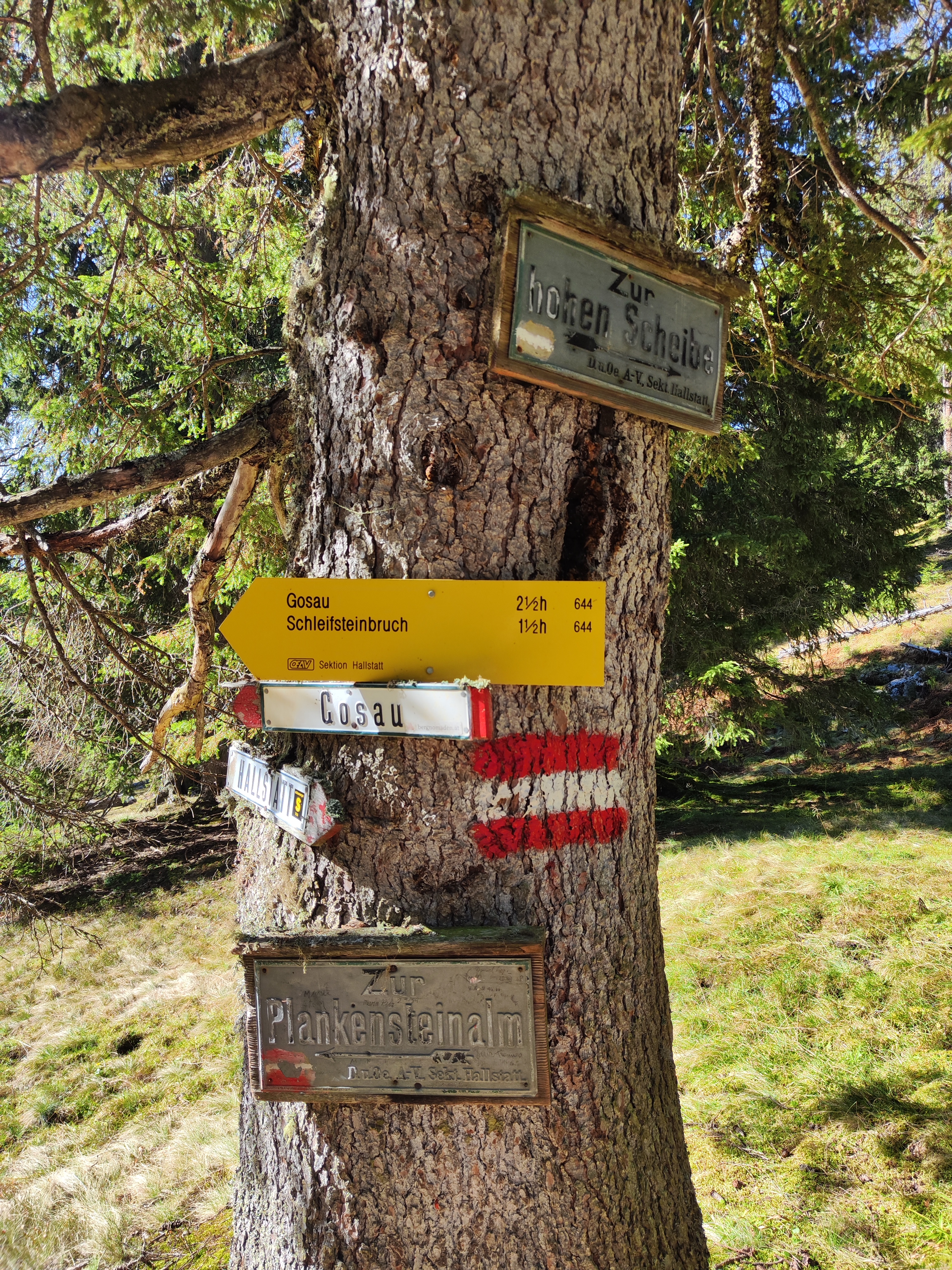 Erst folgt man links der Forststrasse noch ein gutes Stück (ca 0,5km) – dann zweigt rechts der Flugweg (ein schmaler Steig) in den Wald ab. Dieser spuckt einen bei den ersten Hütten im Almgebiet aus. Von dort führt ein kleiner, alter Steig (neue Markierungen) über weite Wiesen und lichte Lärchenwälder auf ein weiteres Almplateau – mittig drüber und dann umdrehen, der Blick ist gewaltig. Der gesamte Gosaukamm winkt. Und nicht nur der. Am höchsten Punkt wartet ein kleines Holz-Kreuz – Griass di, Hohe Scheibe 1659m (PS: GPS auf da Uhr war auf 1710m). Im Hintergrund ragt der Plassen 1953m steil auf – a andere feine Bike & Hike Tour (hier nachlesen) Rechts vom Gipfel gibt’s den Tiefblick ri Durchgangalm / Hallstatt Echerntal. Dann brauchts etwas Gespür, um den Abstieg anzufädeln, nur ab und zu entdeckt man alte Markierungen, die einen relativ linksseitig nach unten führen. Bergab bis zu einem alten Baum mit Wegweisern – hier kreuzt übrigens der Berge Seen Trail (Weg 644) und führt über die Durchgangalm 1378m & Dammwiese zum Salzberg und nach Hallstatt… Man quert dann bis zur Plankensteinalm (Hütten alle Privat & unbewirtschaftet) über Wiesen. Zeit für ein PPP – Plankenstoaalm Pofesen-Pauserl – kinnt nit besser sei (Proviant vo da Mam). Von dort via Schnittlauchkar zurück zum Radl beim Rastbankanger.