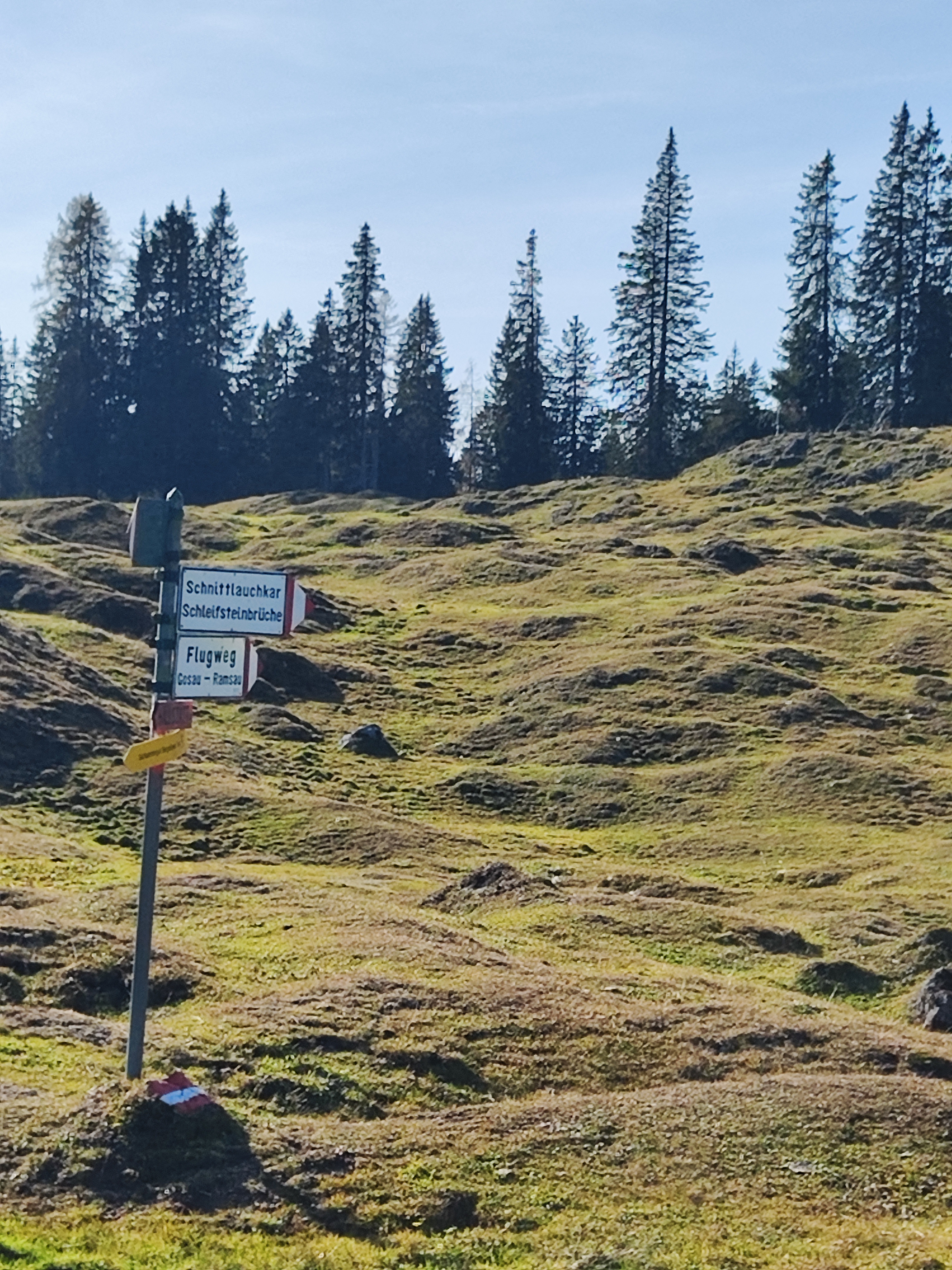 Start: Gosau Mittertal (zb PP Hornspitz) oder Hintertal – Auffahrt via Gosausee & Seekar Bikestrecke – Grubalm – Rastbankanger (Radl absperren). Zu Fuß via Flugweg aufs Almgebiet – Hohe Scheibe 1659m – Plankensteinalm 1530 (Weg 644) – Schnittlauchkar – Rastbannkanger (zum Radl). Abfahrt über Badstumhütte (hatte bis 26.10 offen) zum Startpunkt. Abstecher zur Löckermoos optional