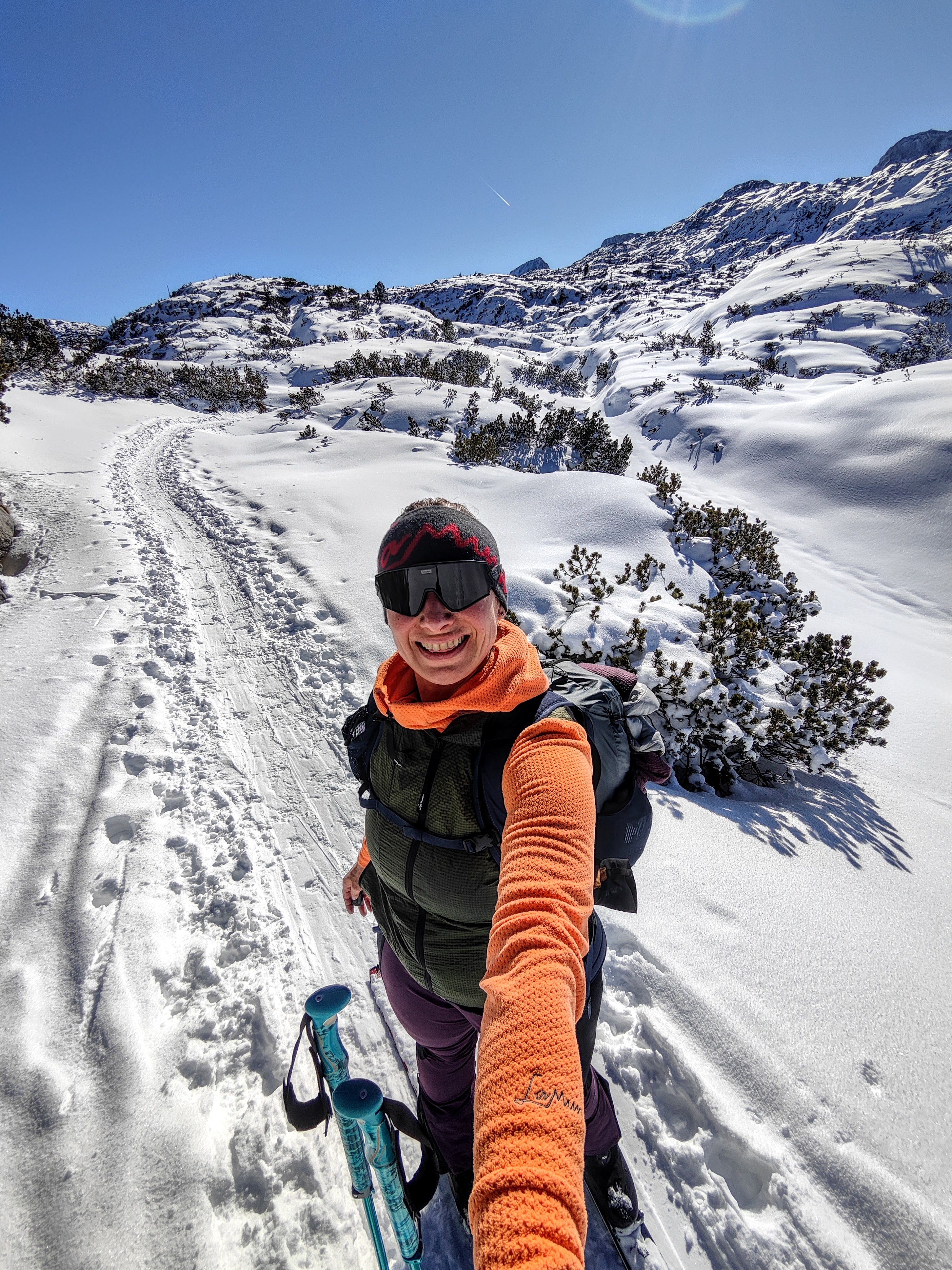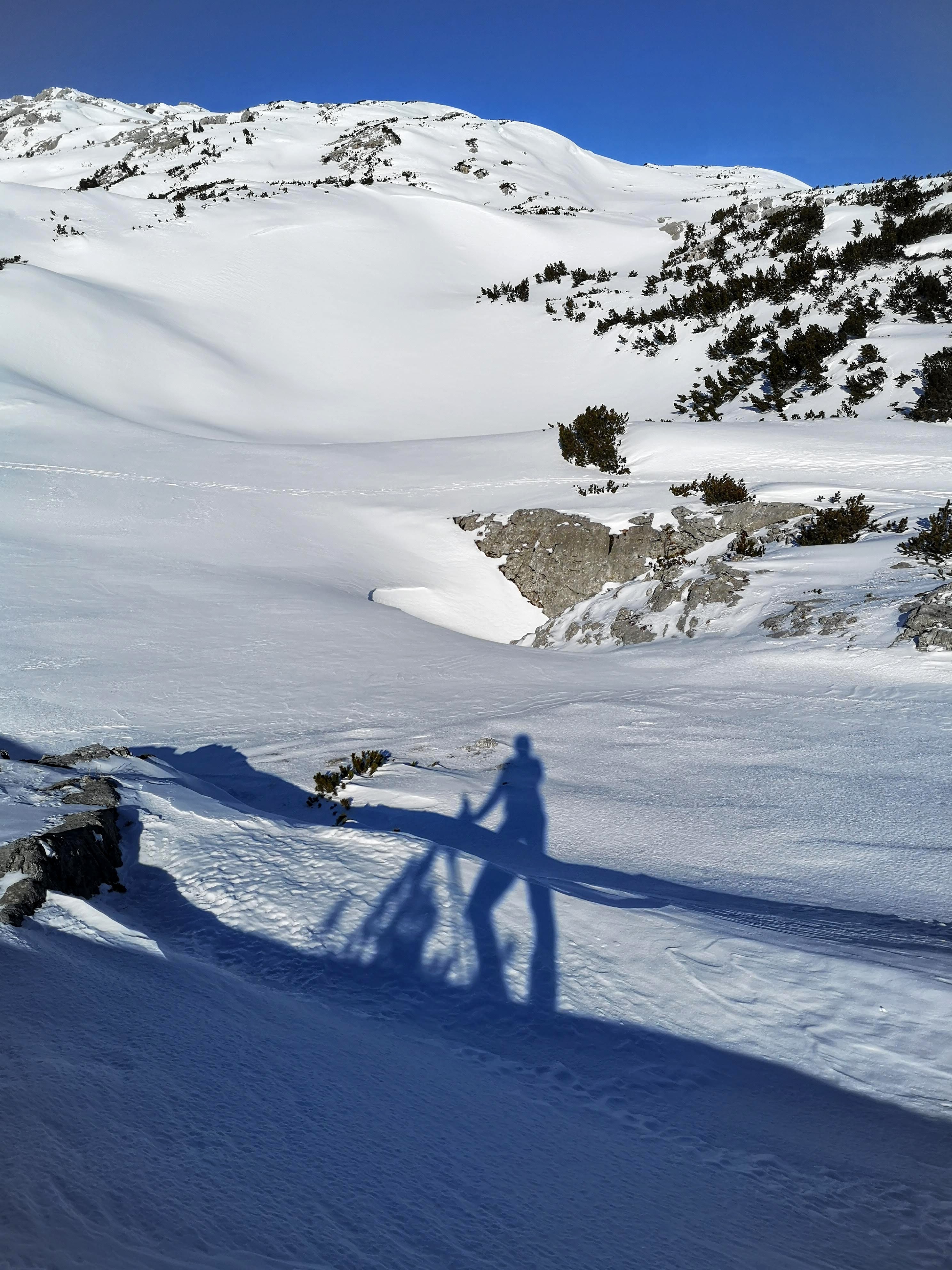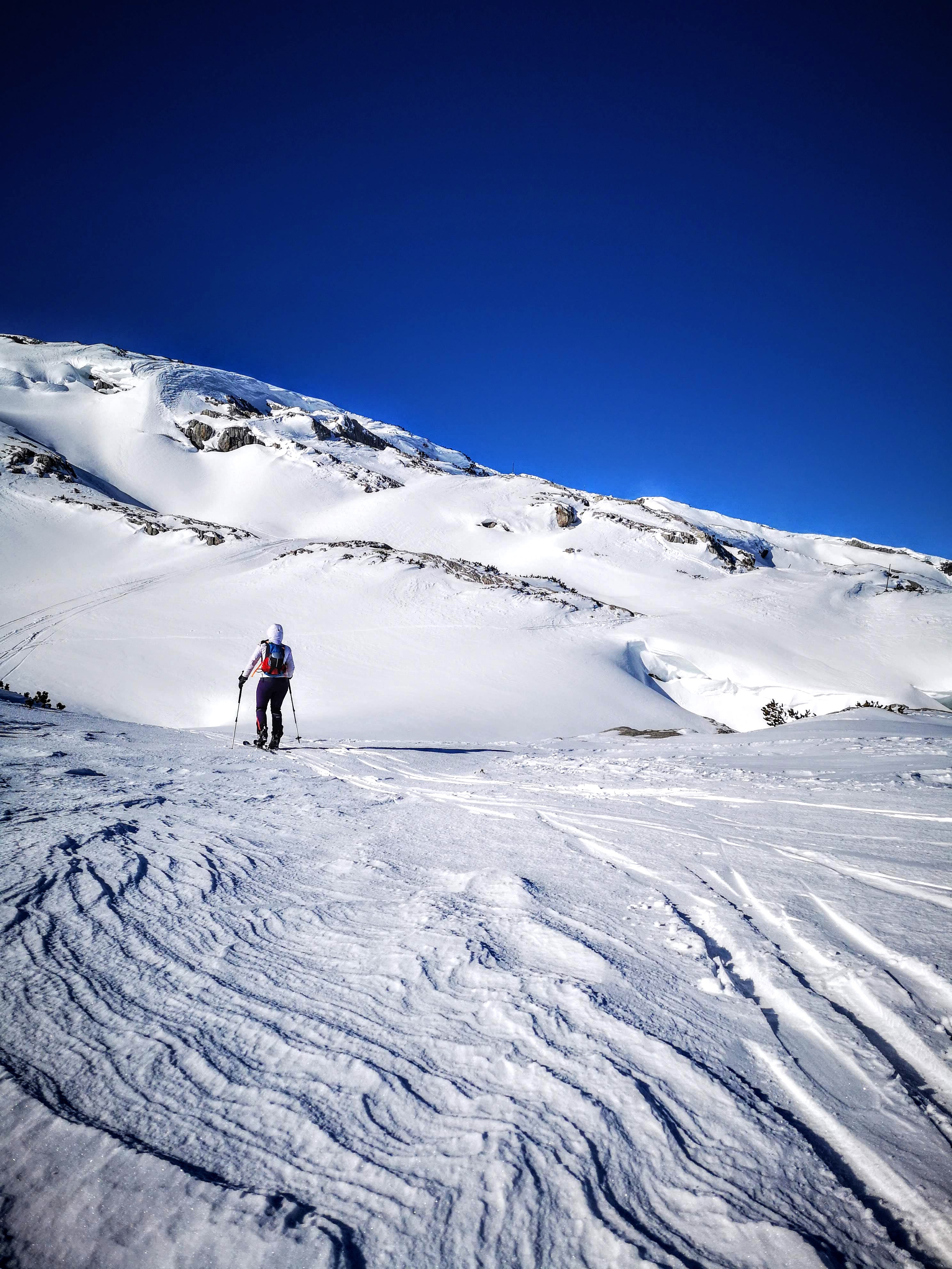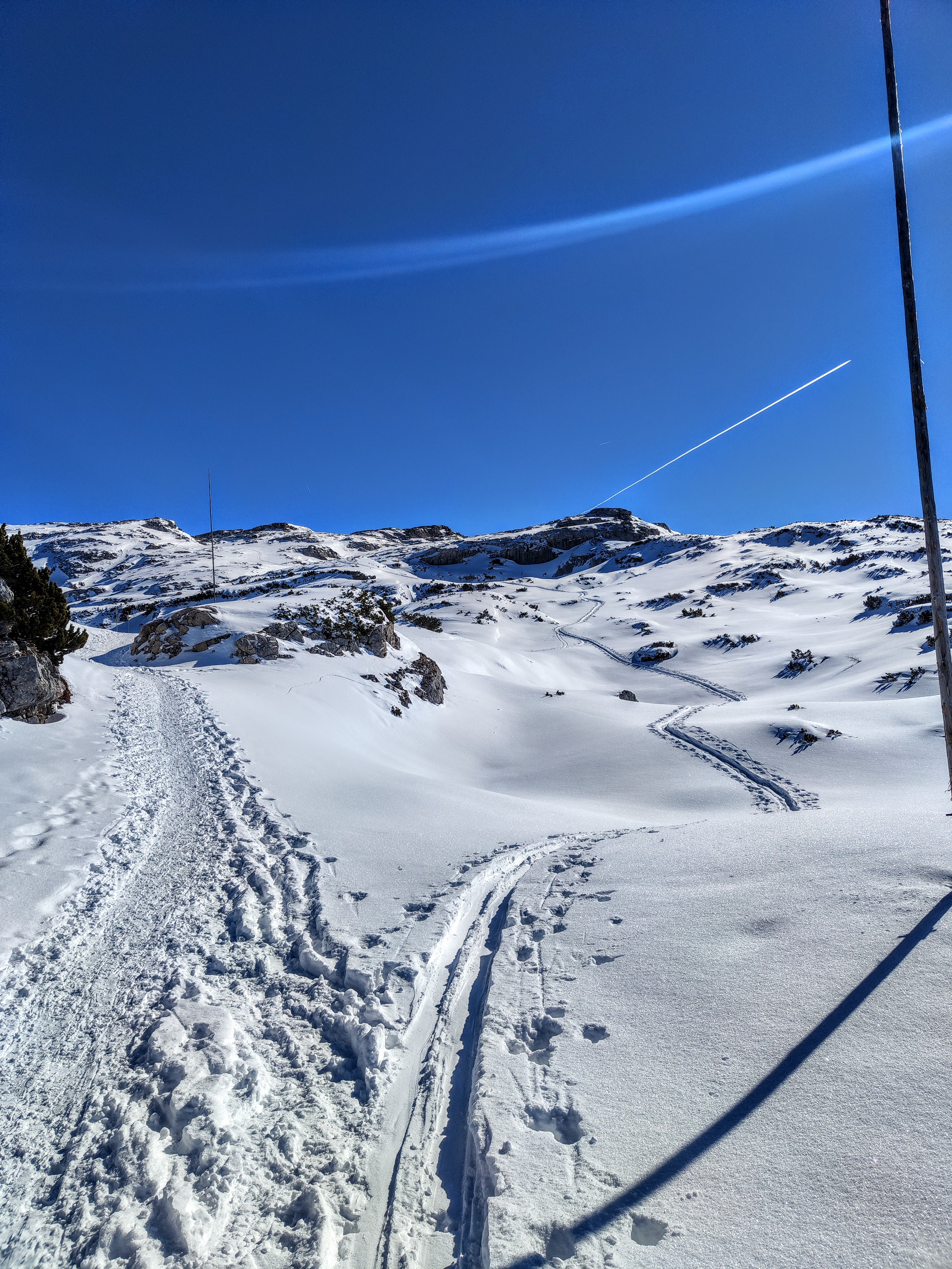 Diese Skitour ist eher ein Skispaziergang mit wenig Höhenmetern im Aufstieg und somit für Anfänger und auch für Schneeschuhgeher geeignet – allerdings nur mit der entsprechenden LVS-Ausrüstung und dem nötigen Wissen. Es handelt sich um hochalpines, ungesichertes & dolinendurchsetztes Gelände, die Runde ist nicht gespurt. Markierungsstangen weisen den Weg durch’s Auf- & Ab im Karst-Labyrinth. Nur bei stabilem Schönwetter empfehlenswert – am Plateau kann’s schnell ungemütlich & nicht nur bei einem Wettersturz gefährlich werden!