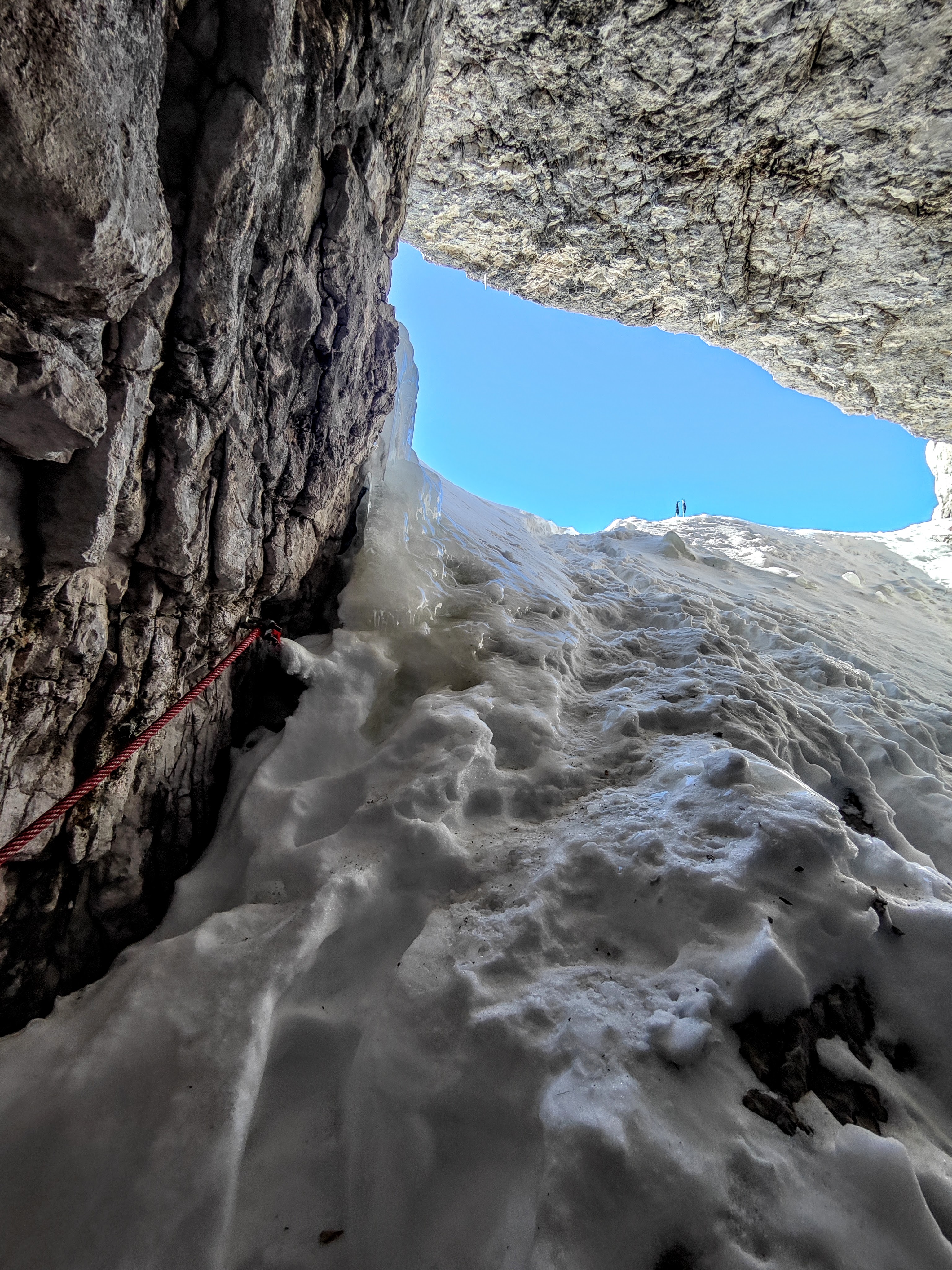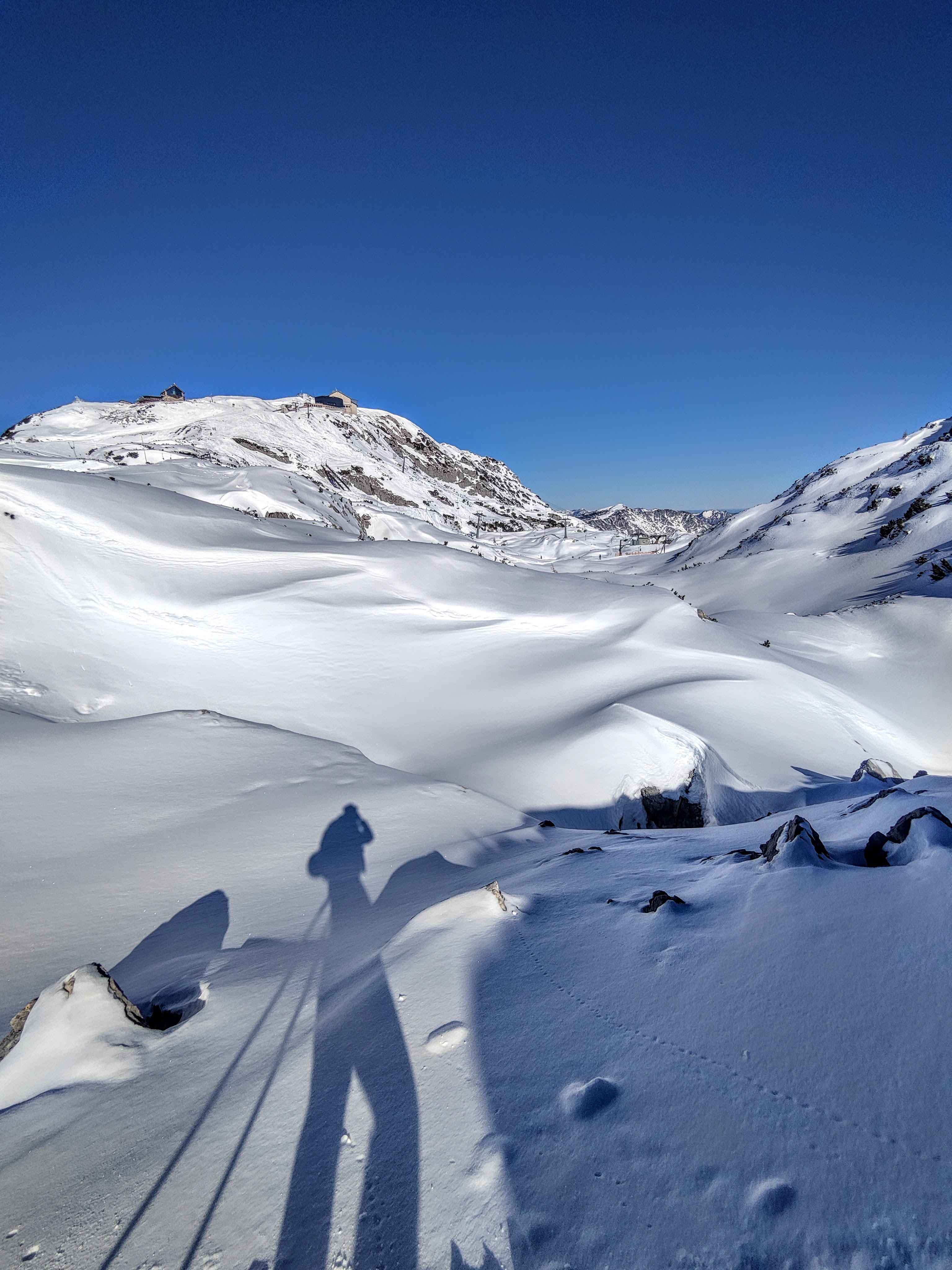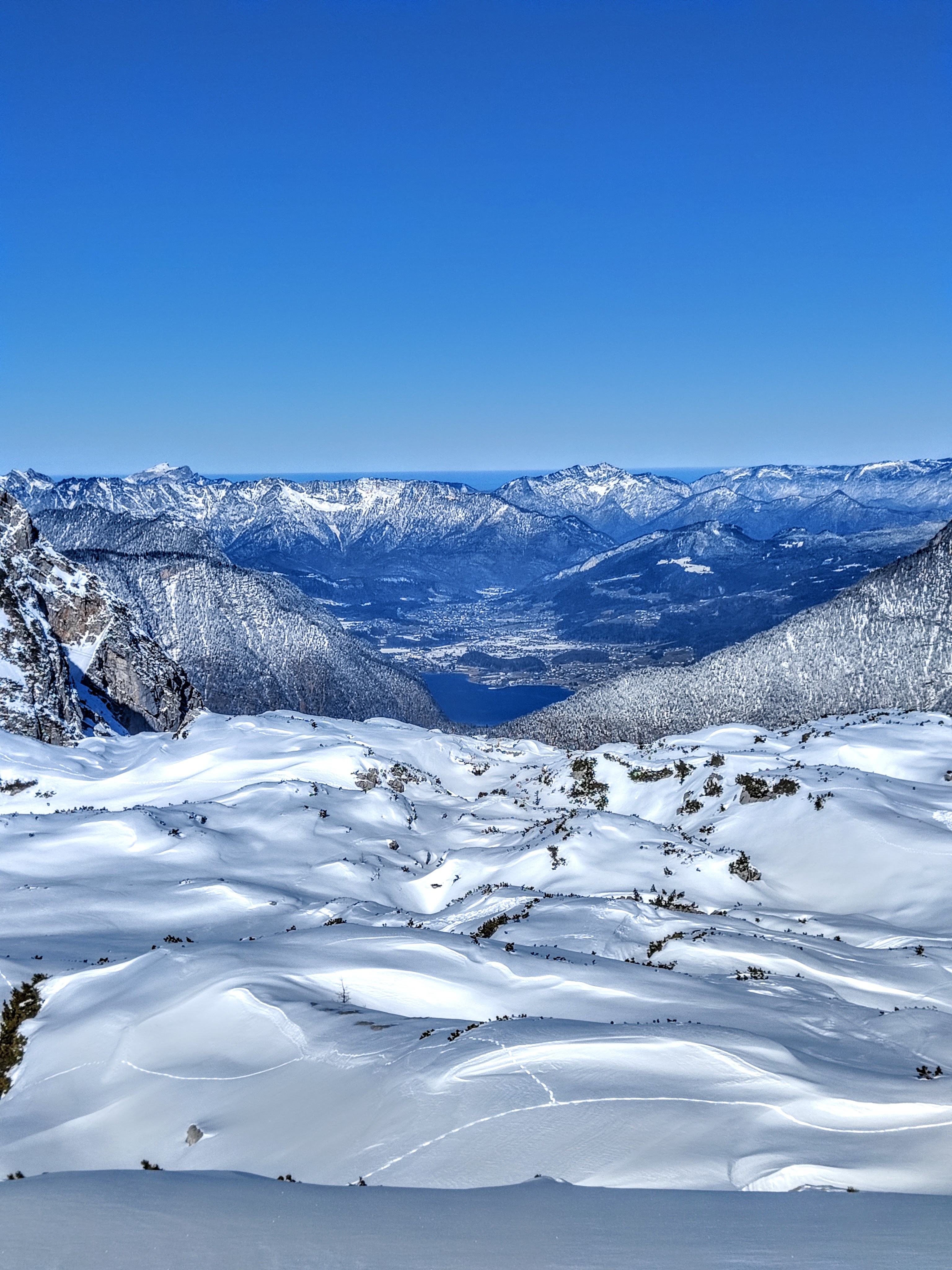 Beim alternativen Weg über das Margschierf 2080m sieht man beim Blick zurück zur Krippenstein Bergstation die Welterbespirale und auch die kleine Heilbronnerkapelle blitzen. Die alten Wegmarkierungen (Eisenstangen) im bieten meist nur einen groben Anhaltspunkt. Die Wegführung muss den Schneebedingungen (abgeblasen oder eingeweht) angepasst werden. Normalerweise kann man vom höchsten Punkt des Margschierfs fast bis zum Heilbronner Kreuz abfahren – im Februar 2024 nicht. Ab hier musste man genau schauen, wie man quert, welche Wächten man umgeht und staunen, wie viele Dolinen weit offen sind.