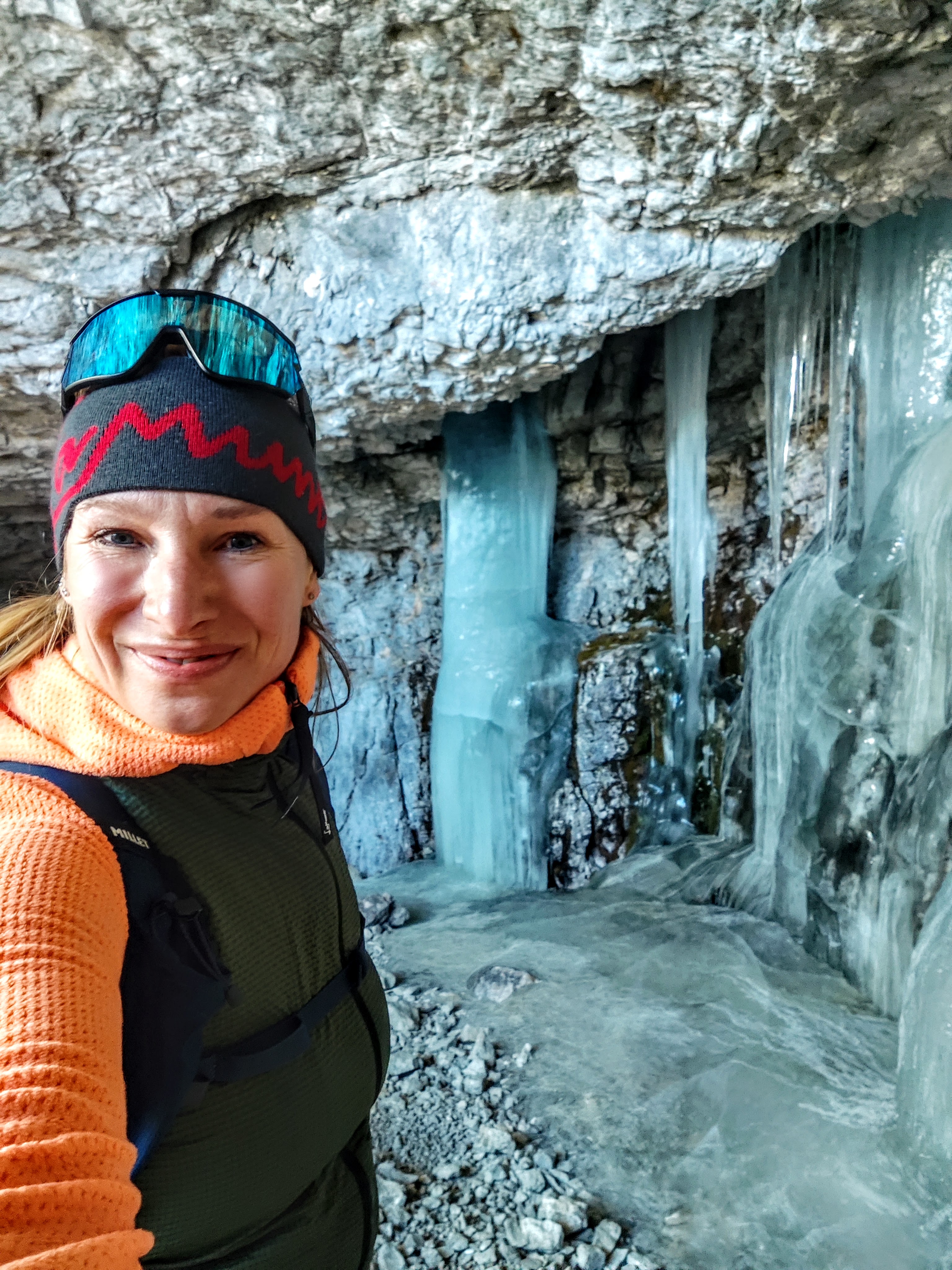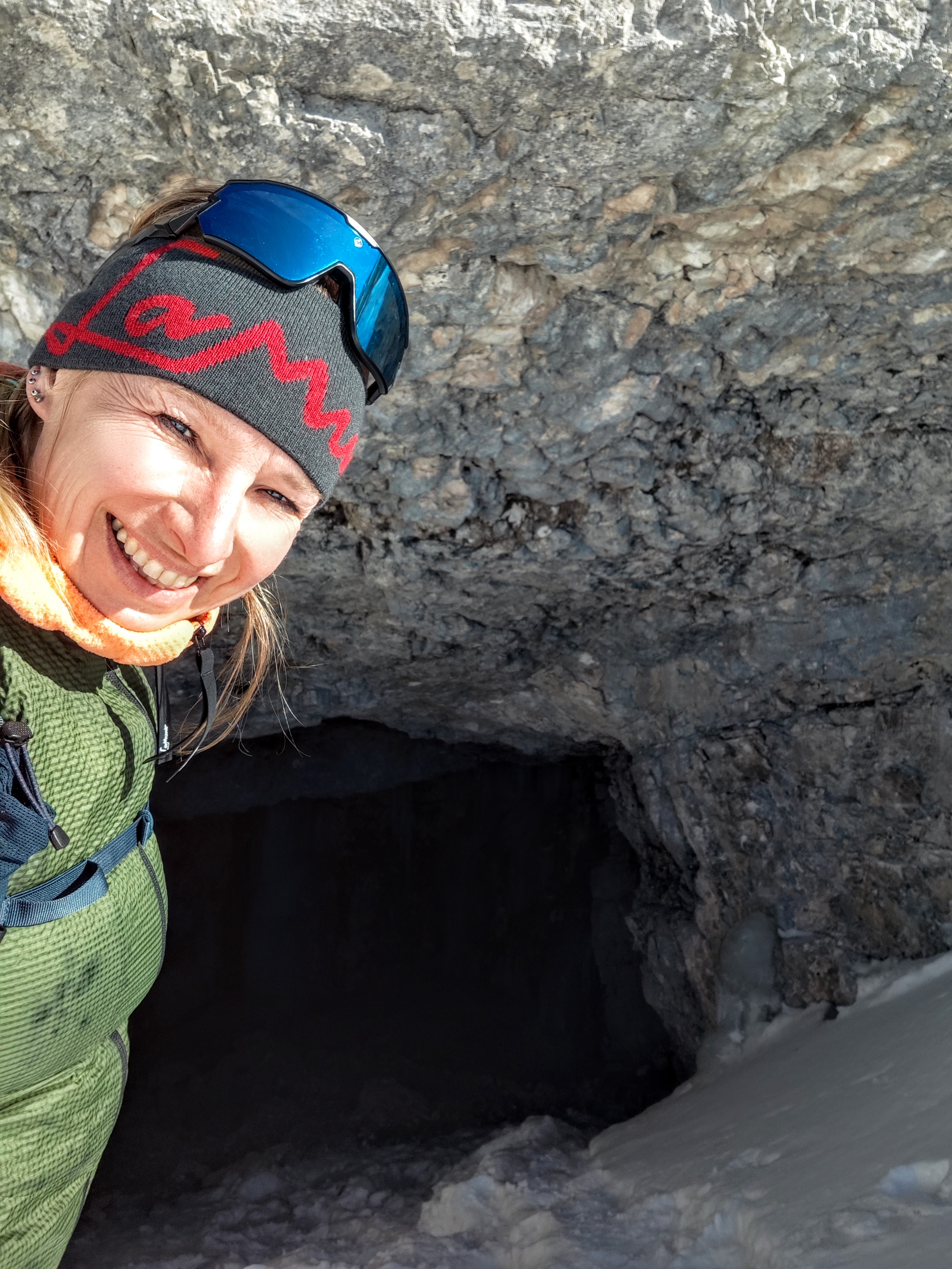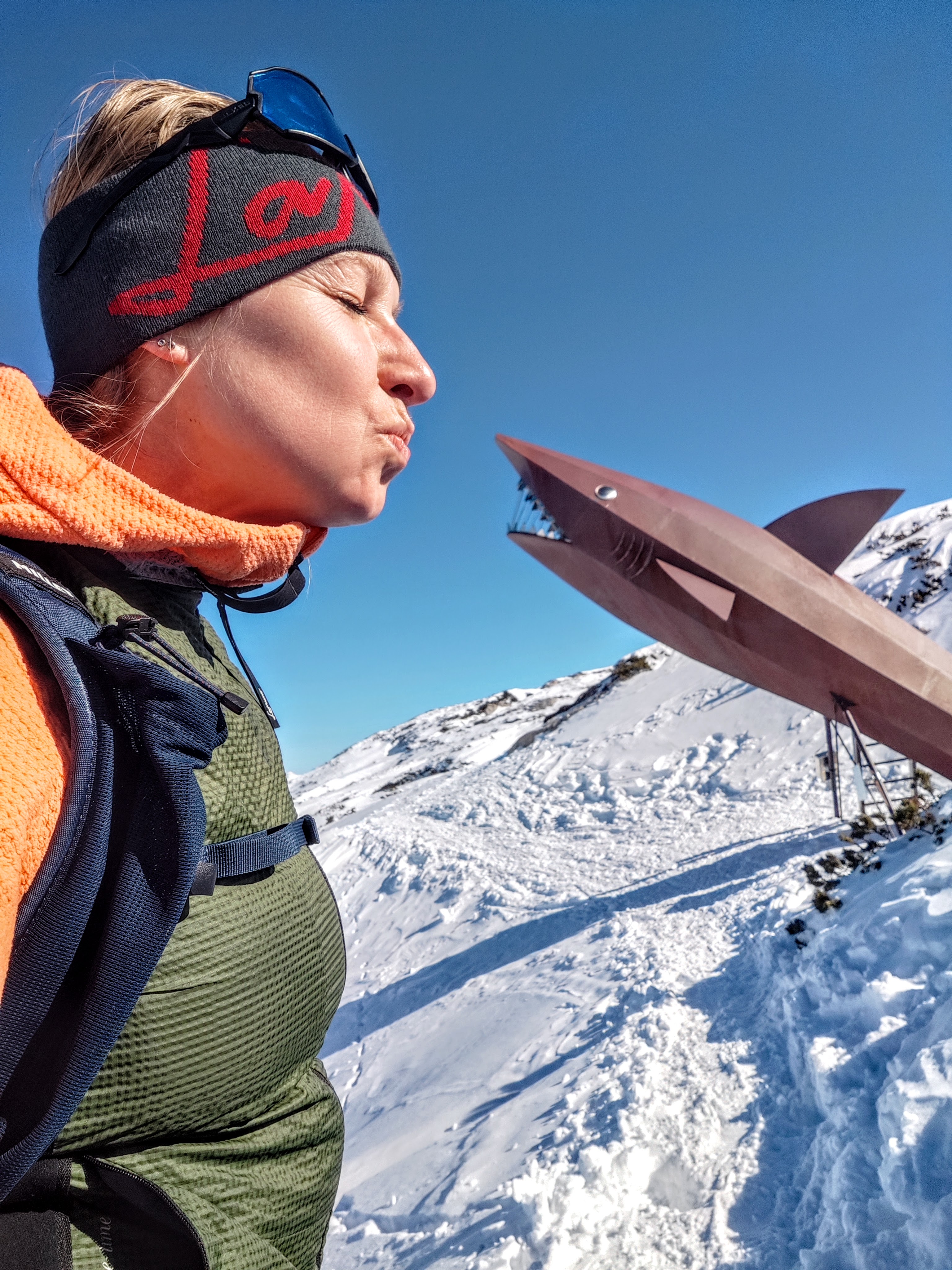 Kurzer LVS-Check am Automaten (leider 2025 nicht mehr vorhanden, steht nähe Gjaid Station) und dann erstmal genüsslich gute 100hm über die Piste owi sausen, vorbei am Schlepplift, ins freie Gelände fahren. Auffellen und mit Abstecher zur kleinen Krippenstein-Eishöhle auf der Vorderseite des Margschierf immer Richtung Dachstein Hai. Das 8m lange Monstrum aus Stahl steht aus gutem Grund da. Der Urzeit-Hai war schon immer da, ist Teil der prähistorischen Vergangenheit des Dachstein Massiv. Im August 2013 wurde er aus dem Hallstättersee geholt (wo er zuvor für Patina versenkt wurde) und mit einem Hubschrauber hochgeflogen. Ab verlassen der Piste beginnt das ungesicherte Gelände, nur Schneestangen weisen den Weg zum Kreuz mit der traurigen Geschichte. An diesem speziellen Platzerl verunglückte 1954 eine 10 köpfige Schülergruppe inklusive 3 Lehrern aus Heilbronn im Schneesturm tödlich. Die Geschichte bleibt präsent – teile sie am Ende des Beitrags. Links und rechts tiefe Dolinen, das typische Auf- & Ab im Karst. Aufgetürmte Wächten… das hochalpine Karst-Gelände am Krippenstein Plateau sieht immer anders aus. Ungesichert und niemals zahm. Nur eines bleibt gleich: wer es unterschätzt, bleibt eventuell für immer dort.