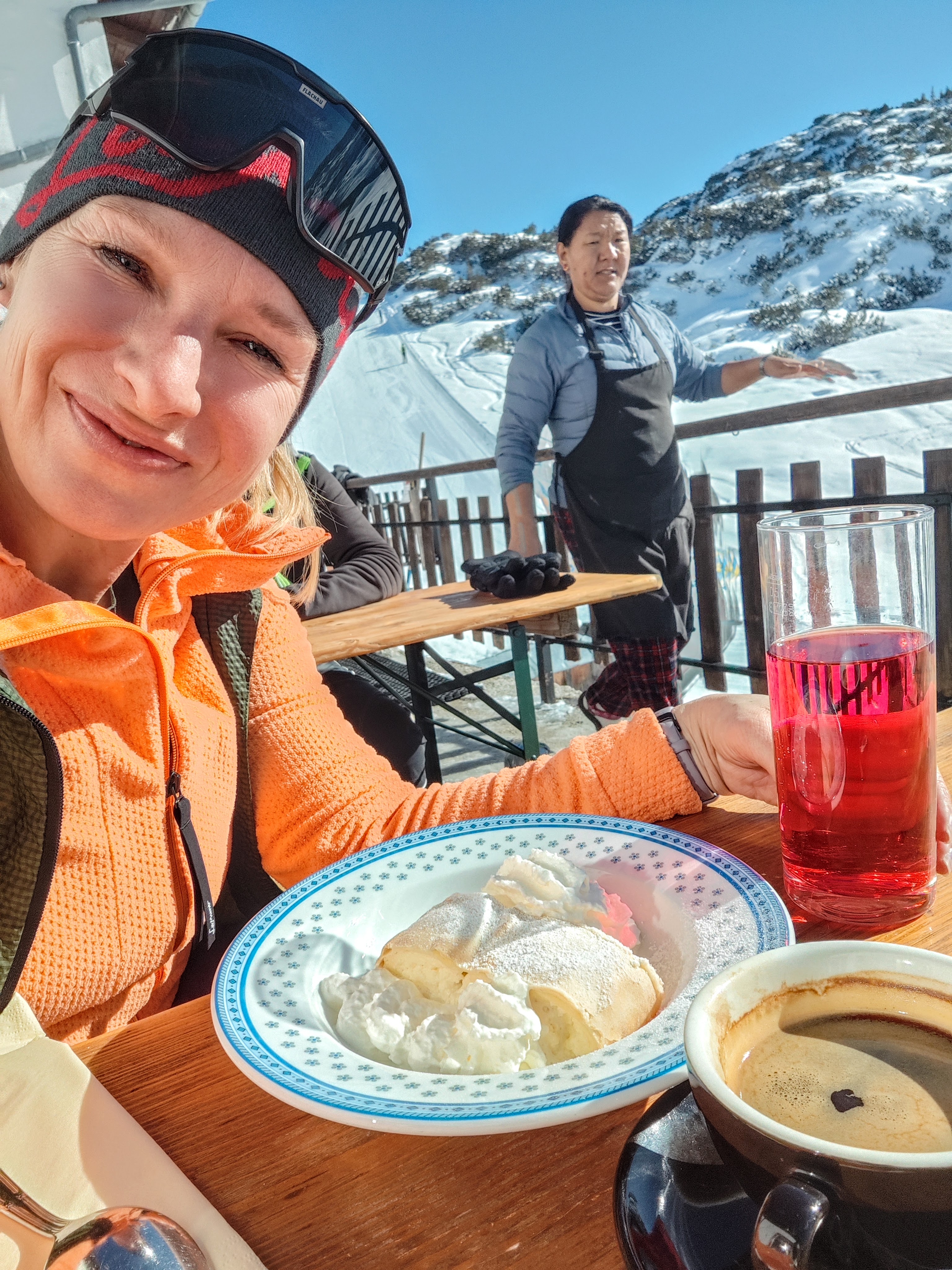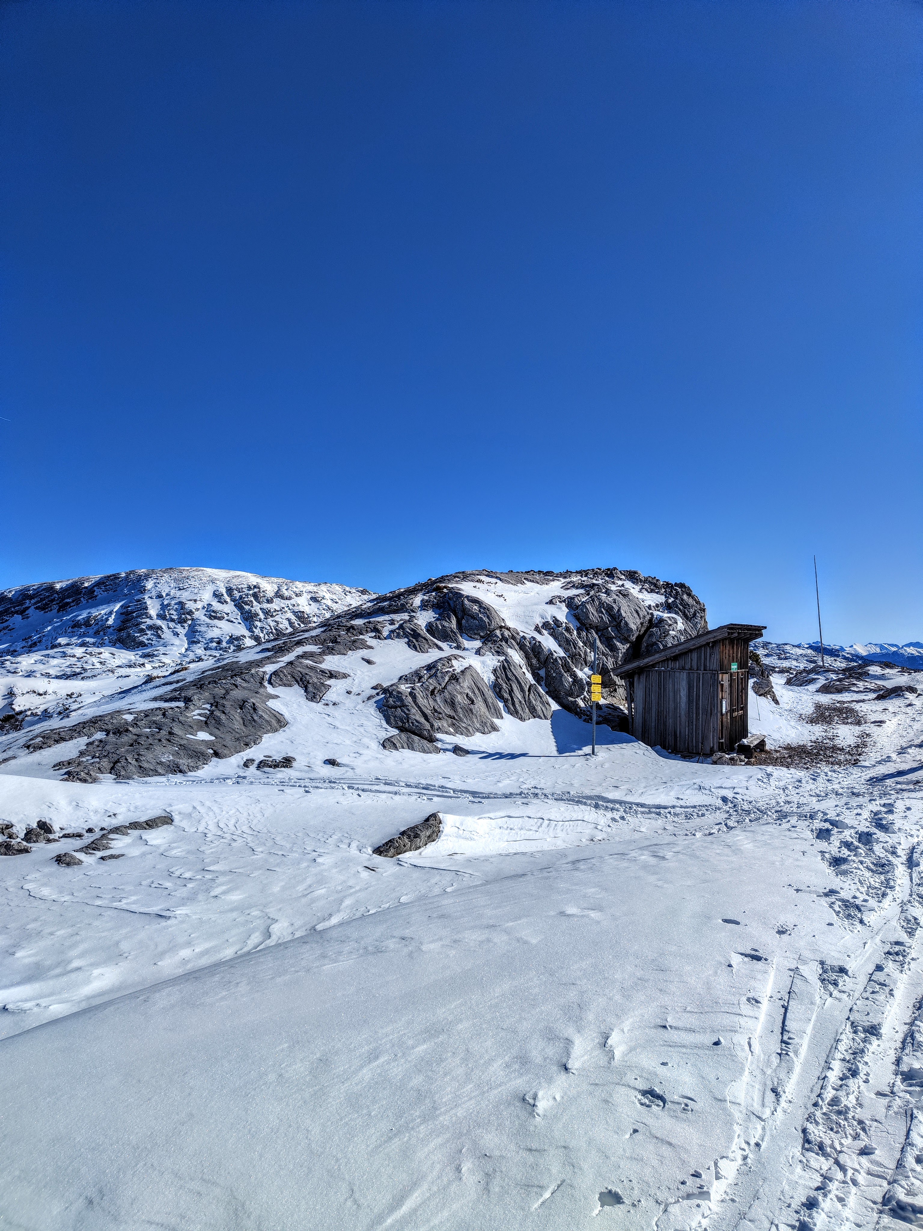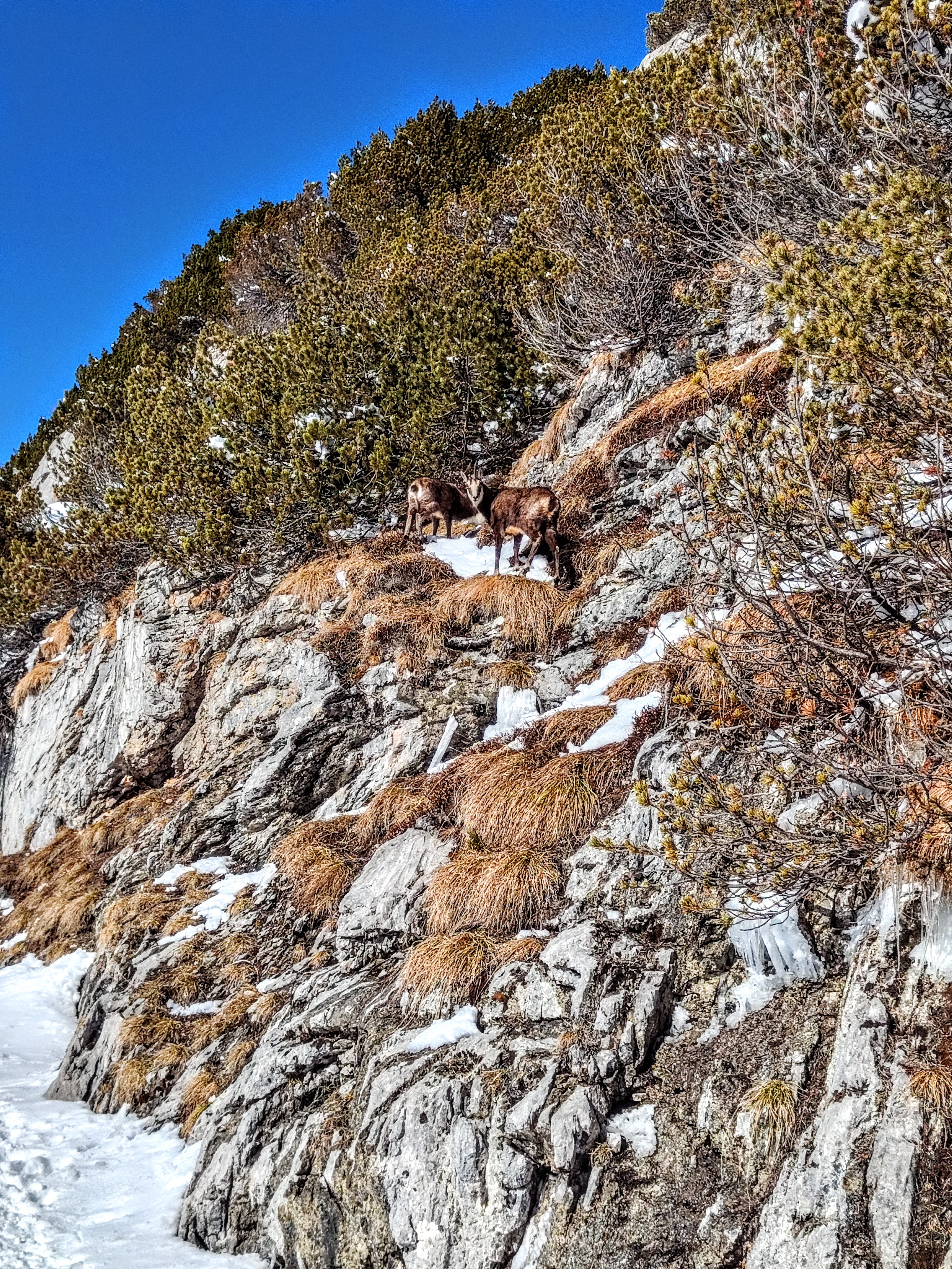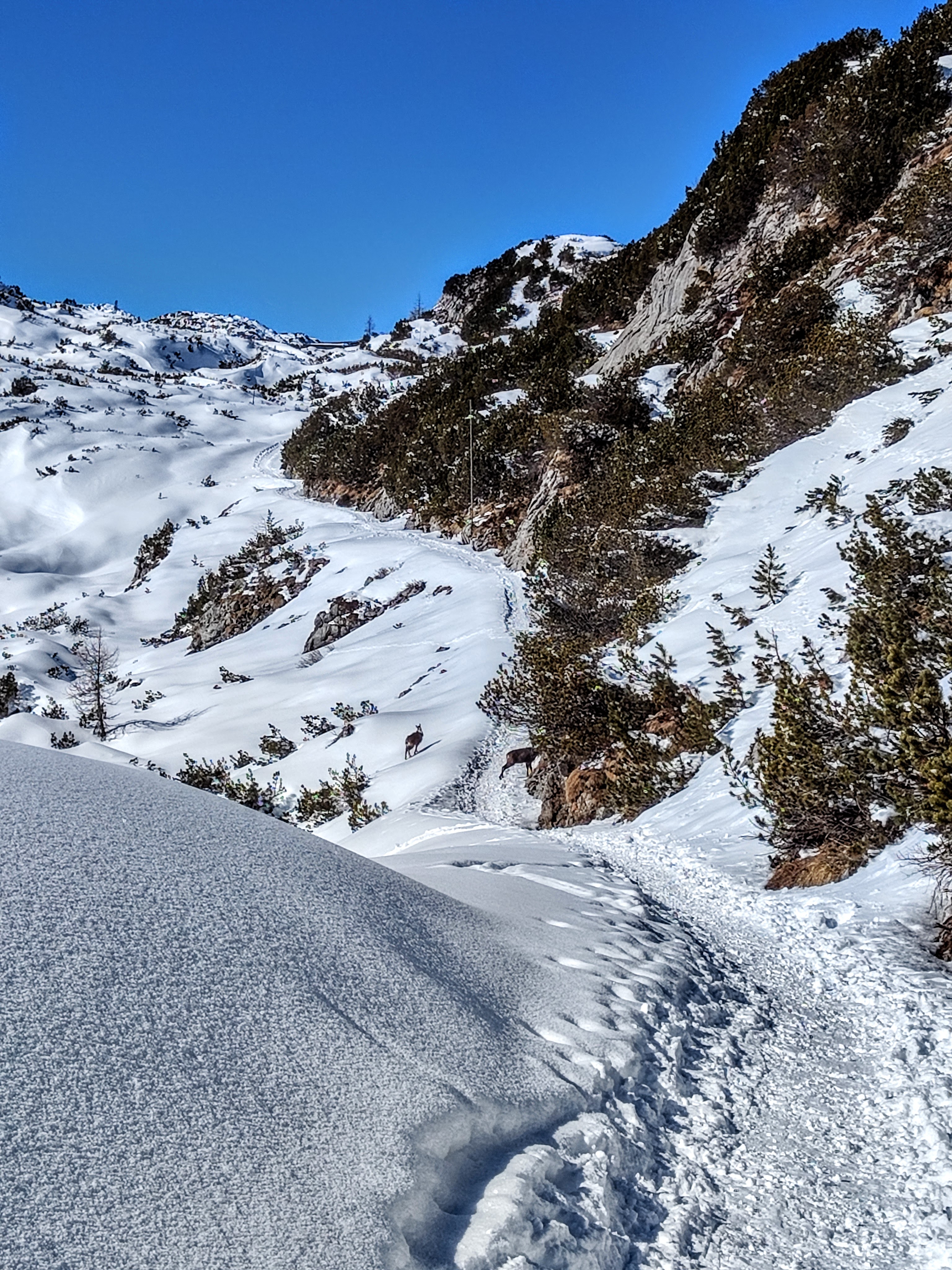 Über die Unterstandshütte 3 führt der Weg ins weitläufige Plateau – der Dachstein zum greifen nah und doch so weit weg. Ein stetes Auf- und Ab im Karst. Das erste Bild zeigt, wie wichtig es ist, nur bei perfekten Sichtbedingungen am Plateau unterwegs zu sein! Links und rechts warten Geländefallen. Verschlechtern sich die Bedingungen signifikant (was durchaus schnell mal vorkommen kann da oben) sollte man darin Schutz suchen, abwarten oder die Situation evaluieren. Eine gute halbe Stunde übers Plateau erreicht man dann die Unterstandshütte Nr. 4 – sie steht an der Sommer-Abzweigung ins Hirzkar bzw zum Hirzkarseelein und ist einigermassen eingeschneit. Gut, dass die Lawinenschaufel sowieso samt LVS-Equipment dabei sein sollte bei dieser Skitour… auch zum ausgraben von Eingangstüren geeignet. Dann geht’s durchs Tal der Baby-Lawinen-Schnecken (2024) – ein erster Blick auf die Kaserne Oberfeld und die Gjaidstation unterhalb… a kurzes Stückl zum abfahren. Lohnt sich aber nicht, dazu abzufellen weils direkt danach eh weiter geht mit auffi, owi, auffi. Anders dieses Jahr am 19. Februar 2025: kurz nach der Unterstandshütte 3 lohnt es sich abzufellen – diese Passage fast bis zur Unterstandshütte 4 ist aufgrund der Schneelage dieses Jahr fast durchgängig abfahrbar – nur a bissi bei den Engstellen auf Felsen & sonst auf Latschen achten! Und noch etwas ist diesesmal anders – zwoa Gams (Mutter mit Jungtier) geben sich die Ehre – und nach minutenlangen beobachten, drehen sie den Spiess um und schauen mir beim vorbeigehen zu. So vü liab! Und durchs langsame annähern stresslos für alle Beteiligten. Siagt ma a nit oft. Ab dem Punkt ist es dann nimmer ganz so weit zu Kaffee & Topfenstrudl beim Sonnenpauserl auf der Gjaidalm (verdient).