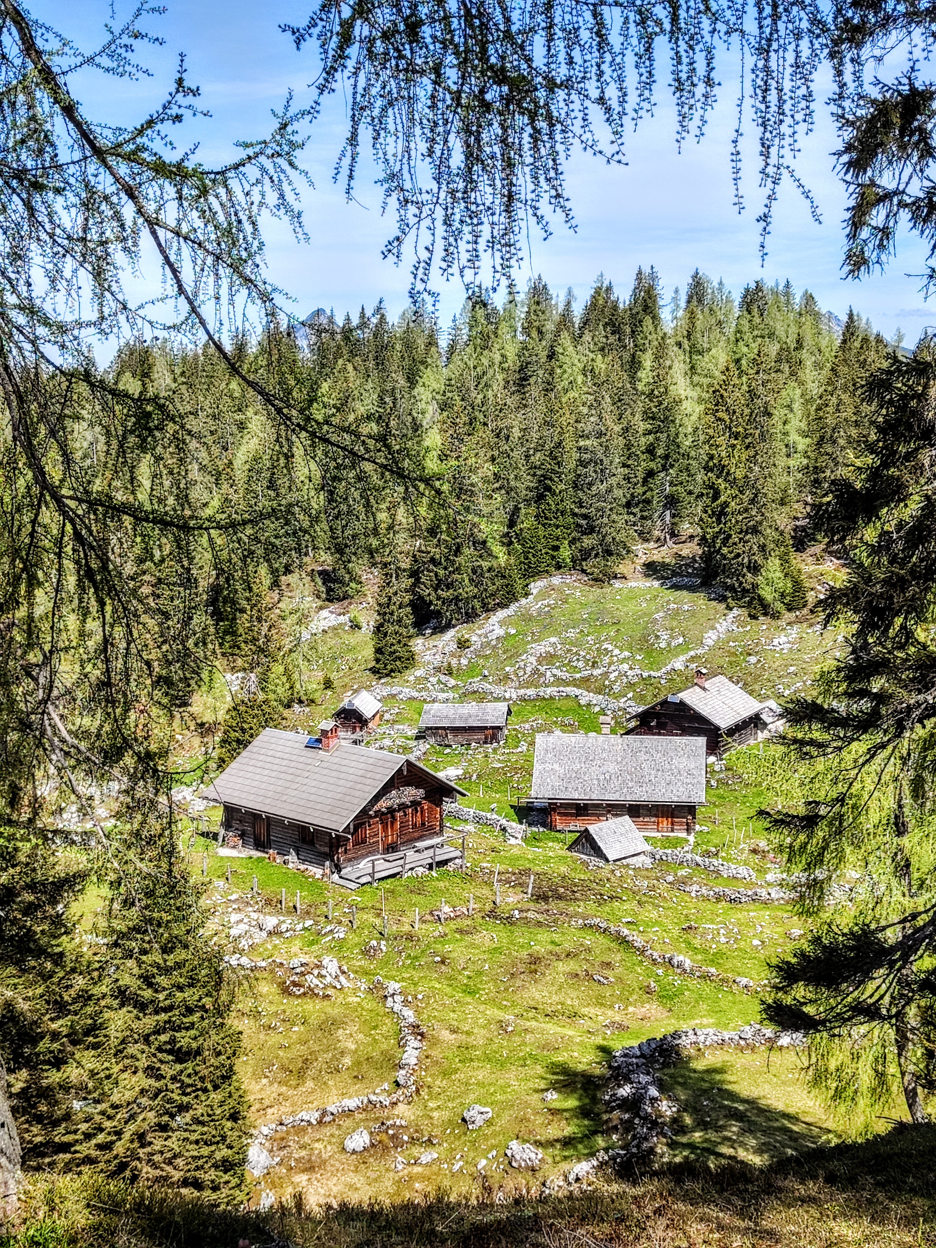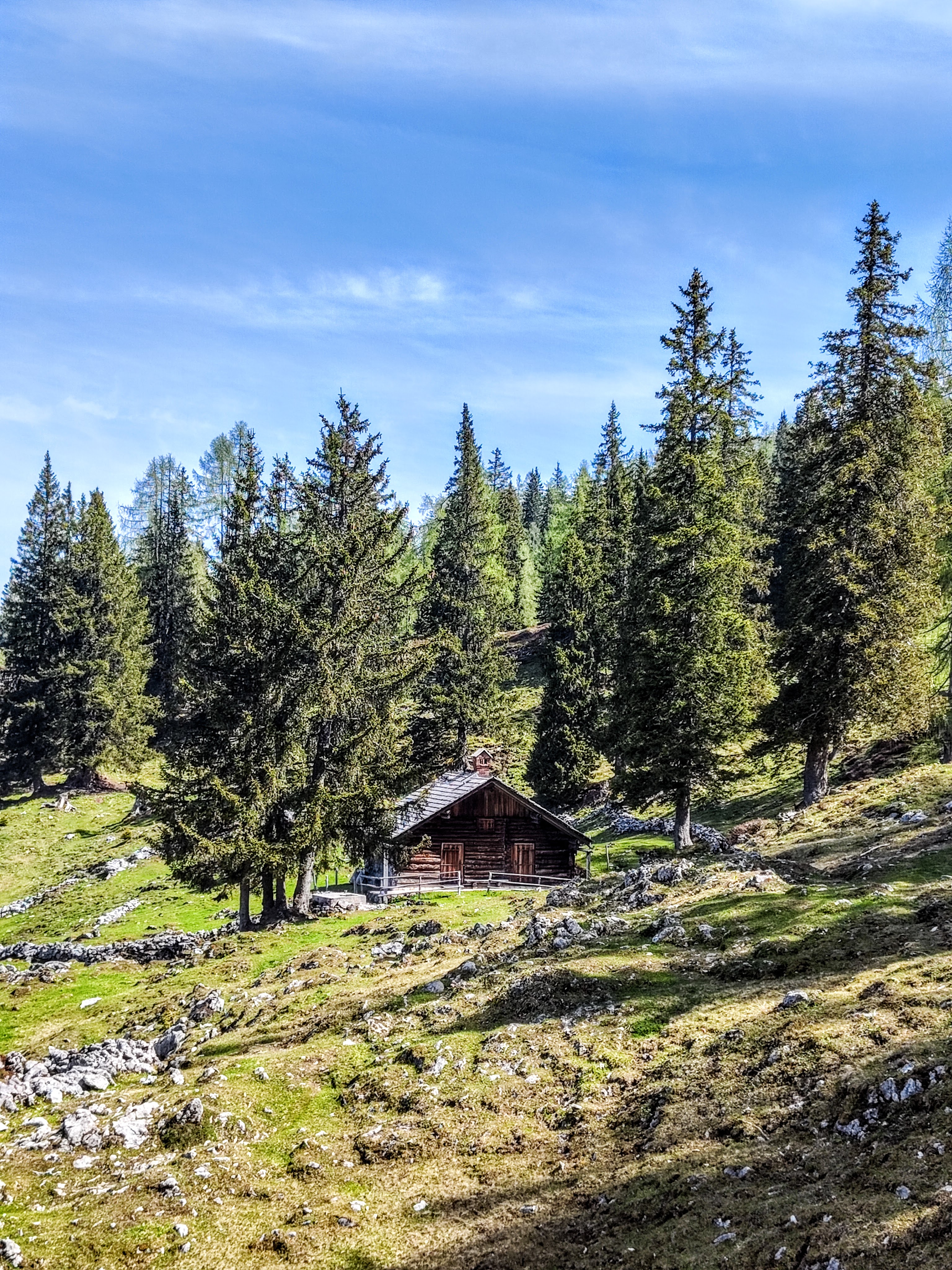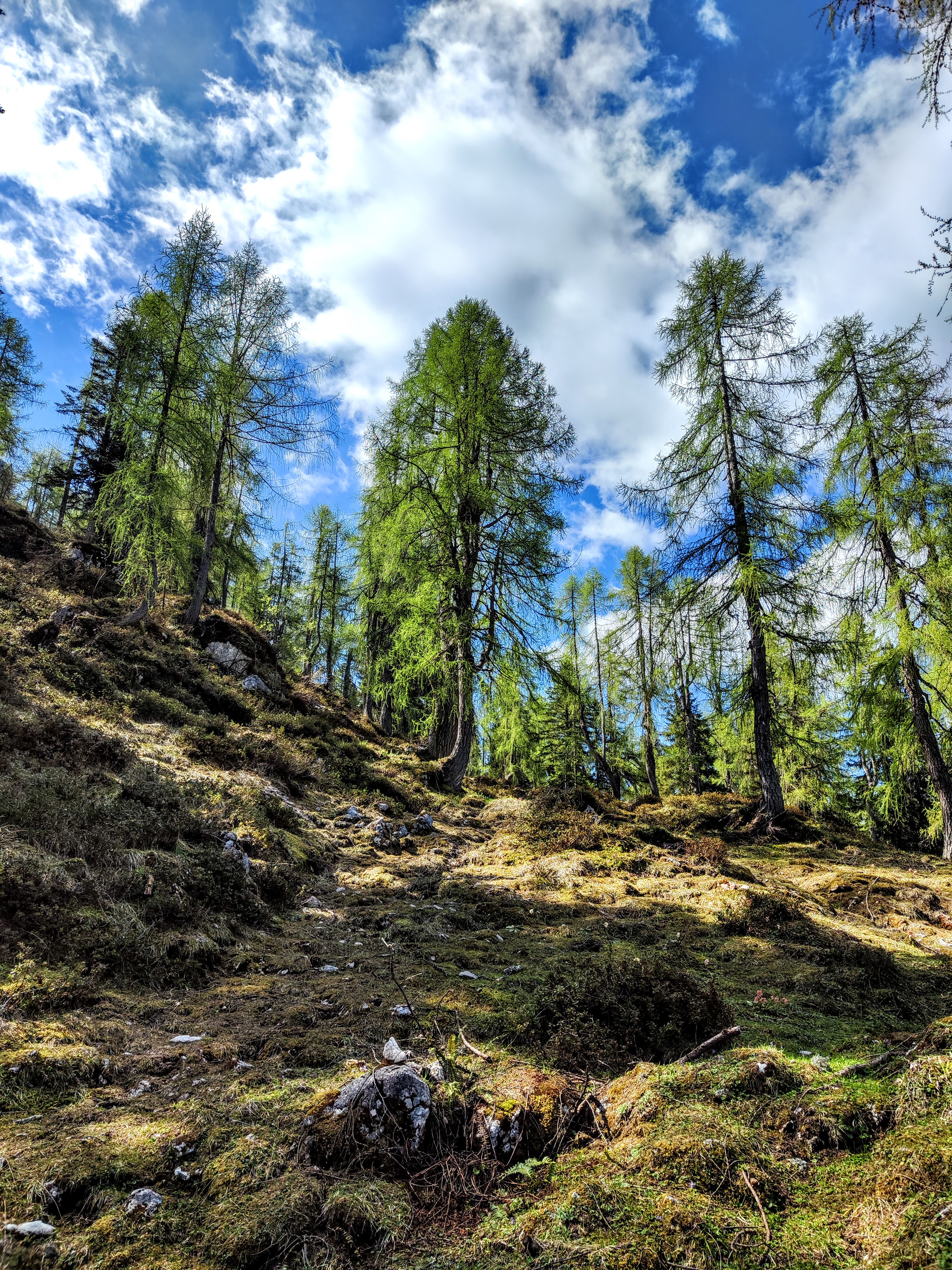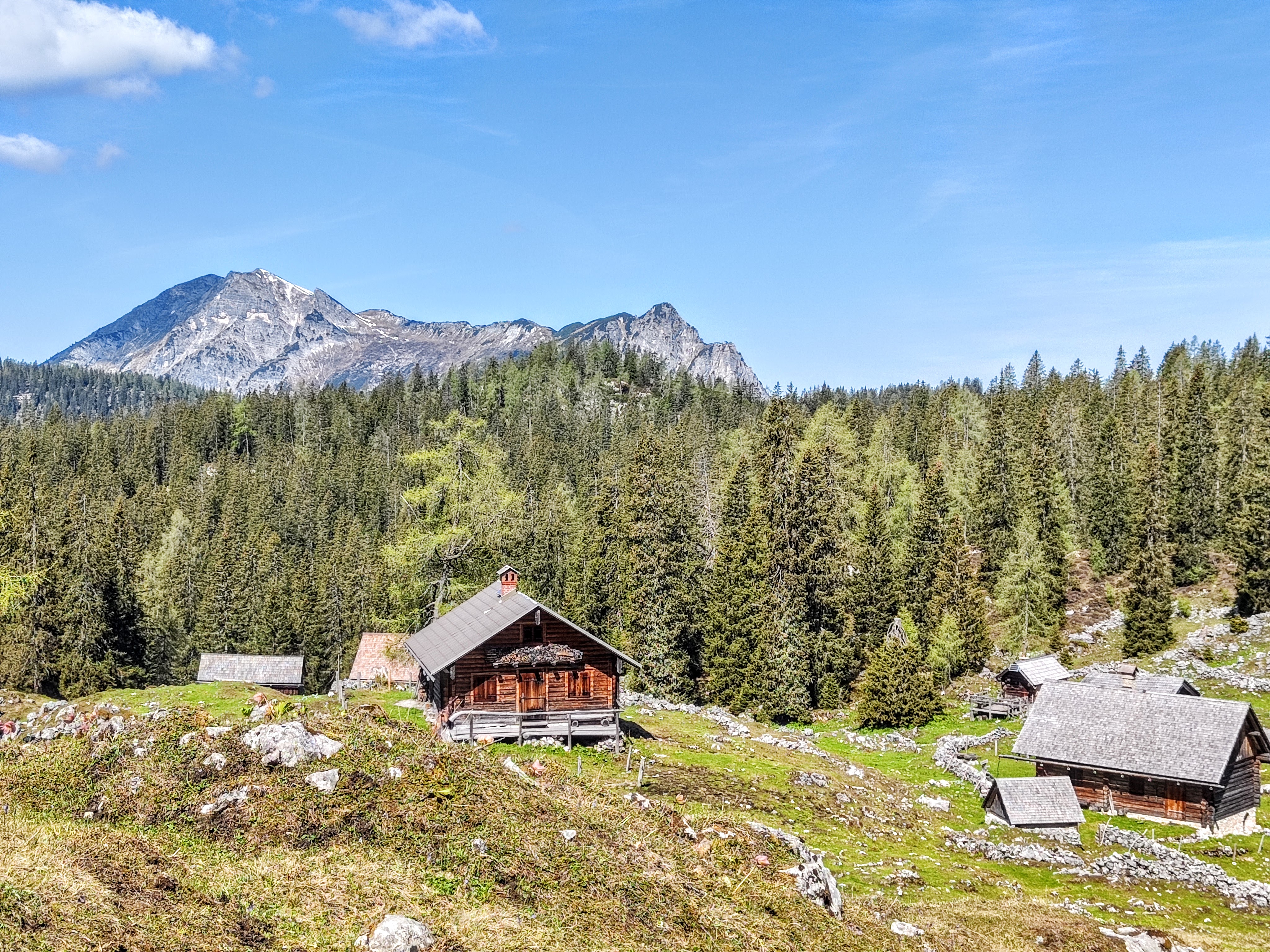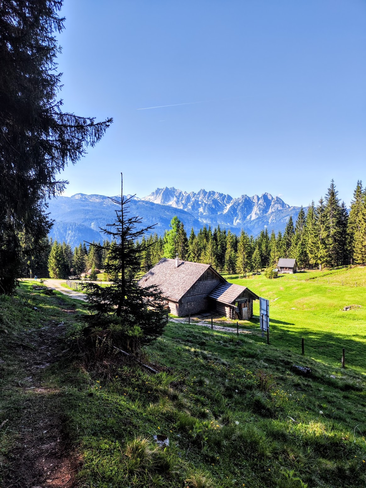Im Gosauer Ortsteil Ramsau führt der Aufstieg zur Iglmoosalm fast komplett durch den Wald. An der Hütte angekommen (im Juni Fr-So. bewirtschaftet, ab 1. Juli täglich) sonnt sich im Hintergrund der Gosaukamm im Morgenlicht… an dieser Stelle hat ma übrigens schon gut 500hm auf 3,3km in den Haxn. Bei meiner Tour war die Iglmoosalm leider noch zu – also statt Frühstücken direkt hinter der Hütte den Wanderweg weiter bergauf. Den Panorama-Ausblick nachm Iglmoos auf Höhe der Roten Wand zum Dachstein & Gosaukamm hat man sich schon verdient. Nach einem kurzen Forstrassenabschnitt für der Weg über eine felsige Abkürzung und wieder auf die Strasse, bis es rechterhand dann wieder auf kleinen Steigln durch den Wald, in die Saugrube (kann ma wer sagn, wieso de so hoasst?) und weiter bis zur nächsten Wegkreuzung mit uralt Schildern geht…