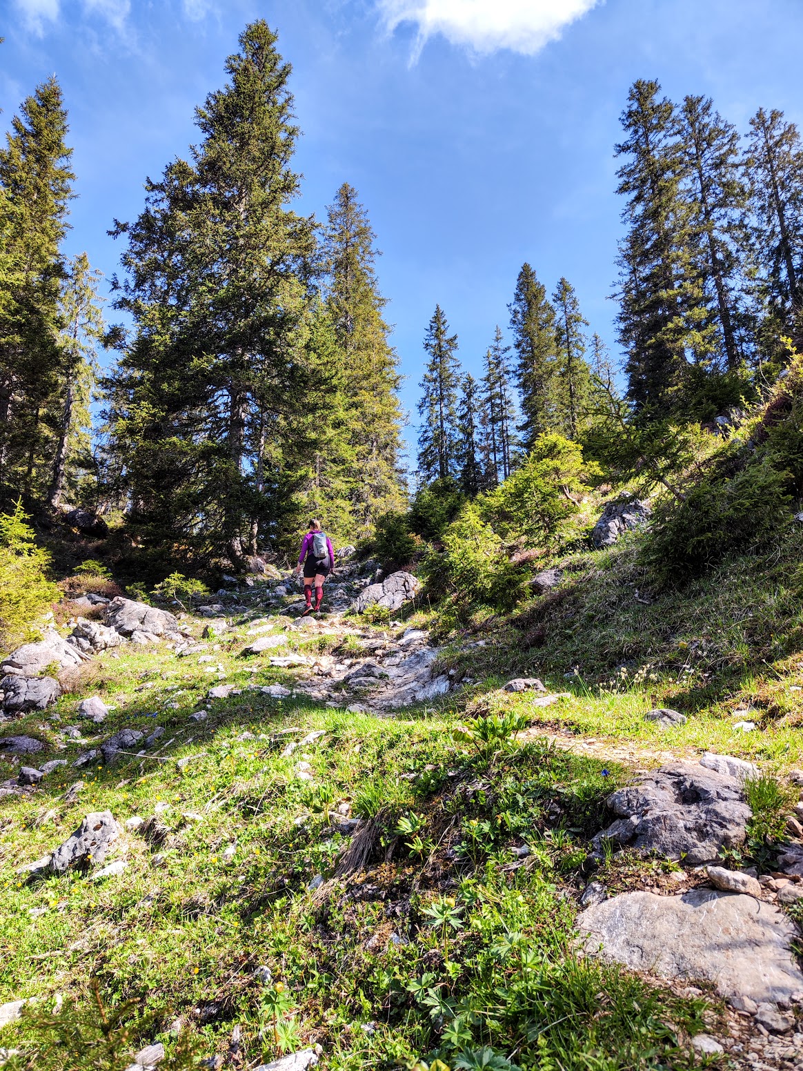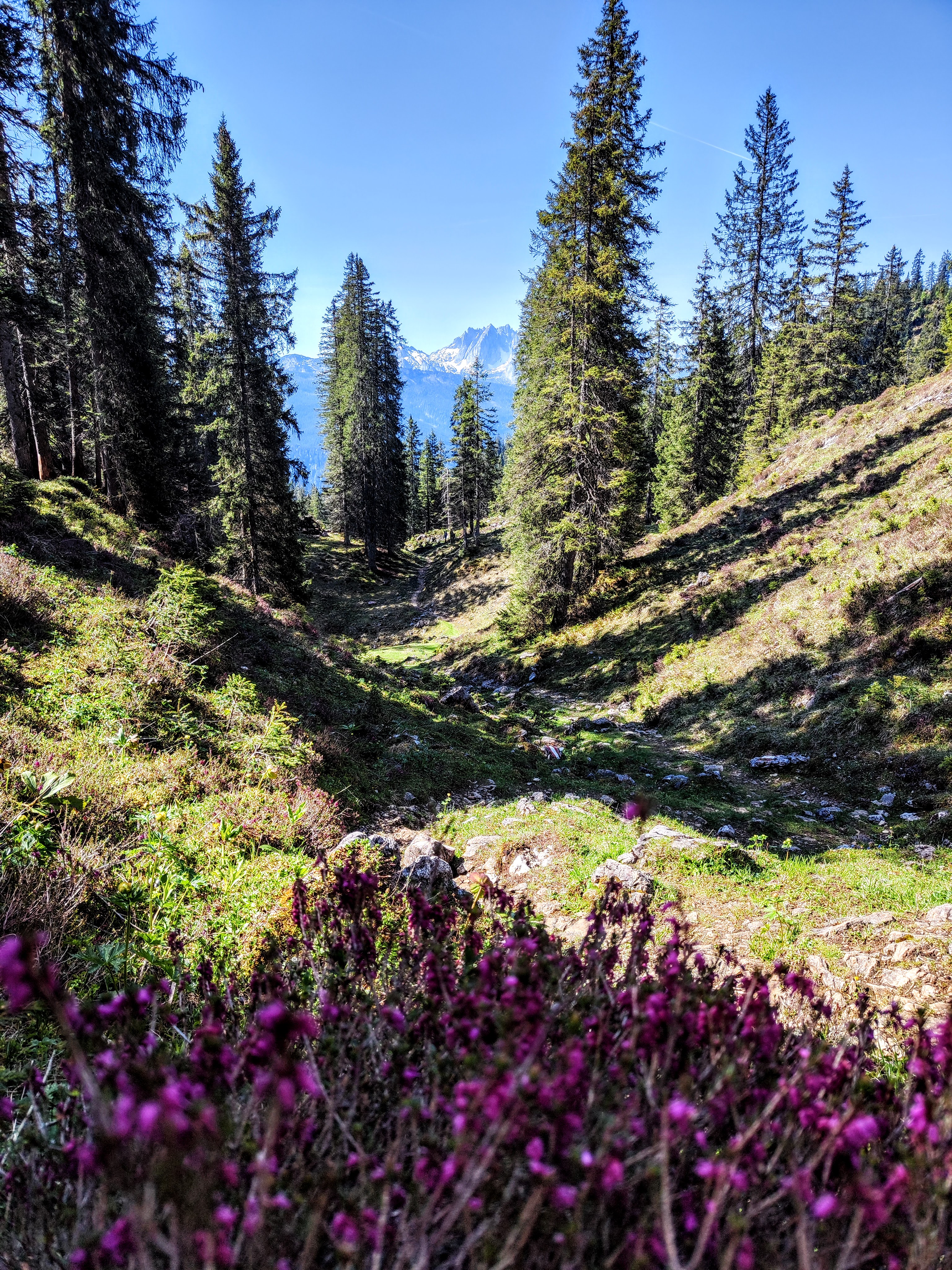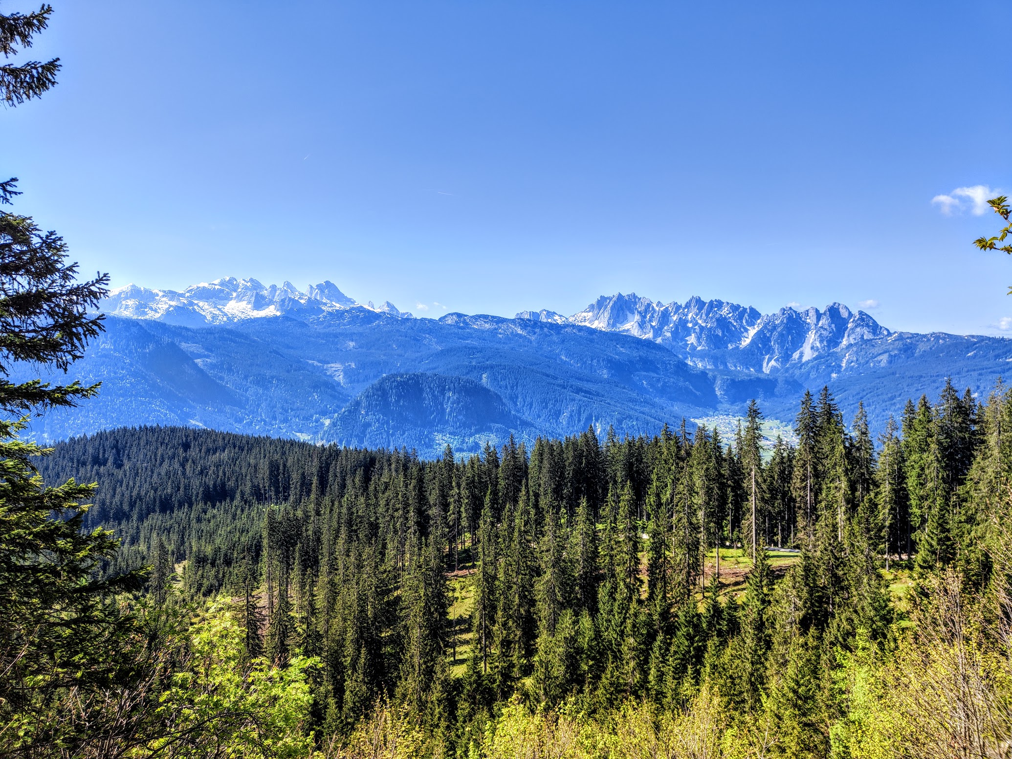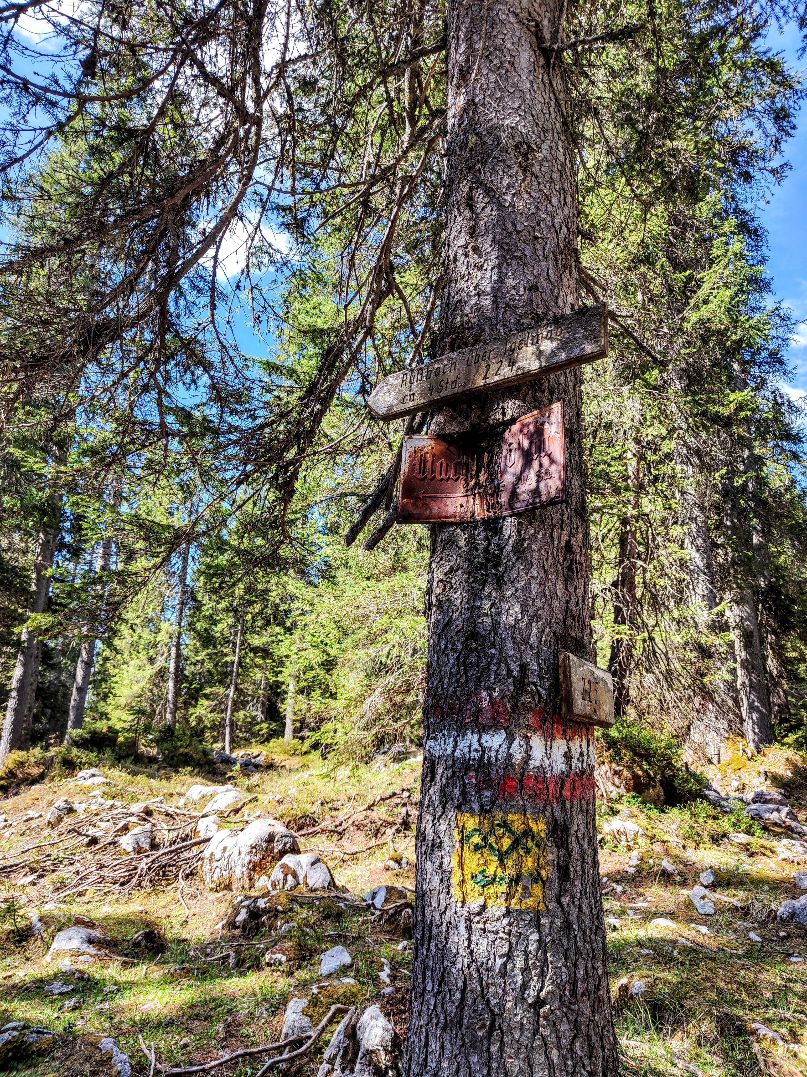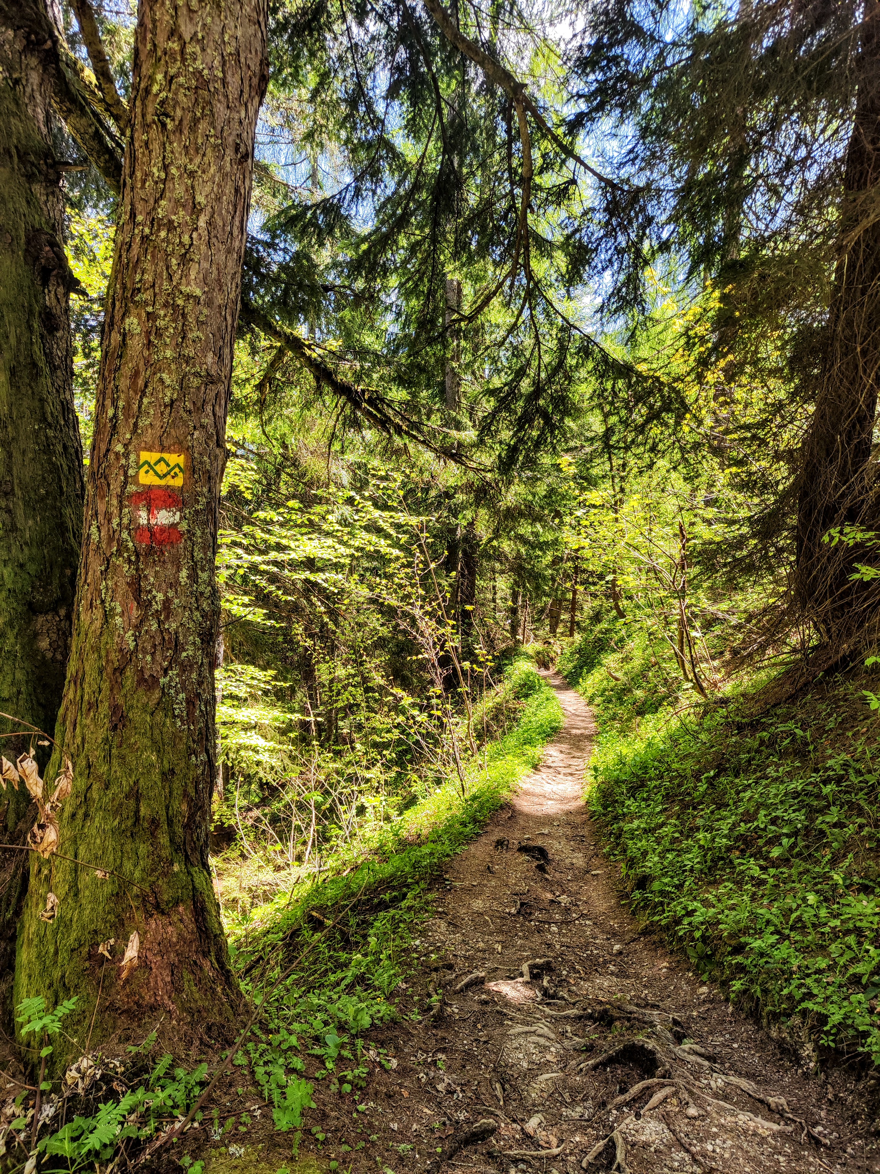 Im Gosauer Ortsteil Ramsau führt der Aufstieg zur Iglmoosalm fast komplett durch den Wald. An der Hütte angekommen (im Juni Fr-So. bewirtschaftet, ab 1. Juli täglich) sonnt sich im Hintergrund der Gosaukamm im Morgenlicht… an dieser Stelle hat ma übrigens schon gut 500hm auf 3,3km in den Haxn. Bei meiner Tour war die Iglmoosalm leider noch zu – also statt Frühstücken direkt hinter der Hütte den Wanderweg weiter bergauf. Den Panorama-Ausblick nachm Iglmoos auf Höhe der Roten Wand zum Dachstein & Gosaukamm hat man sich schon verdient. Nach einem kurzen Forstrassenabschnitt für der Weg über eine felsige Abkürzung und wieder auf die Strasse, bis es rechterhand dann wieder auf kleinen Steigln durch den Wald, in die Saugrube (kann ma wer sagn, wieso de so hoasst?) und weiter bis zur nächsten Wegkreuzung mit uralt Schildern geht…