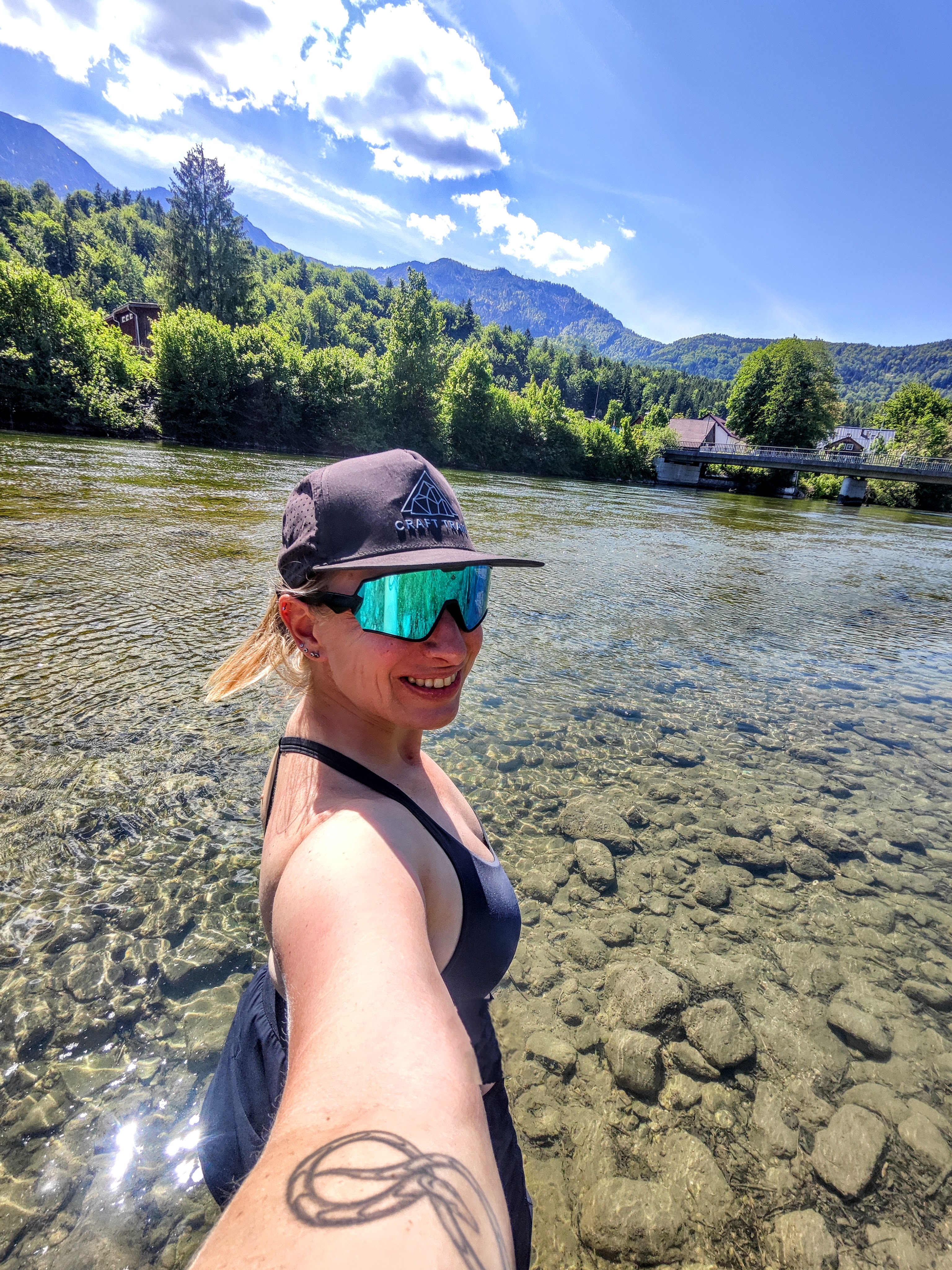 Beim Abstieg von der Goisererhütte – der Weg ist schmal & tlws ausgesetzt (abgerutscht) im Absturzgelände – im ersten kurzen Abschnitt unbedingt gut aufpassen. Dafür ist das Panorama mit Ewiger Wand, zum Sandling, ins Tote Gebirge, zum Loser & Sarstein a Traum, auch wenn die Sonne erbarmlungslos auf den Weg knallt… Wer darauf verzichten möchte, kann eine Alternative wäheln: den Abstieg über den Kniekogel. Dieser führt über Almgebiet und großteils schattig durch den Wald bis Obermuth. Von dort ri Jochwand und bergab via Sophienbrücke über die Traun ins Goiserer Ortszentrum oder ri PP Goisererhütte. Tradition: bei der Dichtlerin an Schluck eiskaltes Wasser schlürfen – die Quelle befindet sich auf der Goiserer Seite, zw Goisererhütte & Wallmann Poidl Rast (Wetterunterstand). Spätestens wenn der Wanderweg wieder in den Wald führt, wirds angenehmer zum gehen. Nicht nur hitzetechnisch. Nach zwei Bachbettquerungen zur Trockenthannalm geschafft, auch diese ist unbewirtschaftet, die Hütten privat. Jetzt gehts gemütlich über die Forststrasse zurück bis zum PP Goisererhütte. Von dort über ein kurzes Strassenstück dem Wanderweg dann wieder in den Wald folgen, der einen bis zur Kreuzung Ramsau / Stainach bringt. A Katzensprung zur Goisererbrücke & ins Zentrum… und zur zweiten Tradition – eini in die Traun und abkühlen! Ein letzter Blick zurück auf das Ramsaugebirge, den Kalmberg und die Goisererhütte, vom Wasser aus.